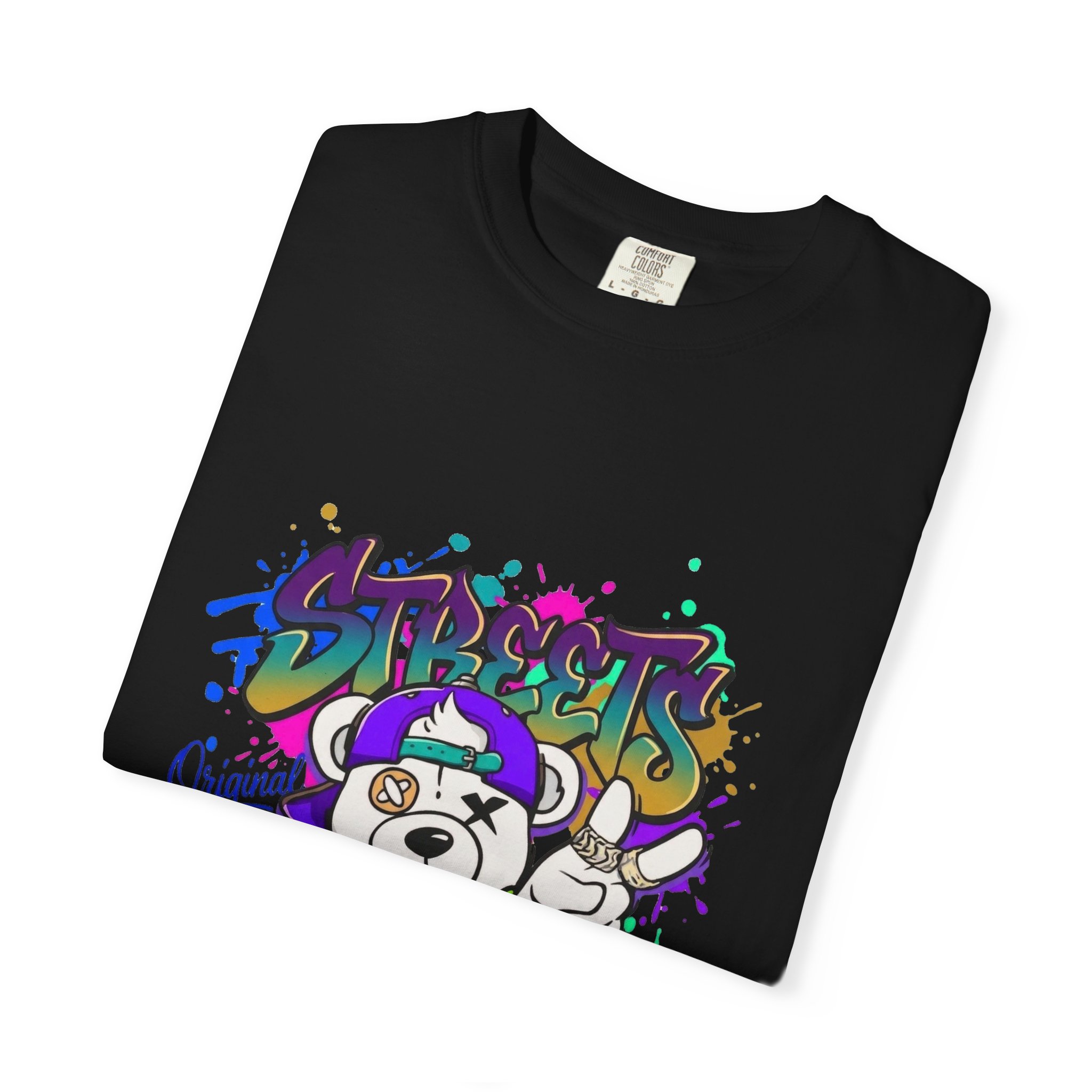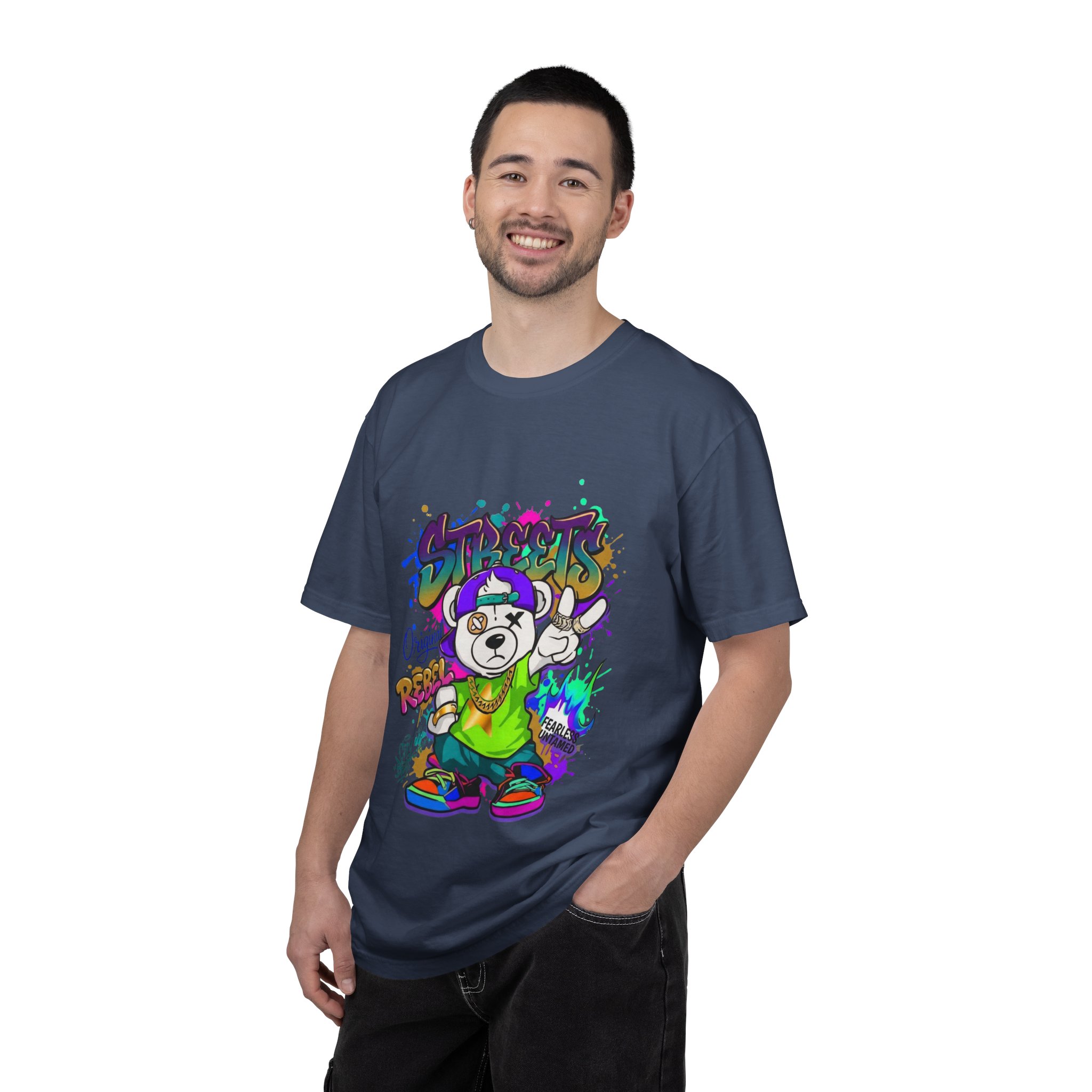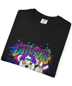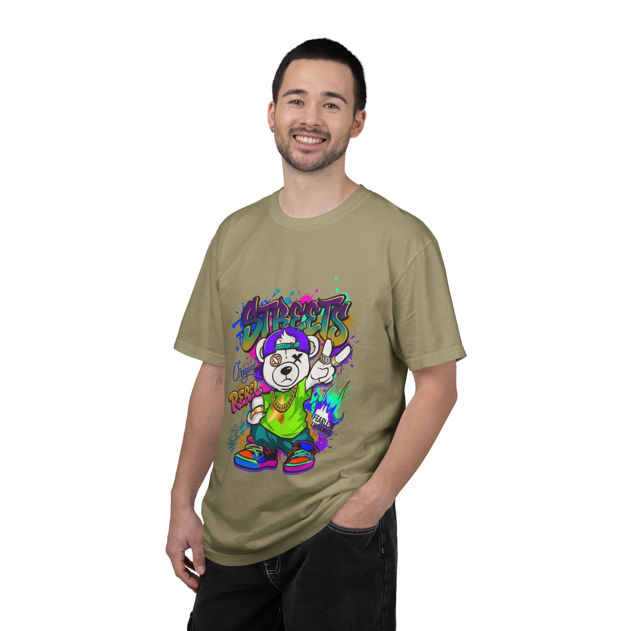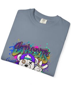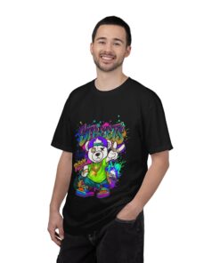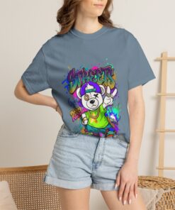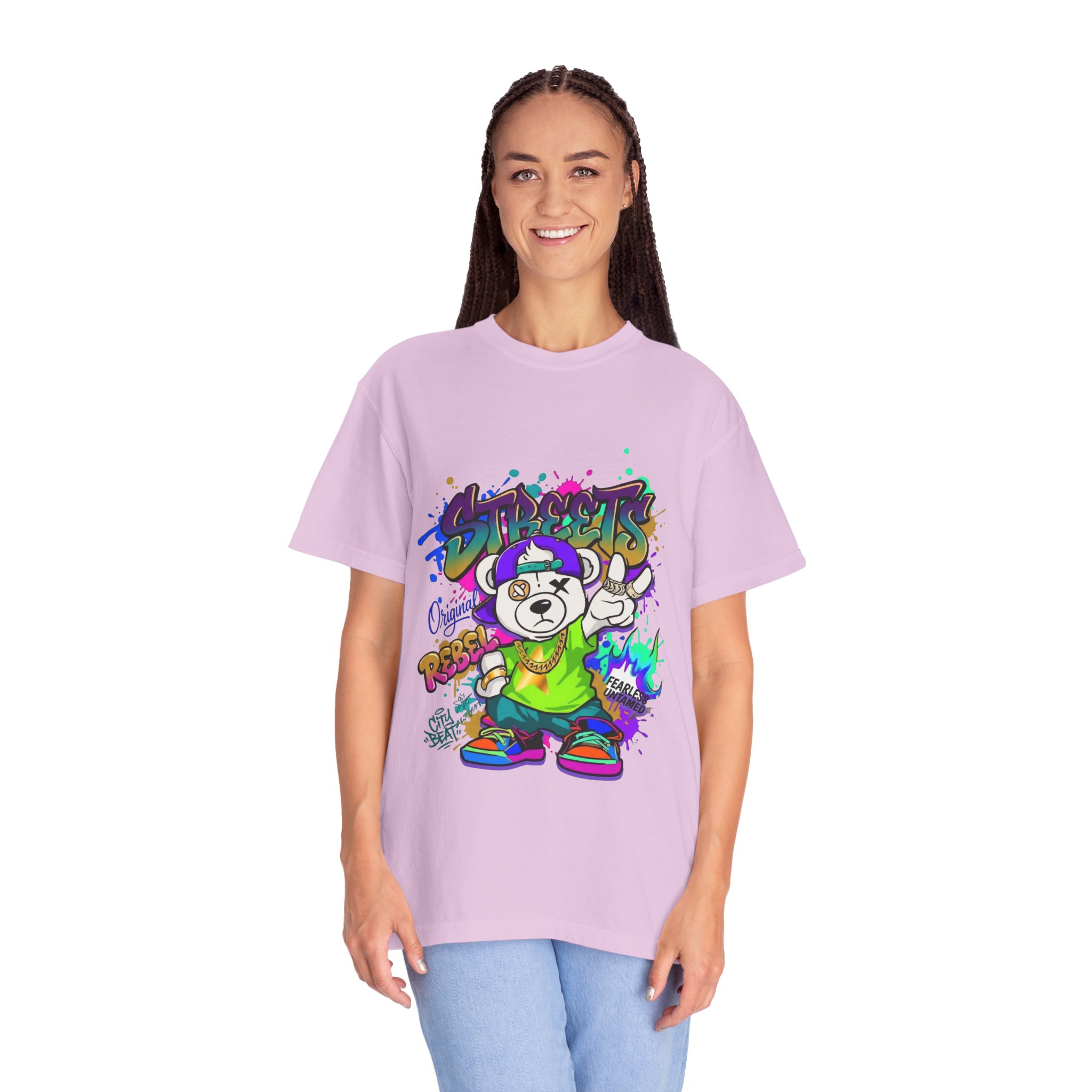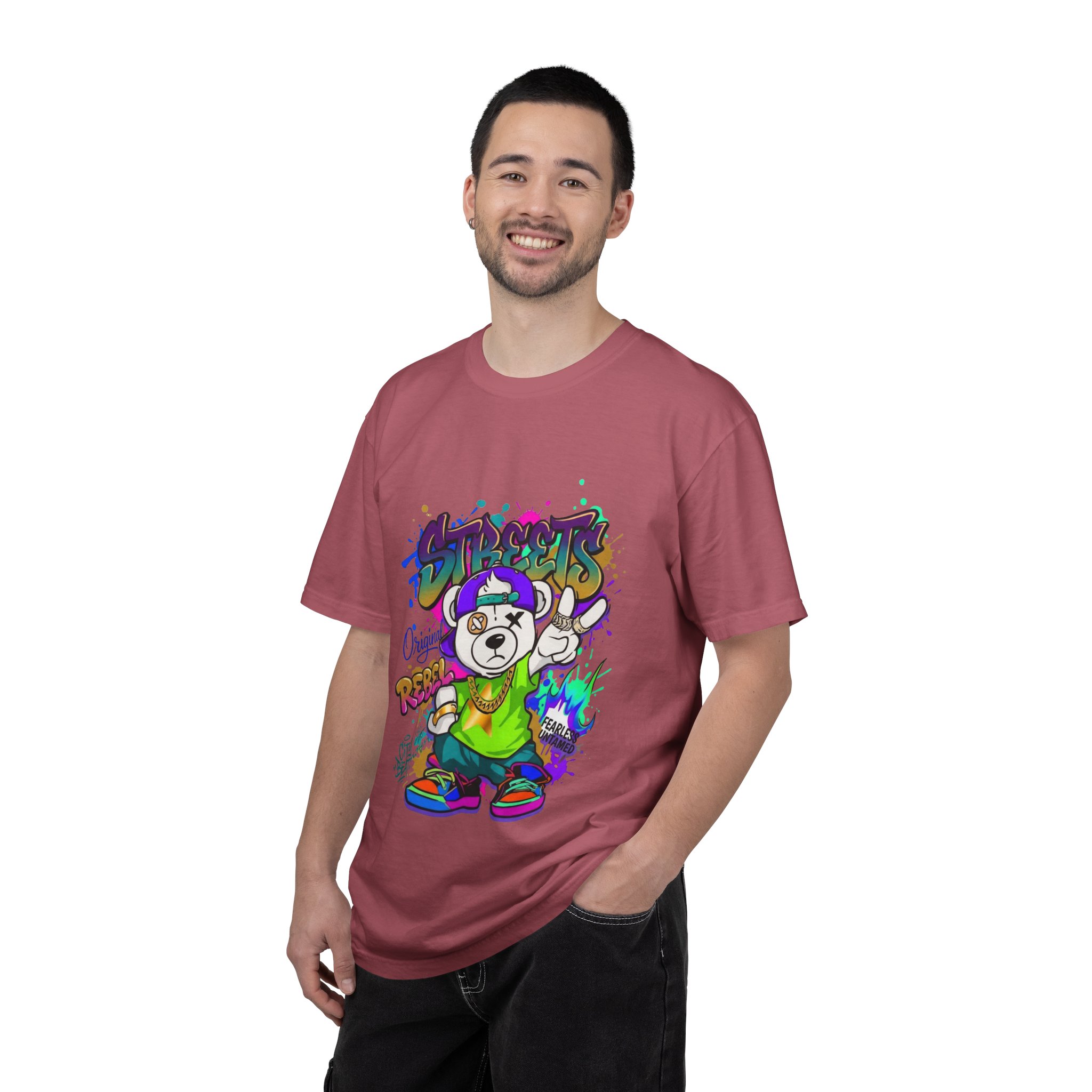 A bold, garment-dyed tee that brings street-art energy to everyday wear. The heavyweight cotton has a lived-in softness from the after-construction dyeing process, so the colors sit with a slightly vintage, broken-in look. At the center, a graffiti-style bear bursts with neon hues and urban flair — a playful, rebellious focal point that reads like a mural you can wear. The relaxed fit and tubular knit give room to move while preserving clean lines and minimal seams. Wear it to skate sessions, late-night art shows, or just when you want your outfit to say you appreciate color, character, and durable construction.