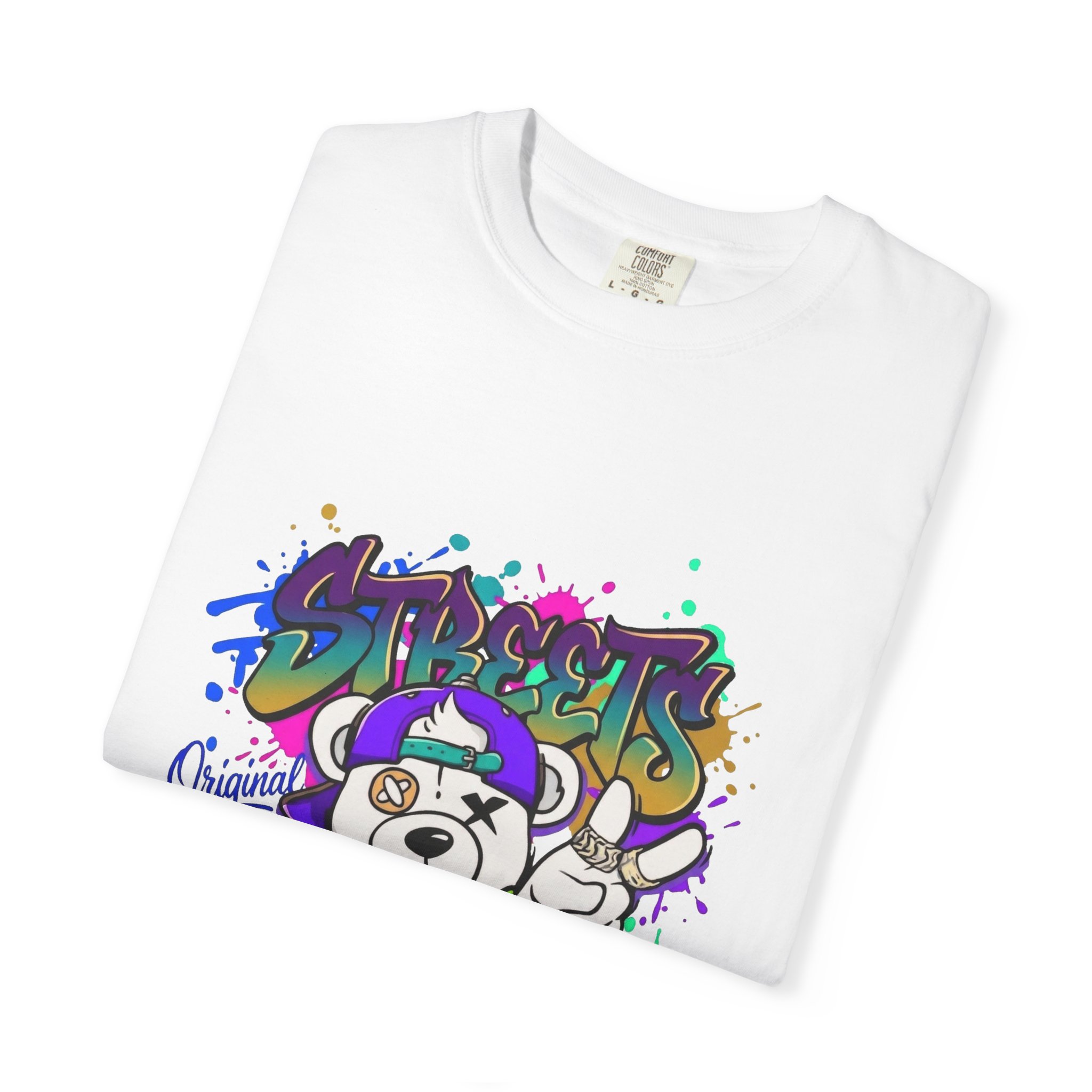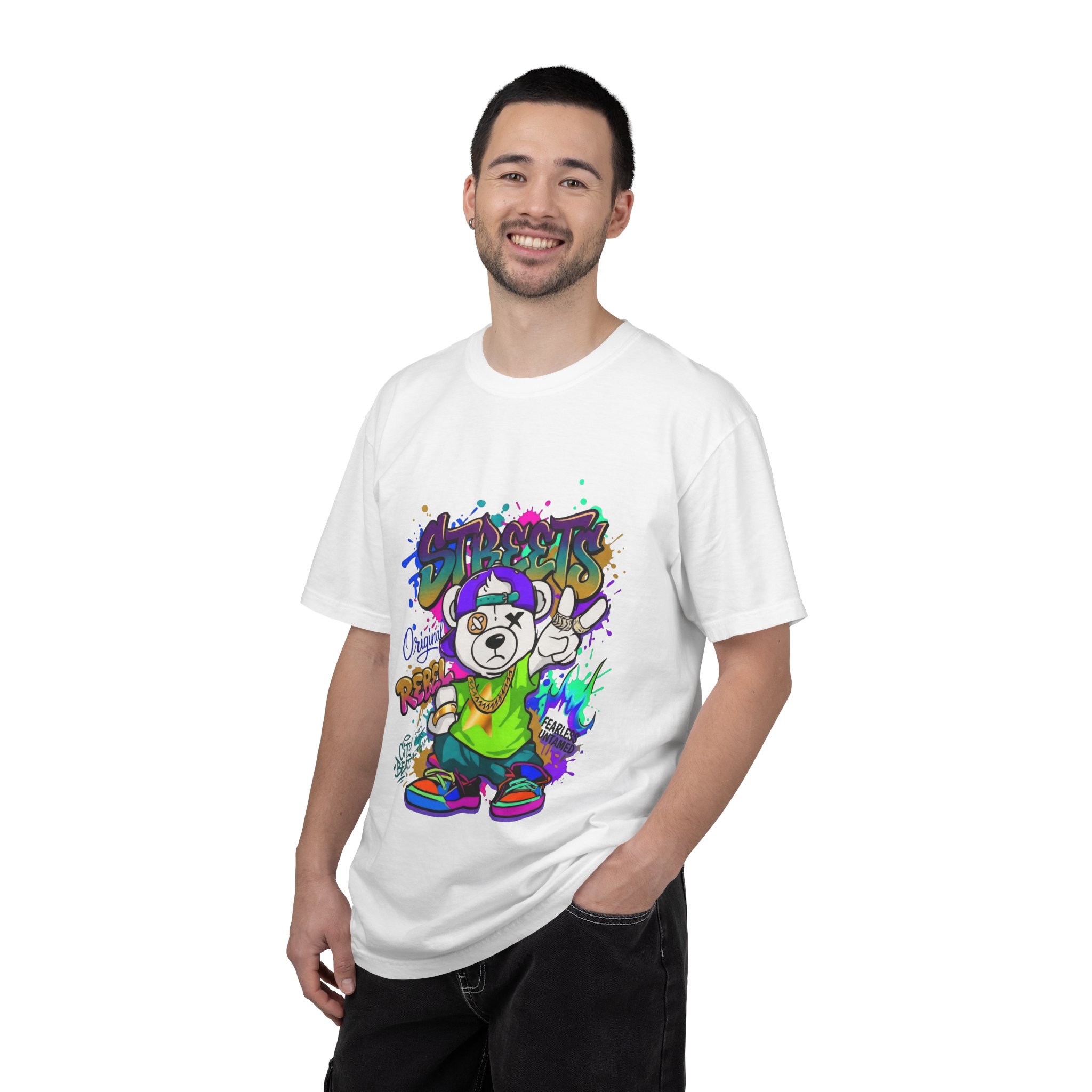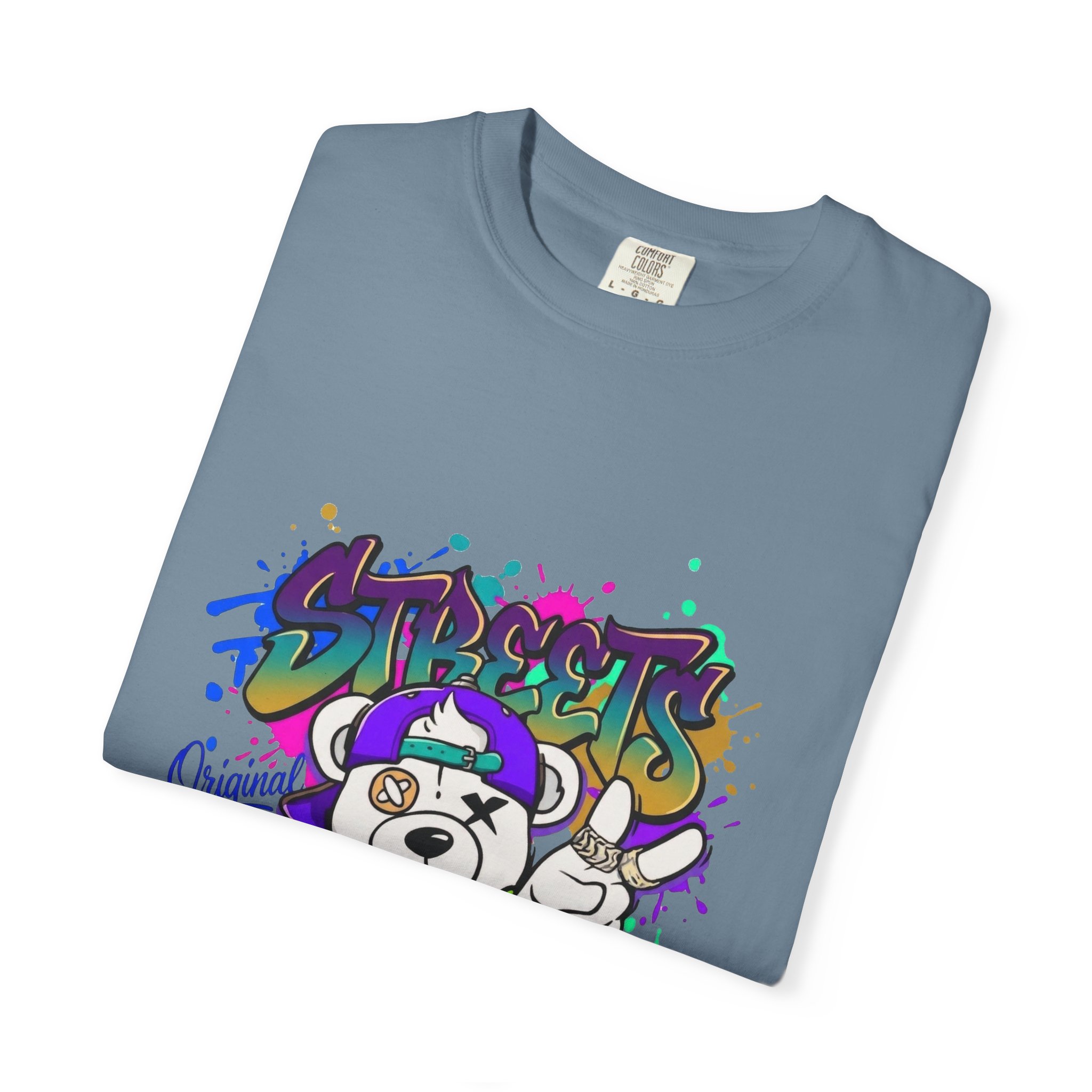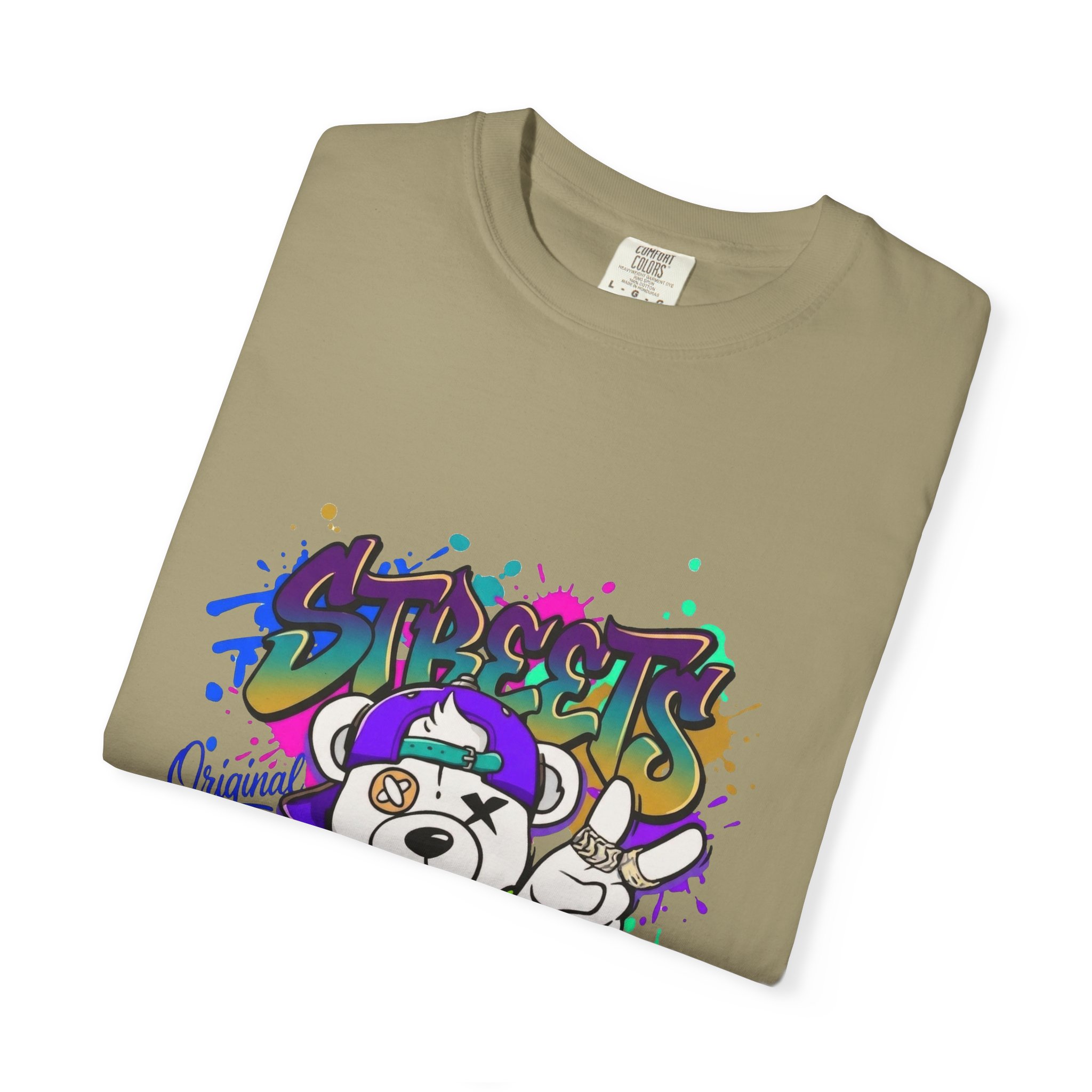 A bold, garment-dyed tee that brings street-art energy to everyday wear. The heavyweight cotton has a lived-in softness from the after-construction dyeing process, so the colors sit with a slightly vintage, broken-in look. At the center, a graffiti-style bear bursts with neon hues and urban flair — a playful, rebellious focal point that reads like a mural you can wear. The relaxed fit and tubular knit give room to move while preserving clean lines and minimal seams. Wear it to skate sessions, late-night art shows, or just when you want your outfit to say you appreciate color, character, and durable construction.