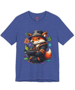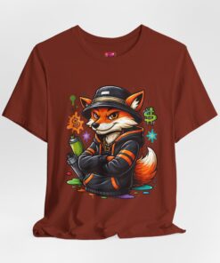 This lightweight short-sleeve tee carries streetwise energy with a vibrant fox graffiti illustration printed on the front. The breathable Airlume combed and ring-spun cotton feels soft against skin and layers easily under jackets or over hoodies. Tailored with side seams and a ribbed crew collar, the shirt keeps its shape through wear and washes. Thoughtful details like shoulder twill tape and a tear-away label add comfort and durability. The bold artwork — spray can in paw, hoodie and cap, neon splashes and money symbols — brings playful attitude to skate sessions, city strolls, or casual hangouts.