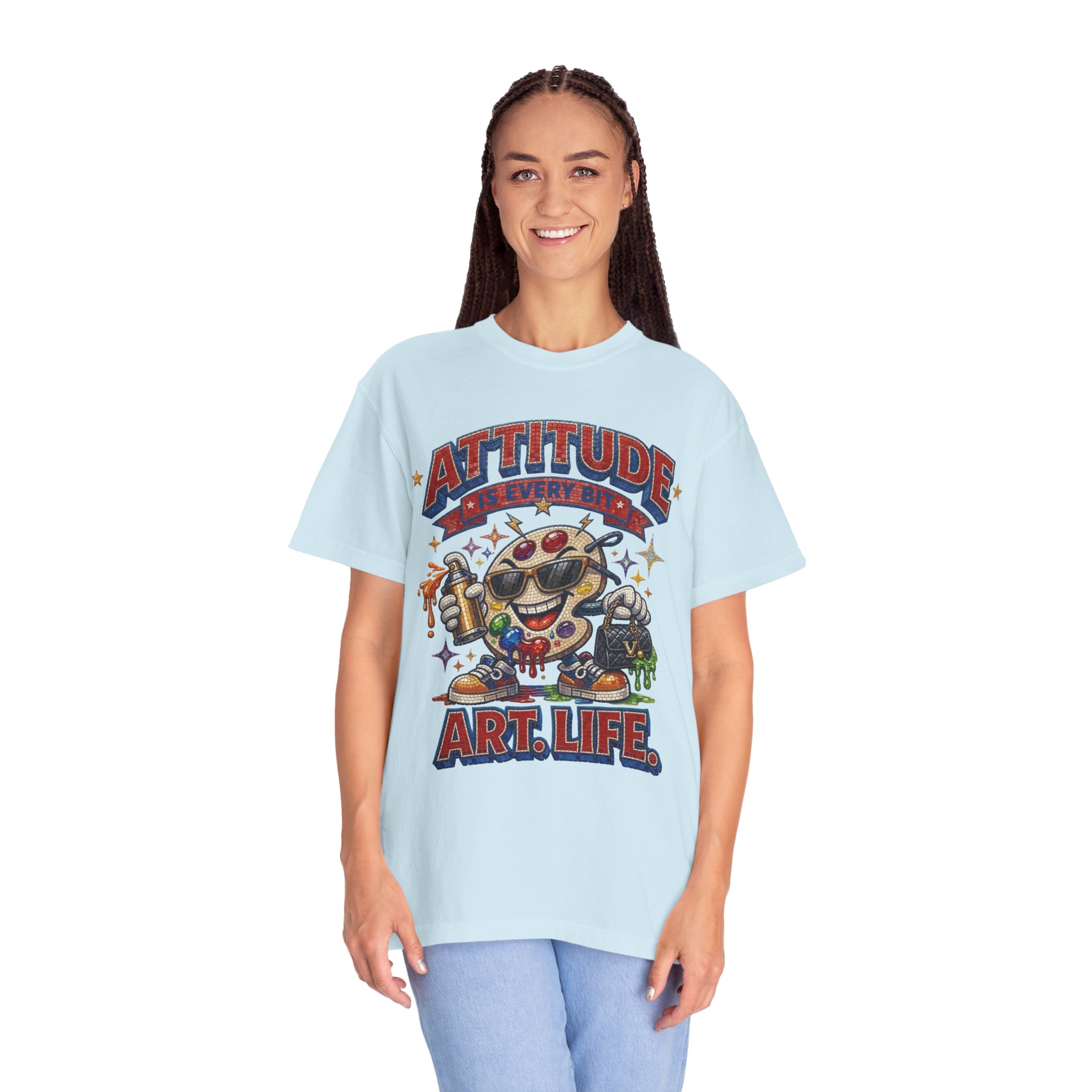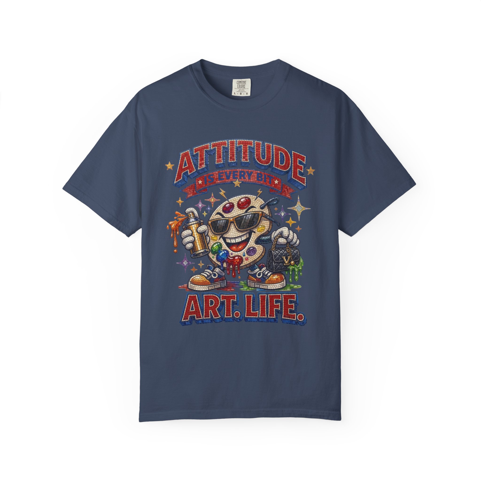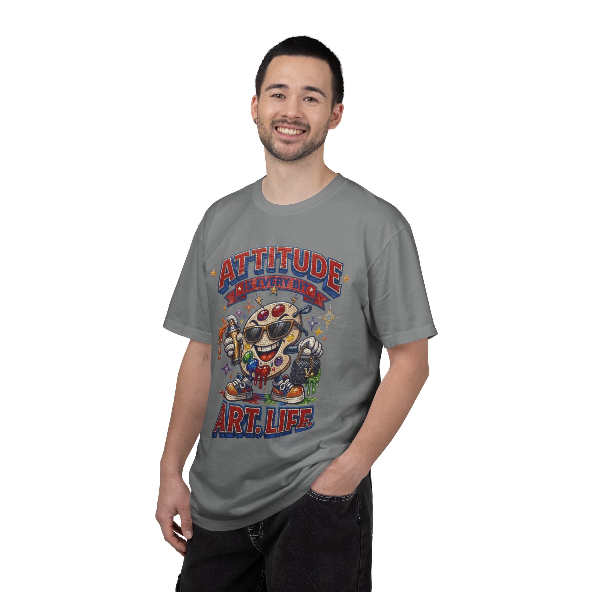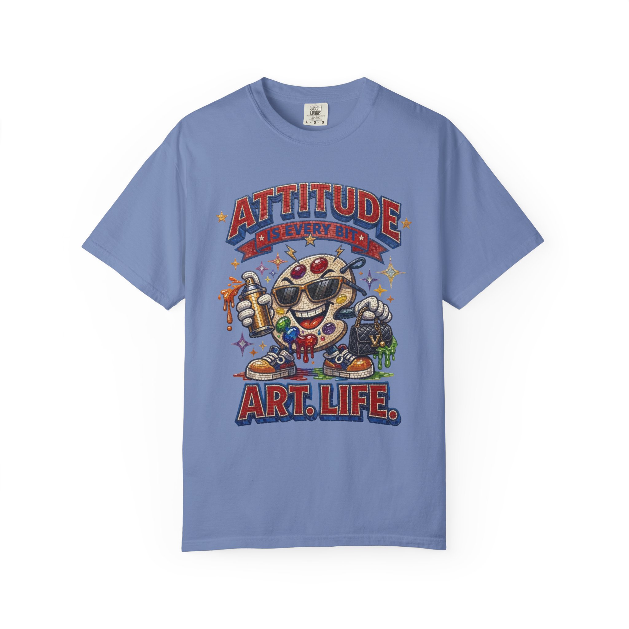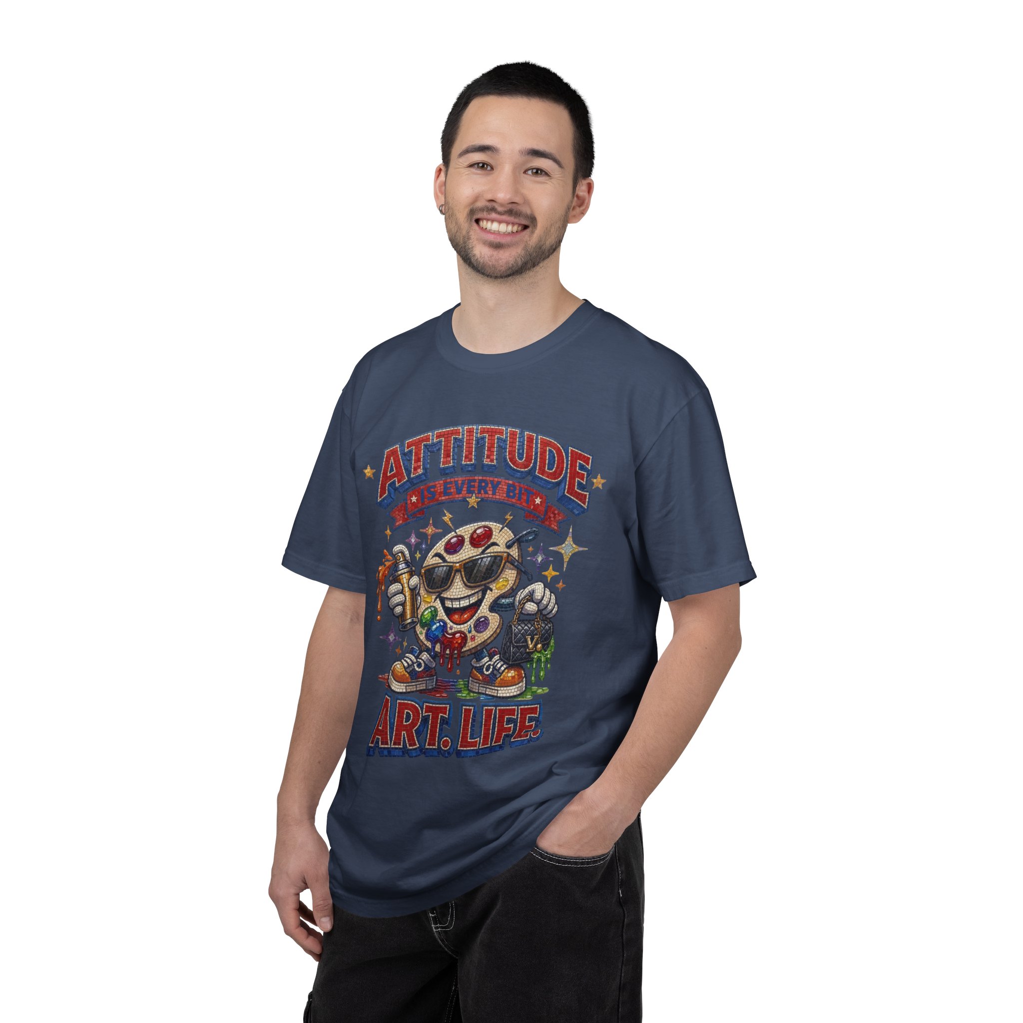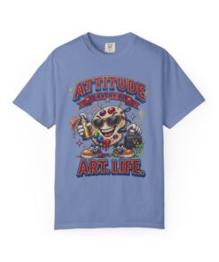 Live bold. Create louder. This vibrant “Attitude Art Life” design celebrates the mindset of true creators. Featuring a playful artistic character surrounded by creative tools and colorful elements, this artwork blends art culture with streetwear attitude.