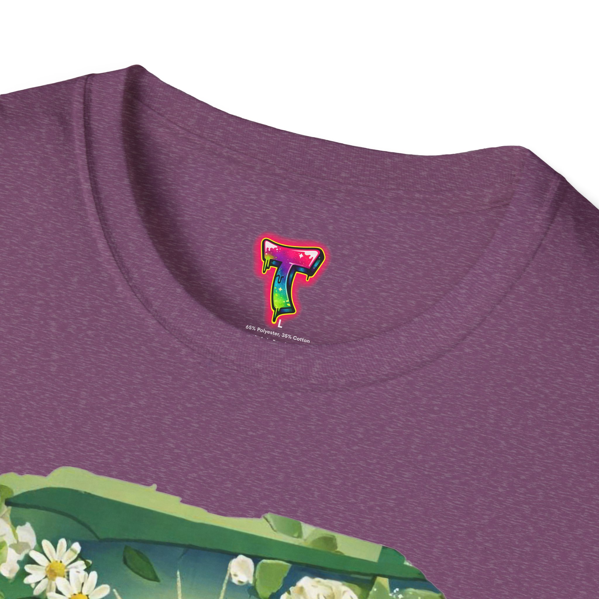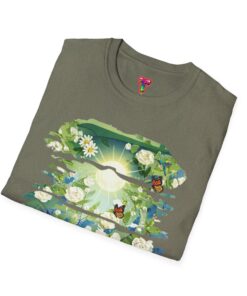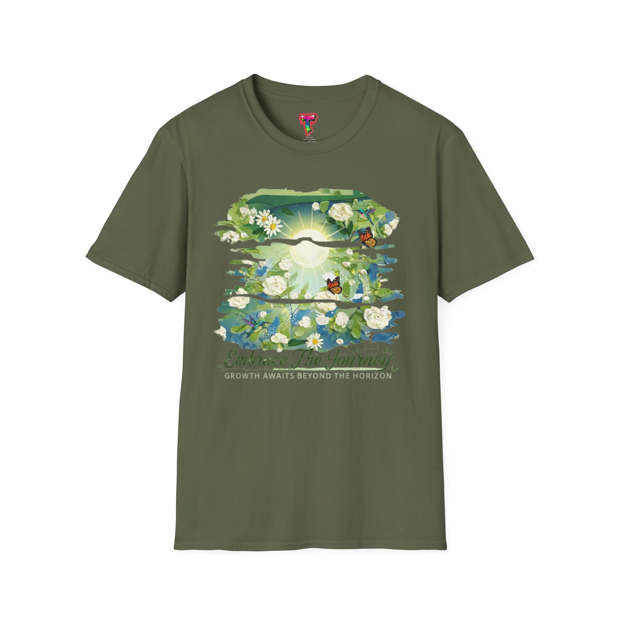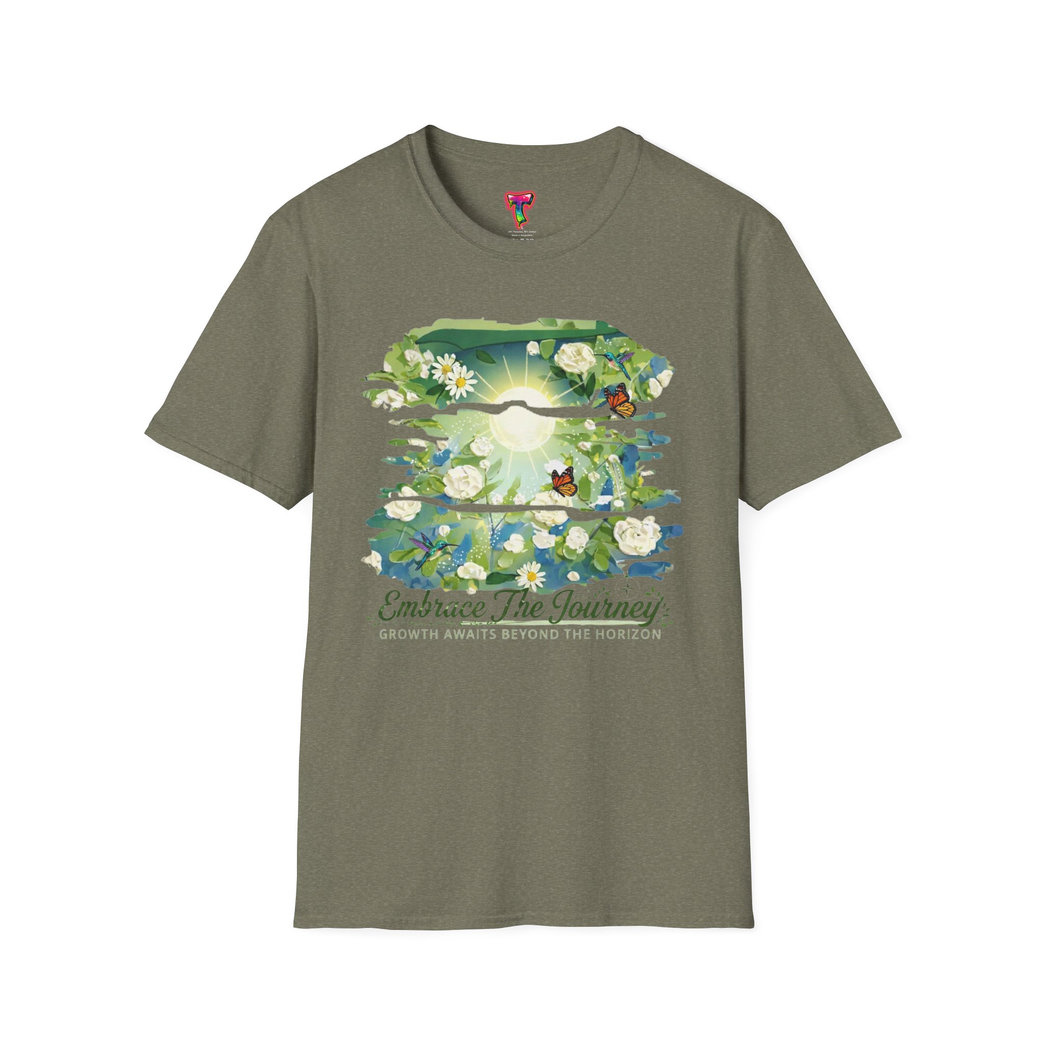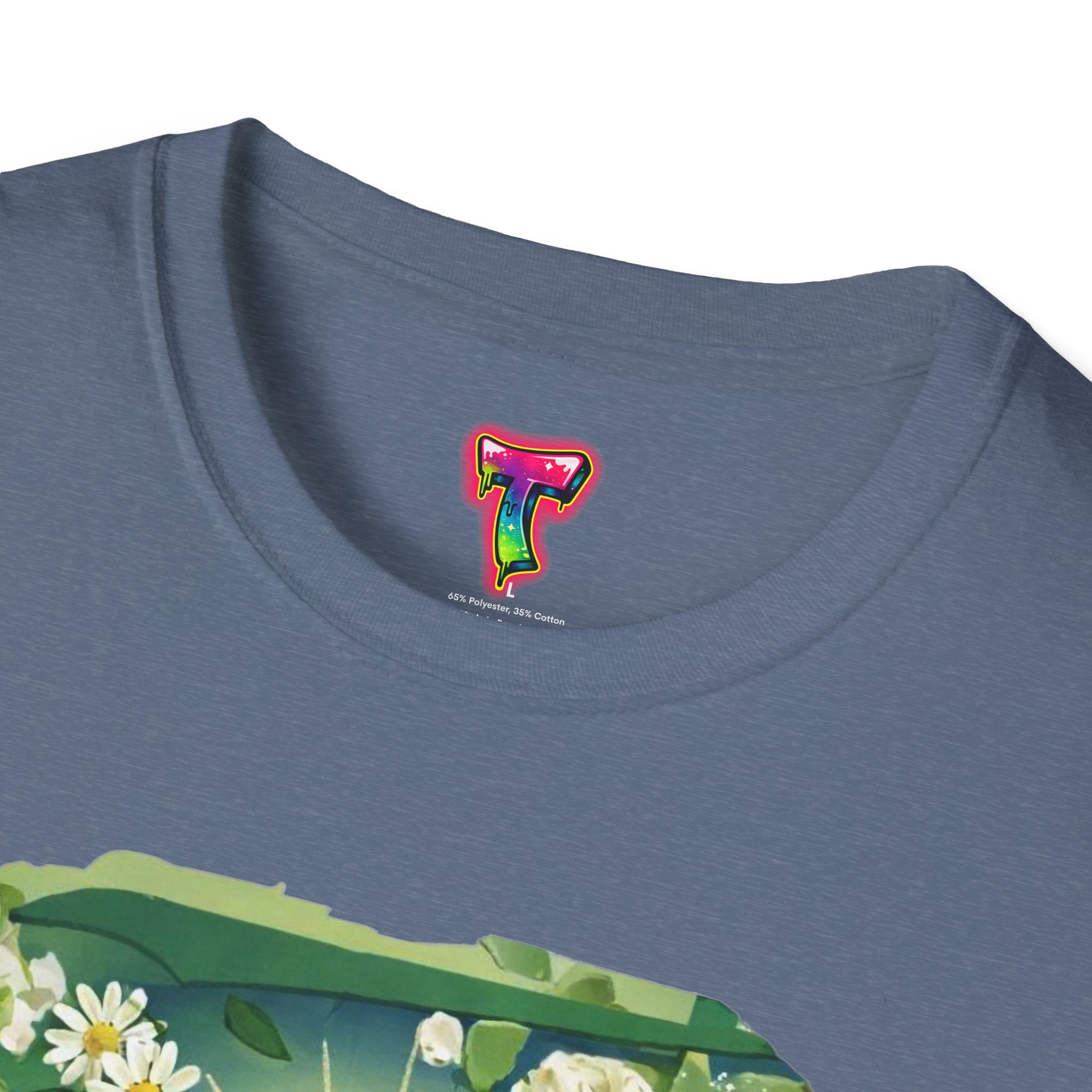 Breathe in a quiet moment: warm green light spilling across a pond, lilies floating like small islands, and a lone figure rowing toward a bright horizon. This lightweight tee carries a soft, painterly scene that reads like a small escape — thoughtful, hopeful, and calm. Wear it on slow mornings or during long drives when you need a gentle reminder that growth is patient and begins with a single stroke. The smooth ring-spun cotton feels effortless against skin, the ribbed collar holds its shape, and tear-away label keeps the back of your neck irritation-free. Subtle sleeve and neck prints are applied with high-quality DTF/DTG techniques for crisp color that sits beautifully on dark fabric.