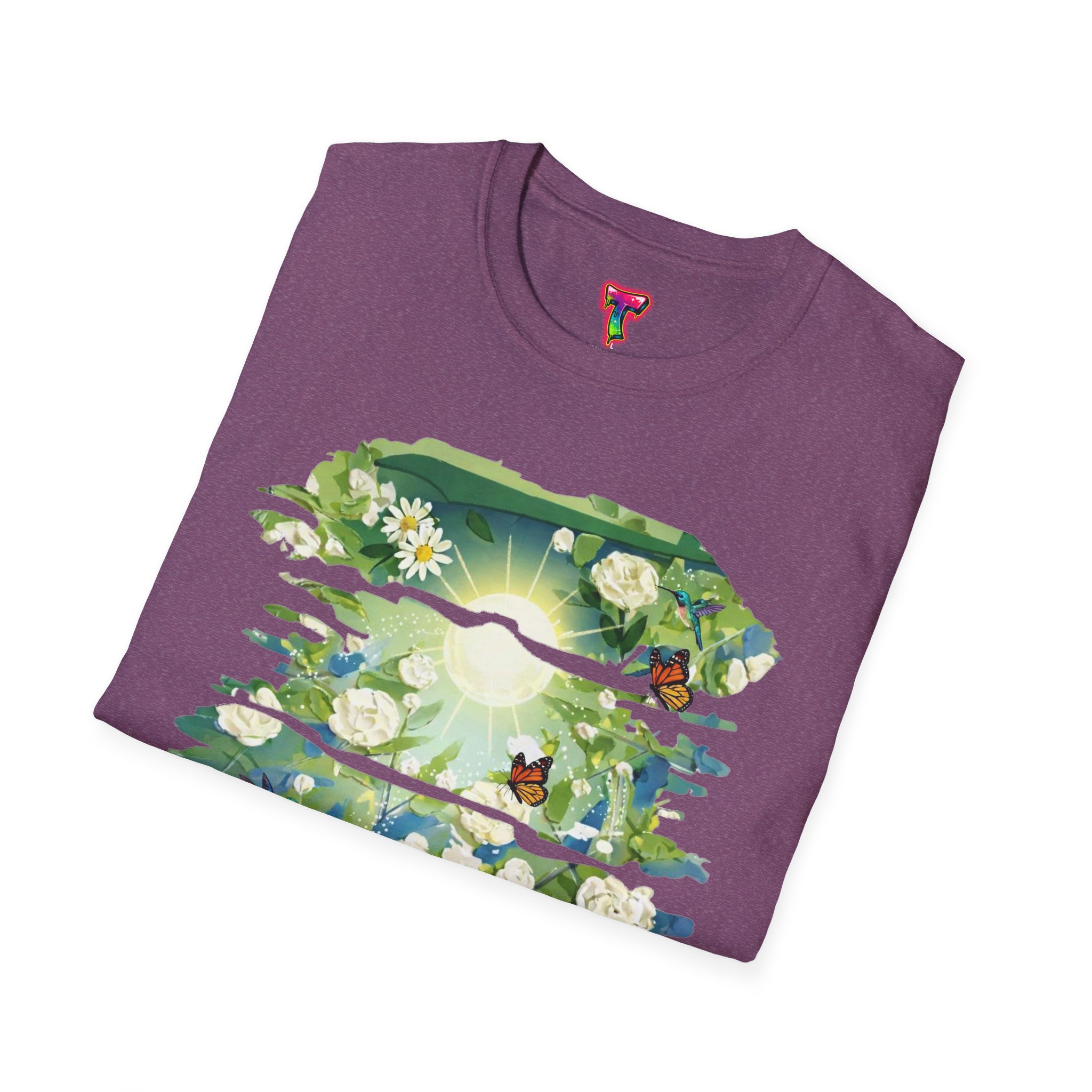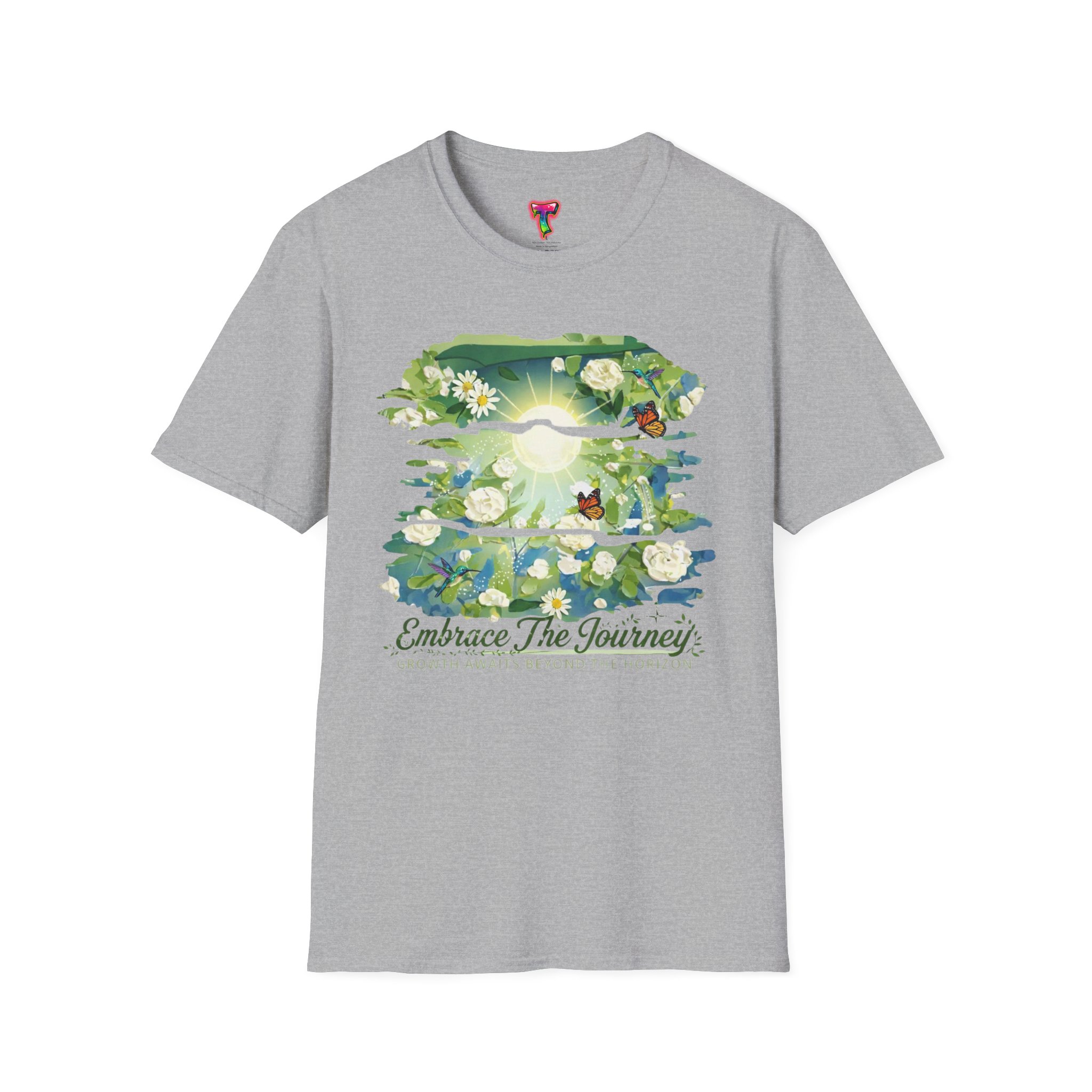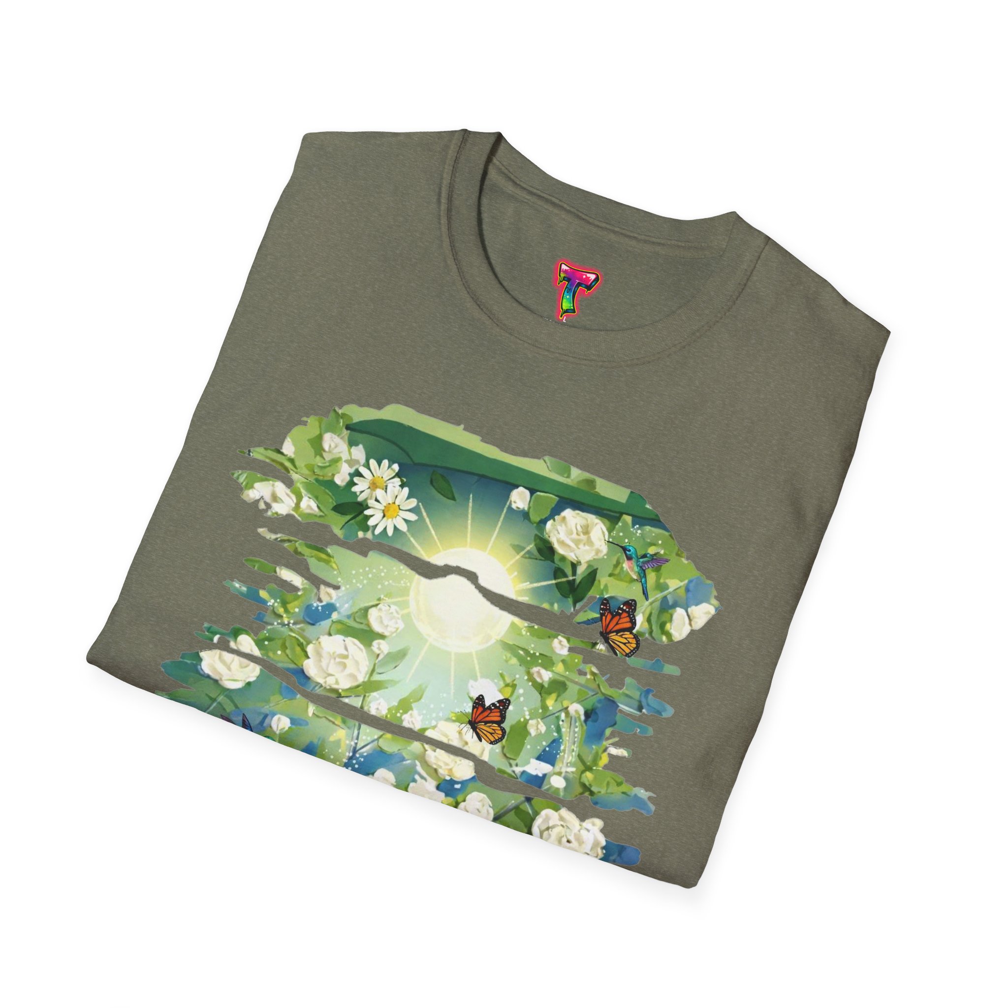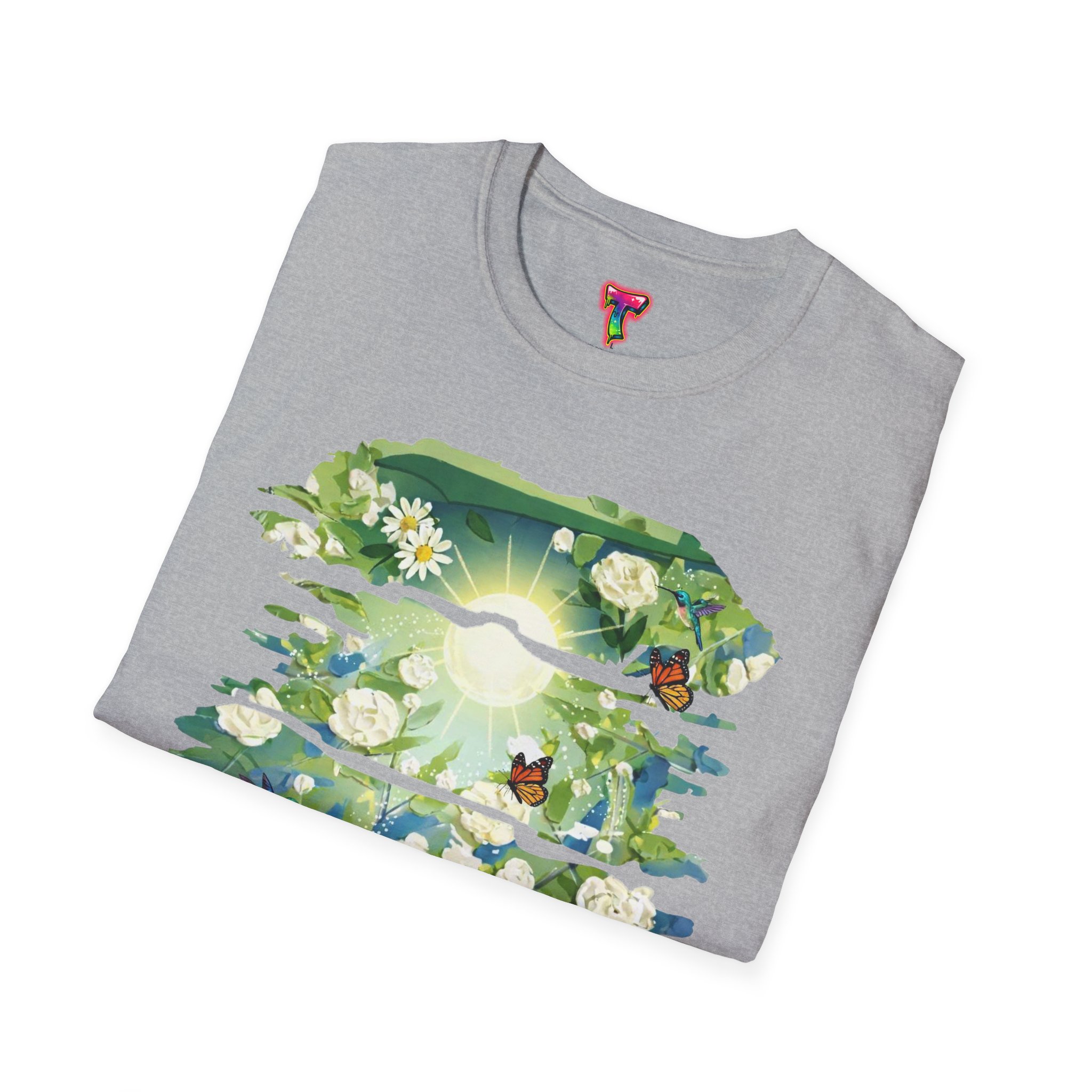 Breathe in a quiet moment: warm green light spilling across a pond, lilies floating like small islands, and a lone figure rowing toward a bright horizon. This lightweight tee carries a soft, painterly scene that reads like a small escape — thoughtful, hopeful, and calm. Wear it on slow mornings or during long drives when you need a gentle reminder that growth is patient and begins with a single stroke. The smooth ring-spun cotton feels effortless against skin, the ribbed collar holds its shape, and tear-away label keeps the back of your neck irritation-free. Subtle sleeve and neck prints are applied with high-quality DTF/DTG techniques for crisp color that sits beautifully on dark fabric.