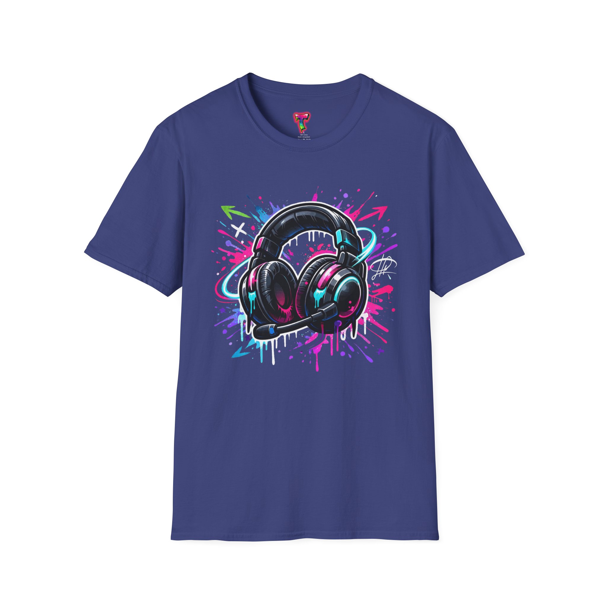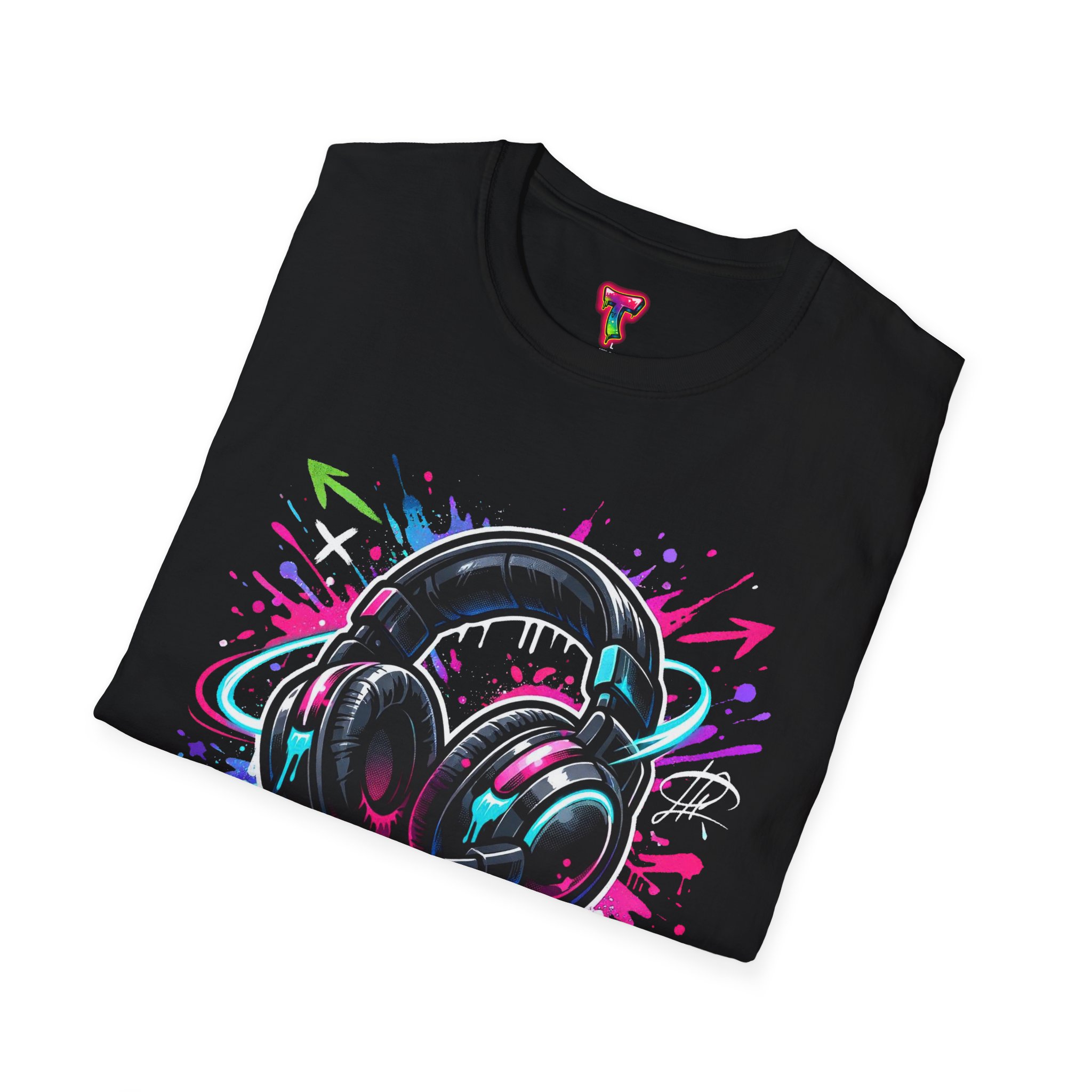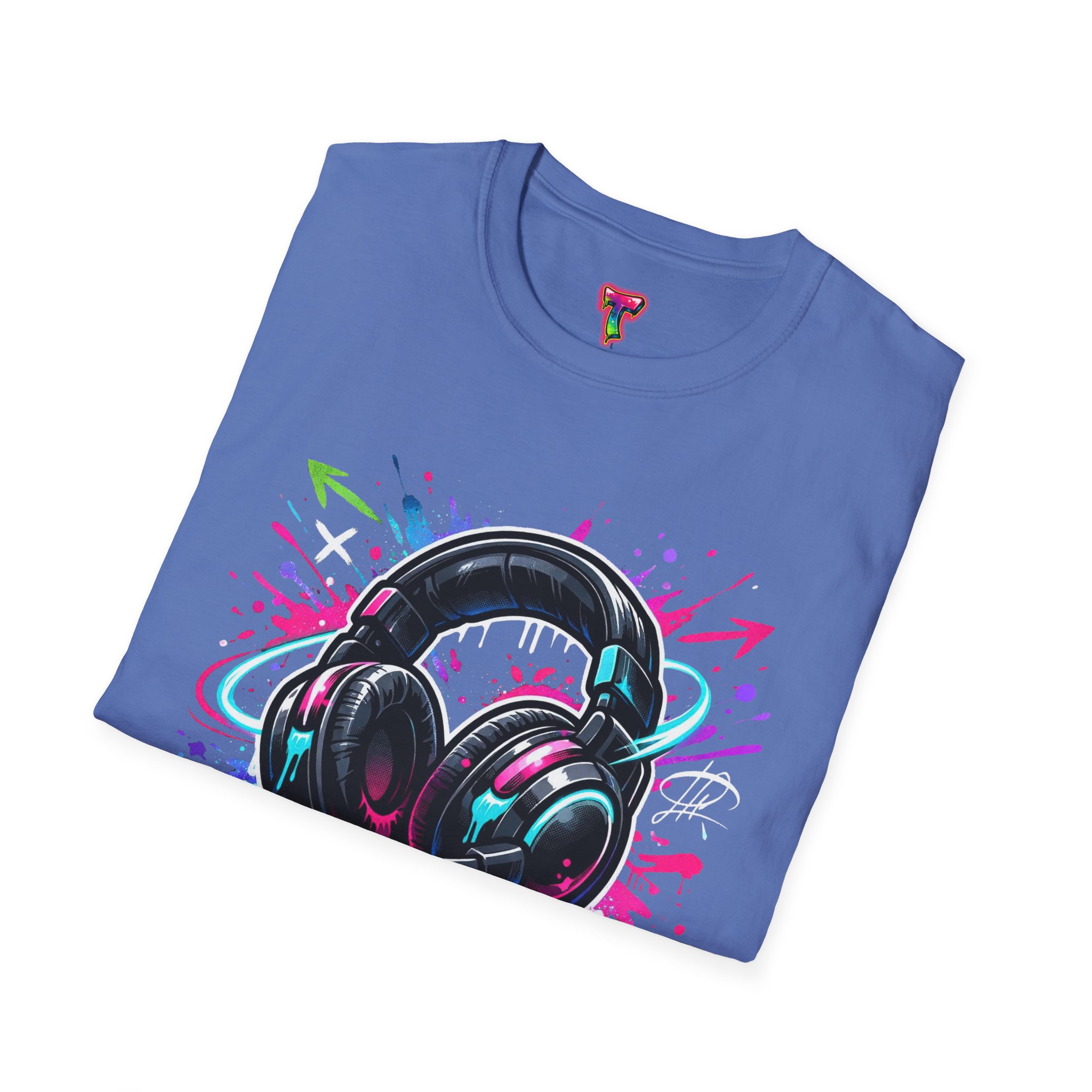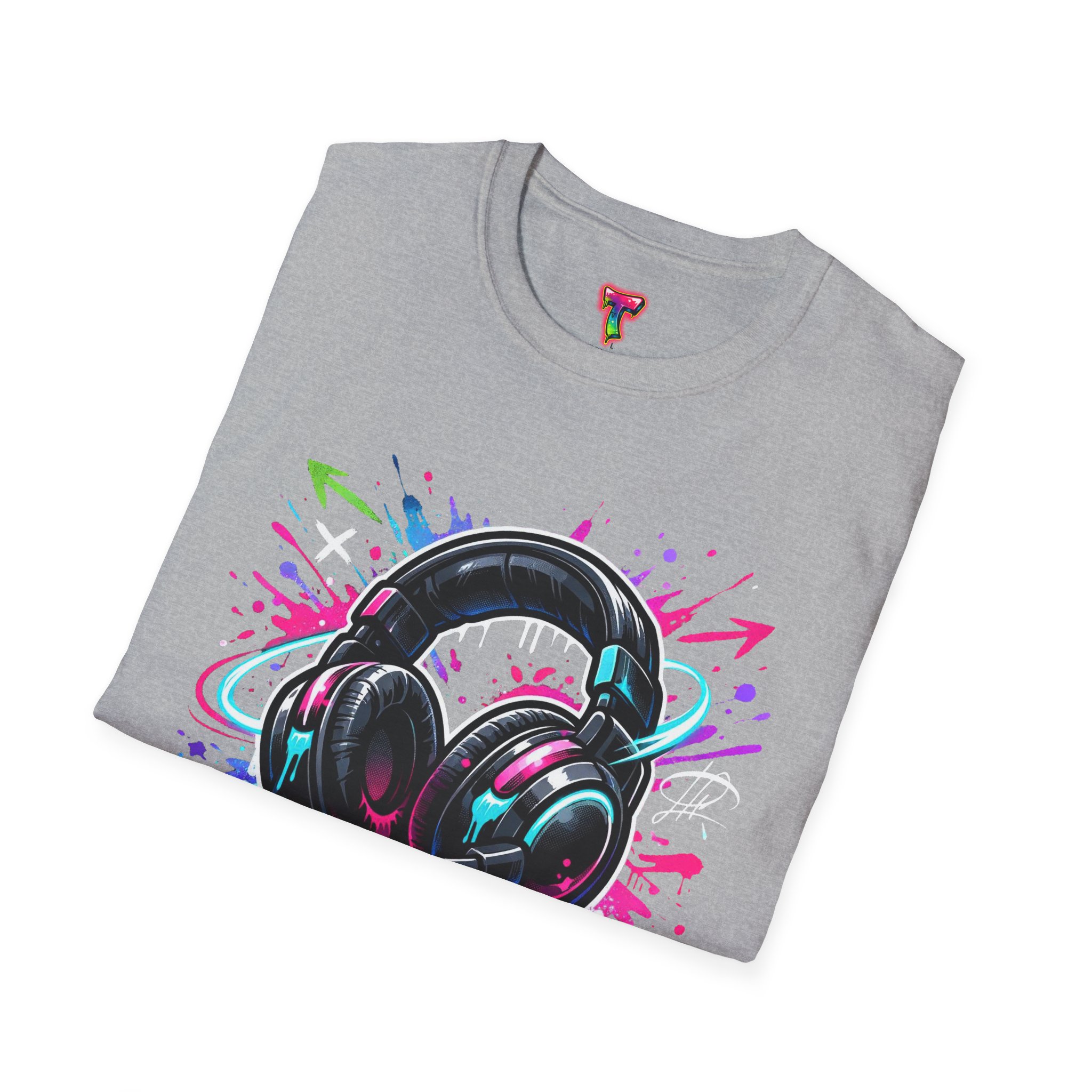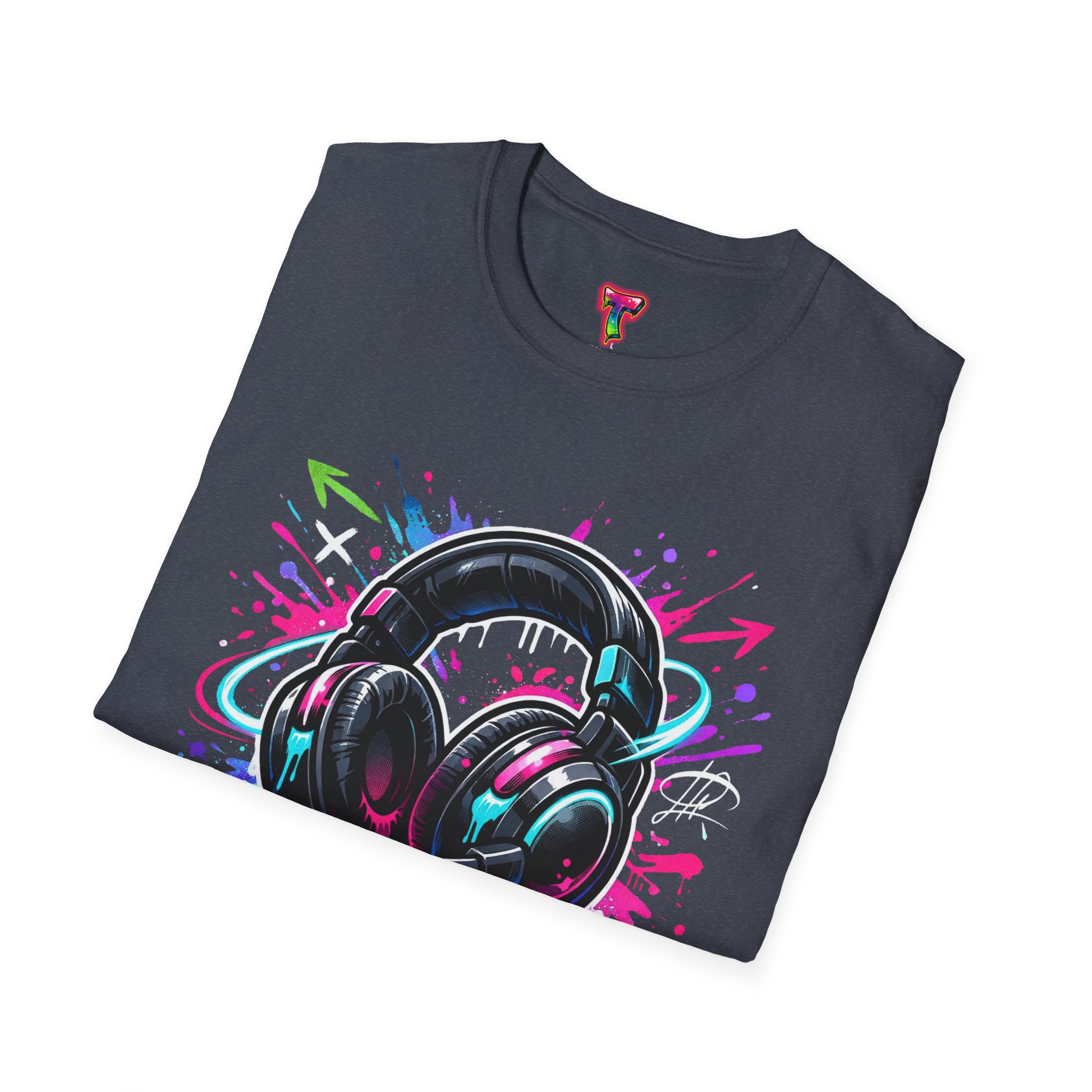 Feel the rhythm with this stylish headphone graphic tee featuring vibrant neon splashes, glossy audio gear artwork, and urban street-art energy. A perfect design for music lovers, DJs, producers, and anyone who lives through sound. Bold, modern, and expressive—this shirt brings music culture and streetwear fashion together in one standout look