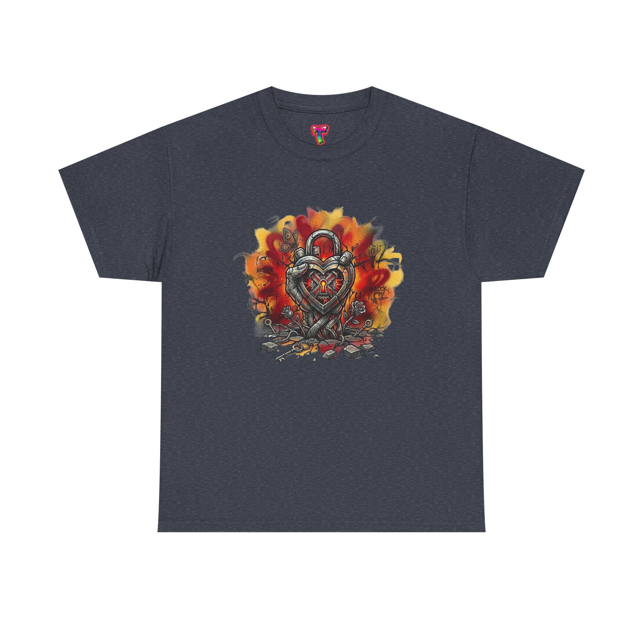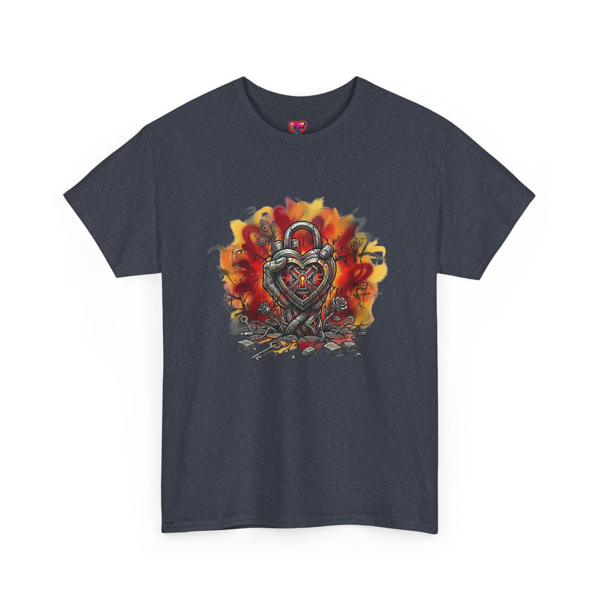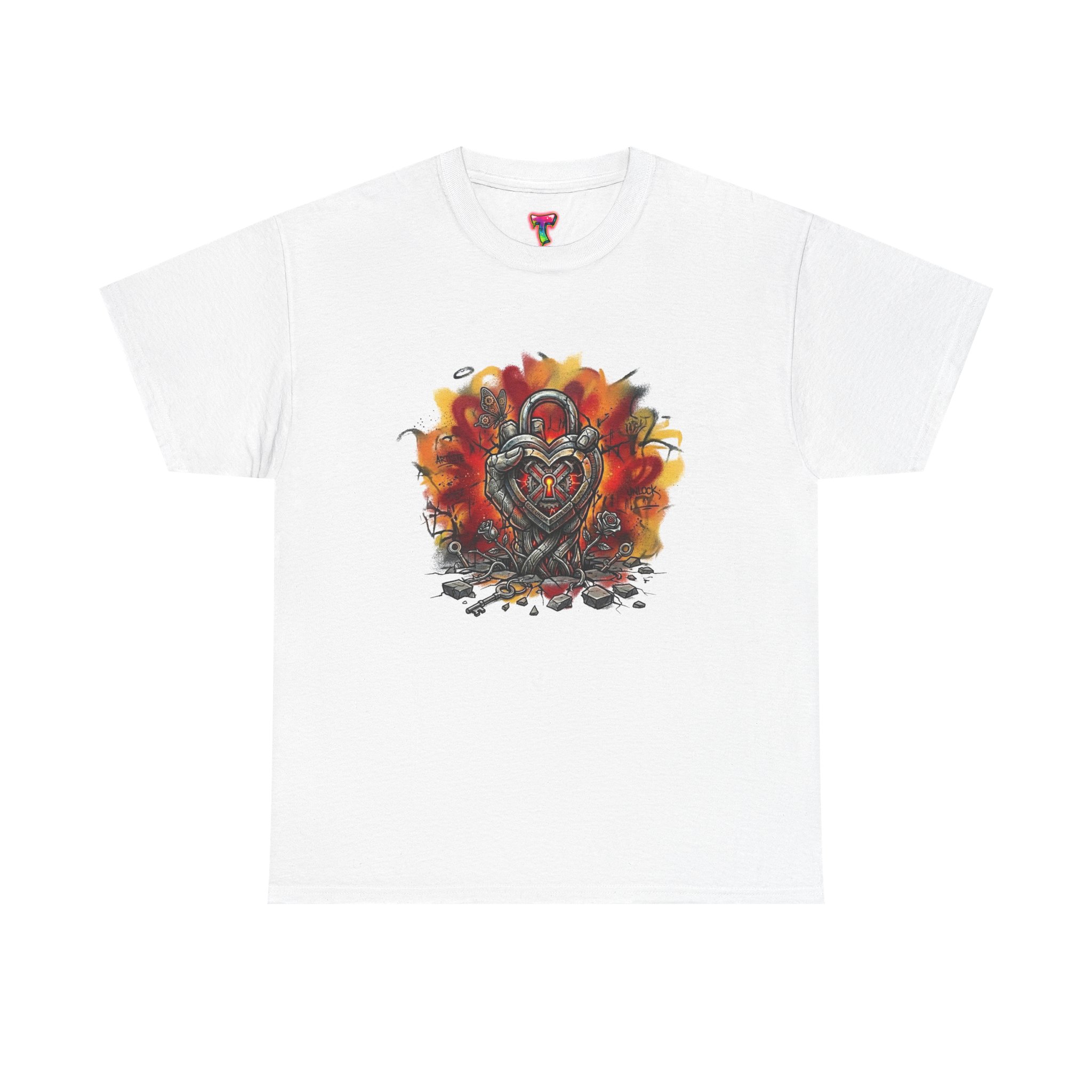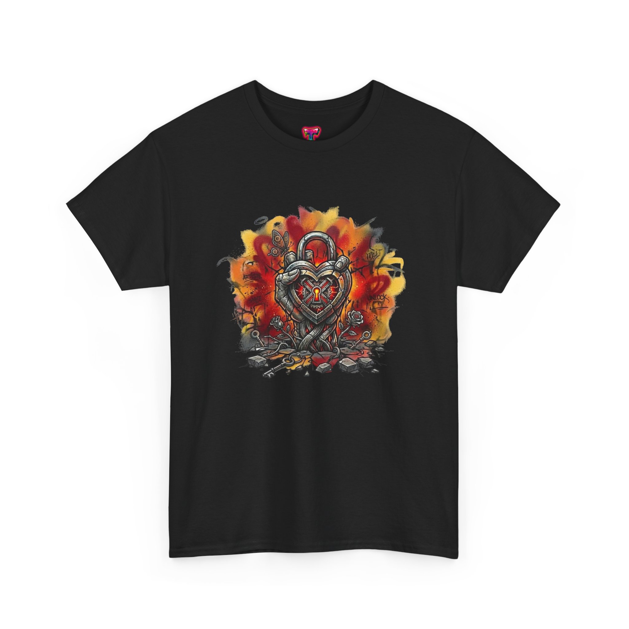 A soft, everyday tee that carries a story on its chest: a weathered padlock wrapped in vines and tiny hearts, set against a wash of ember-orange and charcoal splatters. The illustration feels hand-painted — slightly rough around the edges, honest and worn — like a keepsake from a roadside shrine or a late-night sketchbook. Wear it with a faded denim jacket, a canvas tote, and late-afternoon plans. It sits quietly in the background while you talk about music, memories, and the small rebellions that shape you. Lightweight but substantial, the shirt moves with you — casual, confident, and just a little protective of what matters.
