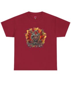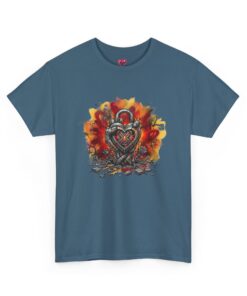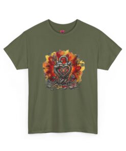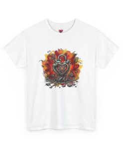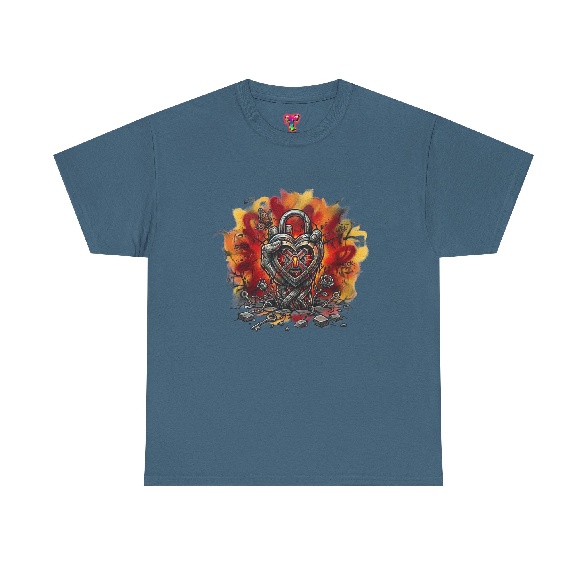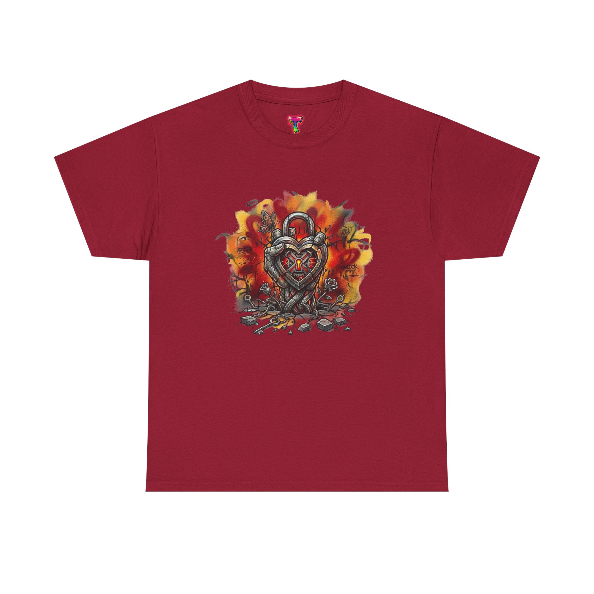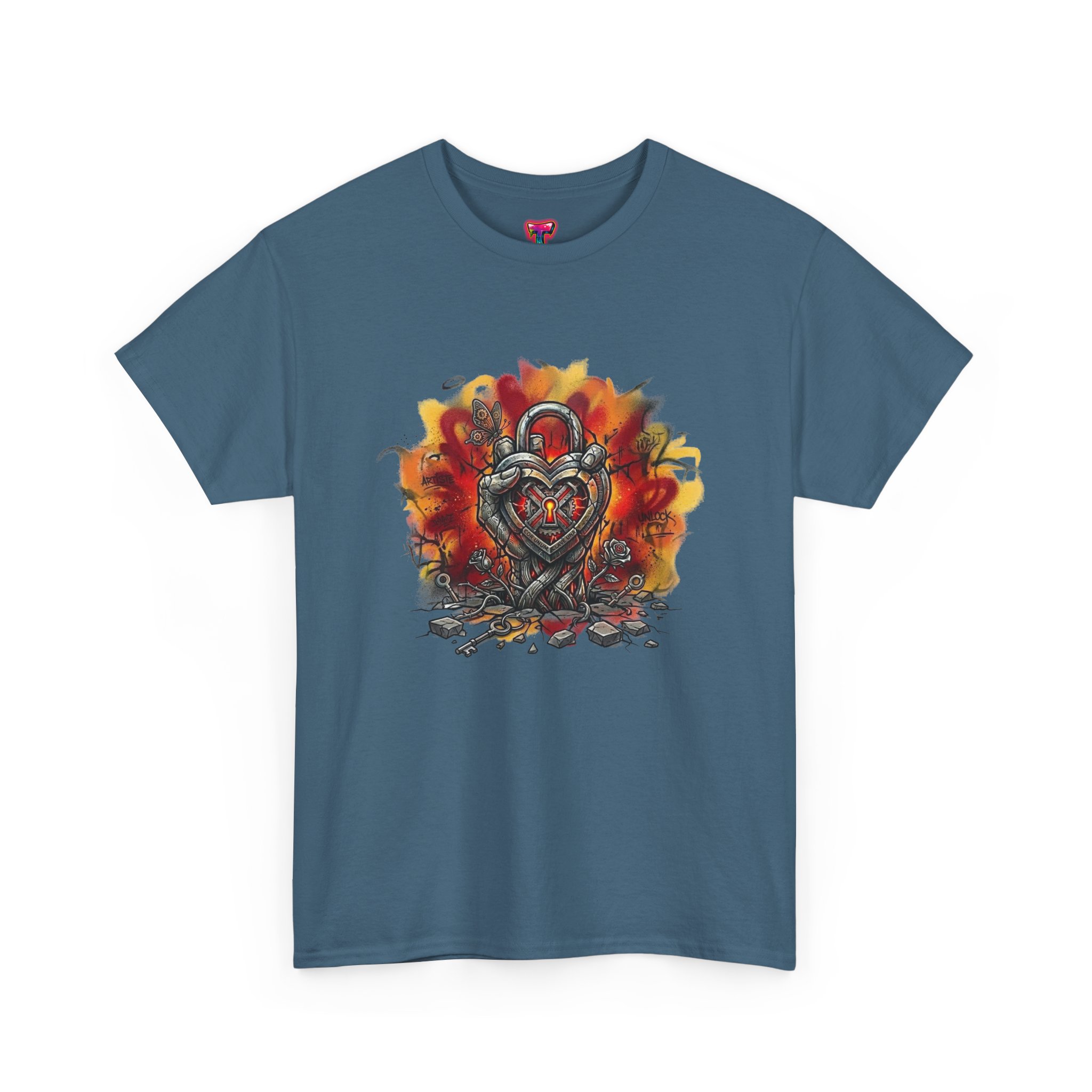 A soft, everyday tee that carries a story on its chest: a weathered padlock wrapped in vines and tiny hearts, set against a wash of ember-orange and charcoal splatters. The illustration feels hand-painted — slightly rough around the edges, honest and worn — like a keepsake from a roadside shrine or a late-night sketchbook. Wear it with a faded denim jacket, a canvas tote, and late-afternoon plans. It sits quietly in the background while you talk about music, memories, and the small rebellions that shape you. Lightweight but substantial, the shirt moves with you — casual, confident, and just a little protective of what matters.