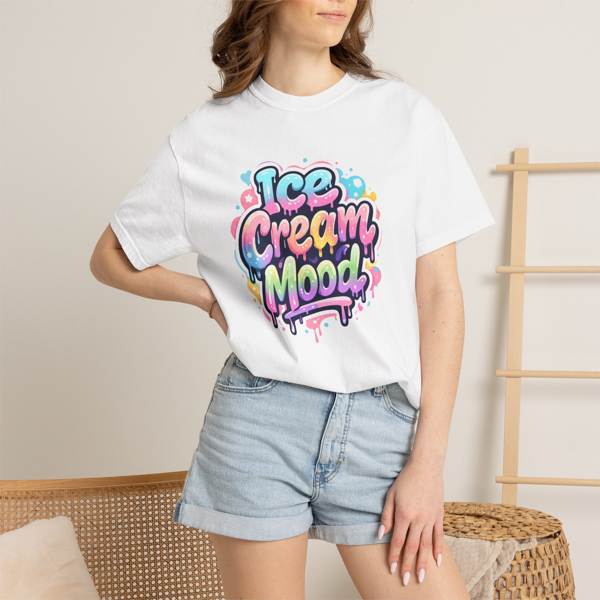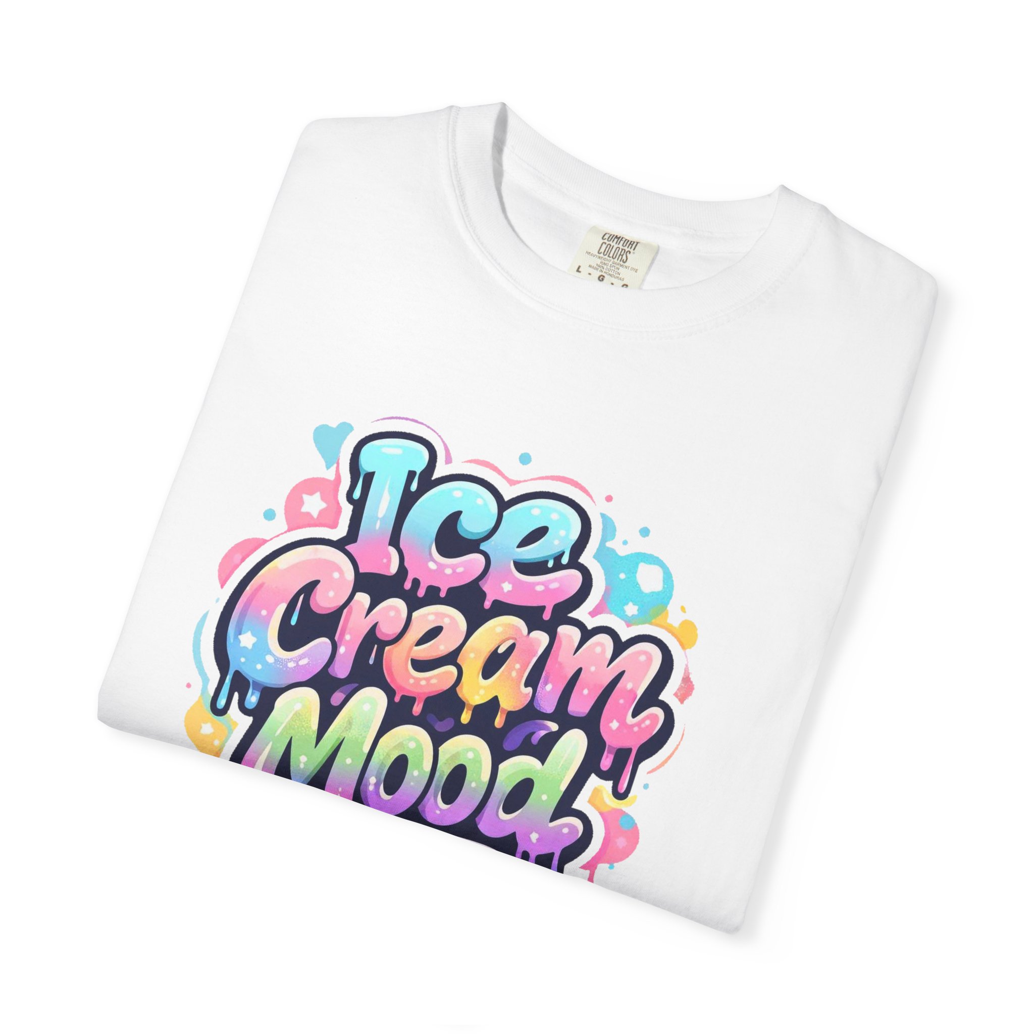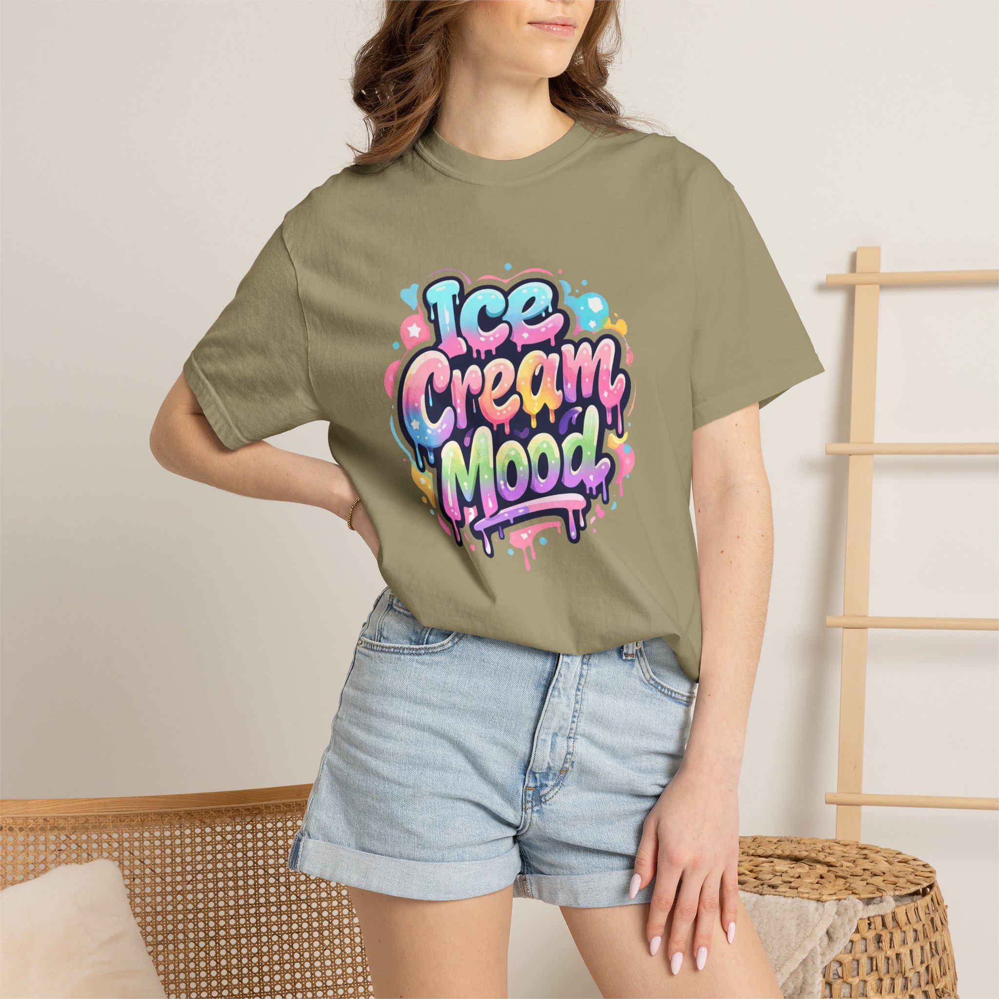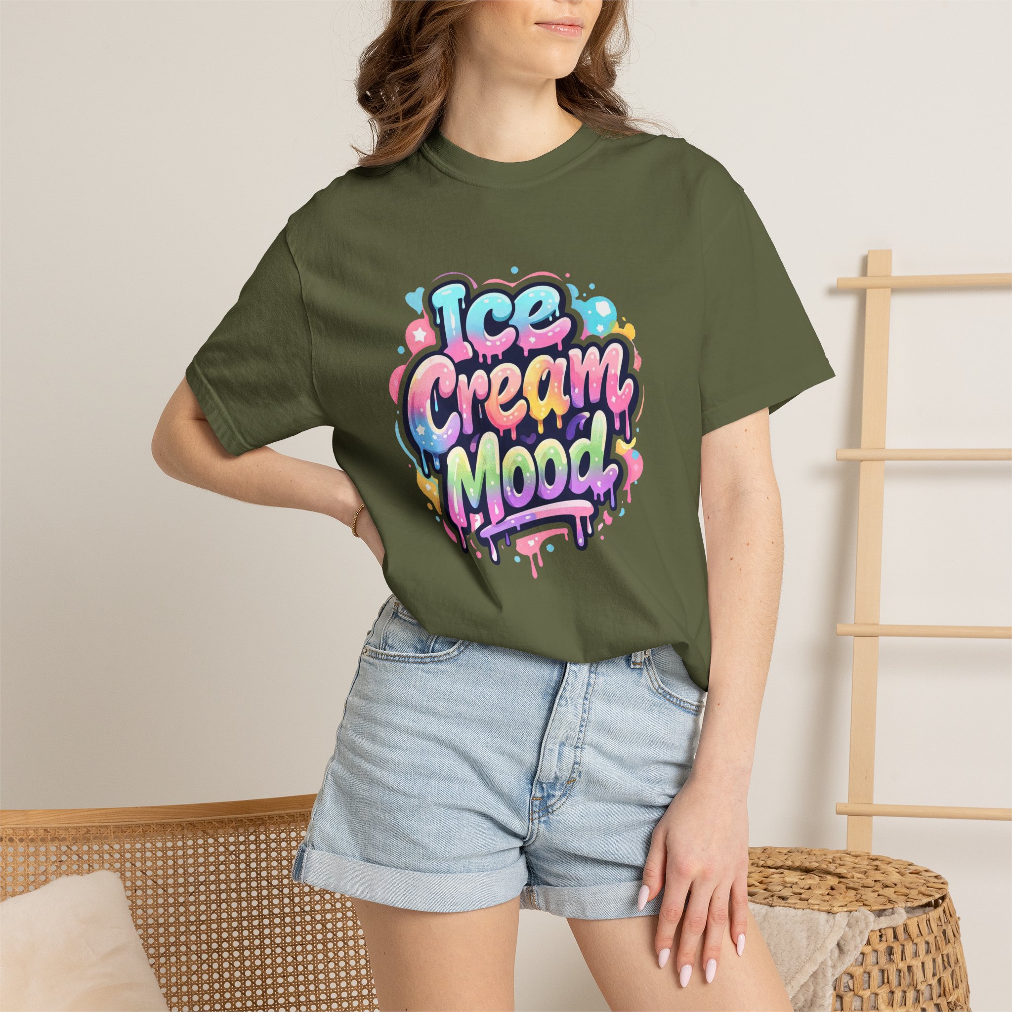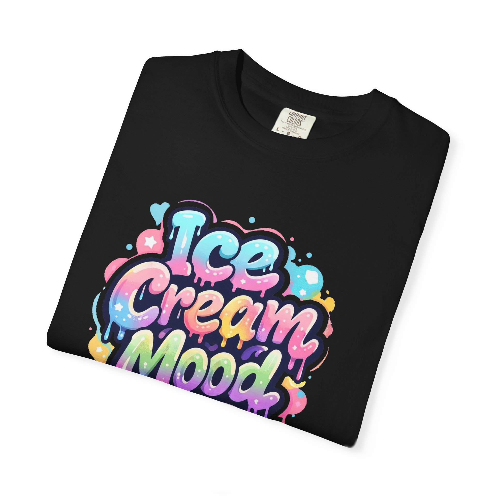 This soft, garment-dyed tee brings a playful, street-art energy to everyday wear. The relaxed, heavyweight cotton feels substantial yet broken-in from the first wear thanks to post-construction dyeing that creates a lived-in hand and gentle color variation. A vibrant, graffiti-style “Ice Cream Mood” graphic sits on the chest in pastel drips and bubble lettering — bright and nostalgic without feeling childish. Wear it to skateparks, weekend food markets, or when you want to layer under a denim jacket for an easy, colorful statement. The roomy fit and durable double-needle stitching mean it moves with you and stands up to repeated wear, while the tubular knit (no side seams) keeps the silhouette clean. Available in many colors and sizes, this tee blends bold, whimsical art with comfortable, long-lasting construction.