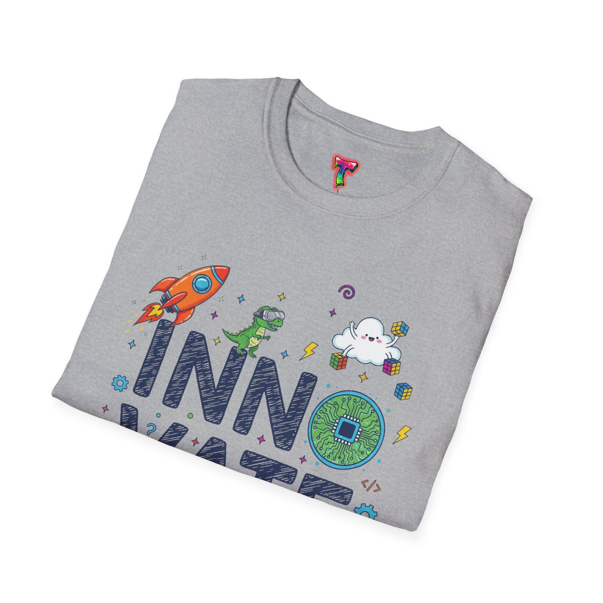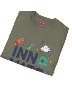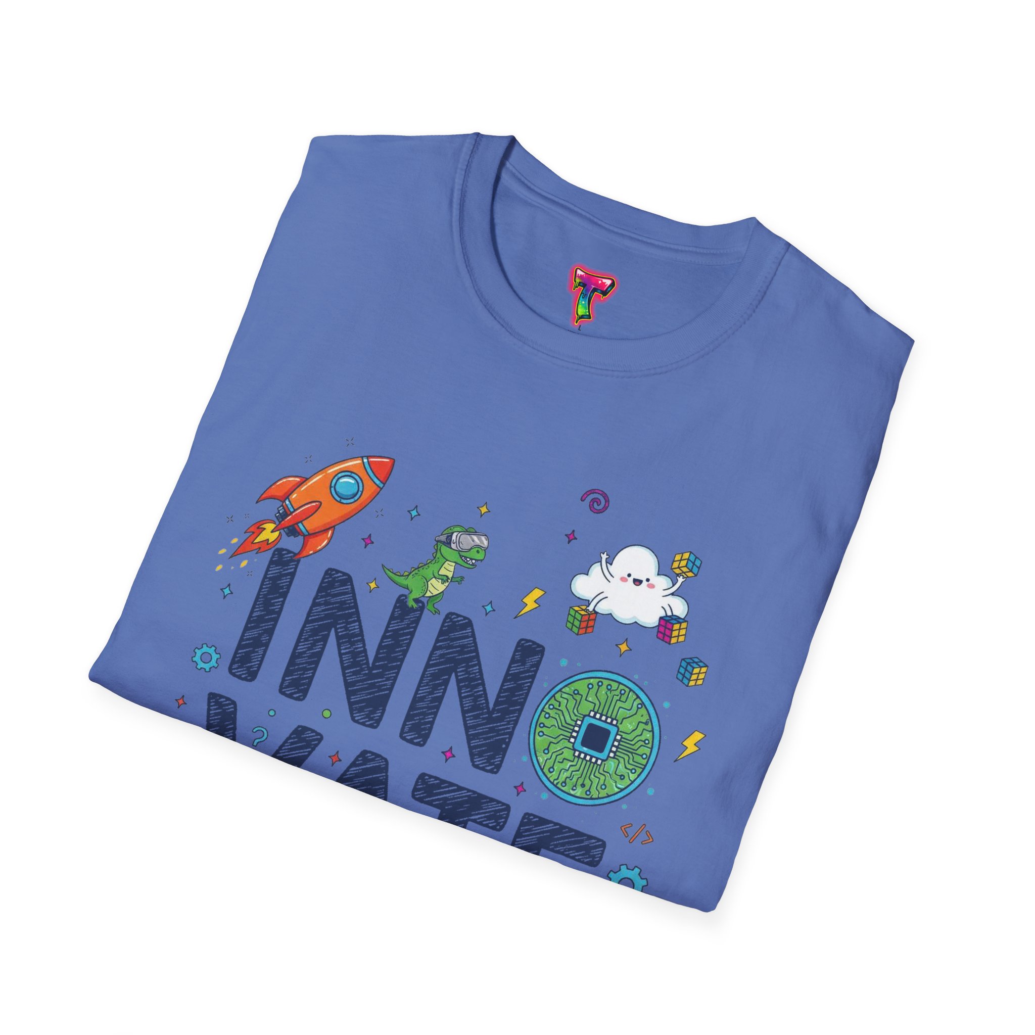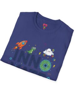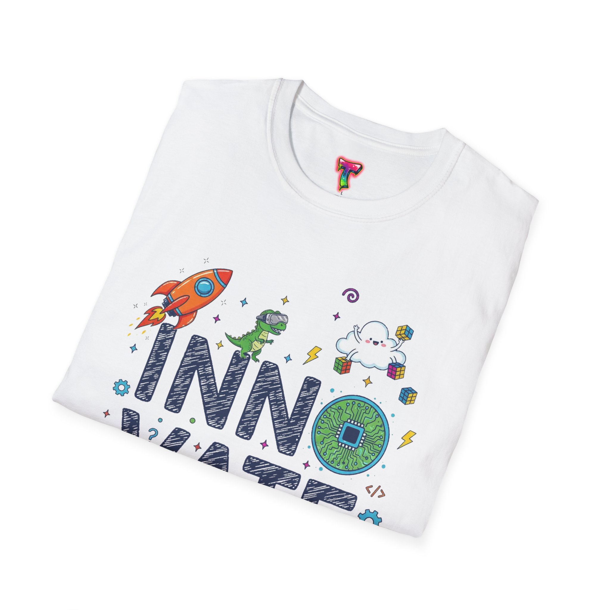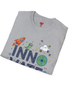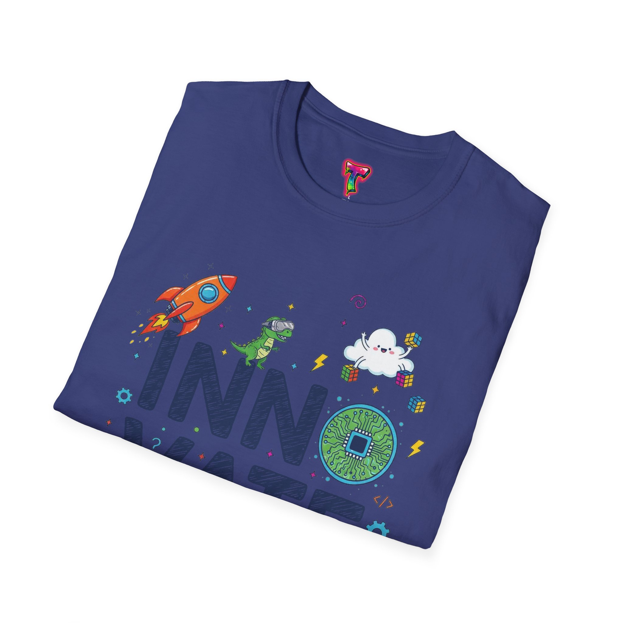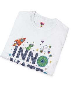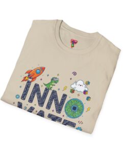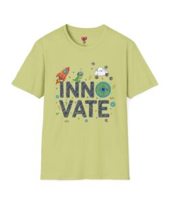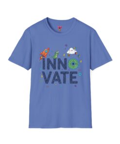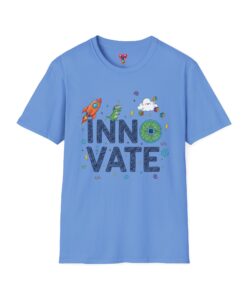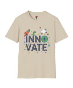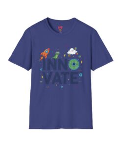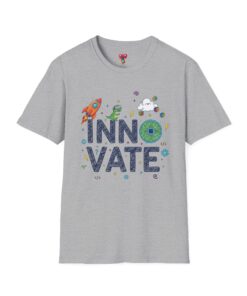 Wearable optimism for makers and dreamers. This lightweight crewneck tee pairs soft, ring-spun cotton with a playful, space-and-gear illustration that spells out “INNOVATE.” Bright rockets, planets and tiny cogs peek through bold lettering, giving the shirt a creative, workshop-to-hackathon energy. It sits comfortably across the shoulders with a ribbed collar that keeps its shape and a clean tubular knit body for a smooth silhouette. Toss it on for ideation sessions, casual lab days, or weekend maker meetups — it signals curiosity without shouting, and moves easily from a studio chair to a coffee run.