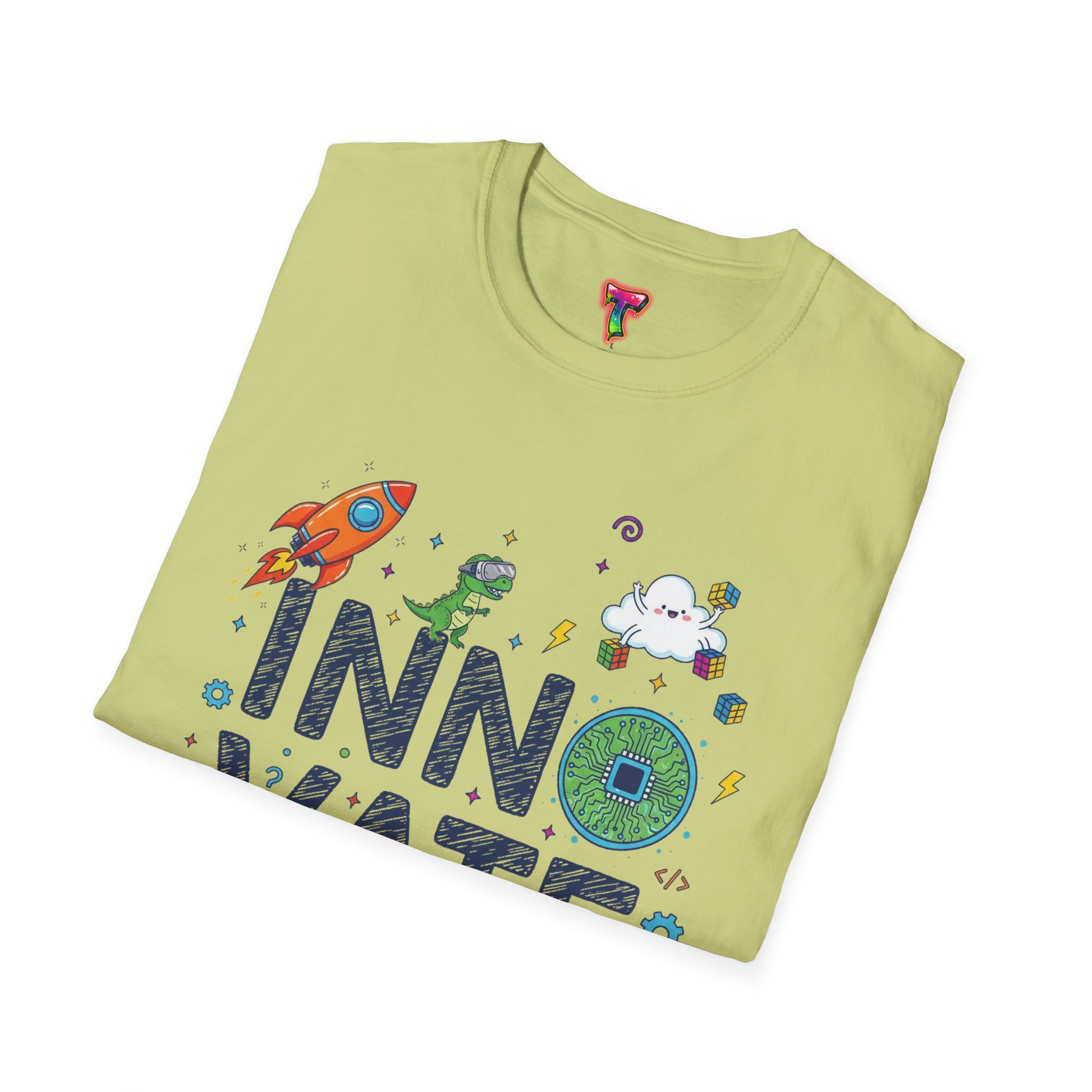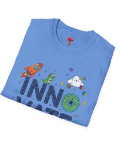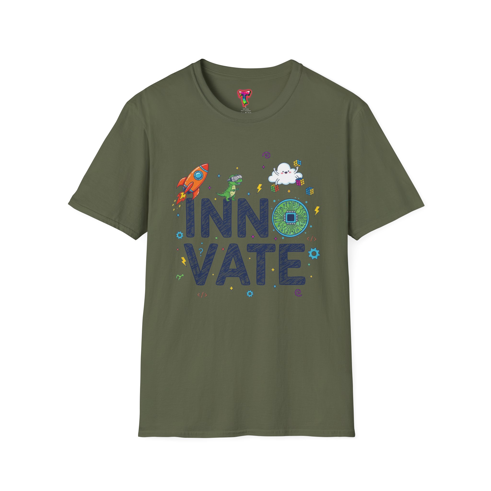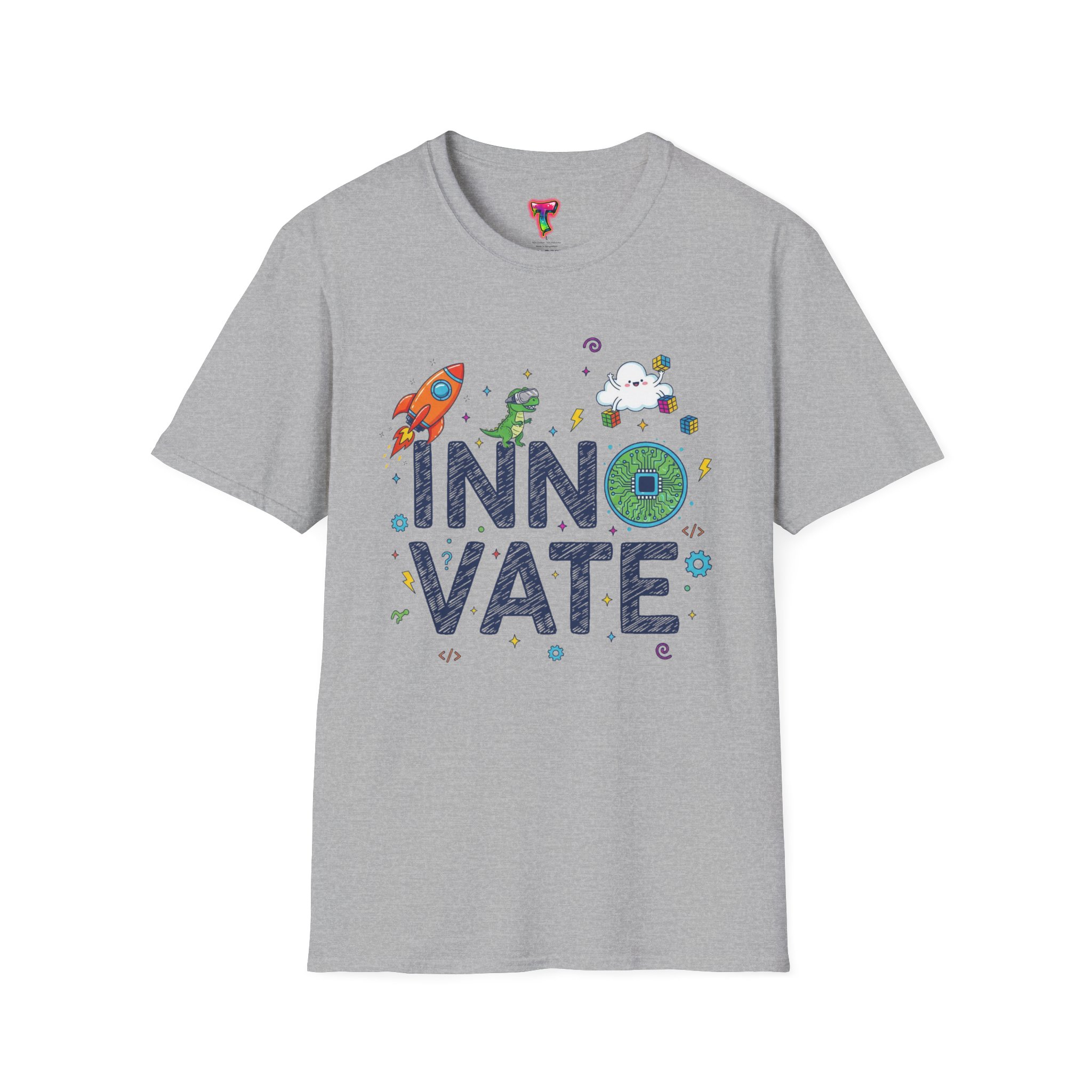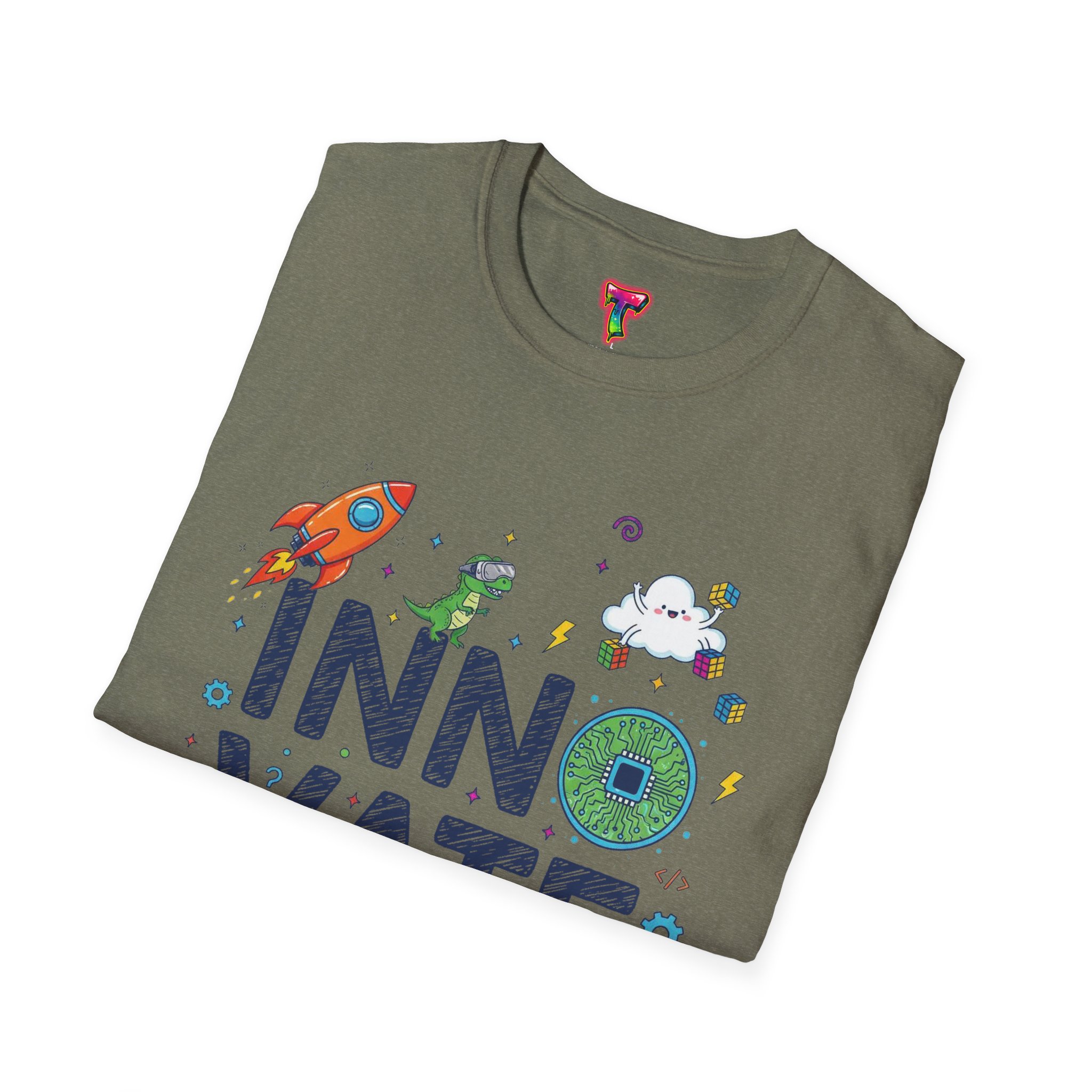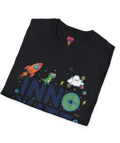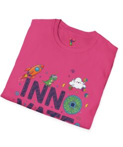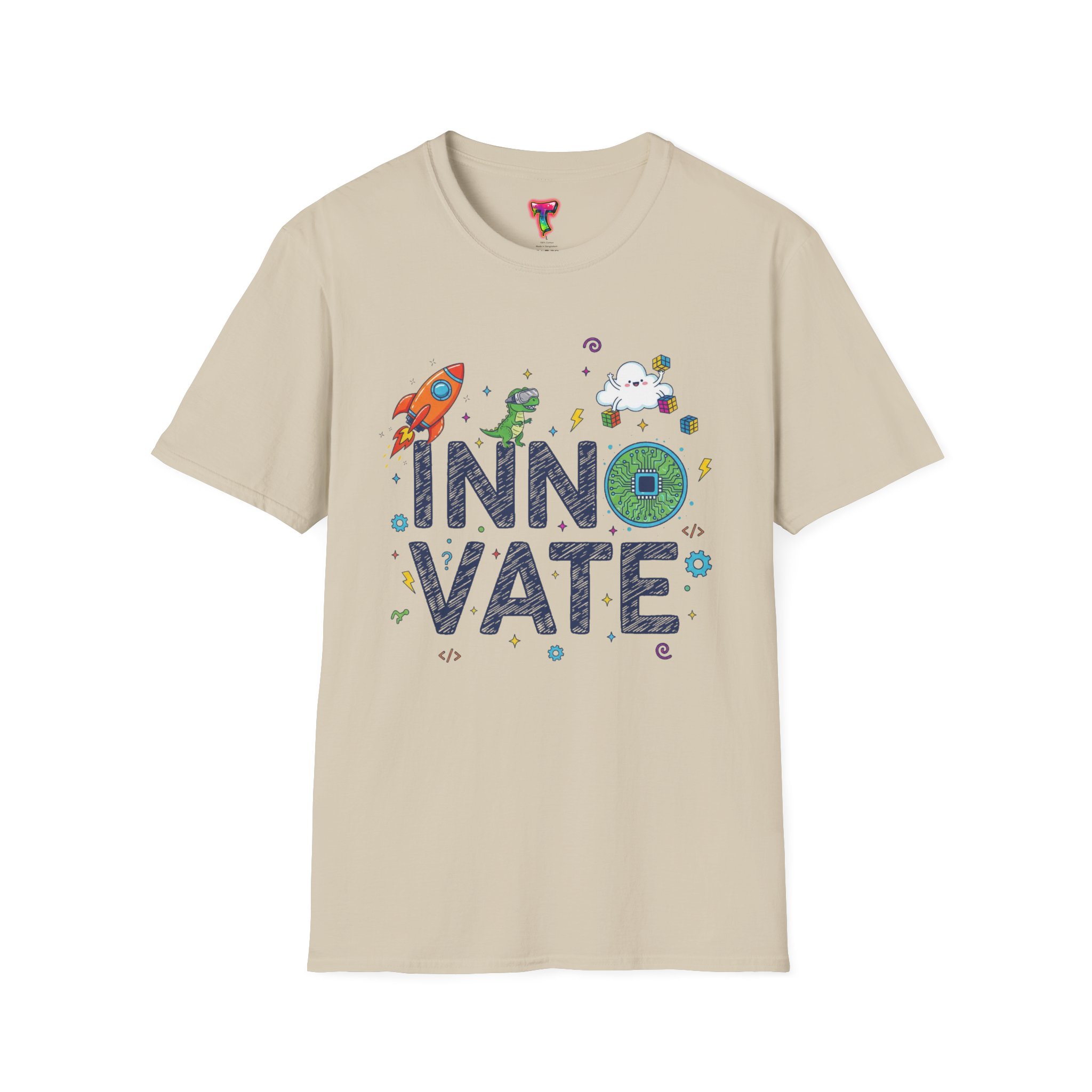 Wearable optimism for makers and dreamers. This lightweight crewneck tee pairs soft, ring-spun cotton with a playful, space-and-gear illustration that spells out “INNOVATE.” Bright rockets, planets and tiny cogs peek through bold lettering, giving the shirt a creative, workshop-to-hackathon energy. It sits comfortably across the shoulders with a ribbed collar that keeps its shape and a clean tubular knit body for a smooth silhouette. Toss it on for ideation sessions, casual lab days, or weekend maker meetups — it signals curiosity without shouting, and moves easily from a studio chair to a coffee run.
