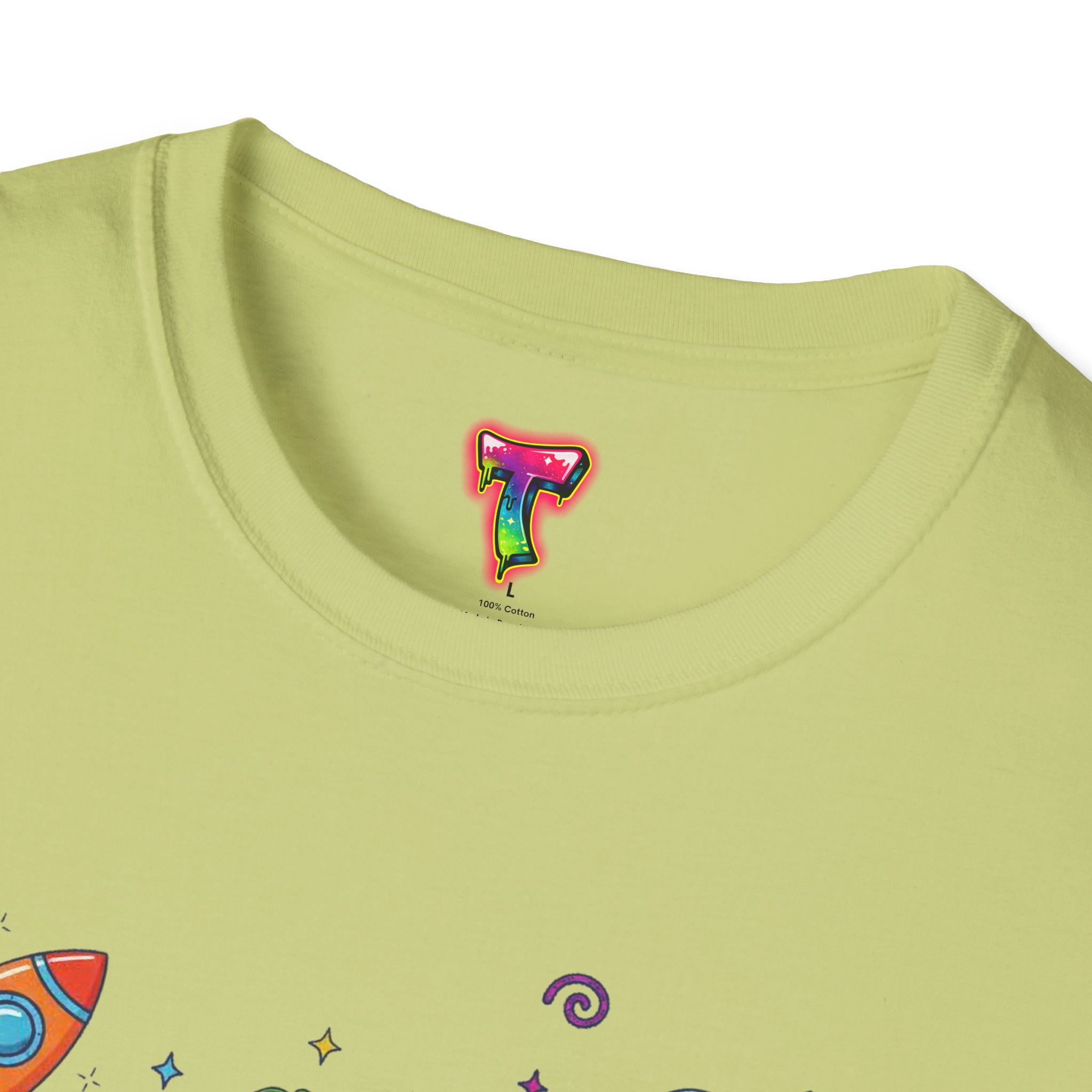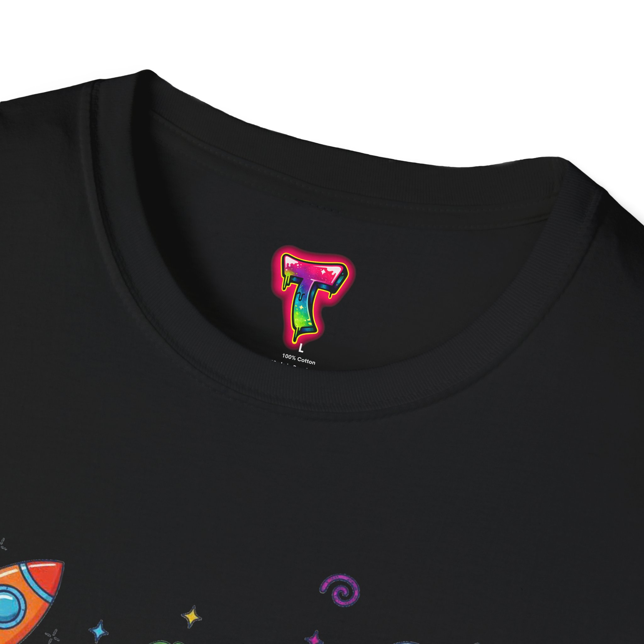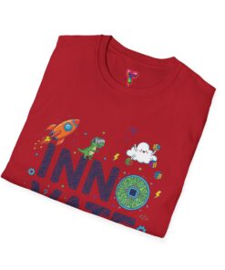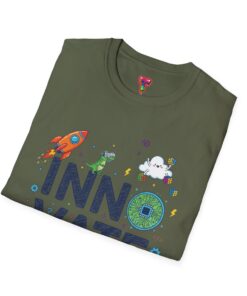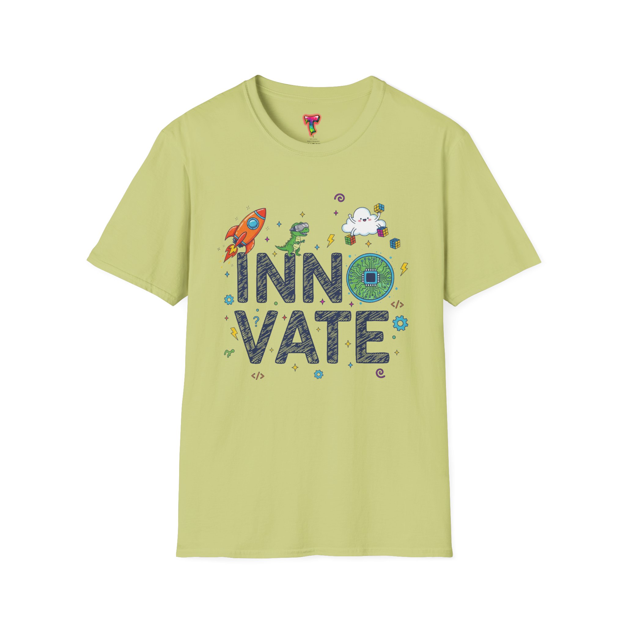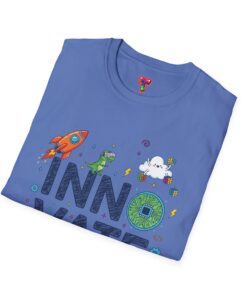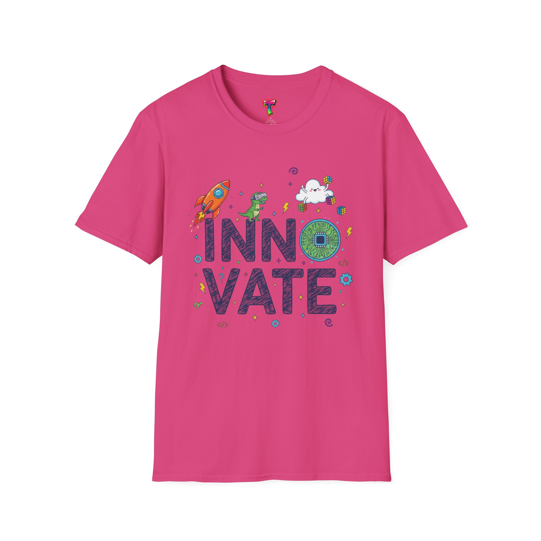 Wearable optimism for makers and dreamers. This lightweight crewneck tee pairs soft, ring-spun cotton with a playful, space-and-gear illustration that spells out “INNOVATE.” Bright rockets, planets and tiny cogs peek through bold lettering, giving the shirt a creative, workshop-to-hackathon energy. It sits comfortably across the shoulders with a ribbed collar that keeps its shape and a clean tubular knit body for a smooth silhouette. Toss it on for ideation sessions, casual lab days, or weekend maker meetups — it signals curiosity without shouting, and moves easily from a studio chair to a coffee run.