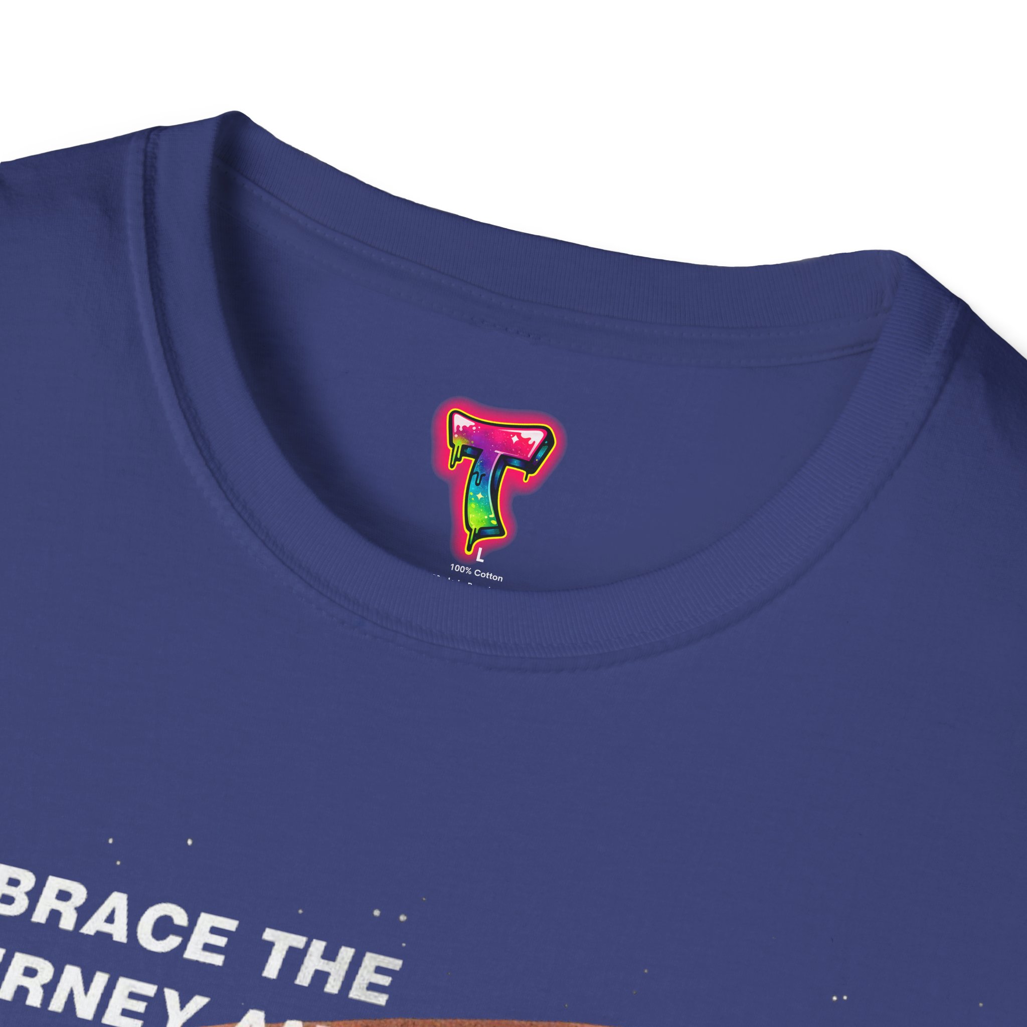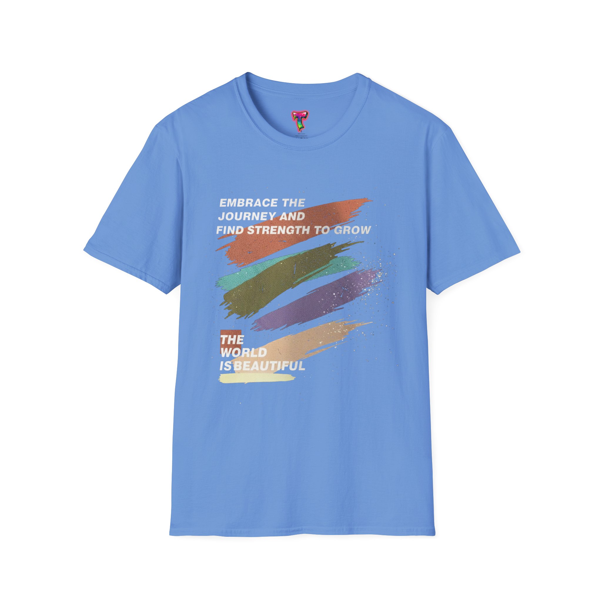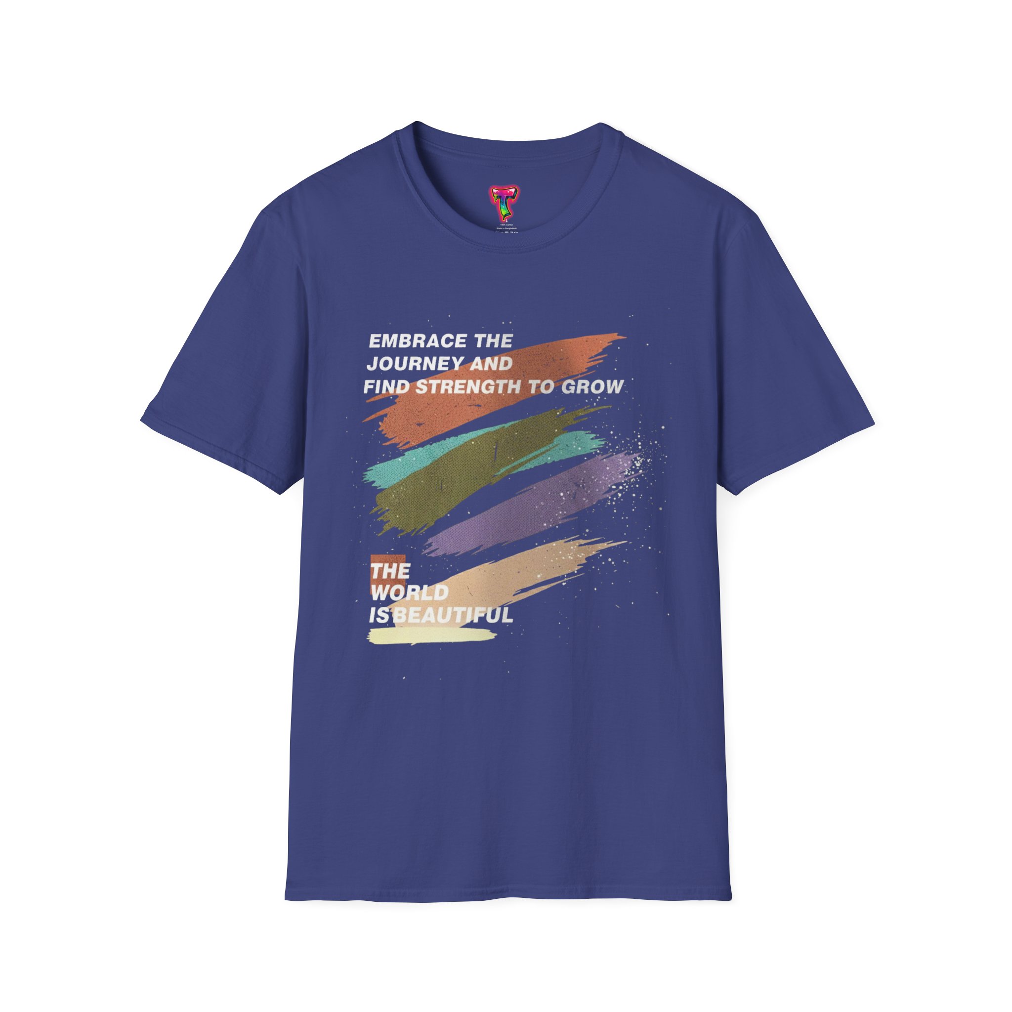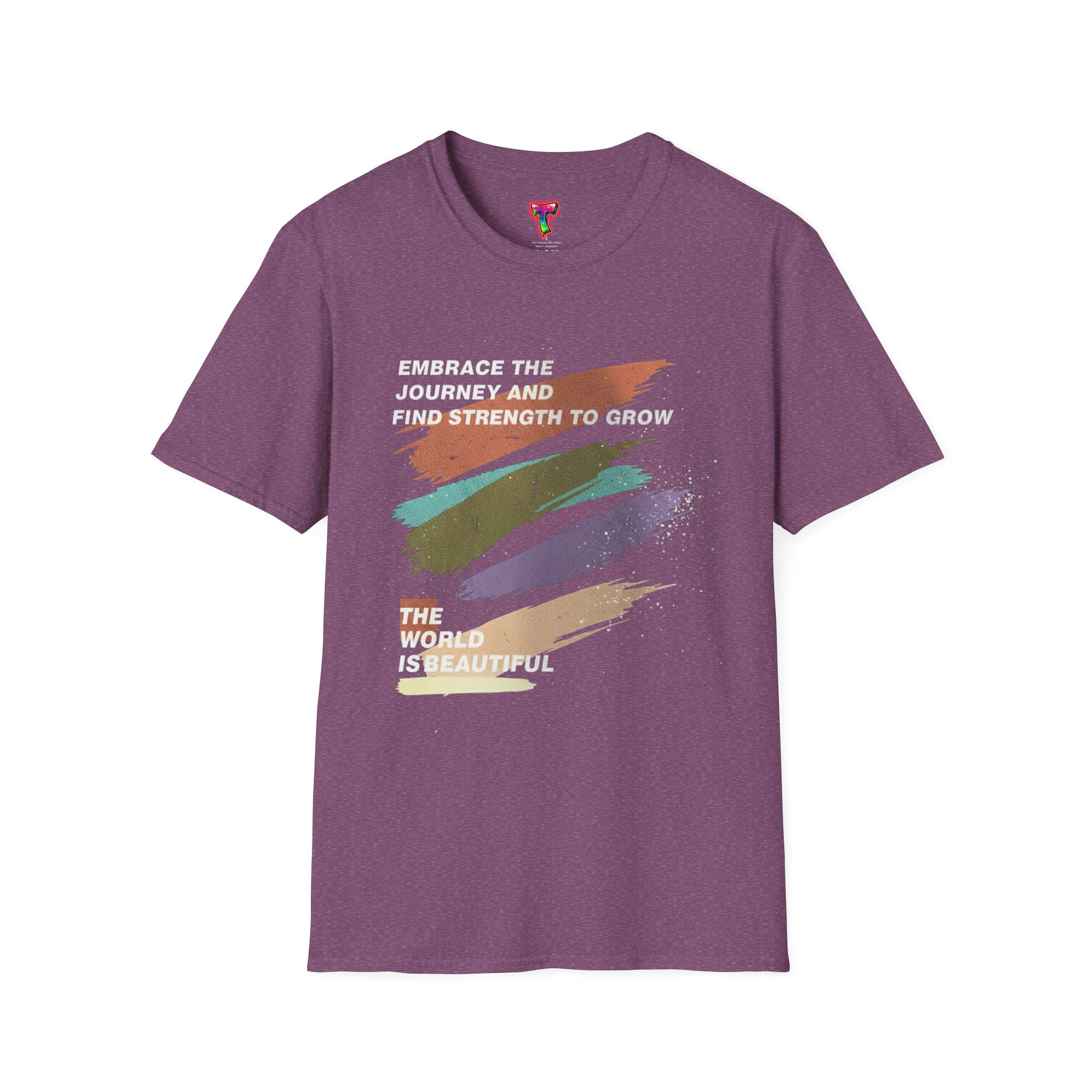 A soft, lived-in tee that feels like a quiet pep talk. Brushstrokes of warm, earthy tones sweep across the chest, layered with the hopeful lines “Embrace the journey and find strength to grow” and “The world is beautiful.” Lightweight and whisper-soft, it drapes easily and moves with you — whether you’re stepping out for a morning coffee, wandering a gallery, or pausing on a city bench to breathe. The muted palette reads gentle and resilient; the message sits like a small reminder to keep going and look for beauty in the everyday.