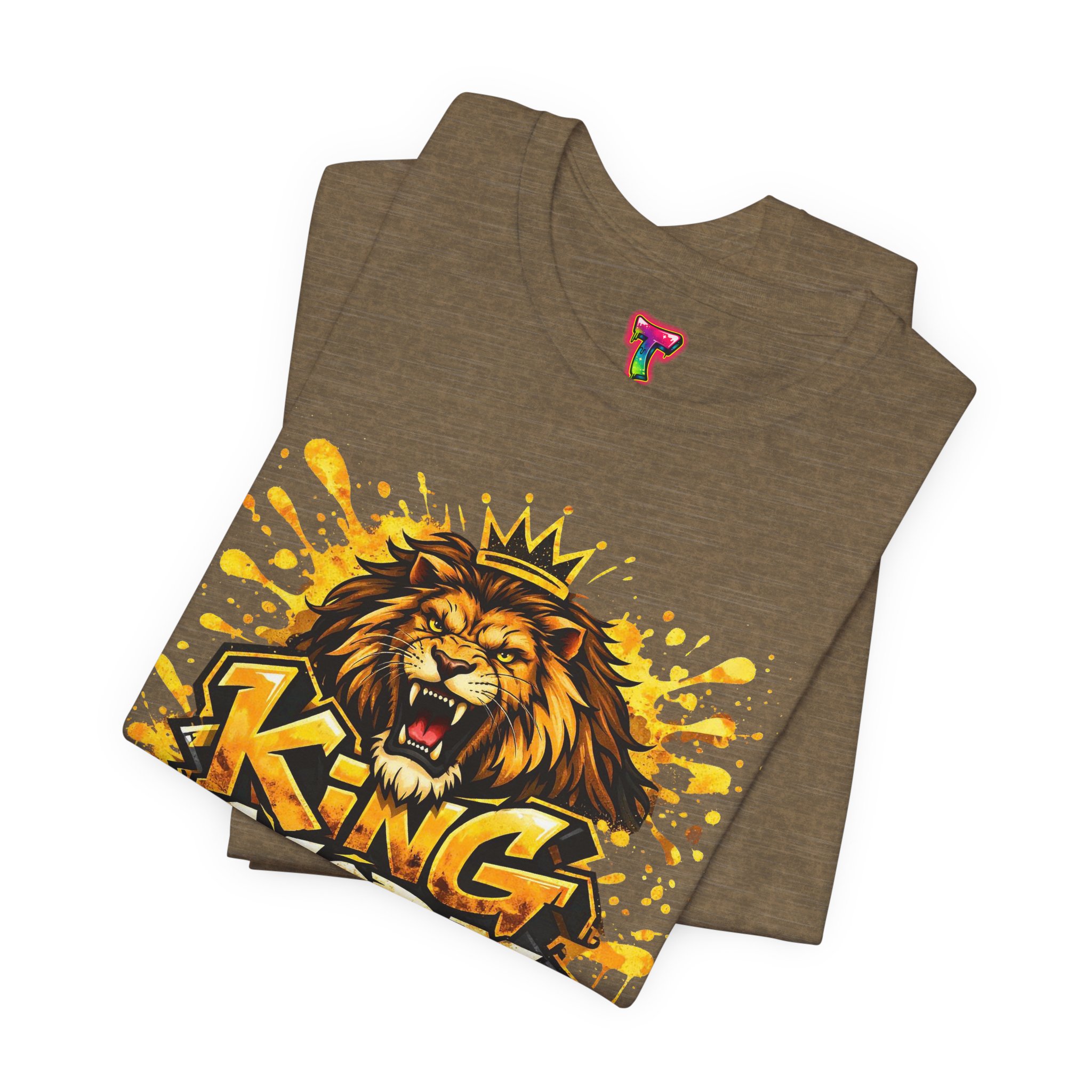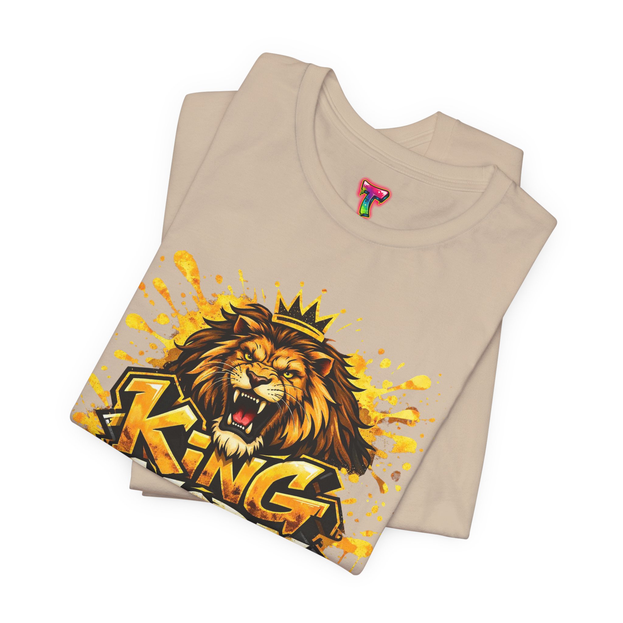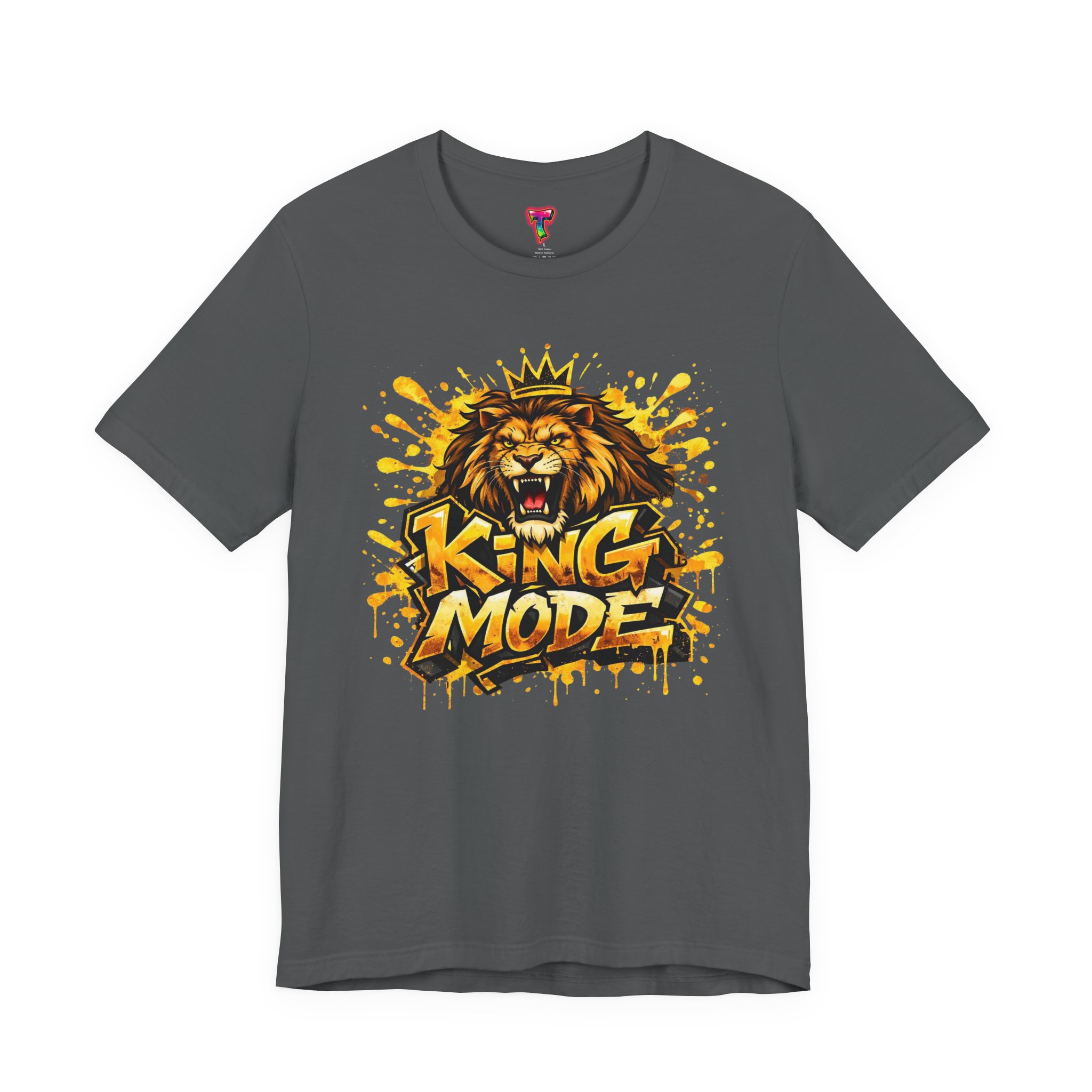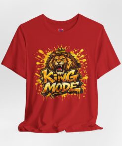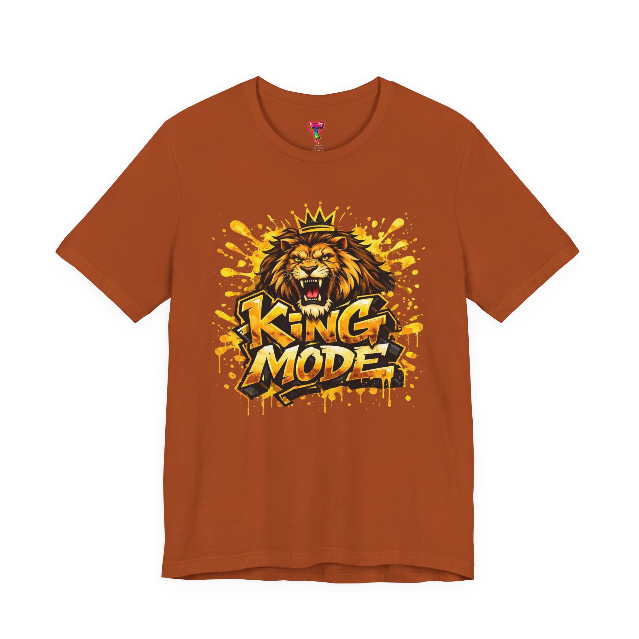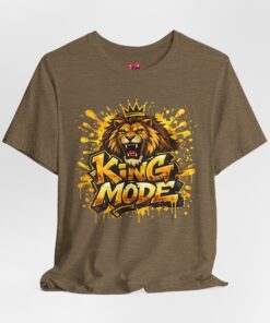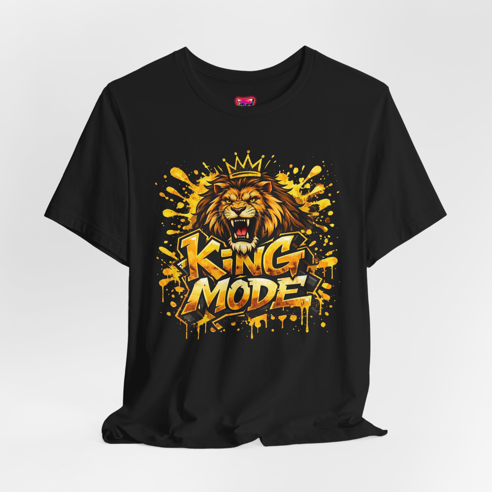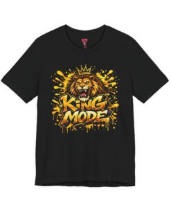 Tap into a bold, unapologetic vibe with this lightweight jersey tee. A fierce lion head roars above graffiti-style “KING MODE” lettering, rendered in sunlit golds and inked black accents that feel alive with movement. The print’s splashes and drips give it an urban, street-art energy—wear it when you want to carry a little confidence into gym sessions, weekend hangouts, or low-key nights out. The crew neck and clean retail fit keep the silhouette simple so the artwork stays the focal point. Breathable cotton and thoughtful construction make it comfortable for long days and active plans.