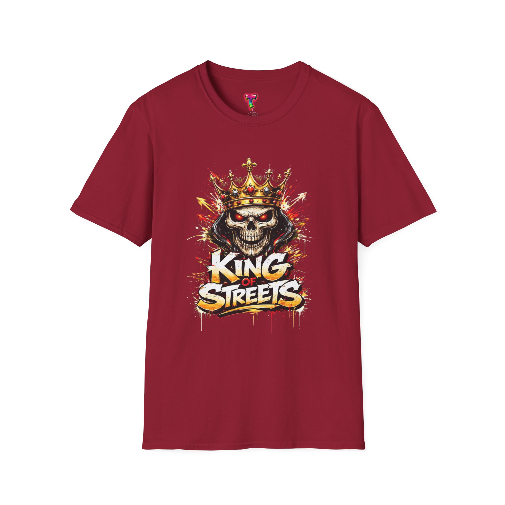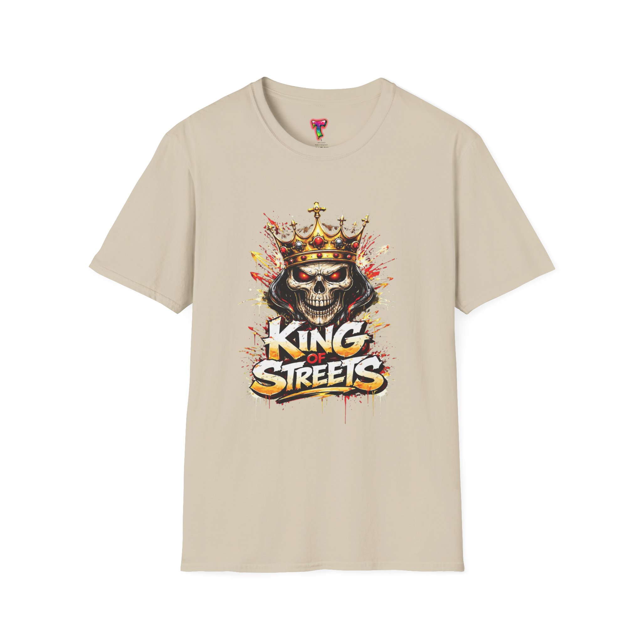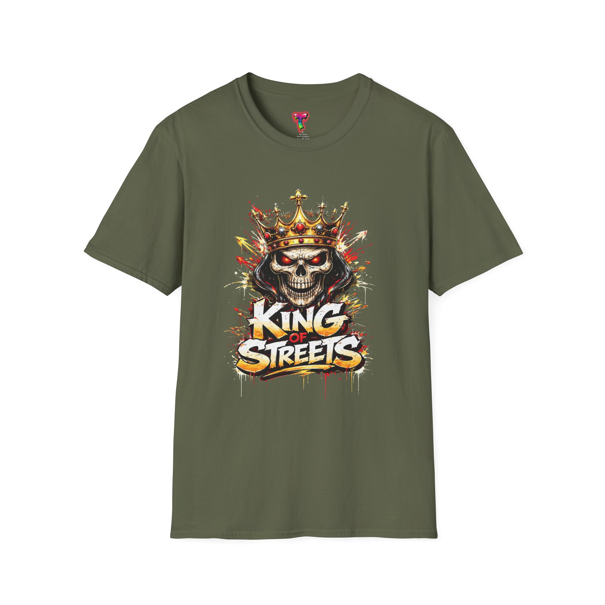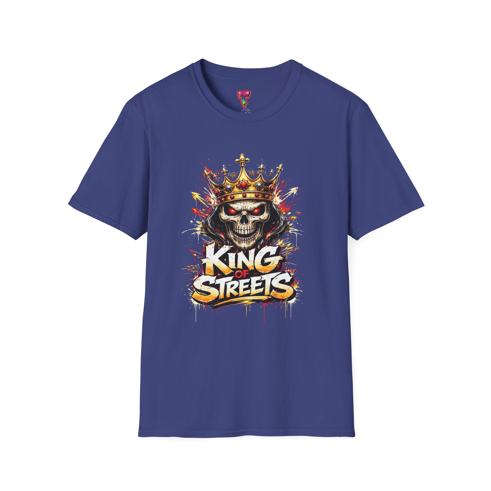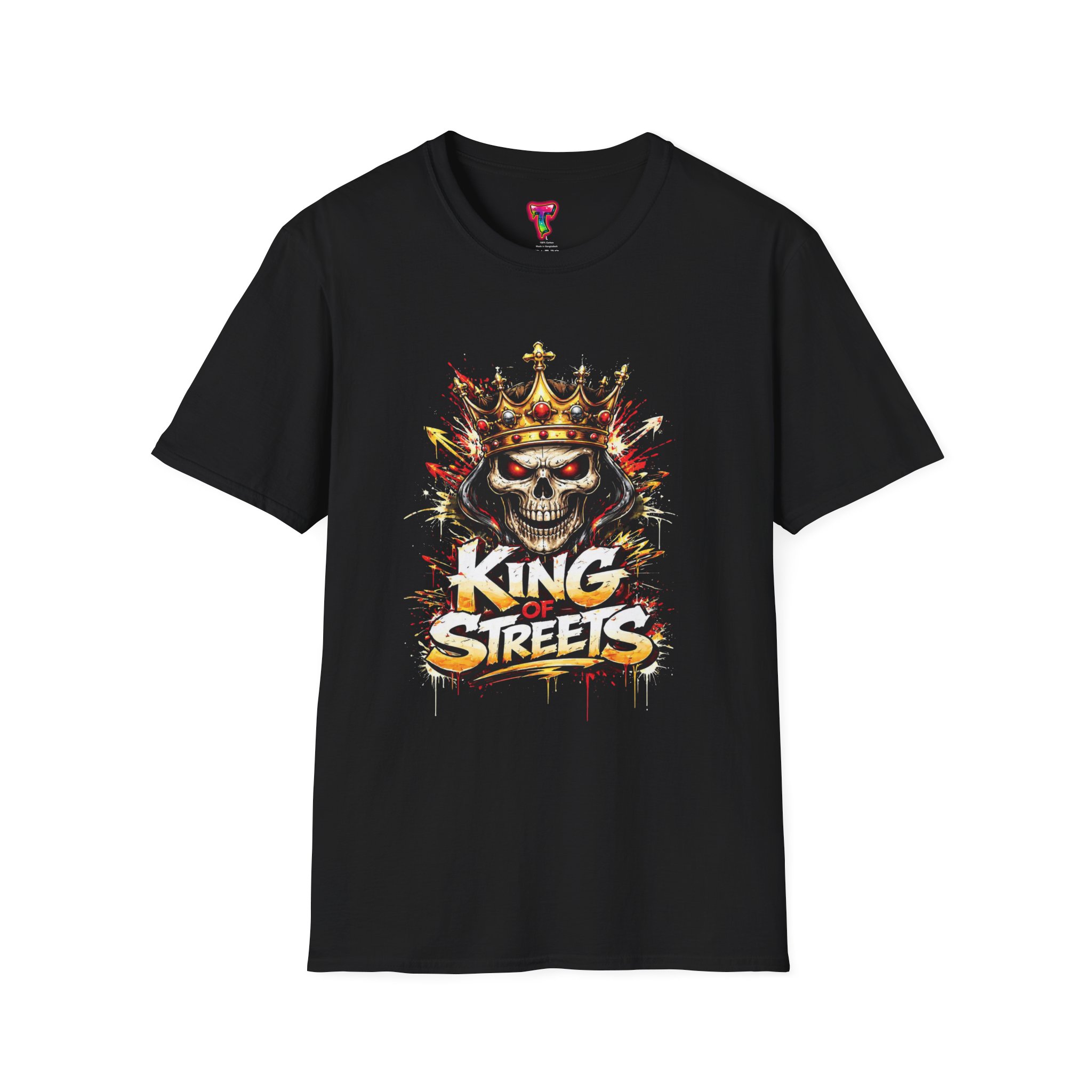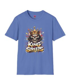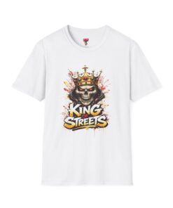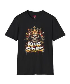 This lightweight cotton tee carries attitude. A bold graphic—an ornate crowned skull with graffiti-style splashes and the words “King of Streets”—sits center chest, turning a simple shirt into a statement piece. The soft, ring-spun cotton feels smooth against skin; tubular knit and shoulder tape keep the silhouette clean and stable wash after wash. Wear it layered under a denim jacket for late-night rides or alone while cruising the city; the urban artwork reads loud and confident without shouting. Built with tear-away labels and a resilient ribbed collar, it’s made for everyday movement and long nights out. Printed with high-quality methods so the colors stay vivid, this tee lives where grit meets craft.