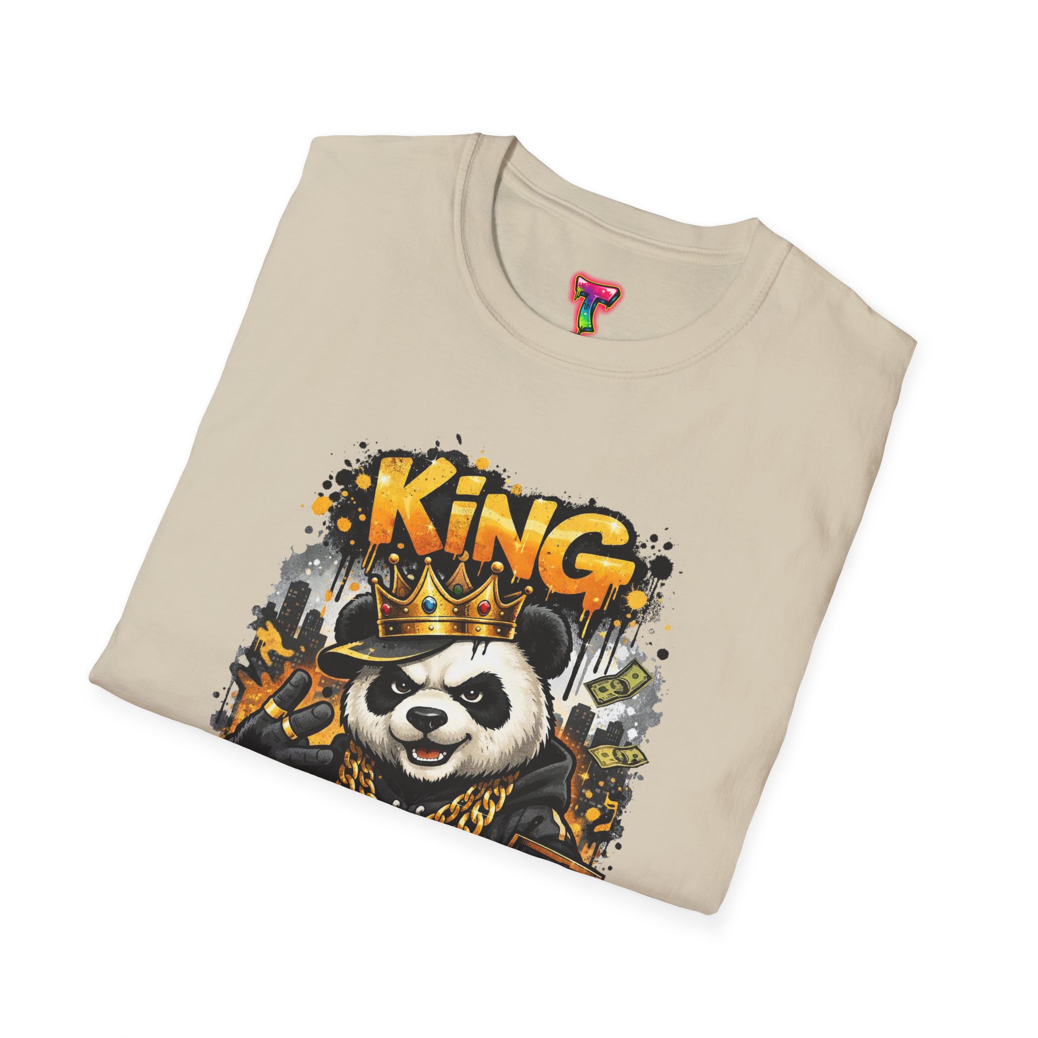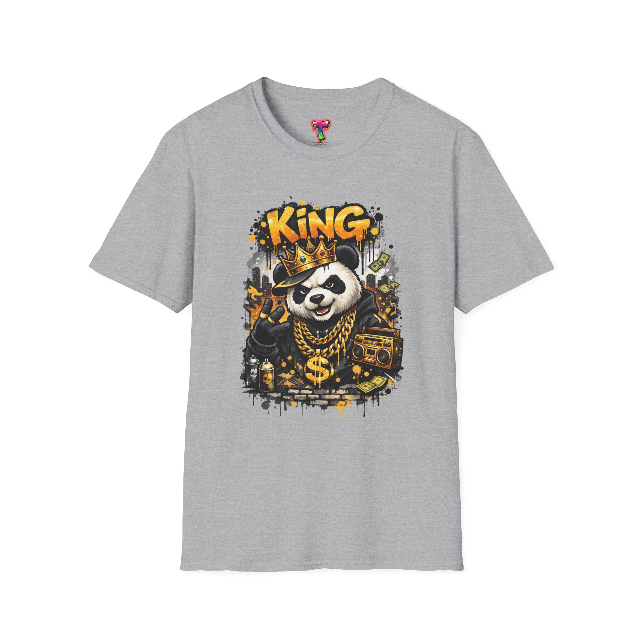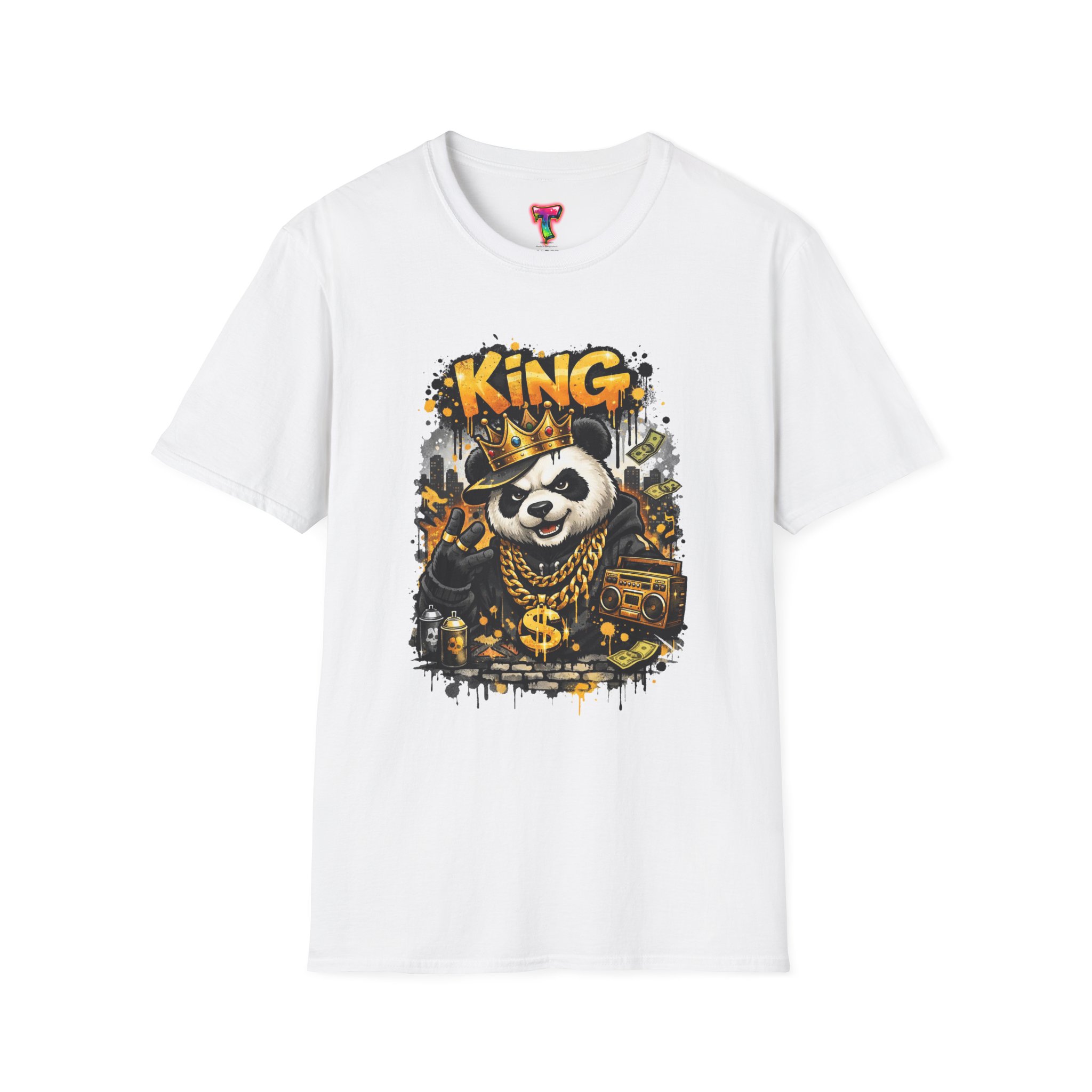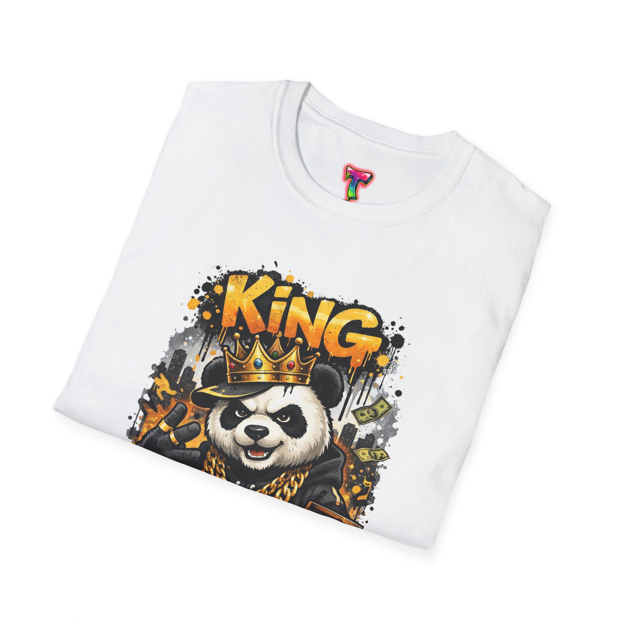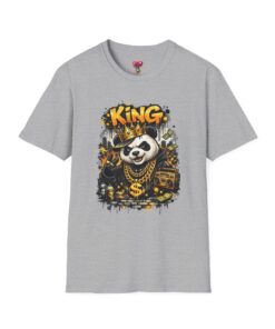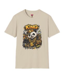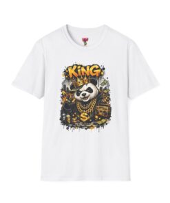 This lightweight crew tee brings playful swagger to everyday wear. A bold, graffiti-inspired panda sporting a crown and gold chains is printed on a soft white canvas, blending street art energy with a hint of tongue-in-cheek luxury. The shirt sits comfortably on the body with a classic fit and a resilient ribbed neckline that keeps its shape. Wear it layered under a jacket or alone on warm days — it reads like an inside joke for people who love urban style and a little fun in their wardrobe. The art pops without overwhelming, inviting smiles and double-takes from friends who appreciate quirky, character-driven designs.