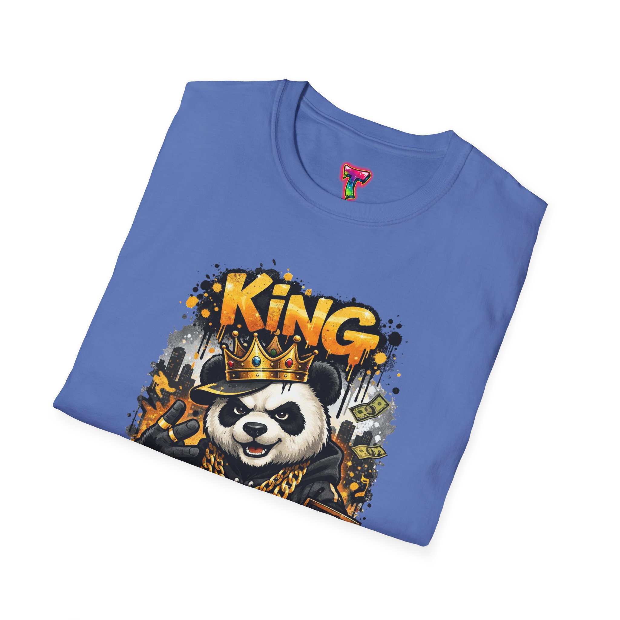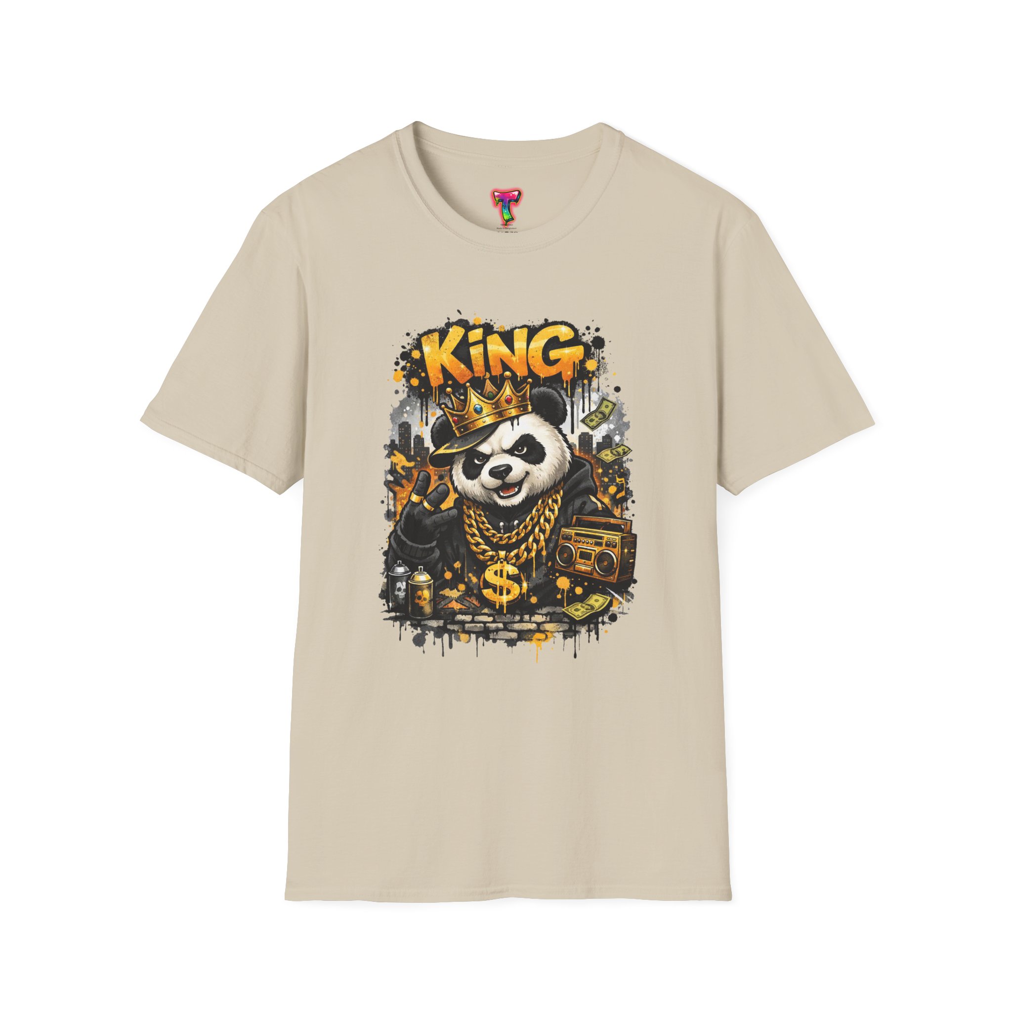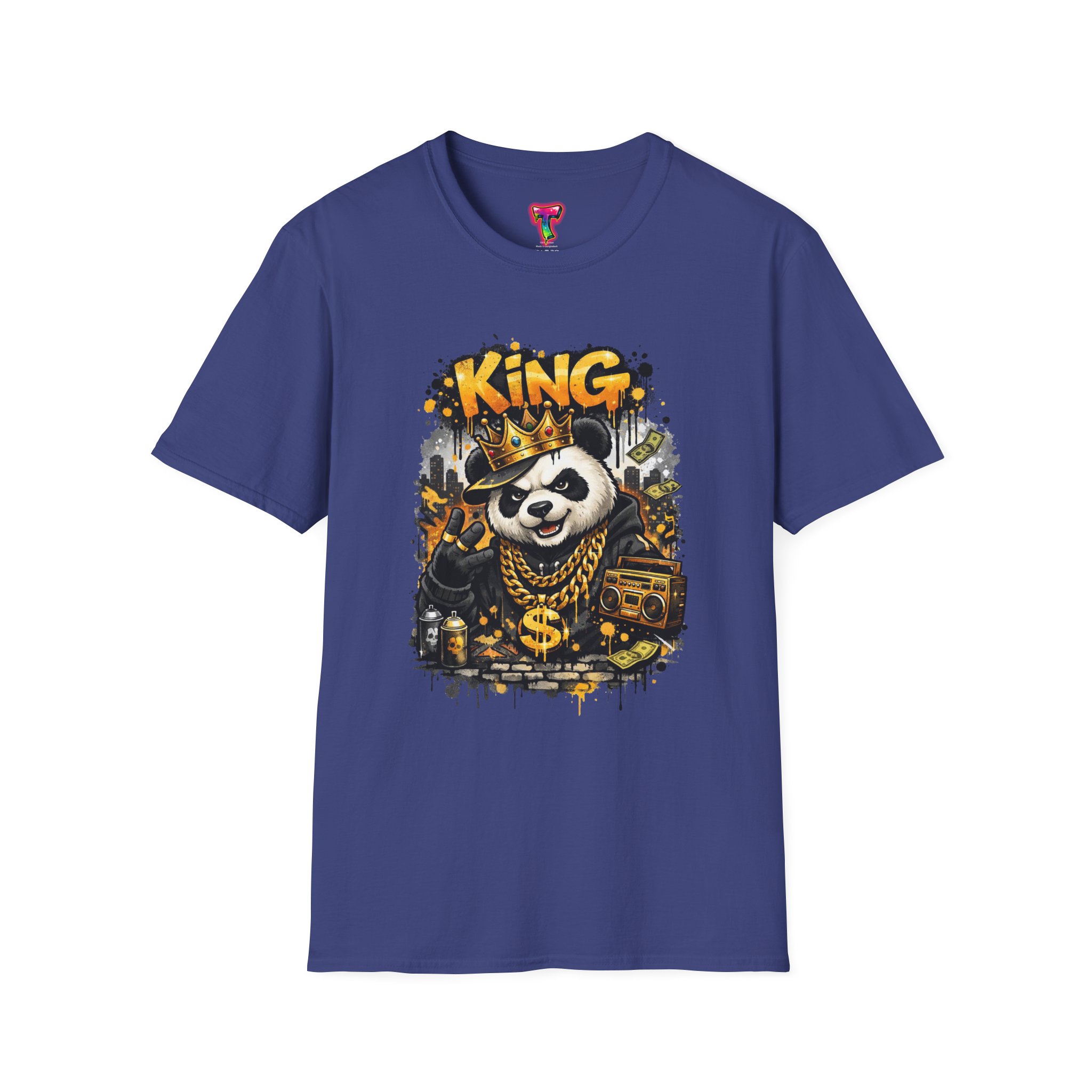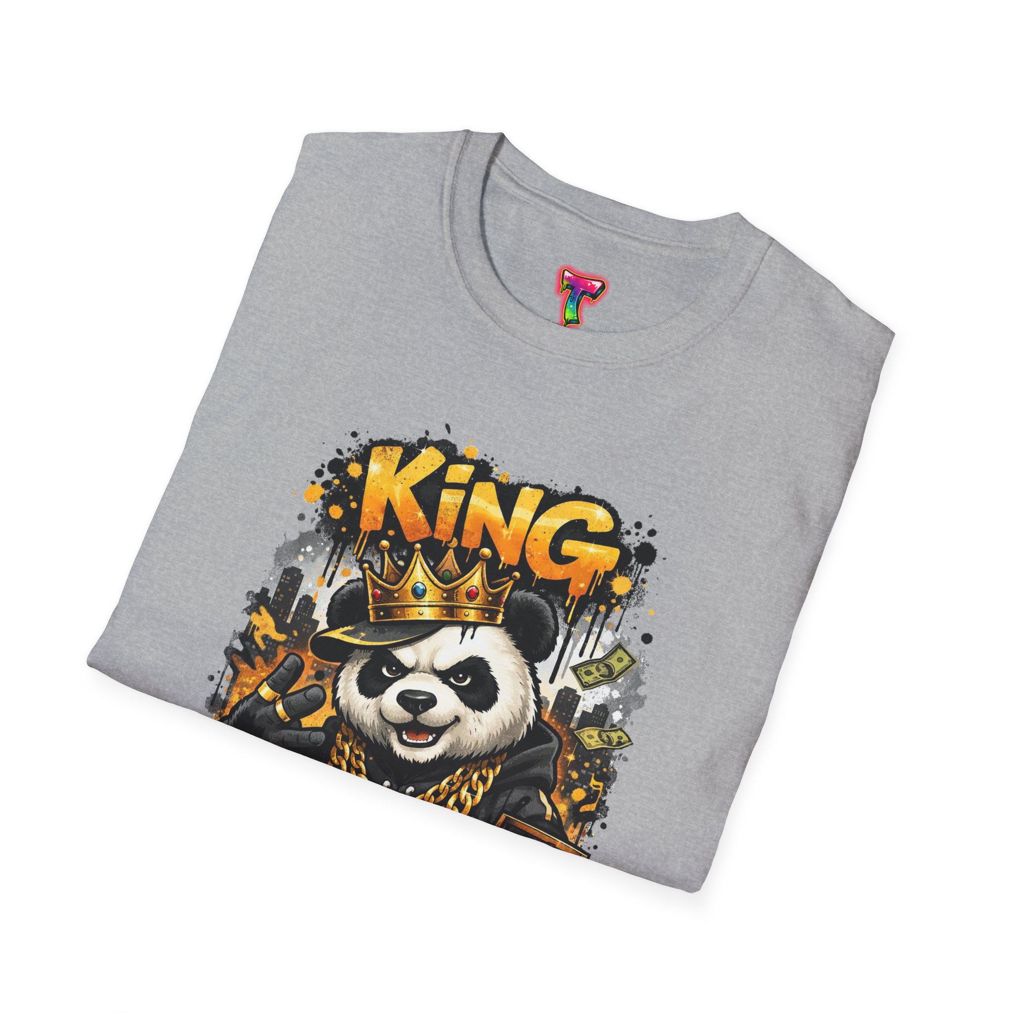 This lightweight crew tee brings playful swagger to everyday wear. A bold, graffiti-inspired panda sporting a crown and gold chains is printed on a soft white canvas, blending street art energy with a hint of tongue-in-cheek luxury. The shirt sits comfortably on the body with a classic fit and a resilient ribbed neckline that keeps its shape. Wear it layered under a jacket or alone on warm days — it reads like an inside joke for people who love urban style and a little fun in their wardrobe. The art pops without overwhelming, inviting smiles and double-takes from friends who appreciate quirky, character-driven designs.