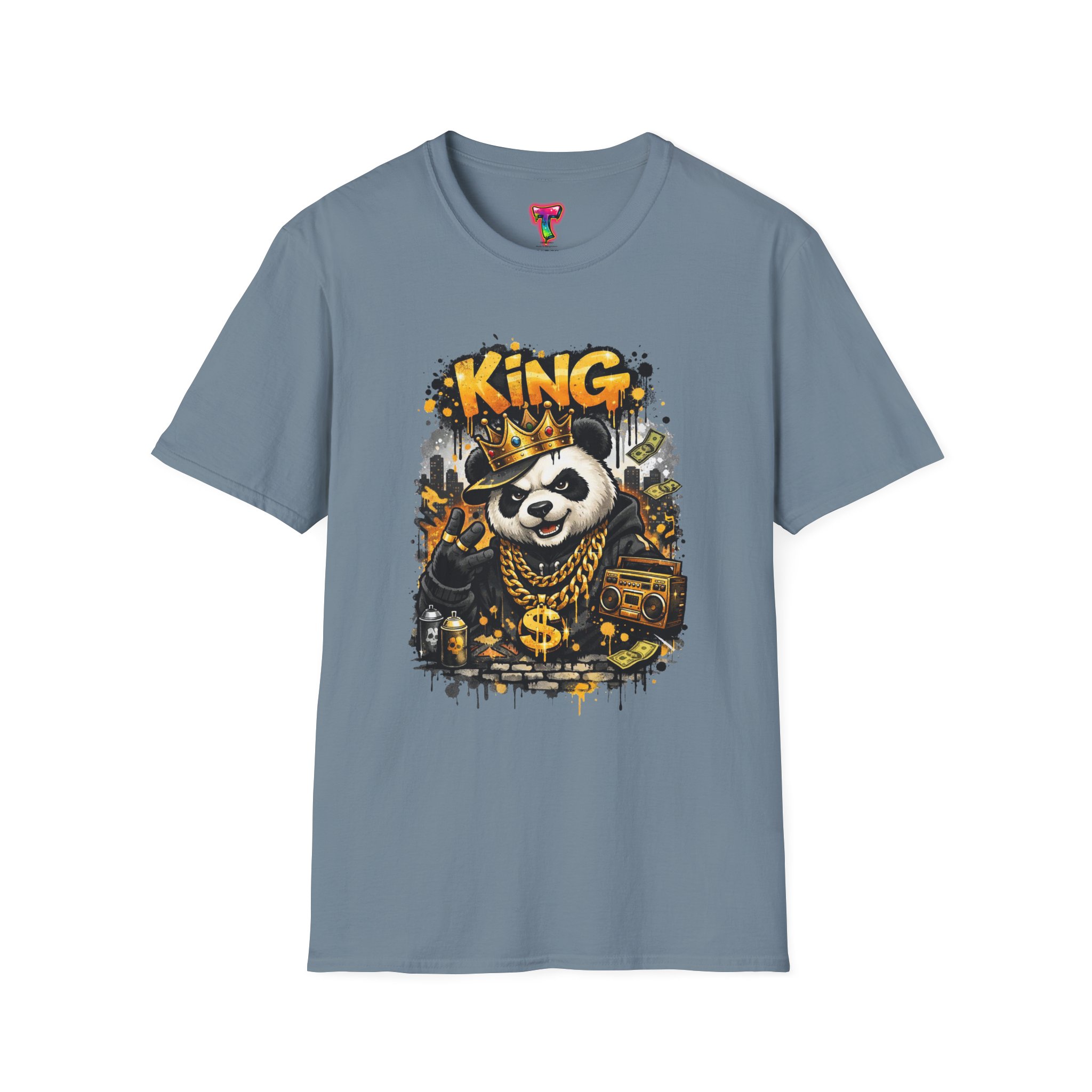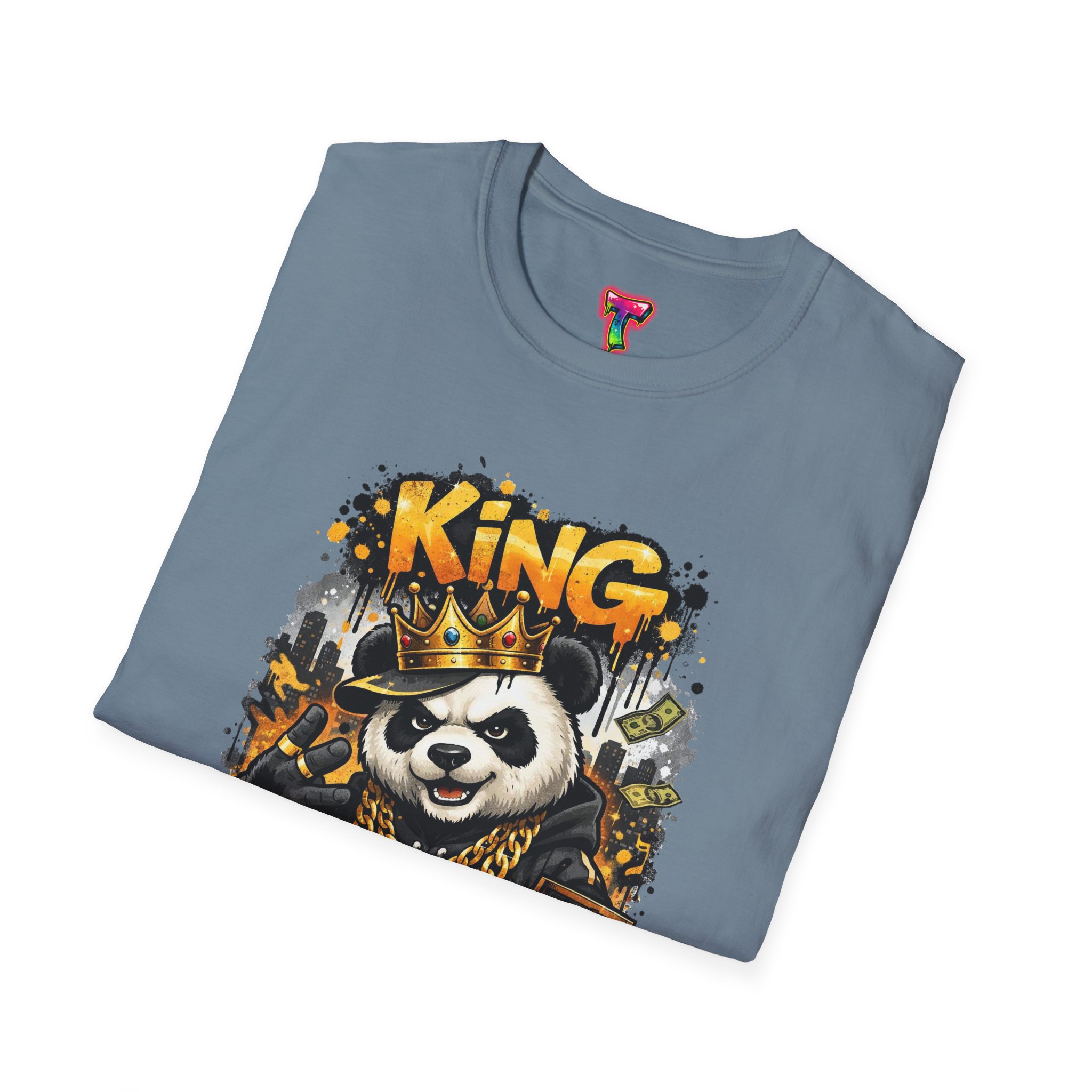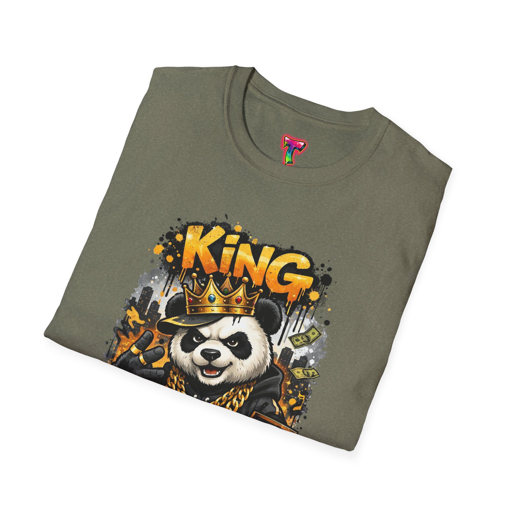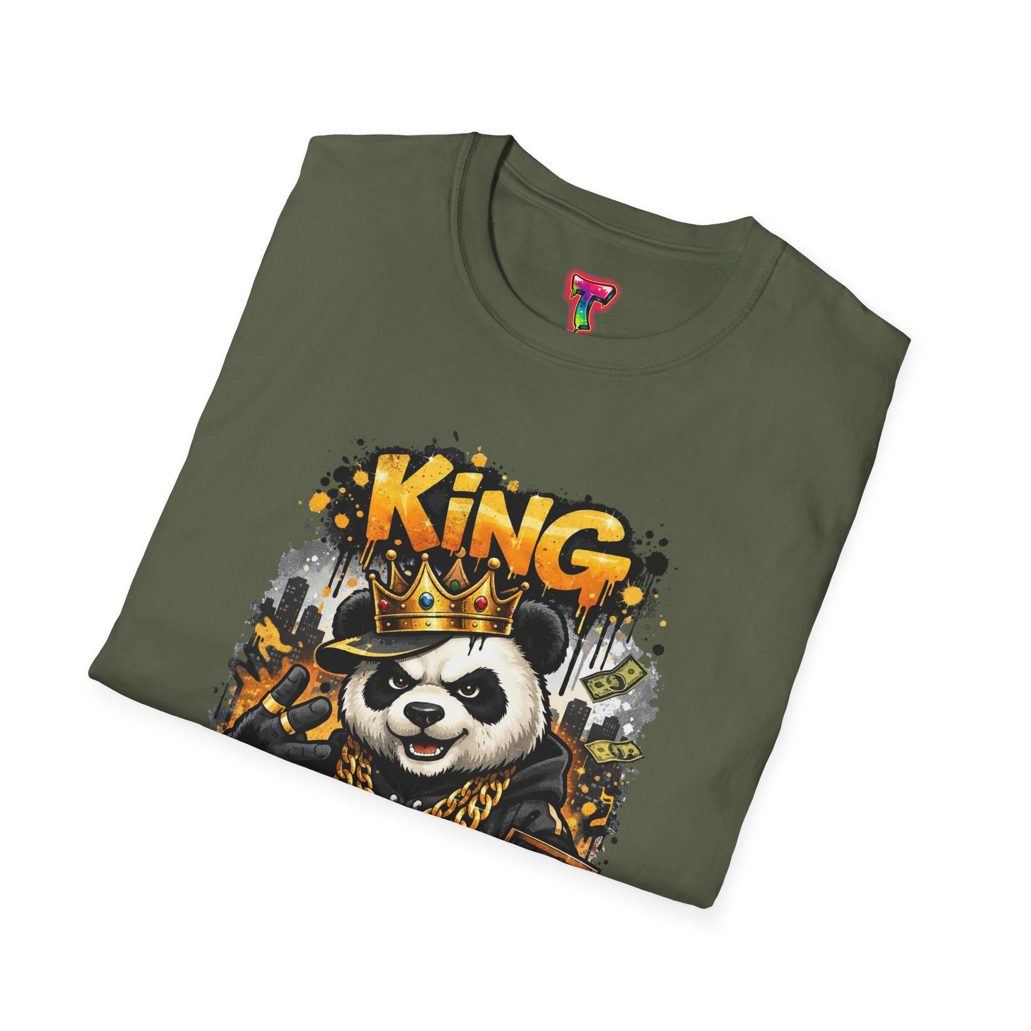 This lightweight crew tee brings playful swagger to everyday wear. A bold, graffiti-inspired panda sporting a crown and gold chains is printed on a soft white canvas, blending street art energy with a hint of tongue-in-cheek luxury. The shirt sits comfortably on the body with a classic fit and a resilient ribbed neckline that keeps its shape. Wear it layered under a jacket or alone on warm days — it reads like an inside joke for people who love urban style and a little fun in their wardrobe. The art pops without overwhelming, inviting smiles and double-takes from friends who appreciate quirky, character-driven designs.