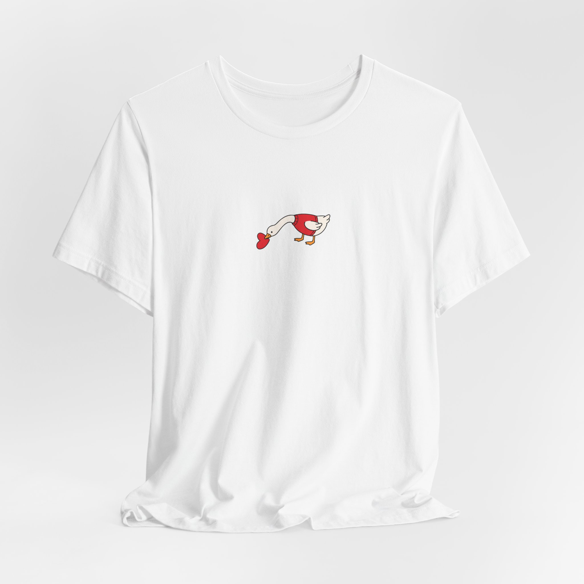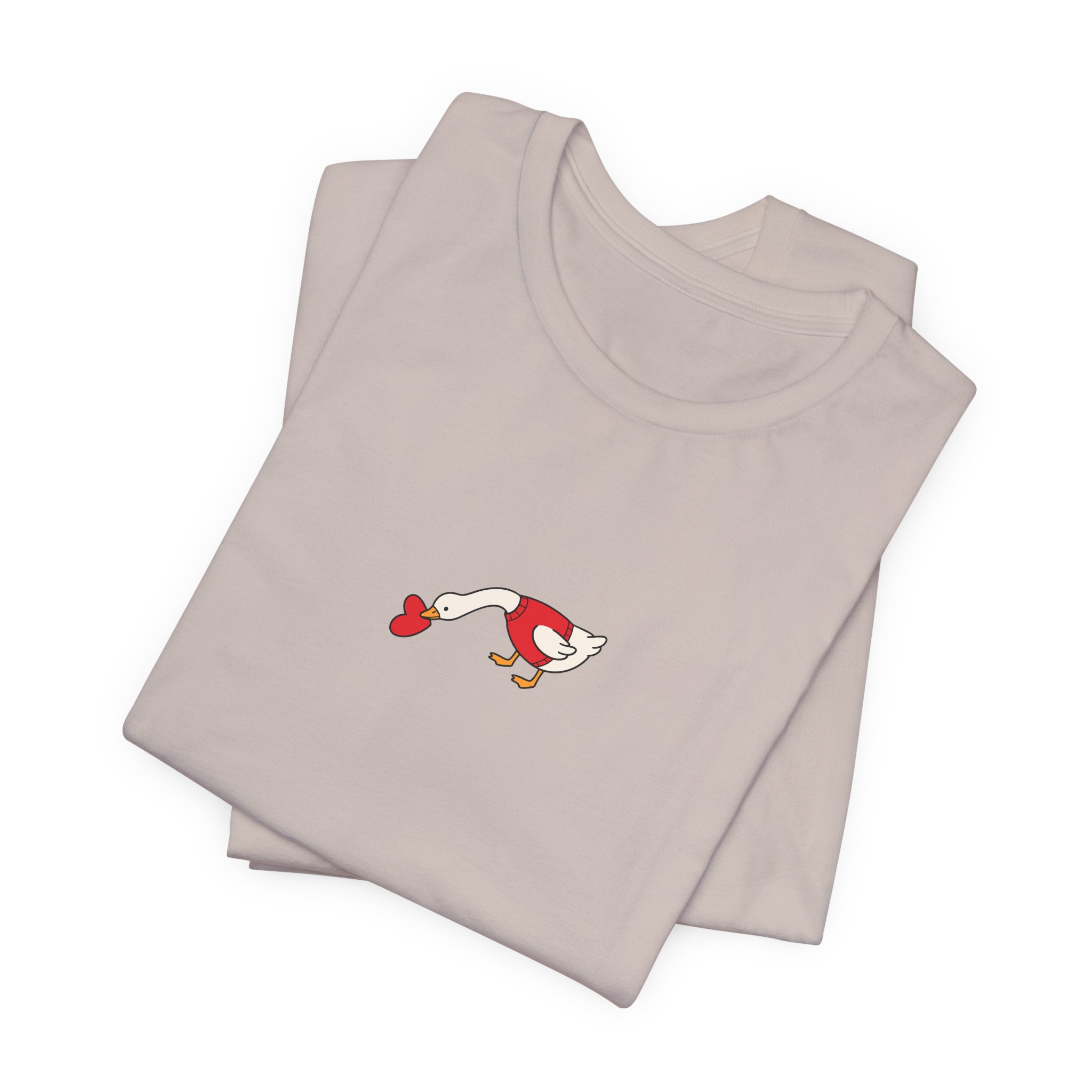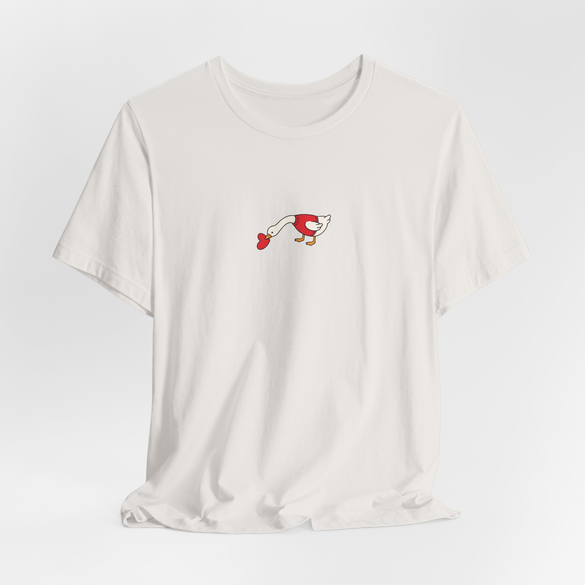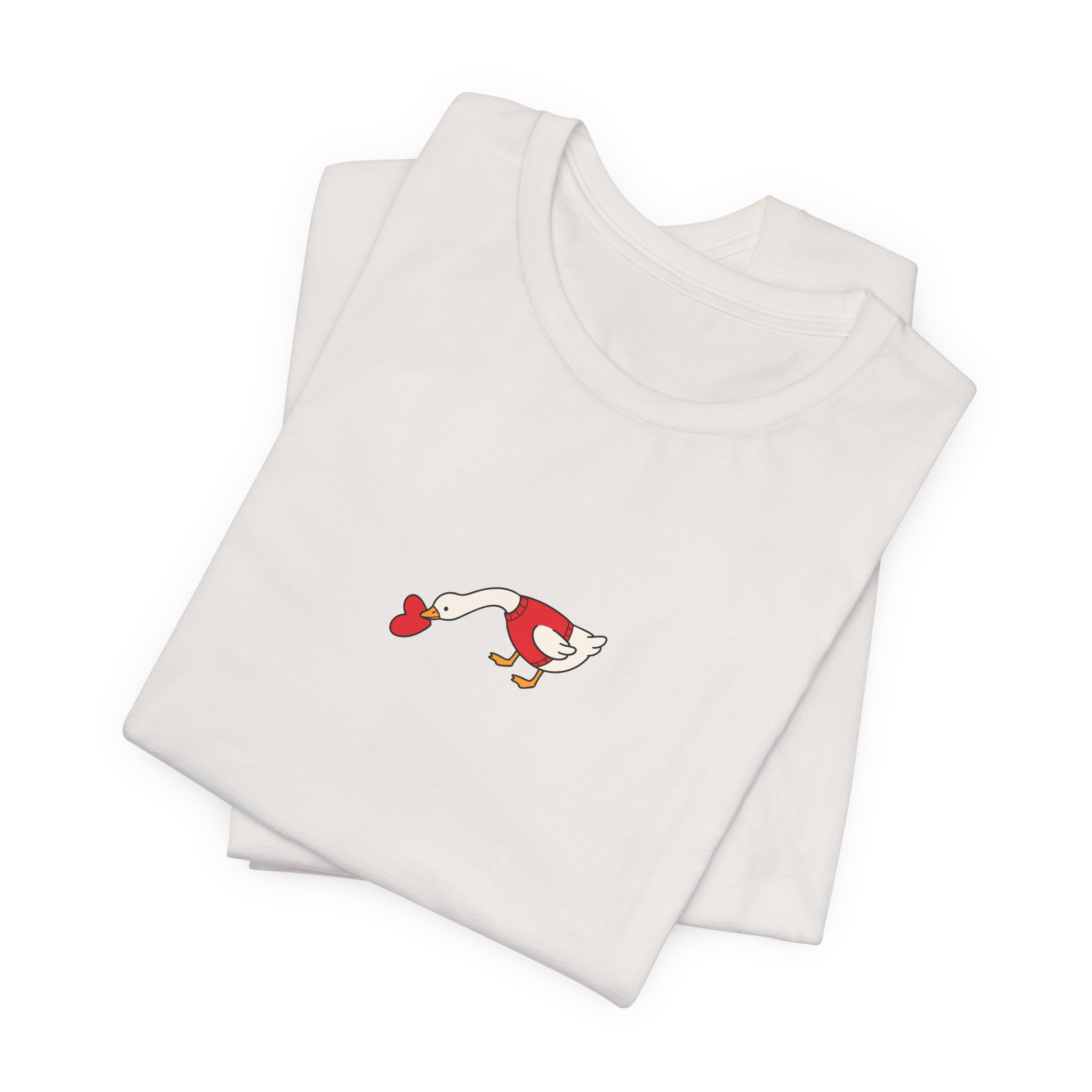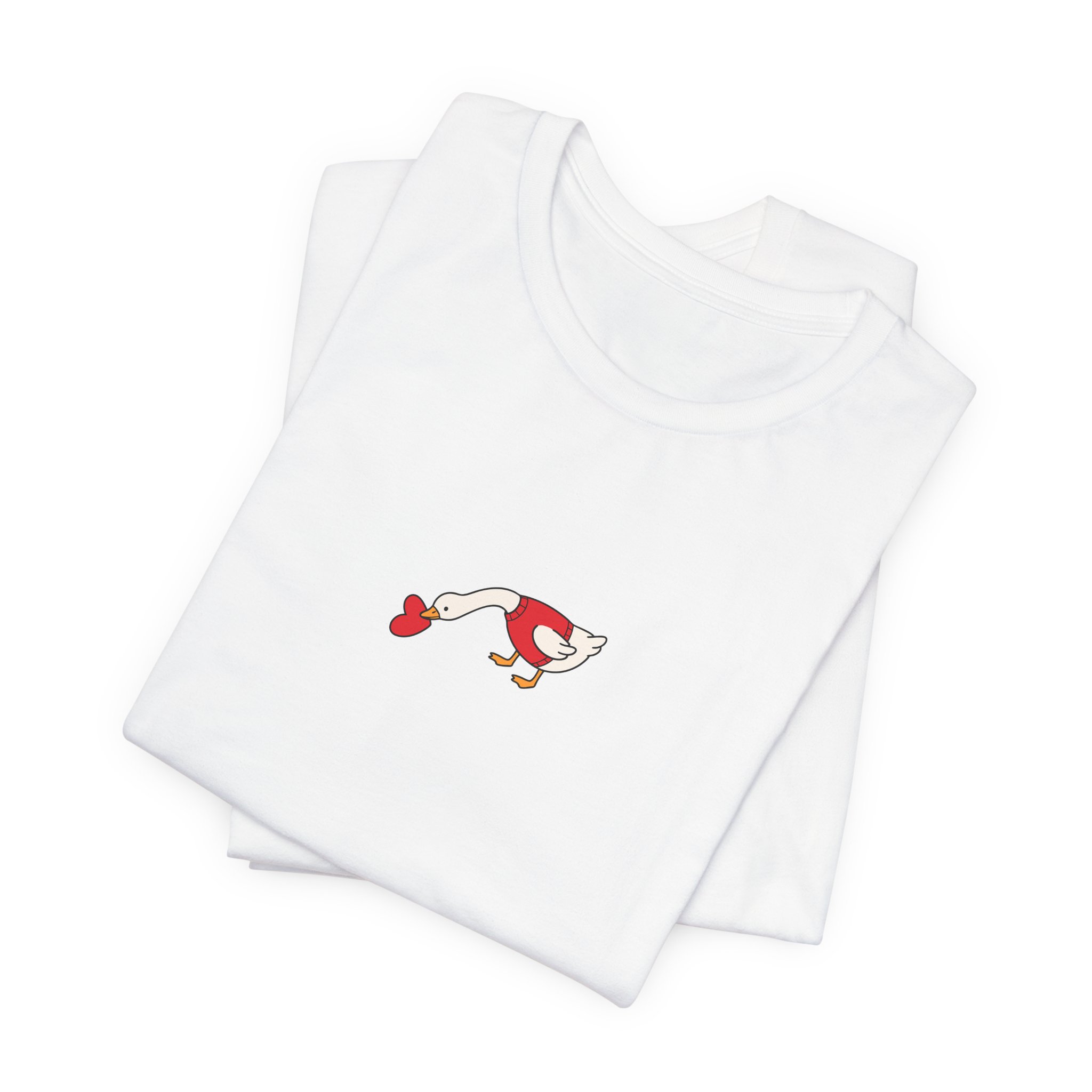 Watch out, this goose is on a mission to steal your heart! Our “Heart Stealer Goose” Tee features a charmingly simple illustration of a white goose in a cozy red sweater, playfully holding a small red heart. Perfect for those who love a bit of humor with their romance, this minimalist design proves that love doesn’t always have to be serious—sometimes it’s just a little bit “honk-tastic”..