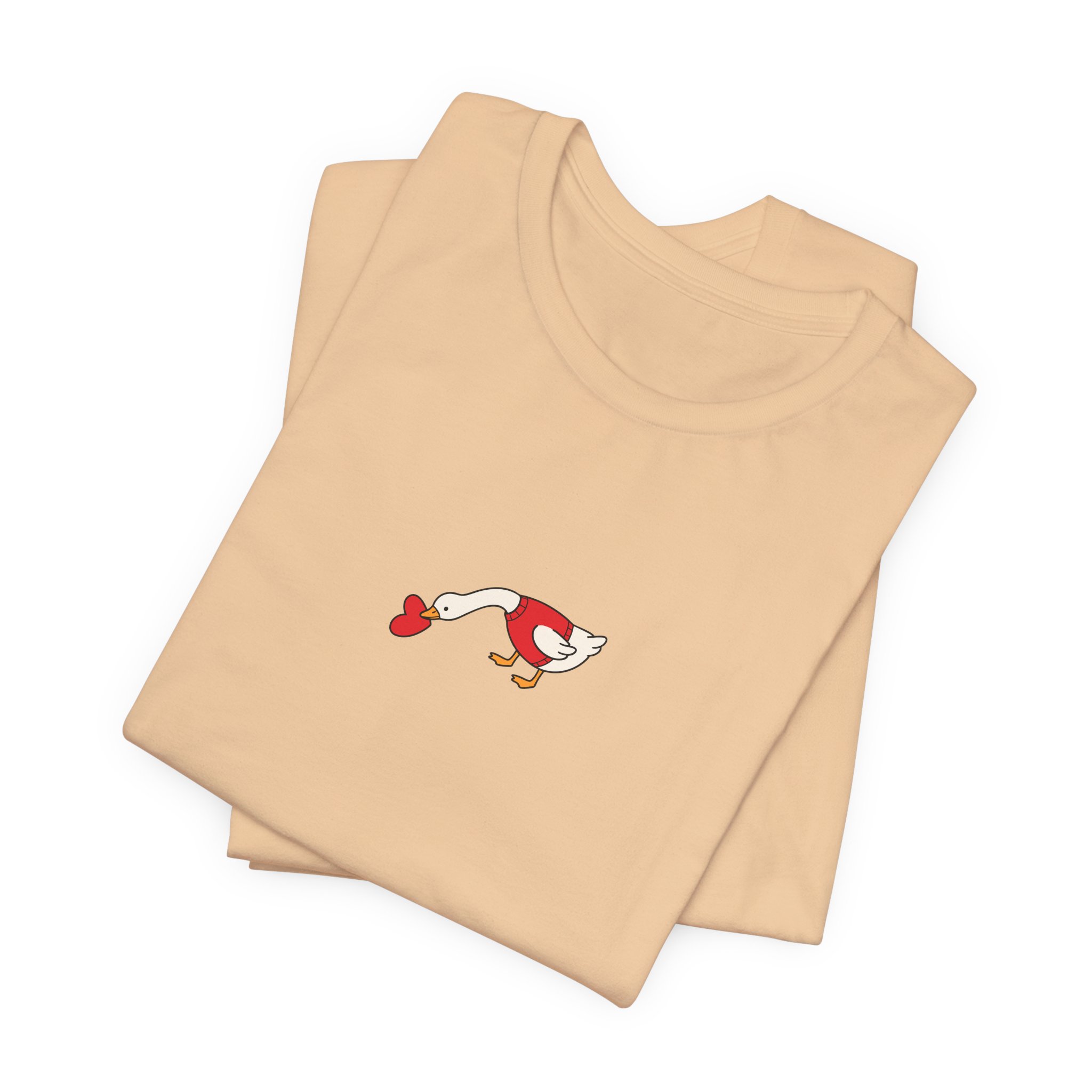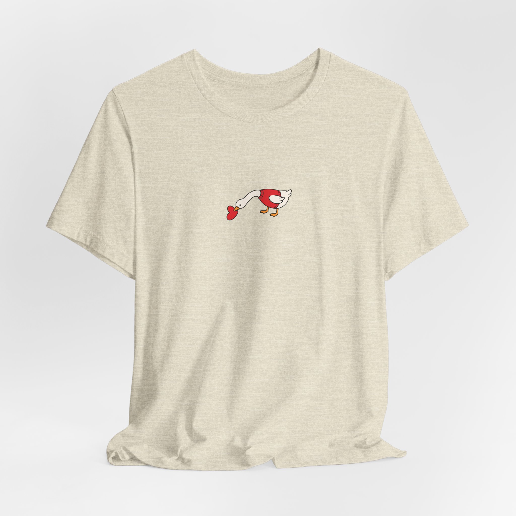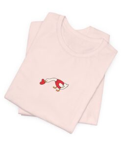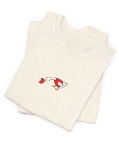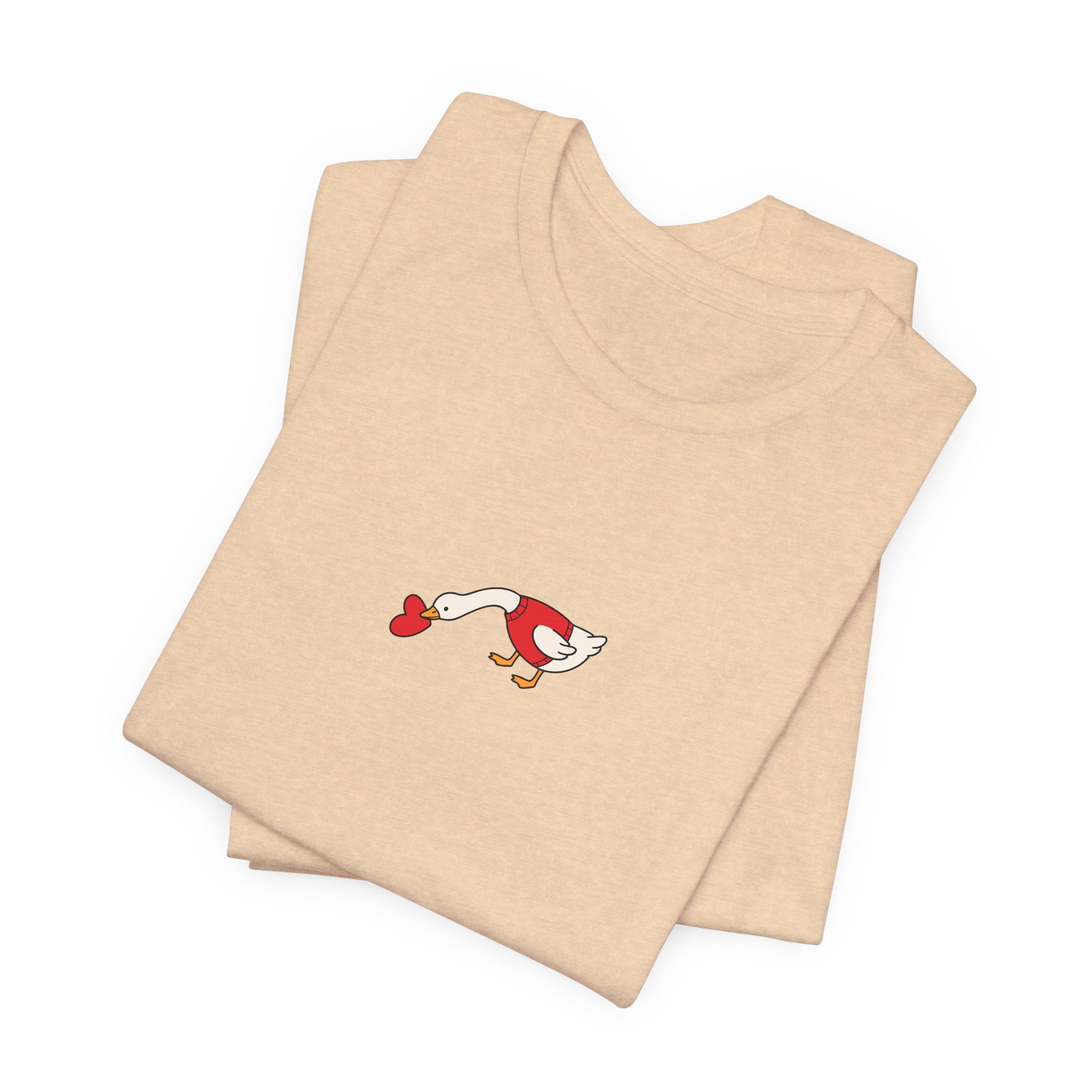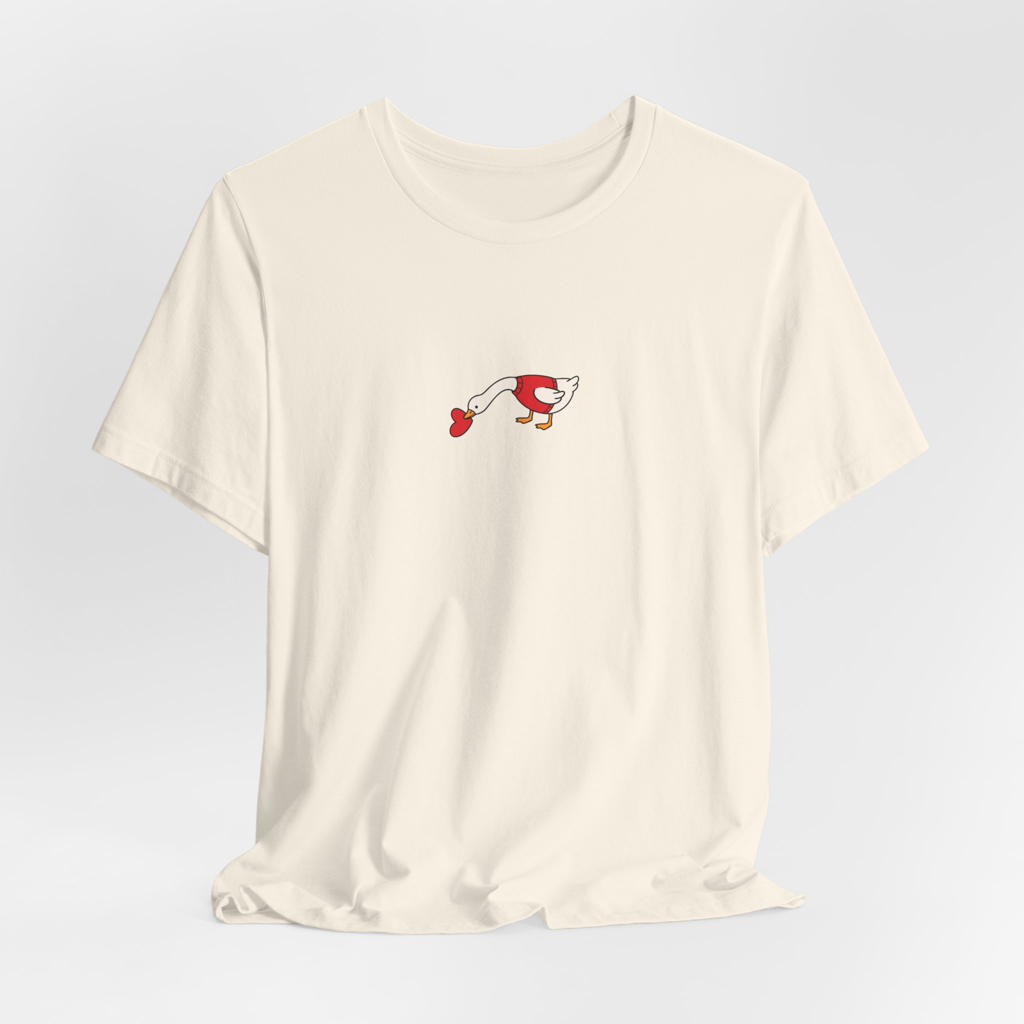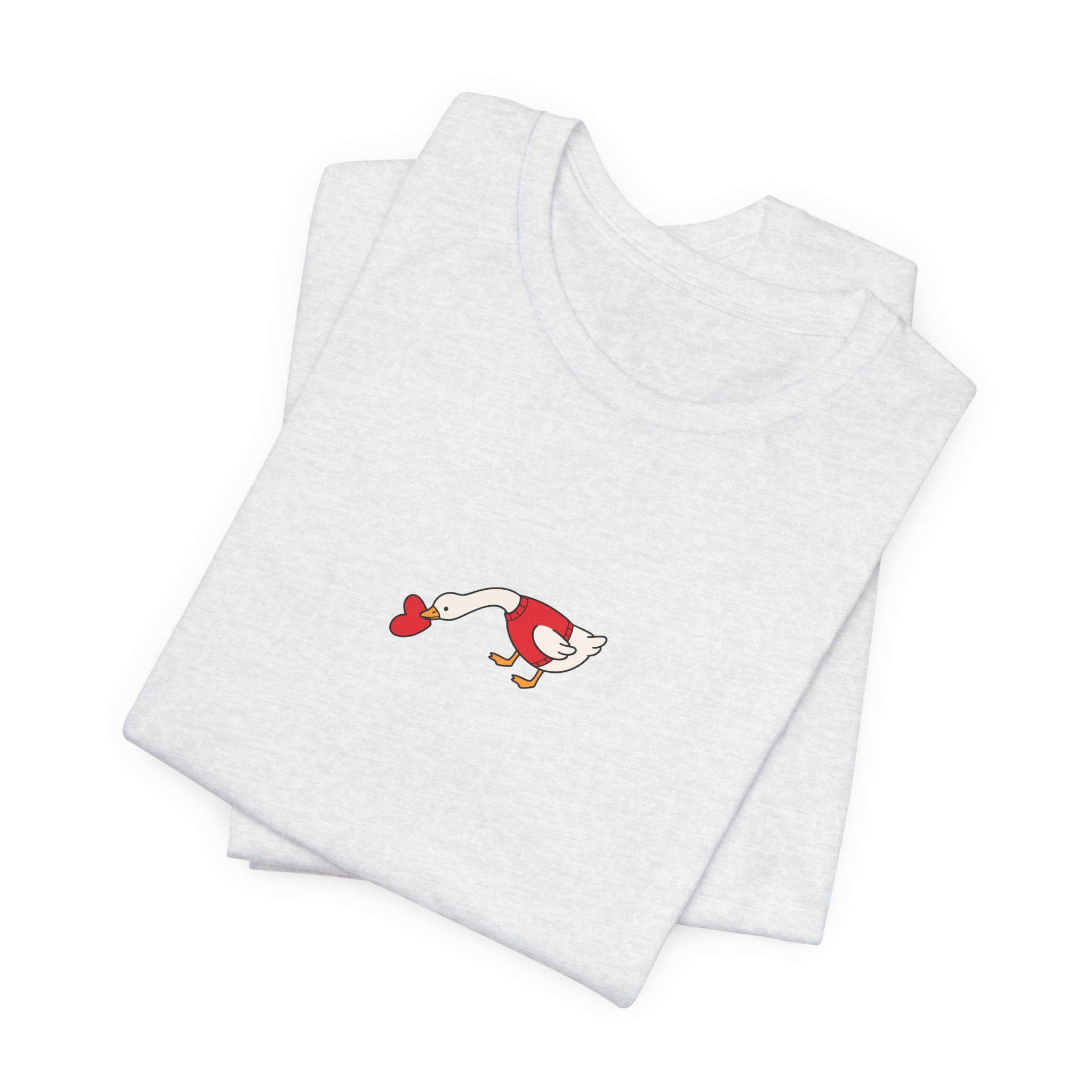 Watch out, this goose is on a mission to steal your heart! Our “Heart Stealer Goose” Tee features a charmingly simple illustration of a white goose in a cozy red sweater, playfully holding a small red heart. Perfect for those who love a bit of humor with their romance, this minimalist design proves that love doesn’t always have to be serious—sometimes it’s just a little bit “honk-tastic”..