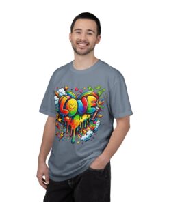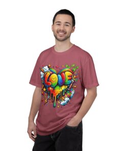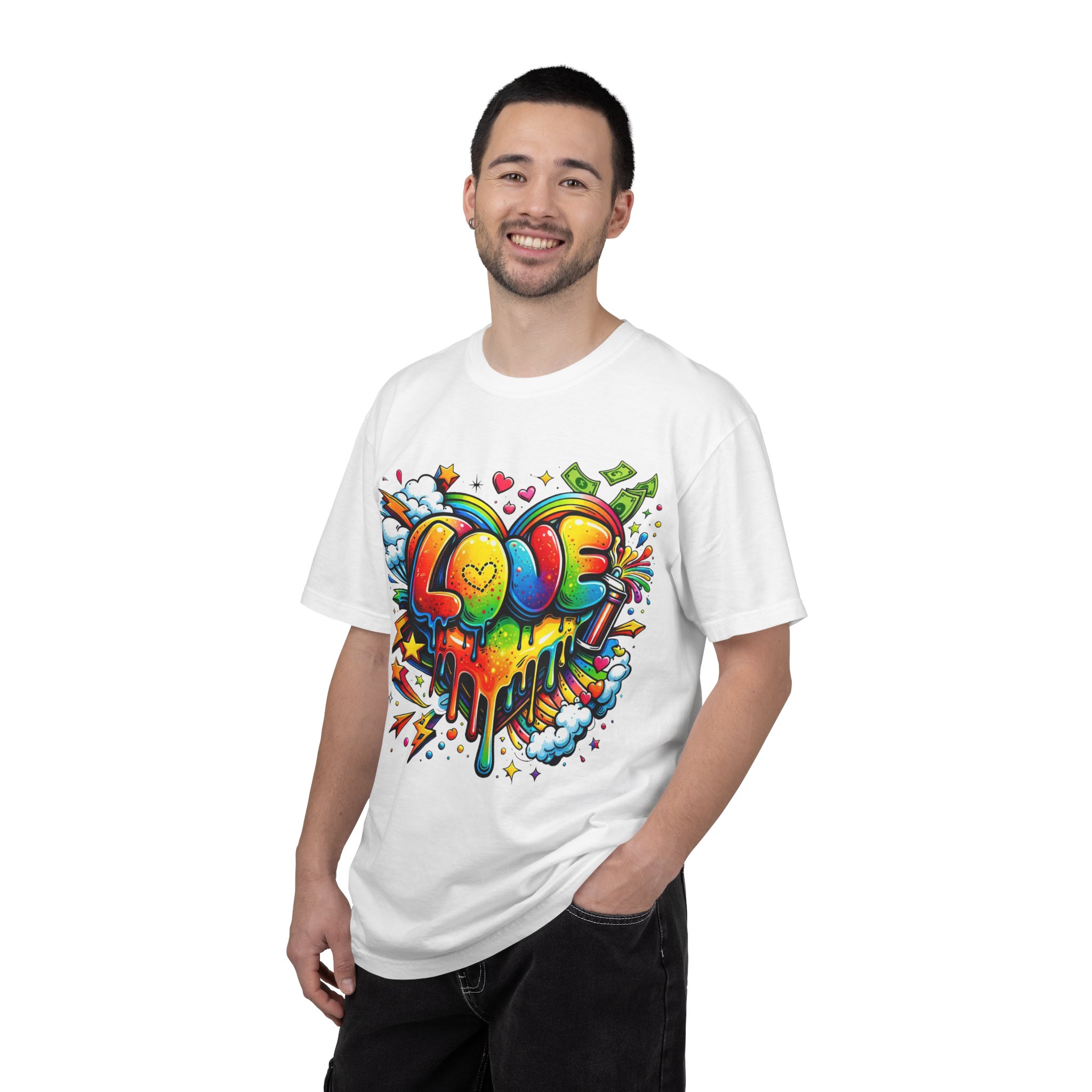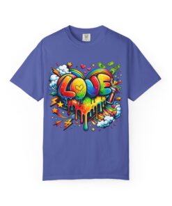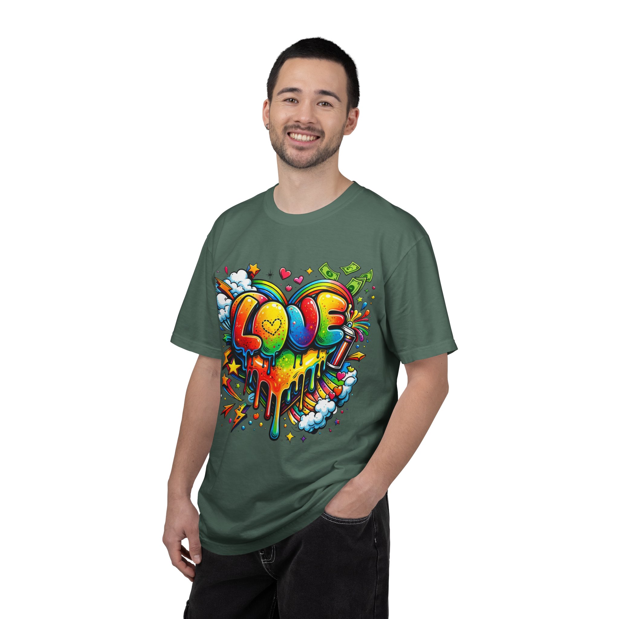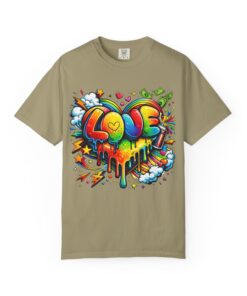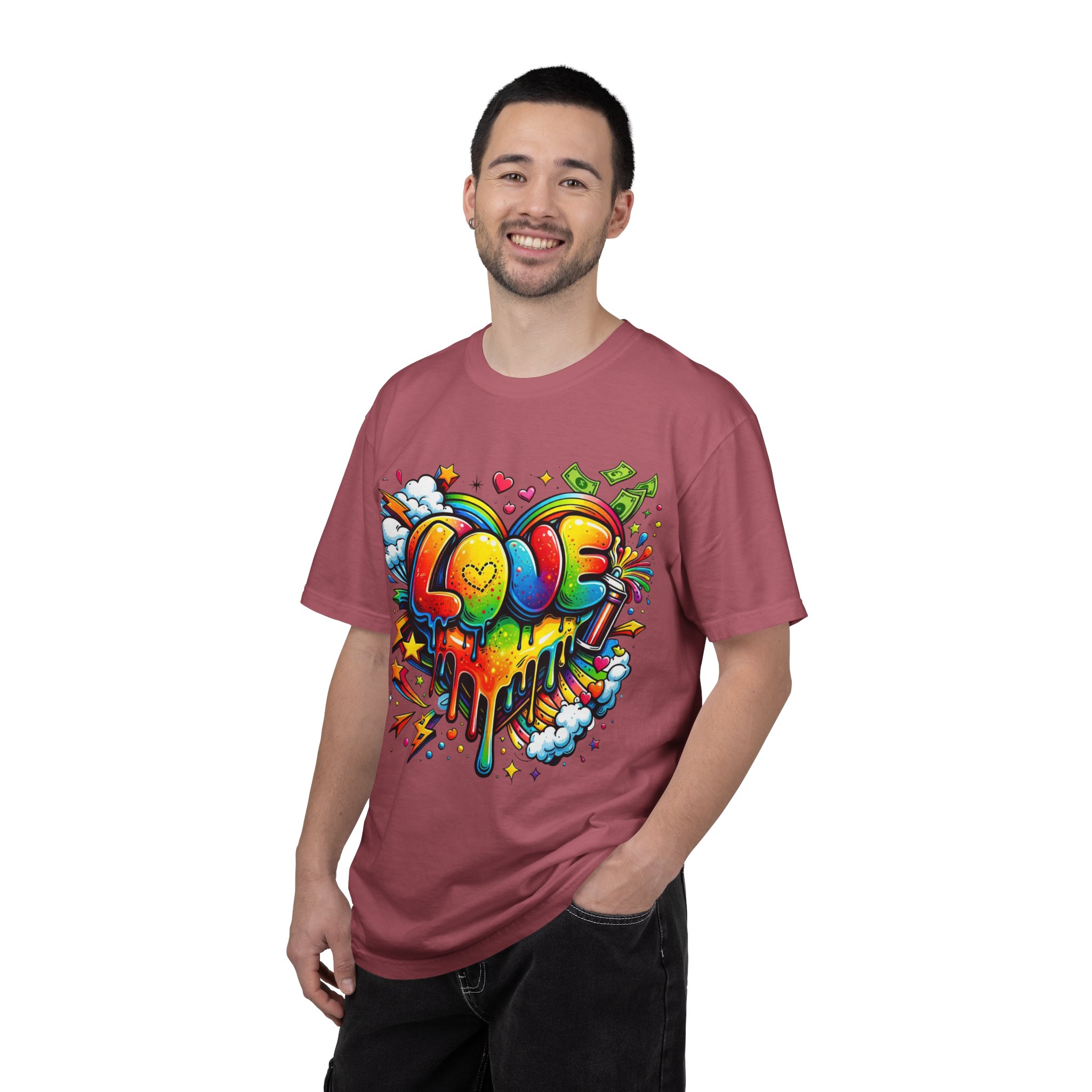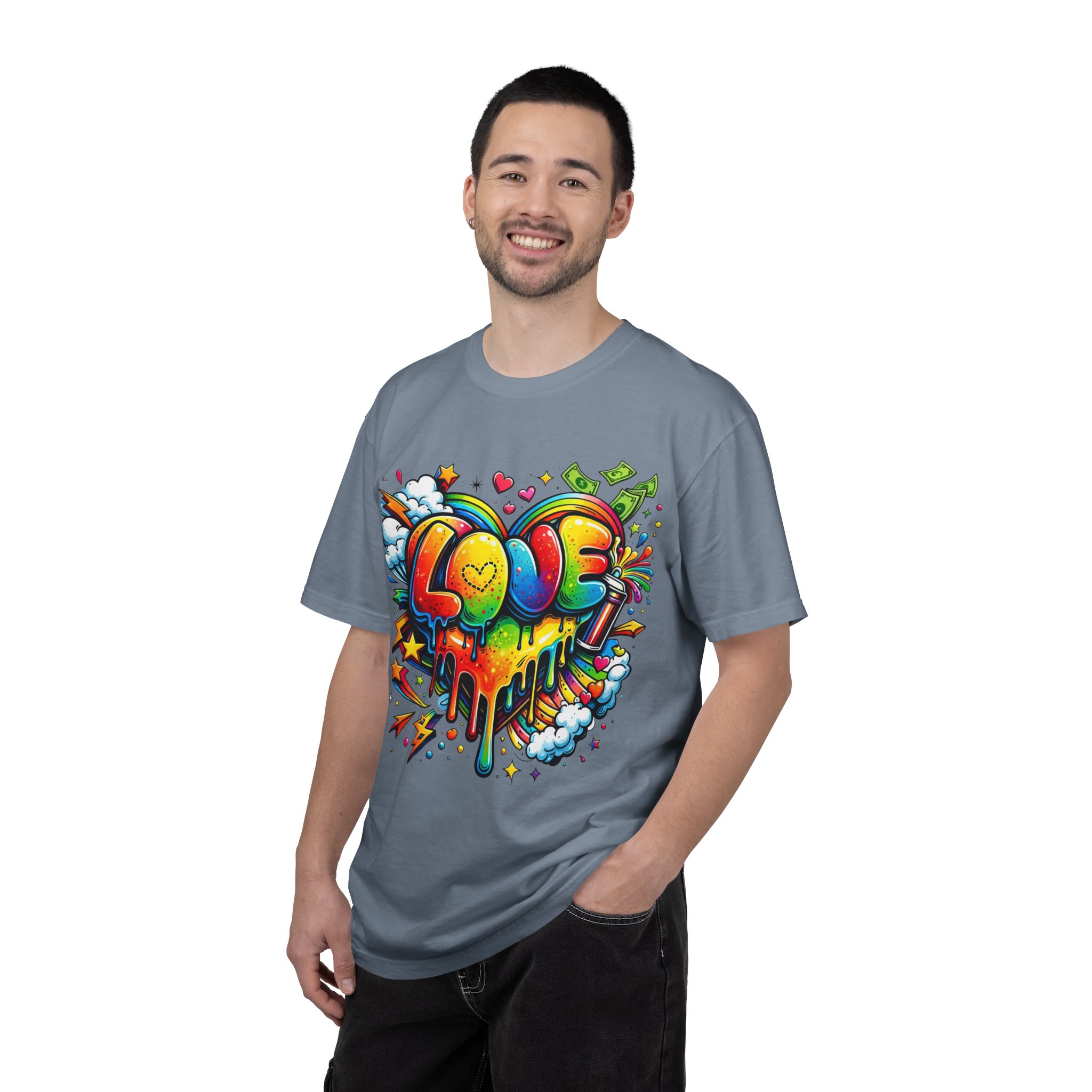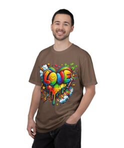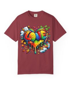 This heavyweight garment-dyed tee wears like a trusted favorite from the first wear. Bright, hand-drawn graffiti art splashes across the chest — a melting rainbow heart framed by clouds, stars, and kinetic bursts that feel loud and joyful. The relaxed cut and soft, broken-in color from post-construction dyeing make it a casual staple for everyday wear, while the small colorful icon at the upper back adds a subtle signature detail. It’s the kind of shirt you throw on when you want to bring color into a gray day, start conversations, and move through the city or studio with a playful, confident energy.