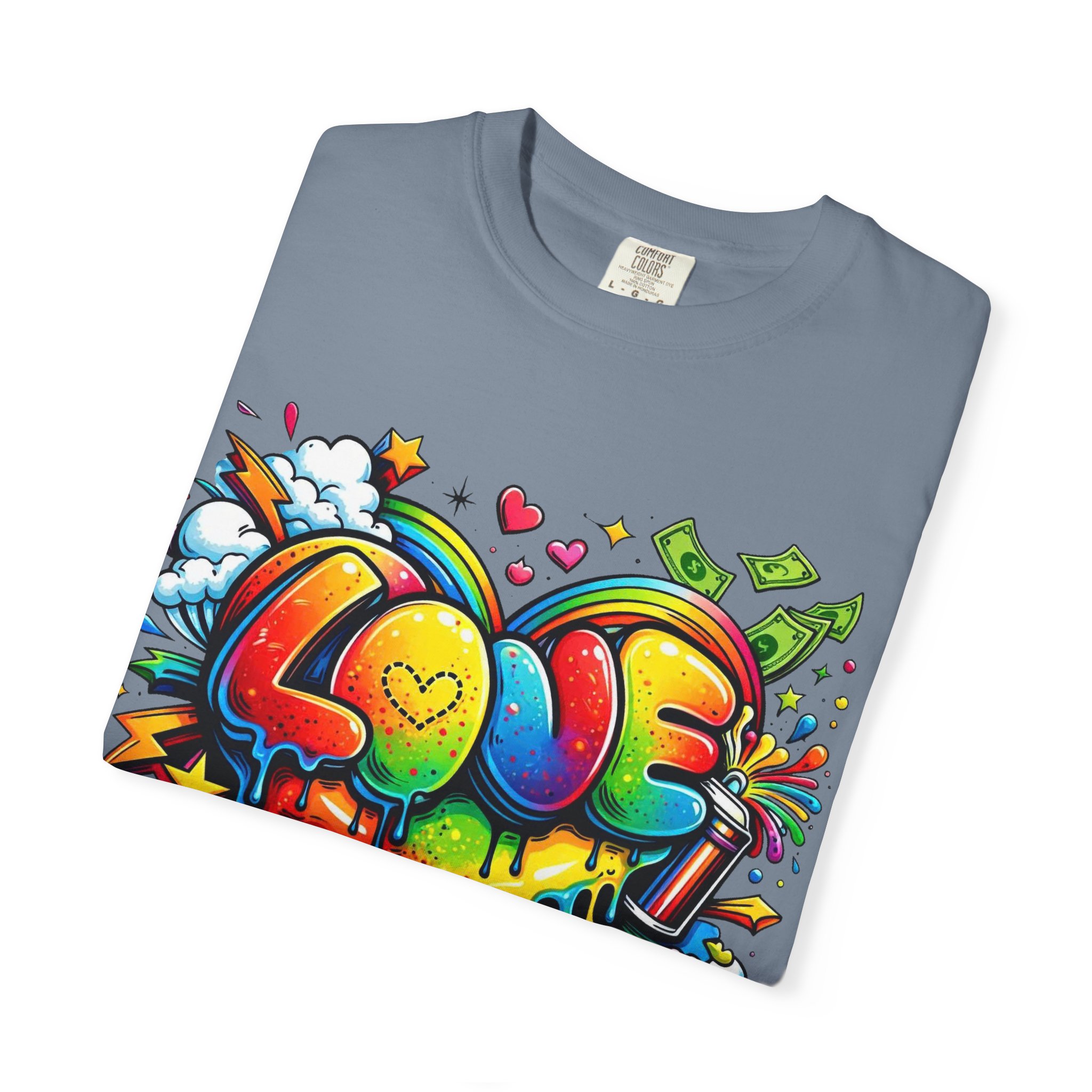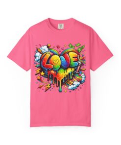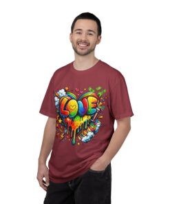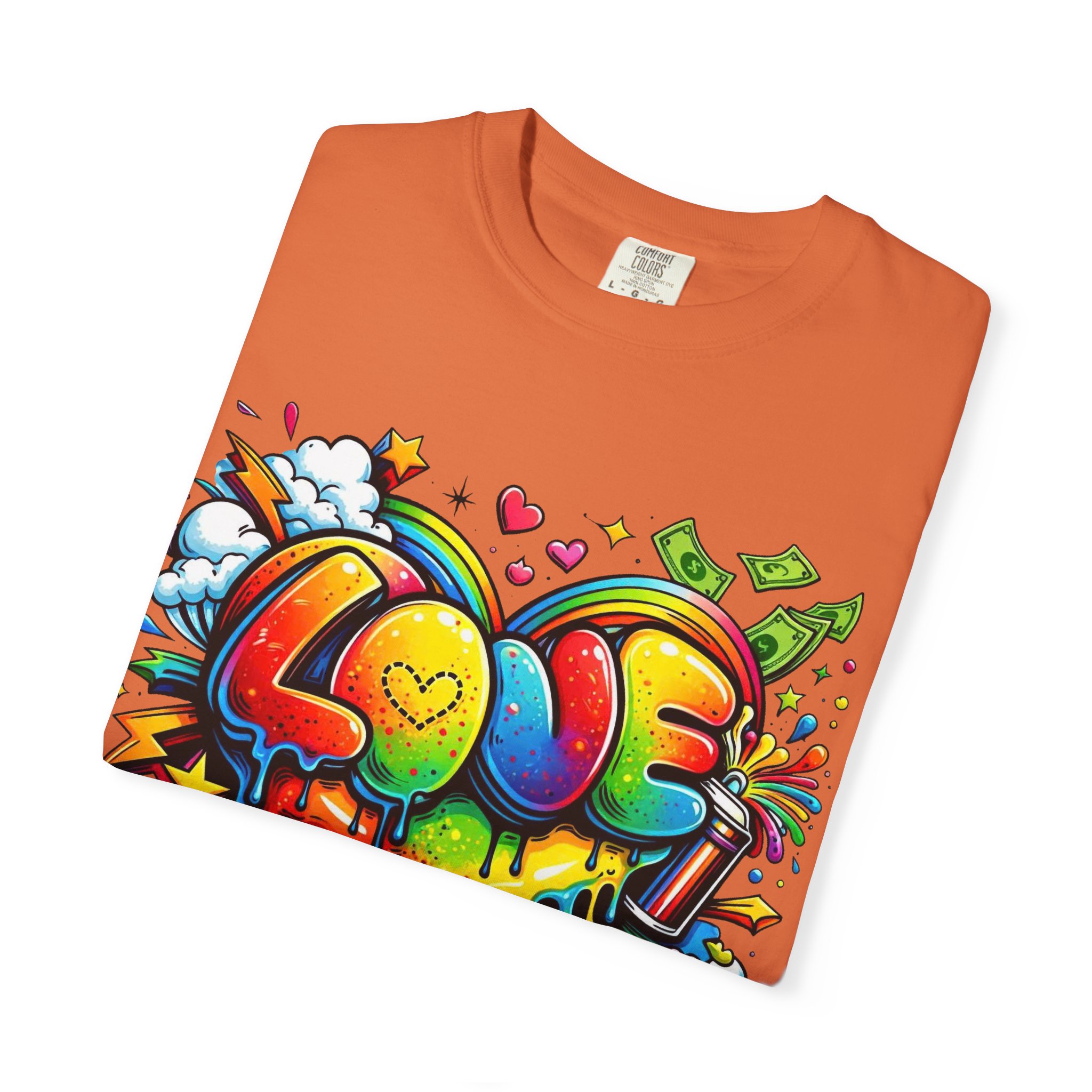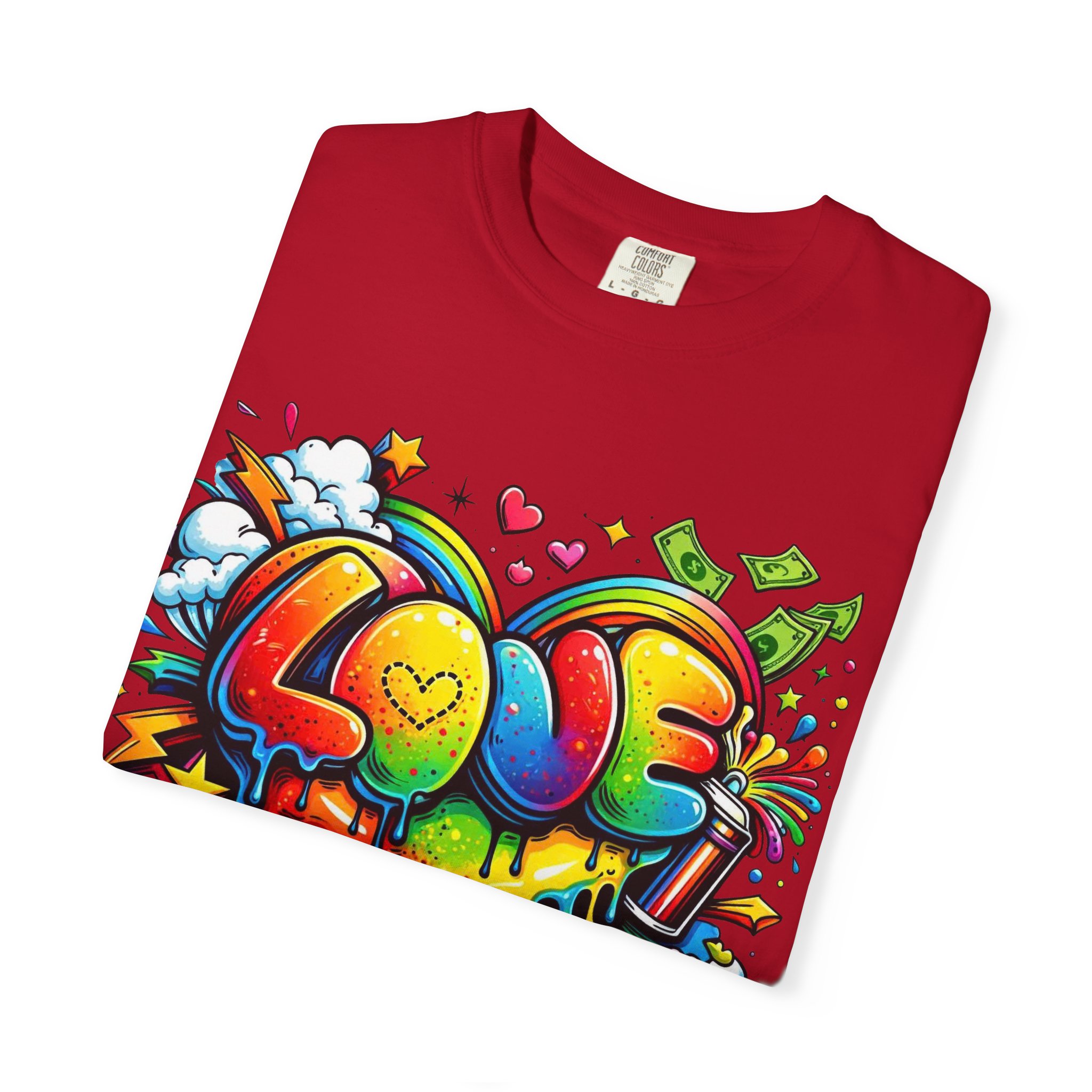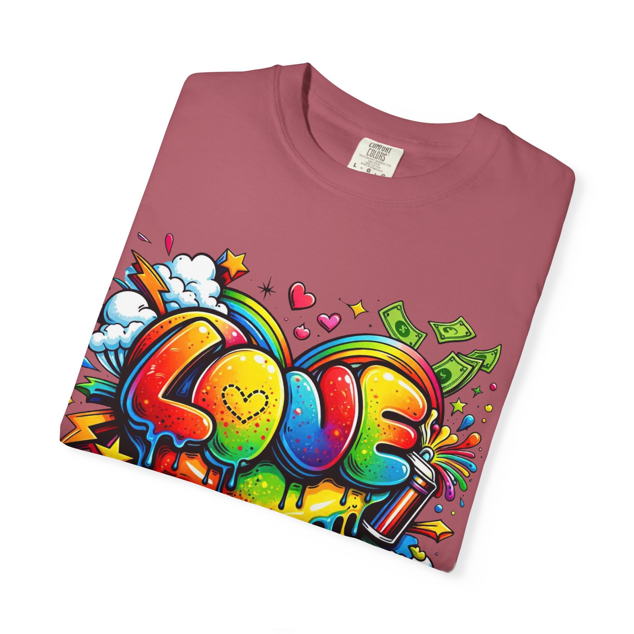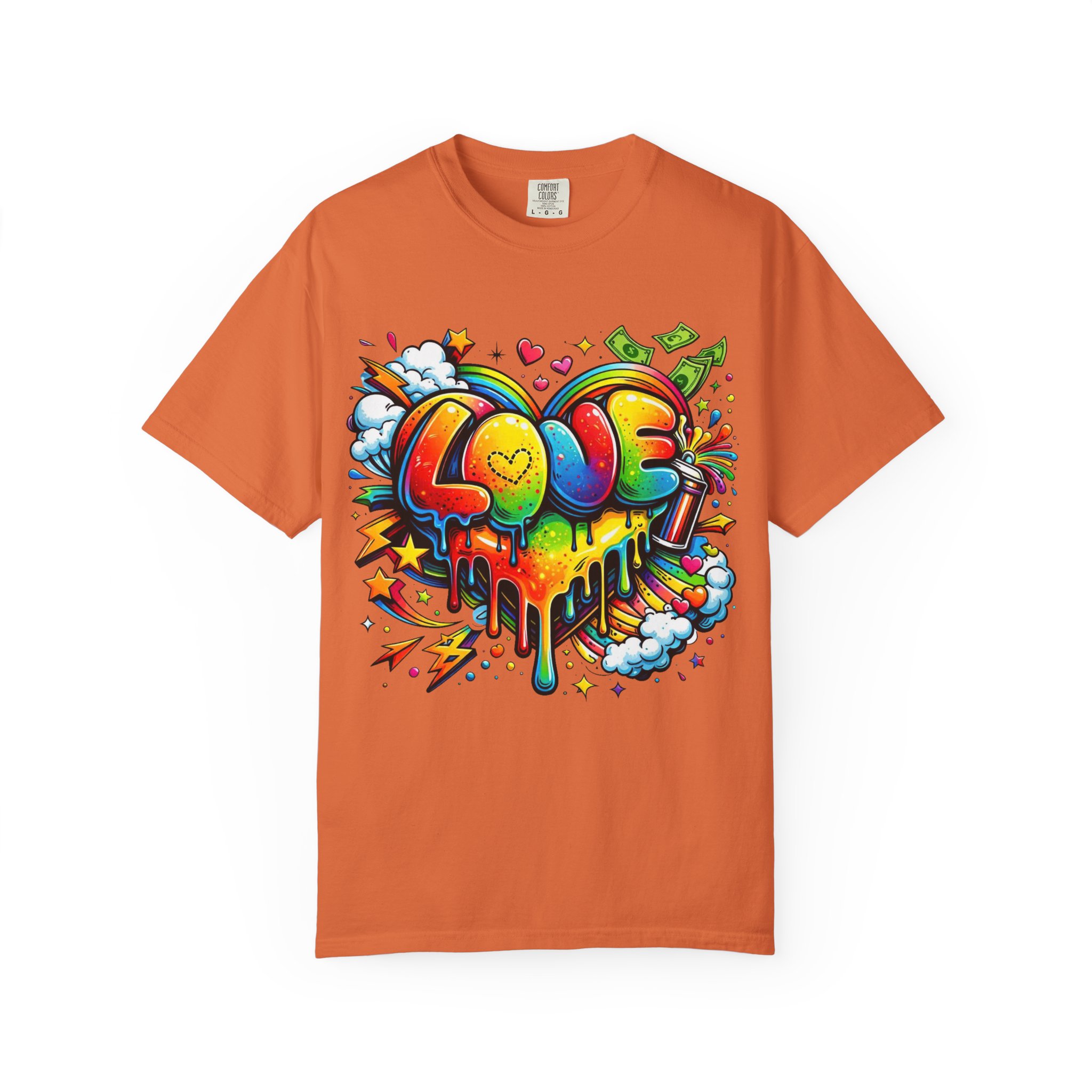 This heavyweight garment-dyed tee wears like a trusted favorite from the first wear. Bright, hand-drawn graffiti art splashes across the chest — a melting rainbow heart framed by clouds, stars, and kinetic bursts that feel loud and joyful. The relaxed cut and soft, broken-in color from post-construction dyeing make it a casual staple for everyday wear, while the small colorful icon at the upper back adds a subtle signature detail. It’s the kind of shirt you throw on when you want to bring color into a gray day, start conversations, and move through the city or studio with a playful, confident energy.