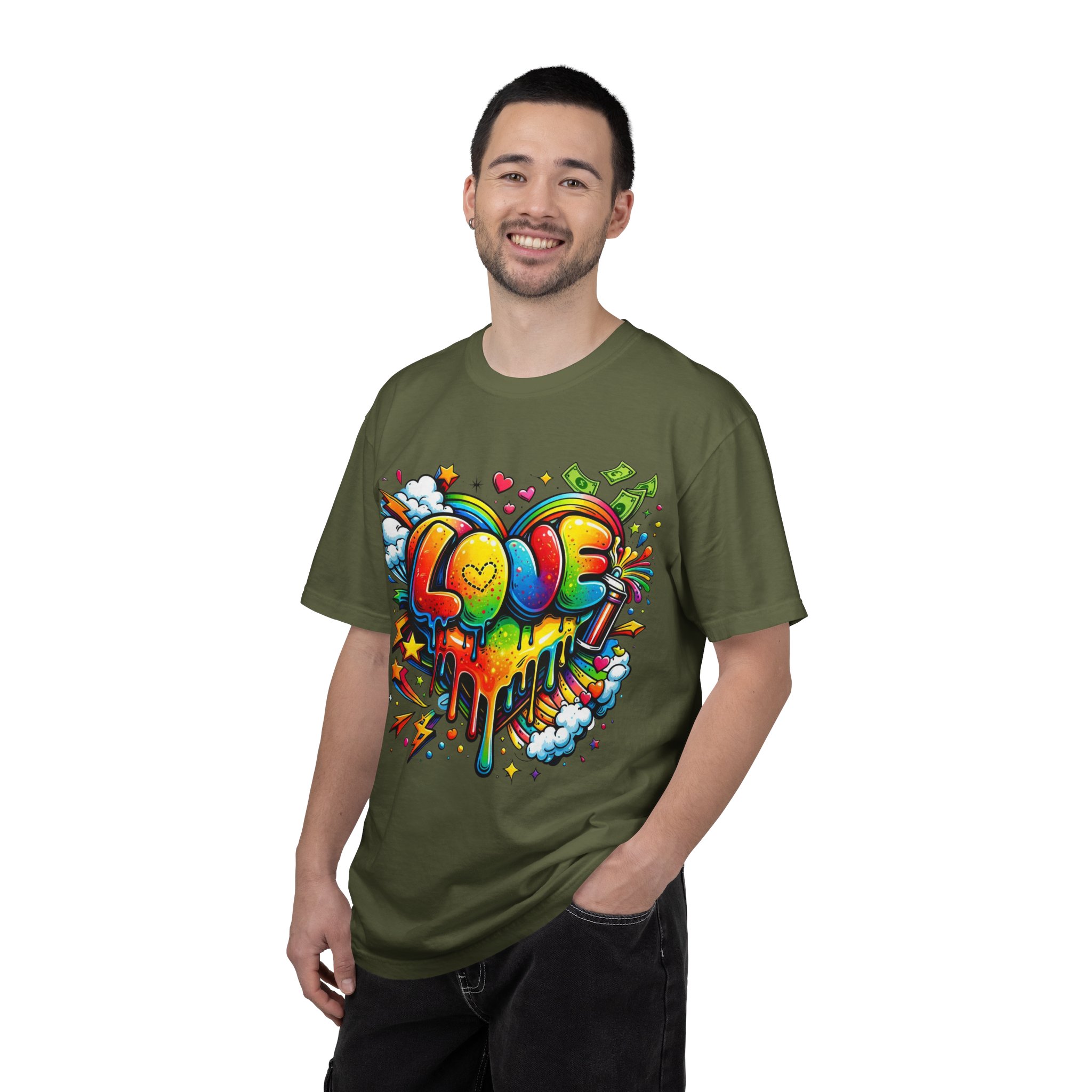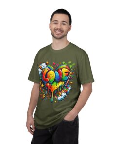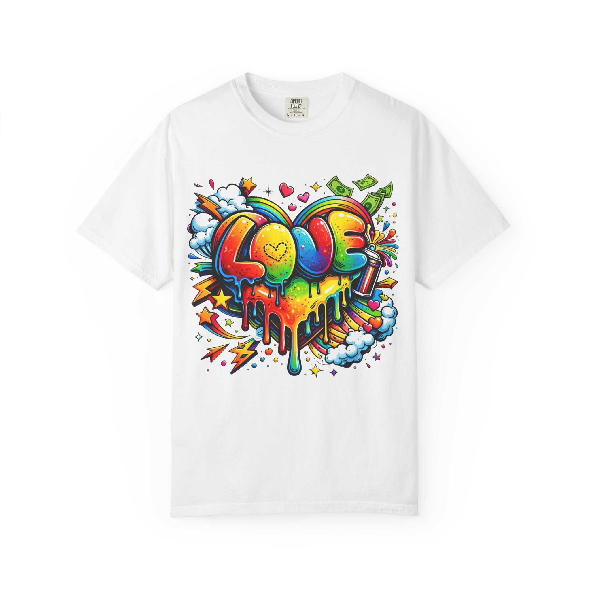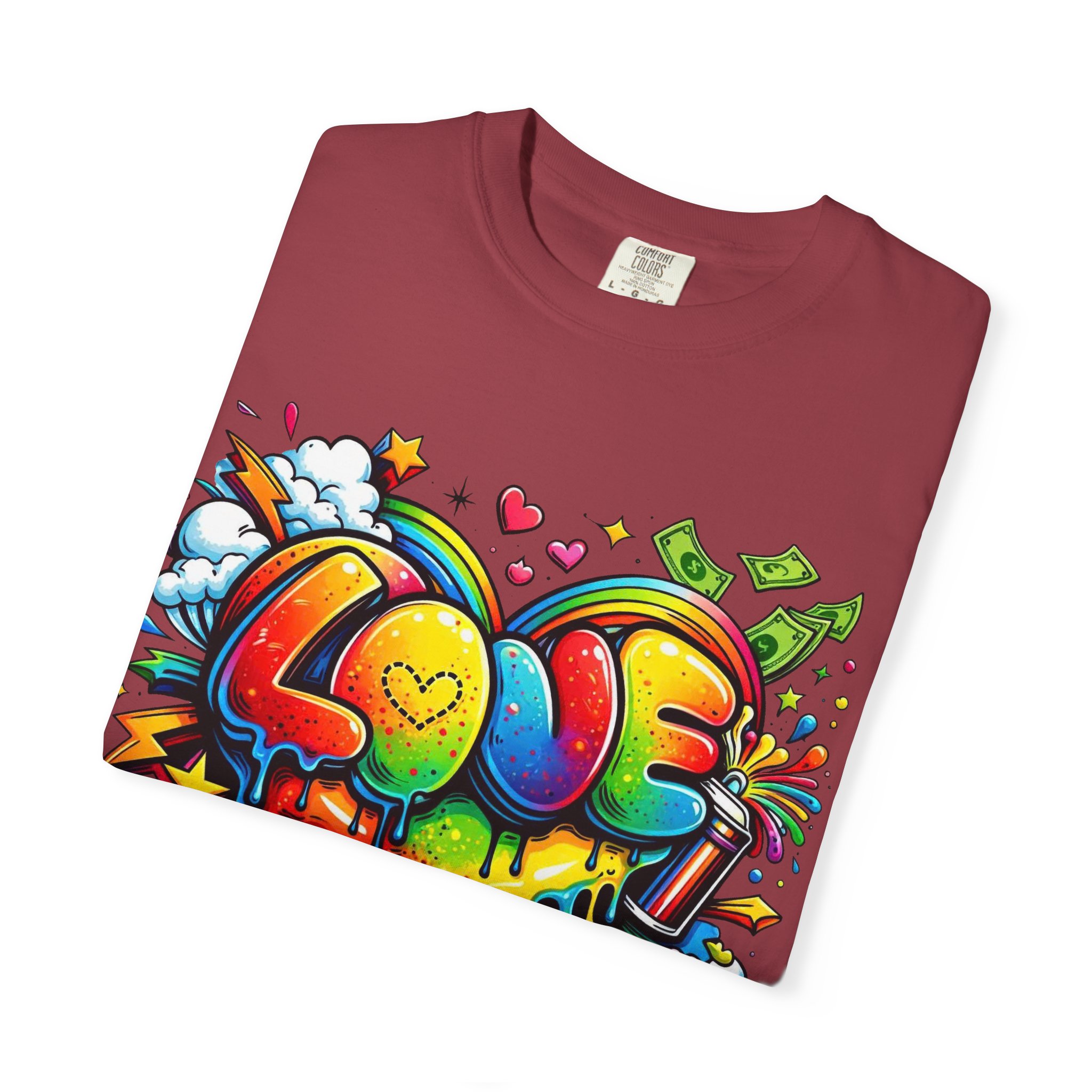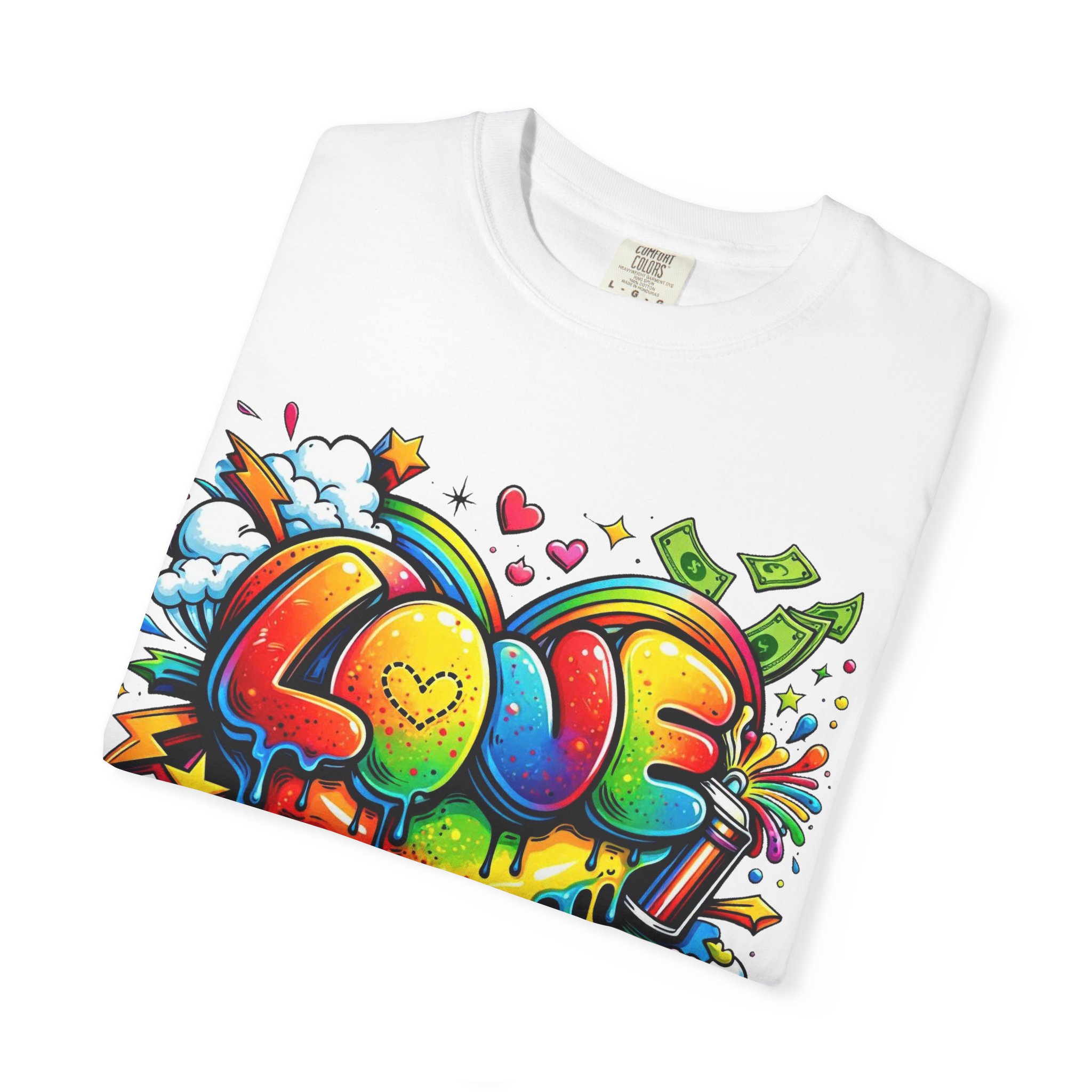 This heavyweight garment-dyed tee wears like a trusted favorite from the first wear. Bright, hand-drawn graffiti art splashes across the chest — a melting rainbow heart framed by clouds, stars, and kinetic bursts that feel loud and joyful. The relaxed cut and soft, broken-in color from post-construction dyeing make it a casual staple for everyday wear, while the small colorful icon at the upper back adds a subtle signature detail. It’s the kind of shirt you throw on when you want to bring color into a gray day, start conversations, and move through the city or studio with a playful, confident energy.