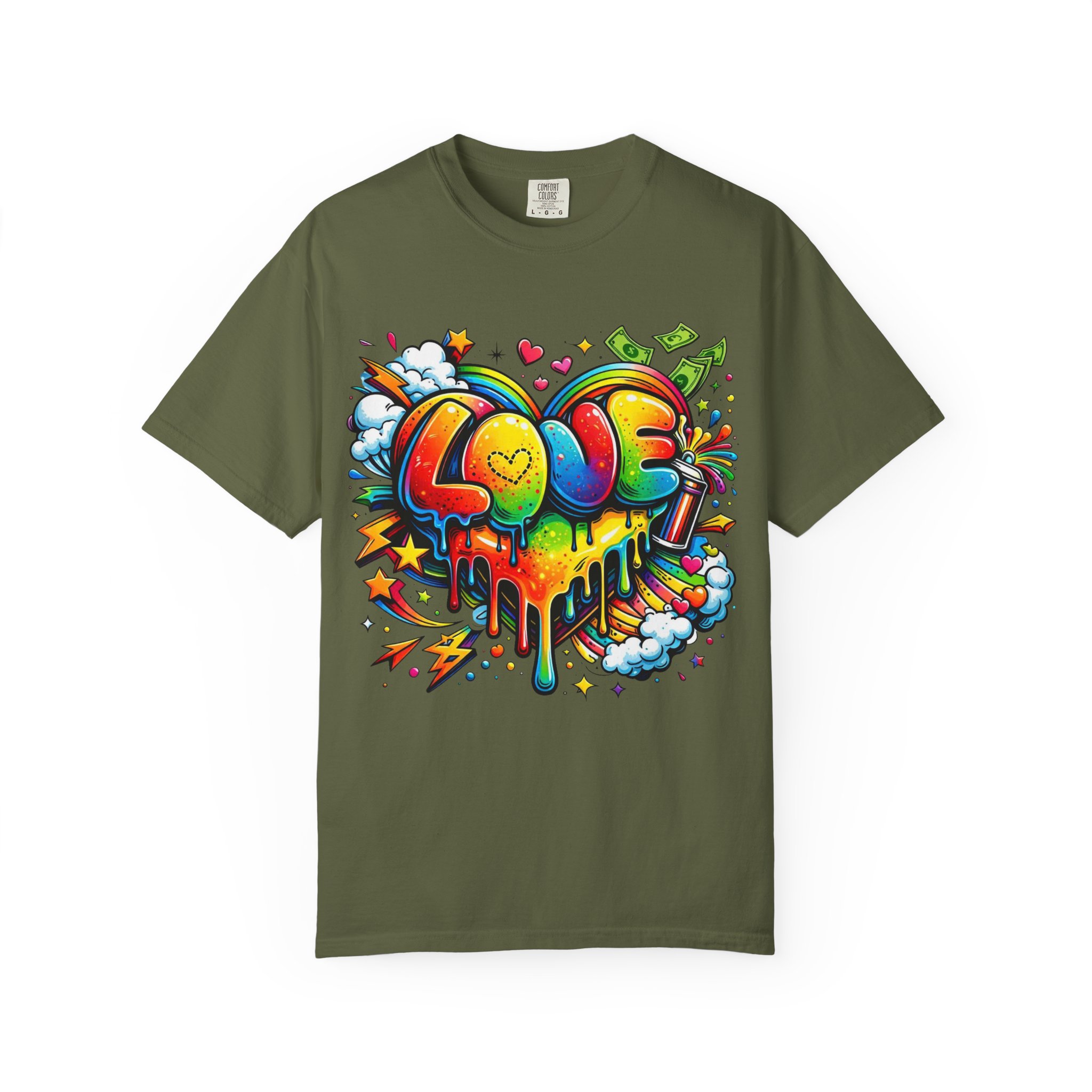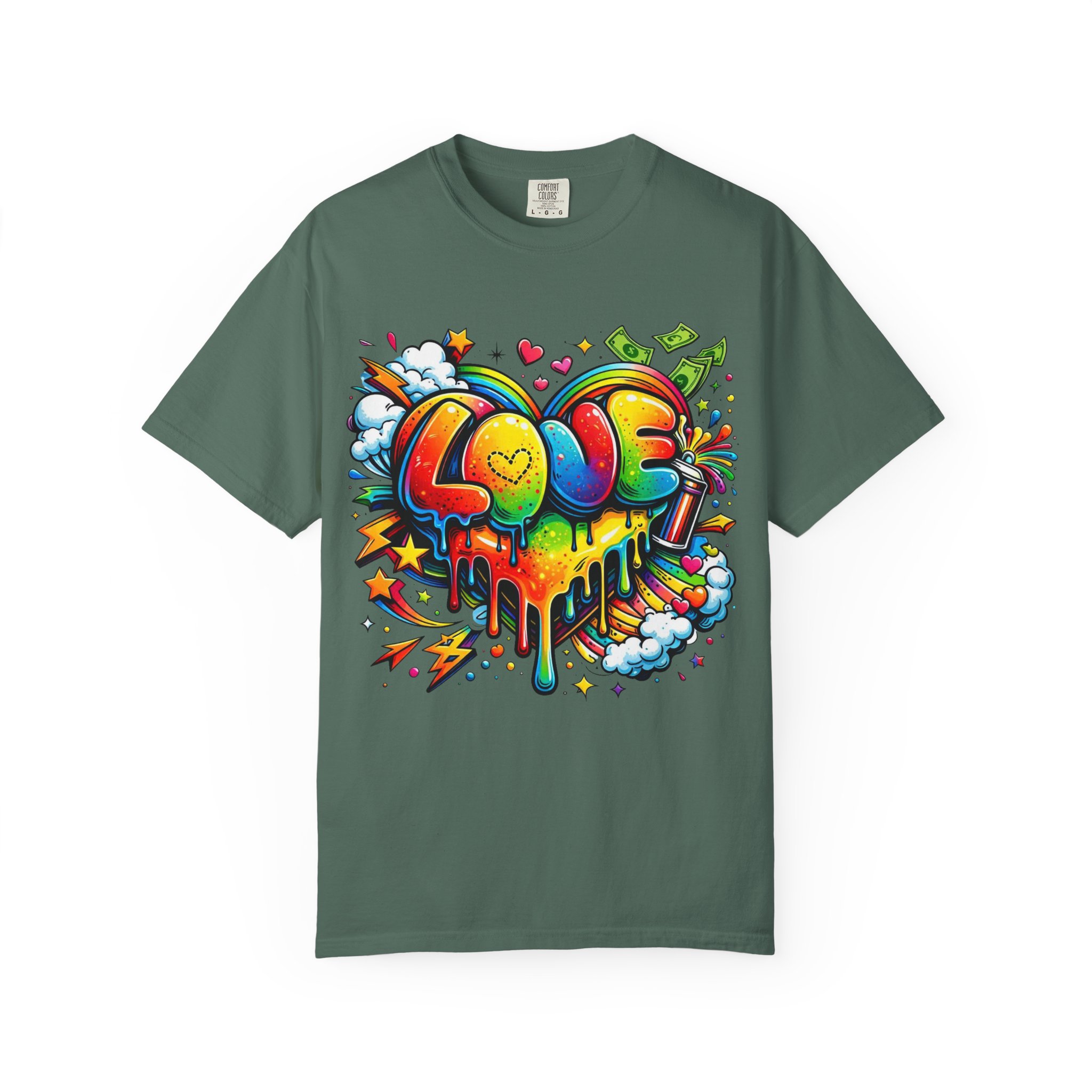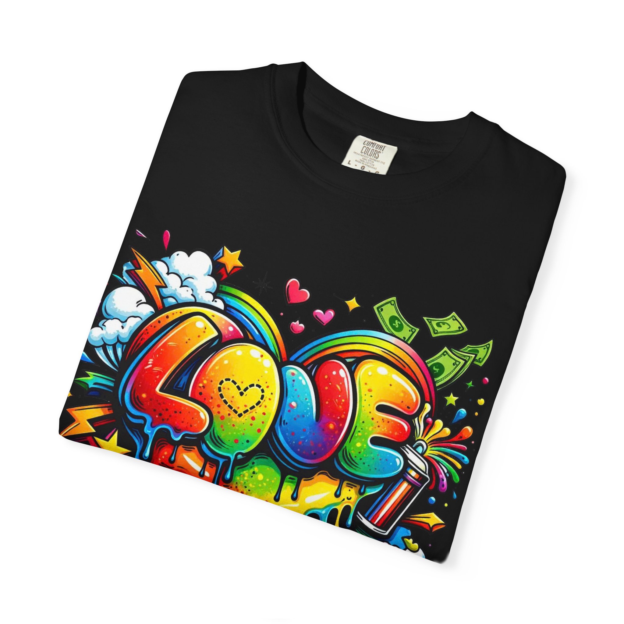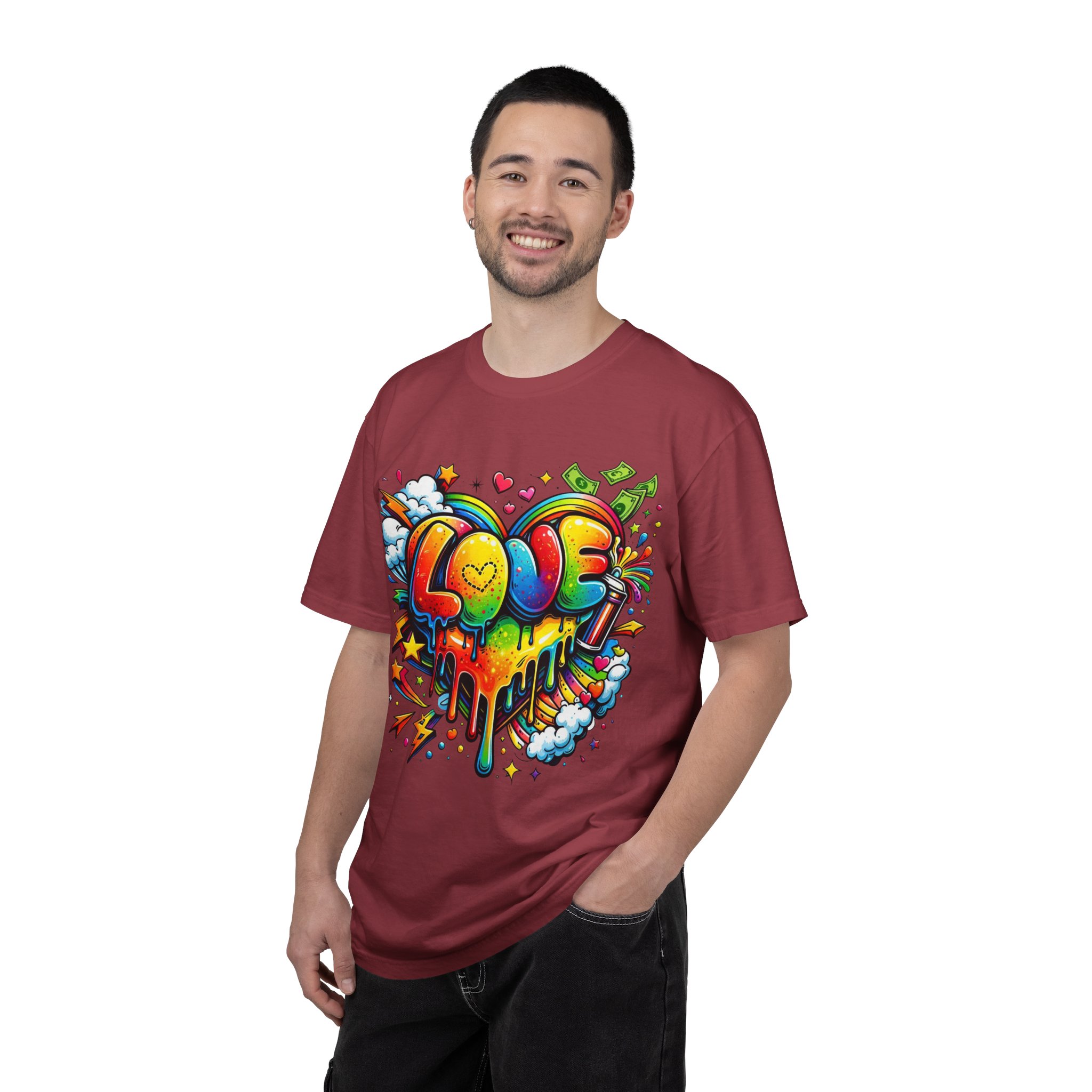This heavyweight garment-dyed tee wears like a trusted favorite from the first wear. Bright, hand-drawn graffiti art splashes across the chest — a melting rainbow heart framed by clouds, stars, and kinetic bursts that feel loud and joyful. The relaxed cut and soft, broken-in color from post-construction dyeing make it a casual staple for everyday wear, while the small colorful icon at the upper back adds a subtle signature detail. It’s the kind of shirt you throw on when you want to bring color into a gray day, start conversations, and move through the city or studio with a playful, confident energy.