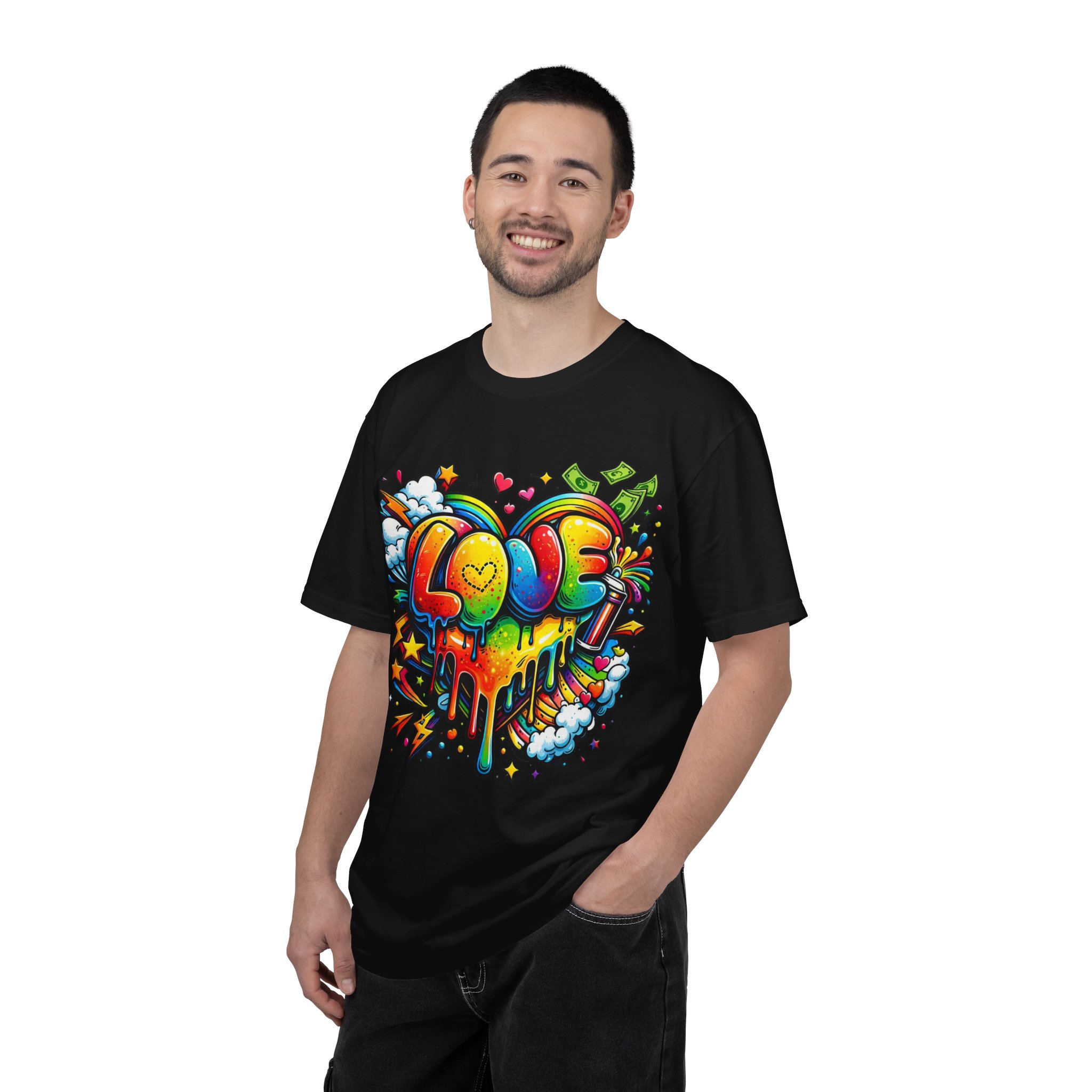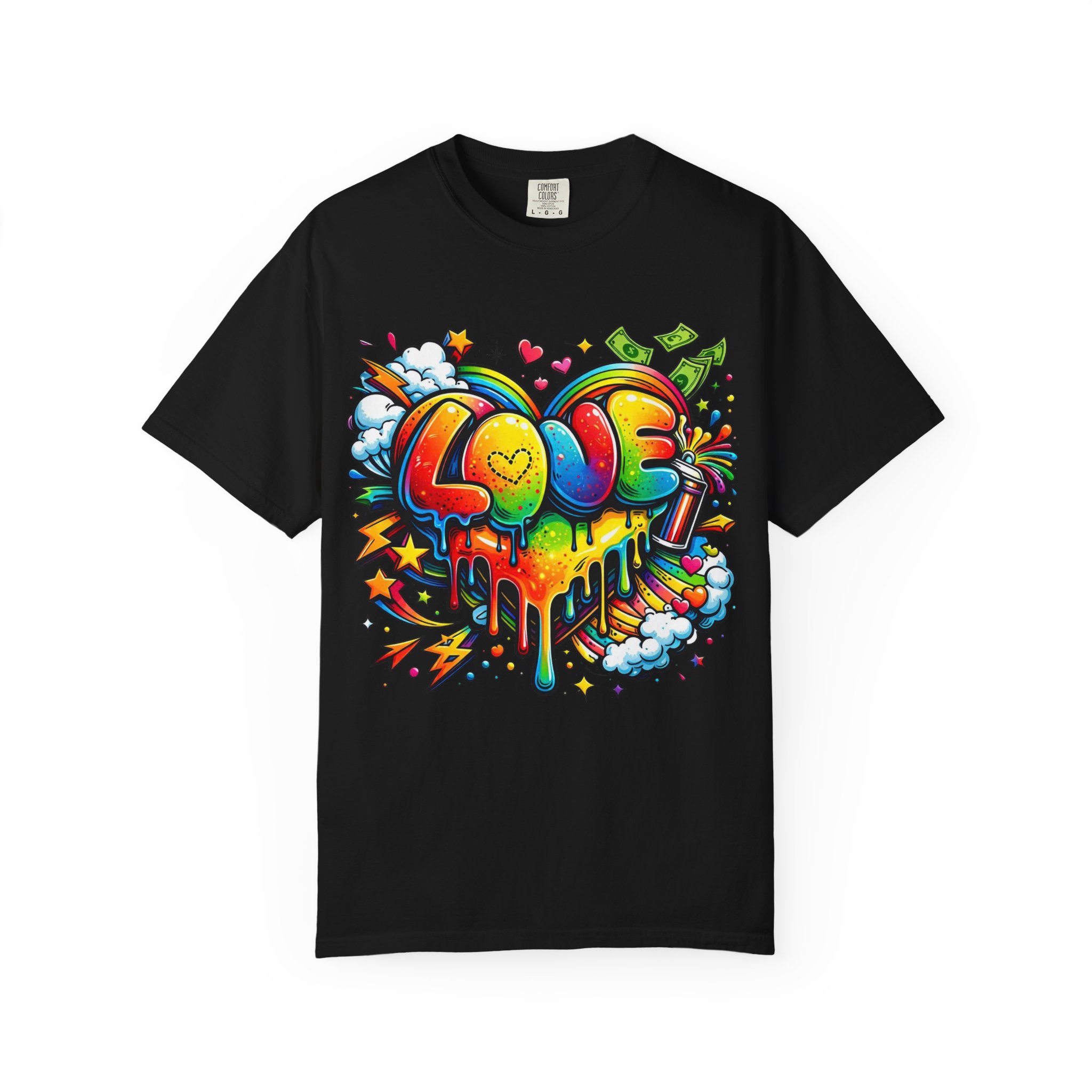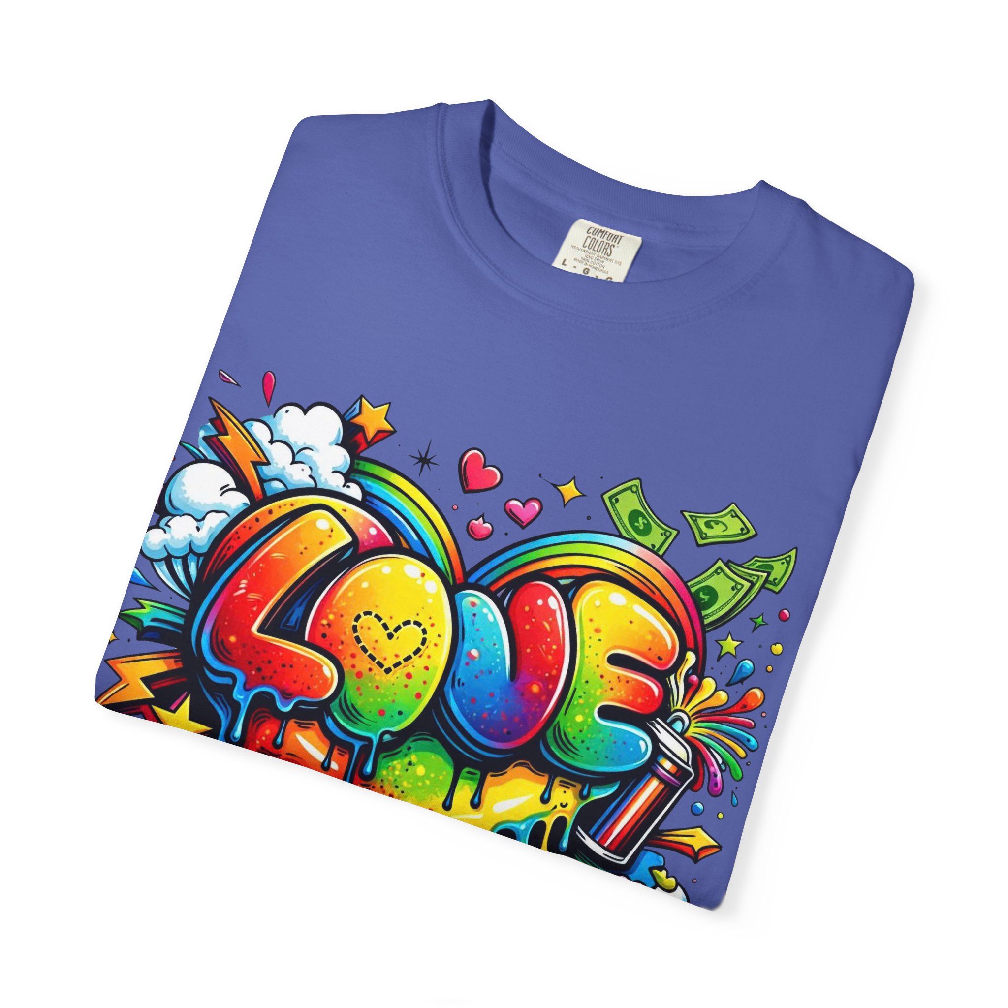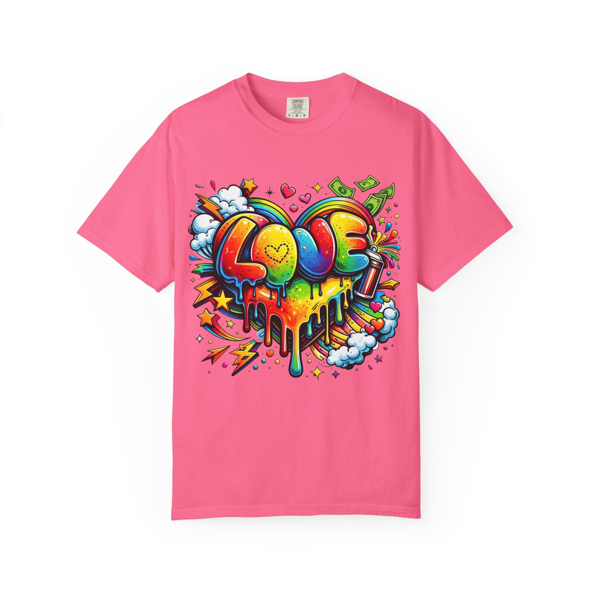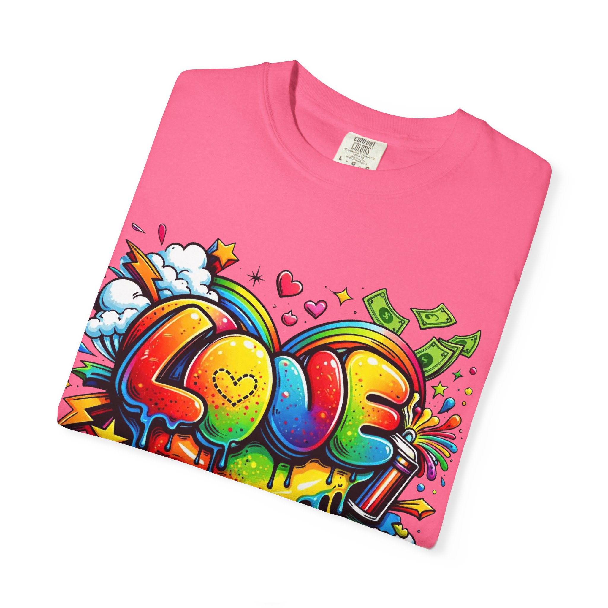 This heavyweight garment-dyed tee wears like a trusted favorite from the first wear. Bright, hand-drawn graffiti art splashes across the chest — a melting rainbow heart framed by clouds, stars, and kinetic bursts that feel loud and joyful. The relaxed cut and soft, broken-in color from post-construction dyeing make it a casual staple for everyday wear, while the small colorful icon at the upper back adds a subtle signature detail. It’s the kind of shirt you throw on when you want to bring color into a gray day, start conversations, and move through the city or studio with a playful, confident energy.