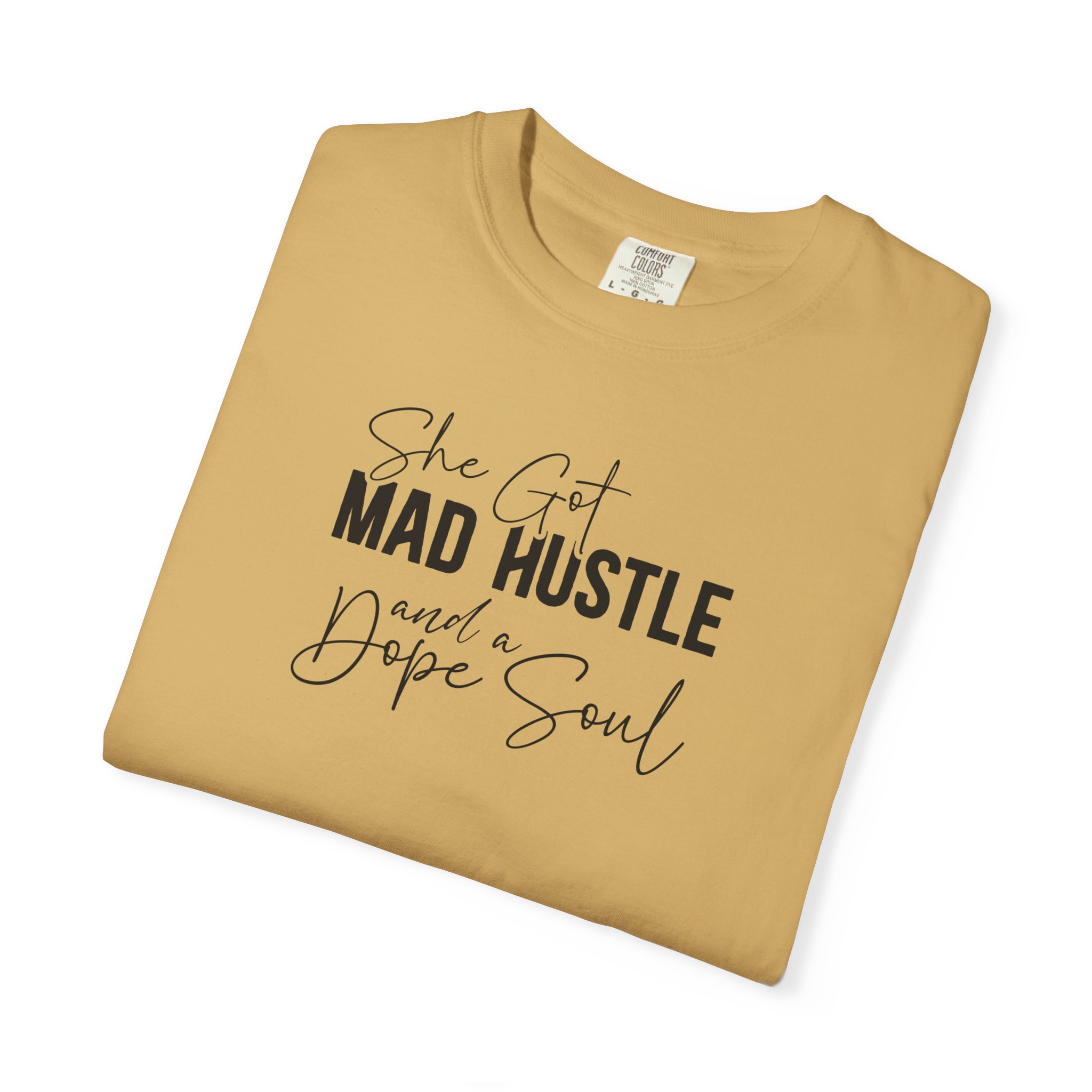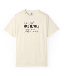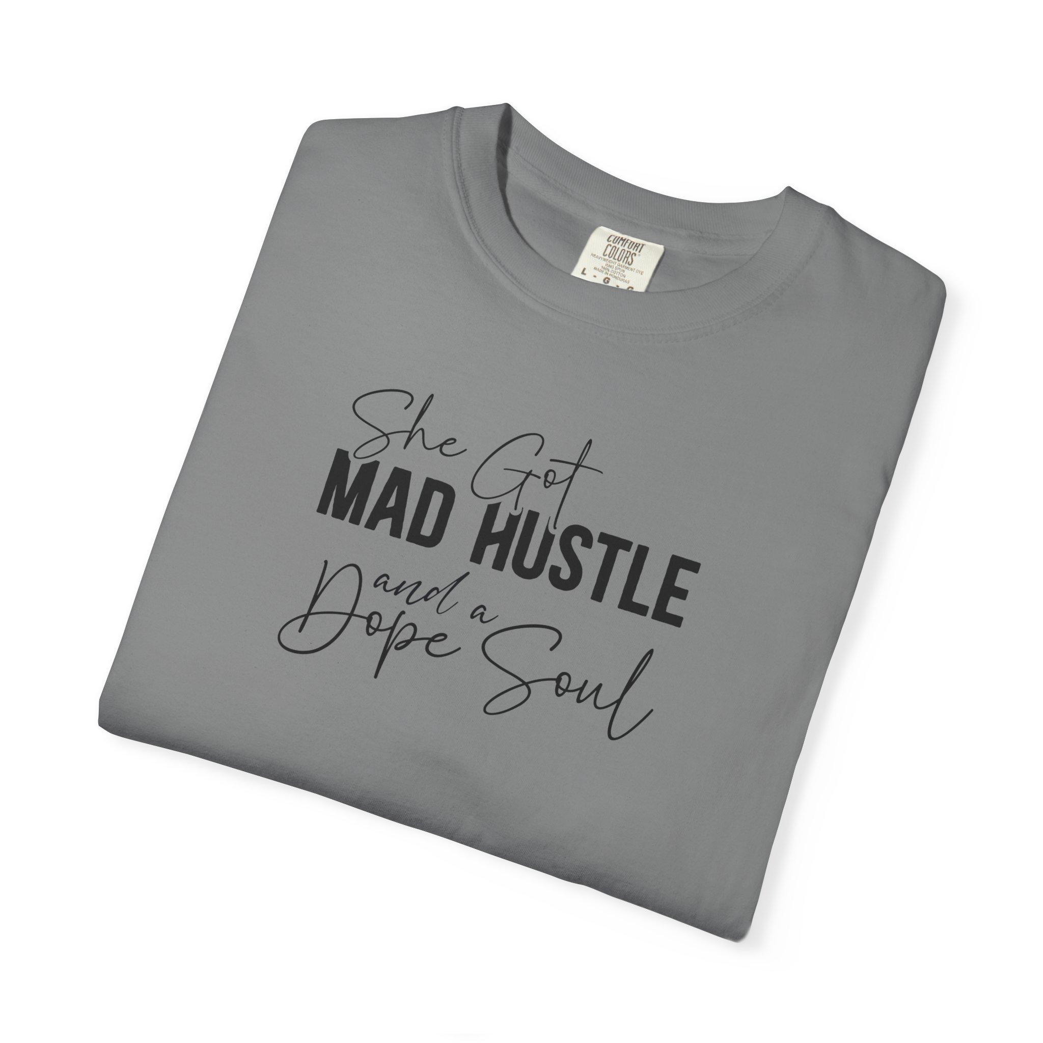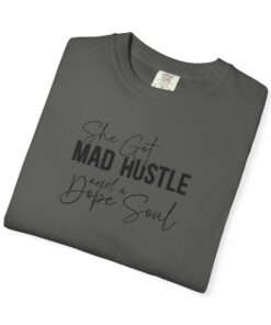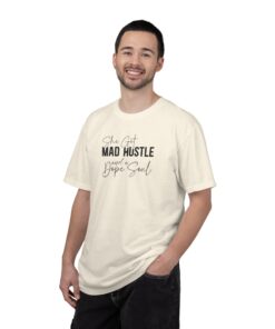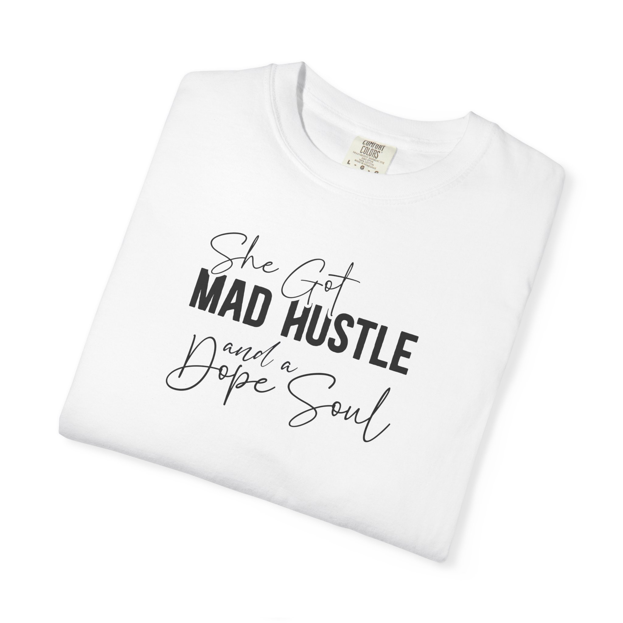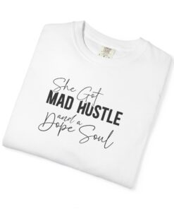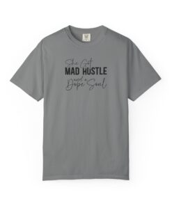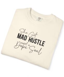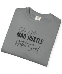 The Design: A sophisticated typographic layout combining “MAD HUSTLE” in bold with “She Got” and “a Dope Soul” in graceful cursive.