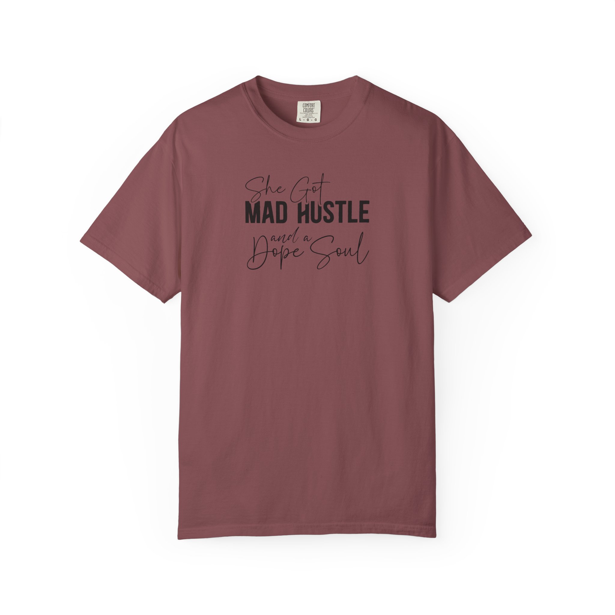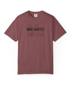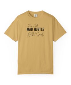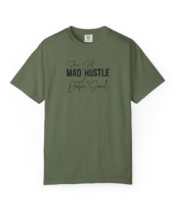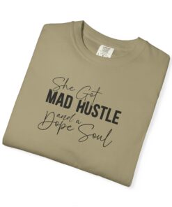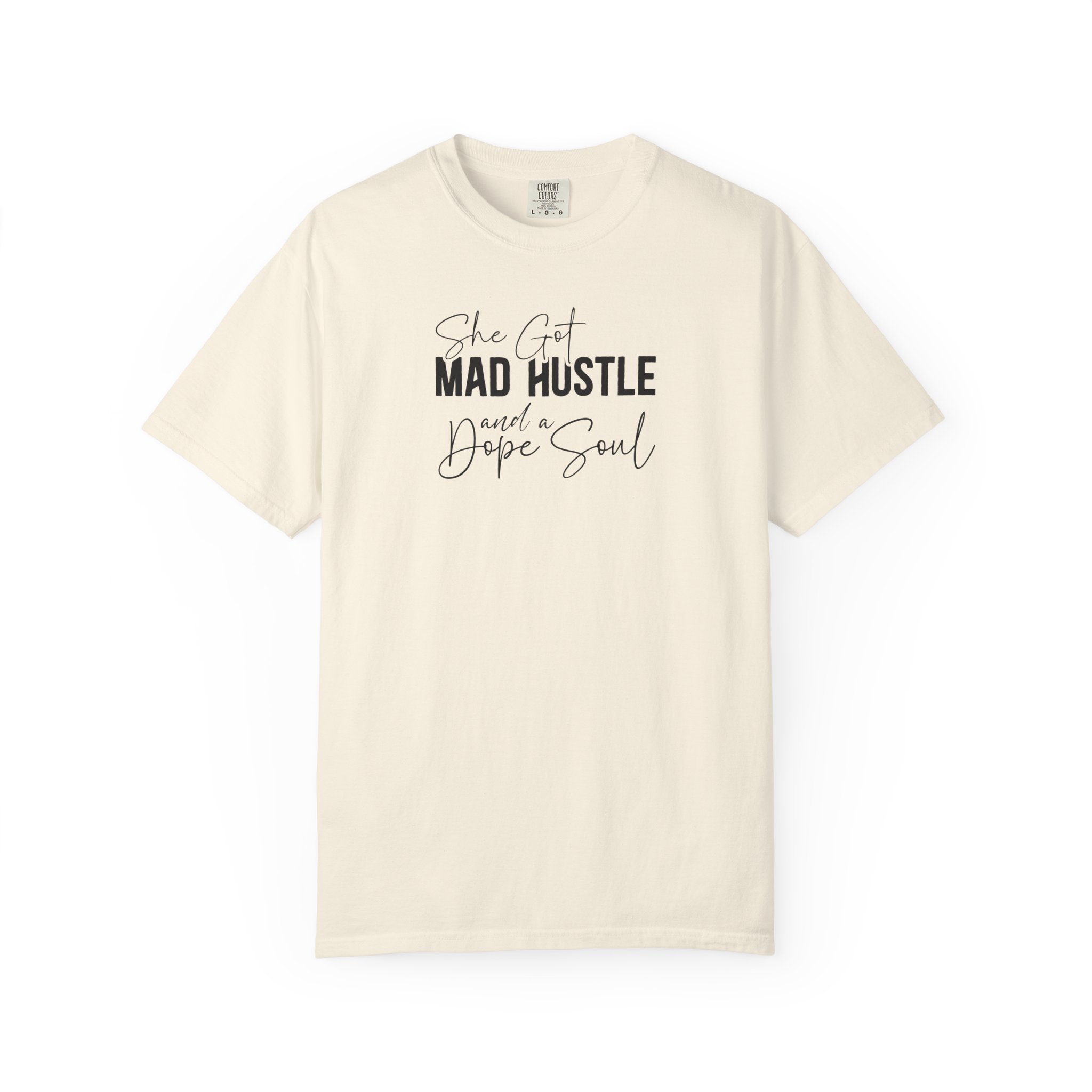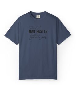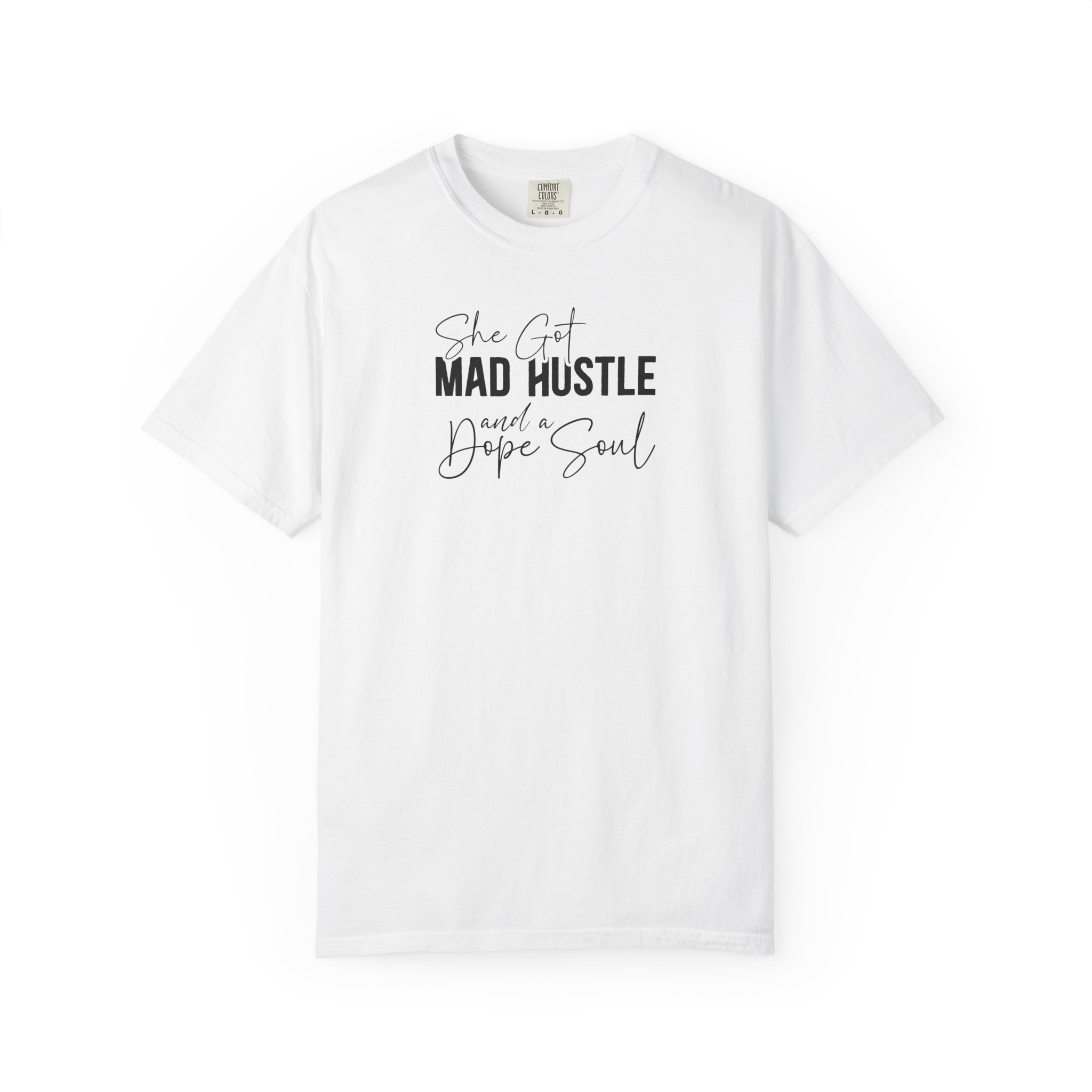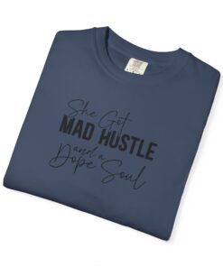 The Design: A sophisticated typographic layout combining “MAD HUSTLE” in bold with “She Got” and “a Dope Soul” in graceful cursive.