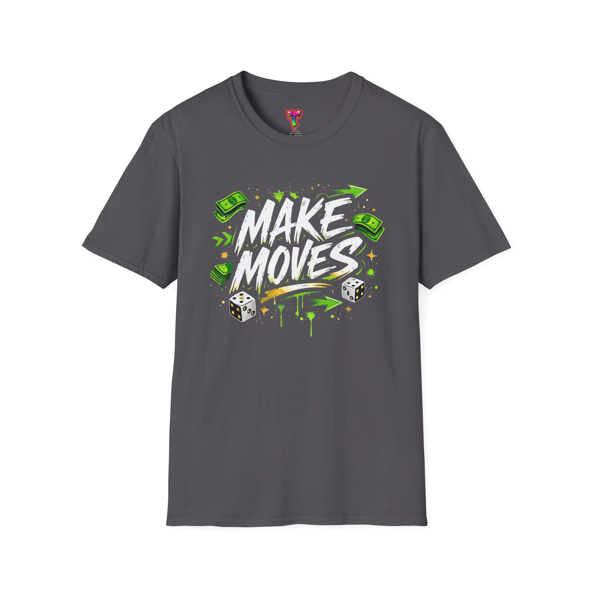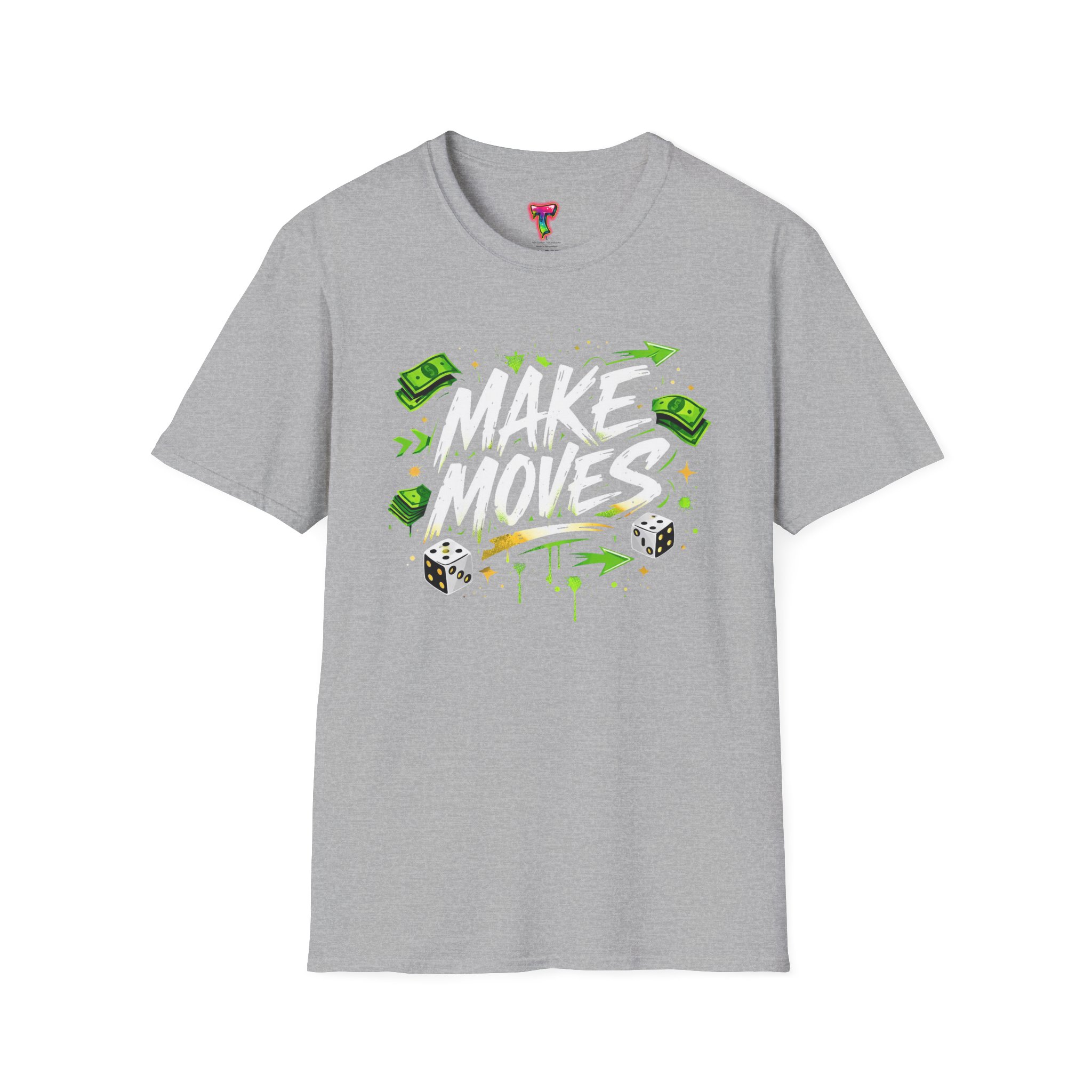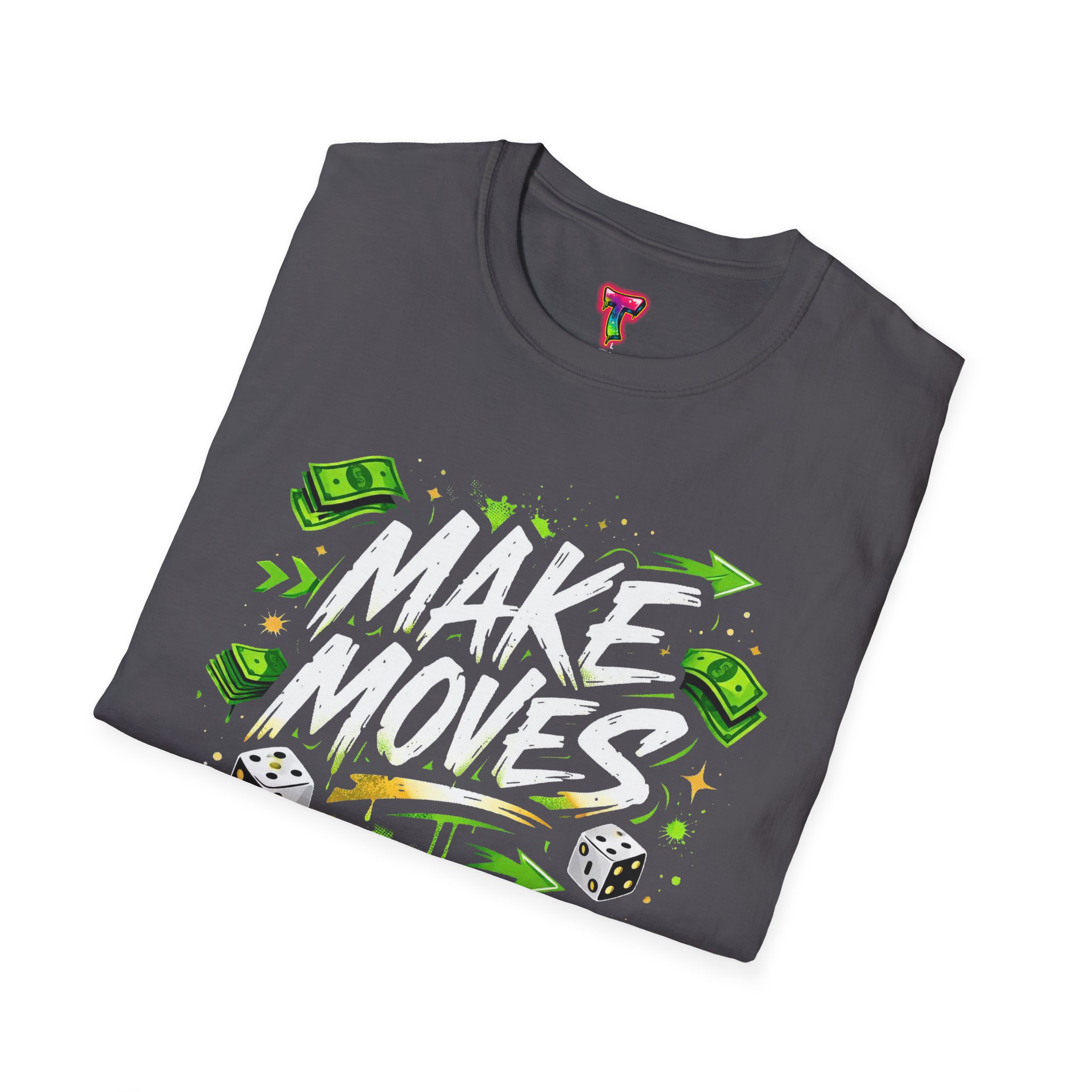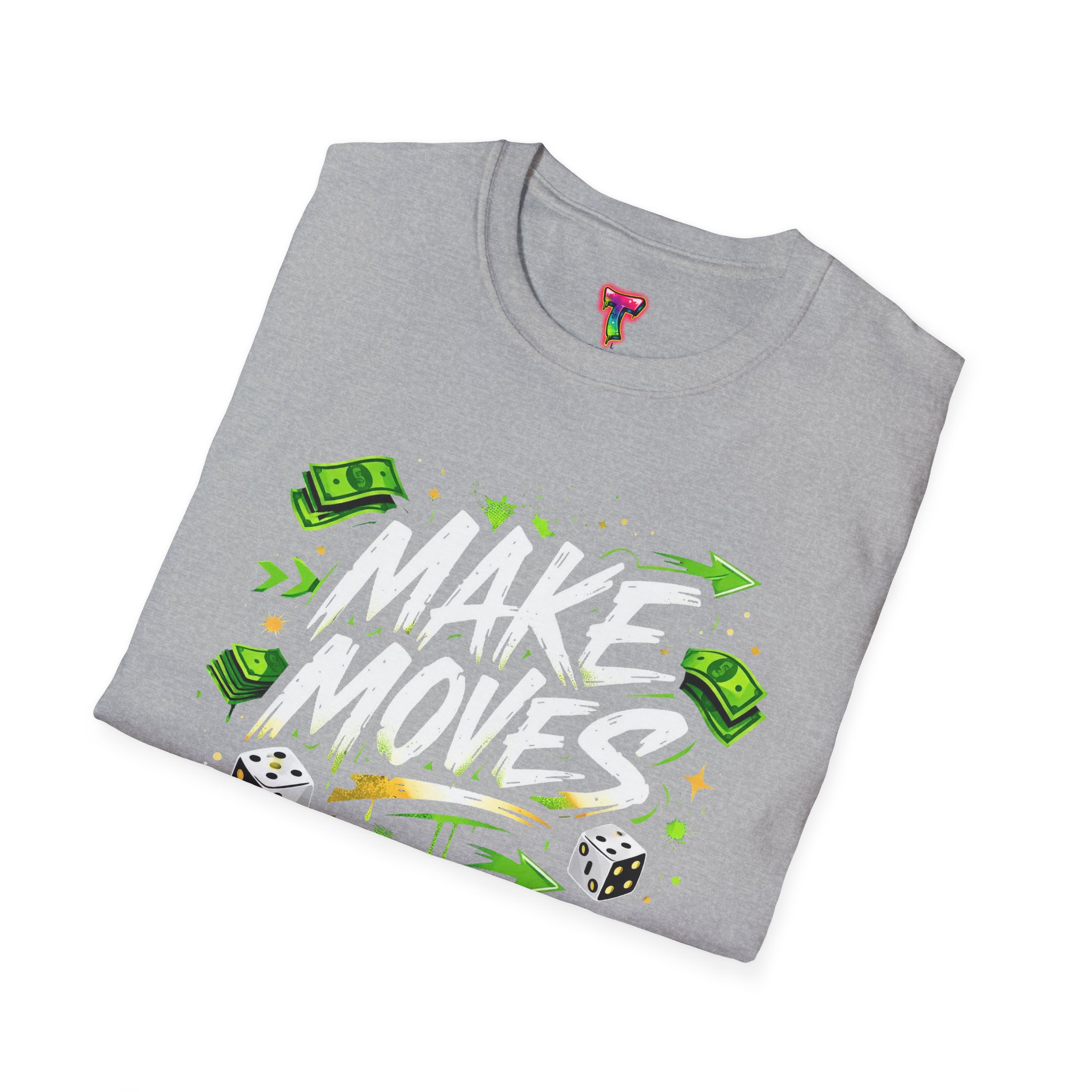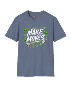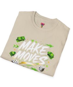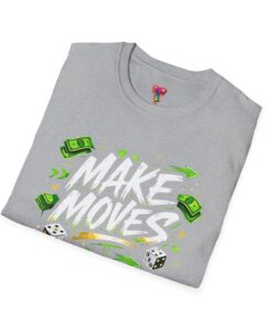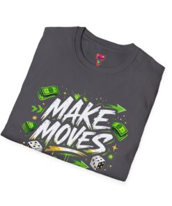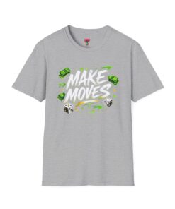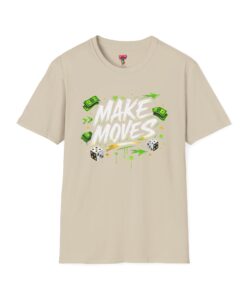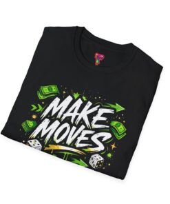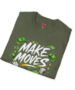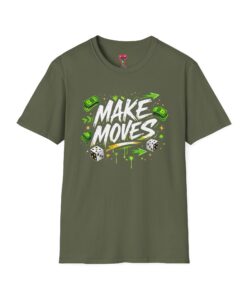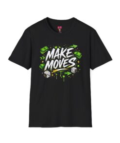 Dynamic streetwear t-shirt design featuring bold graffiti typography with the phrase Make Moves, surrounded by money icons, dice, and urban elements. Designed with hustle energy, playful attitude, and modern street style, this graphic is perfect for entrepreneurs, go-getters, gamers, and fans of bold statement fashion. Great for casual wear, gifts, and trendy urban collections.