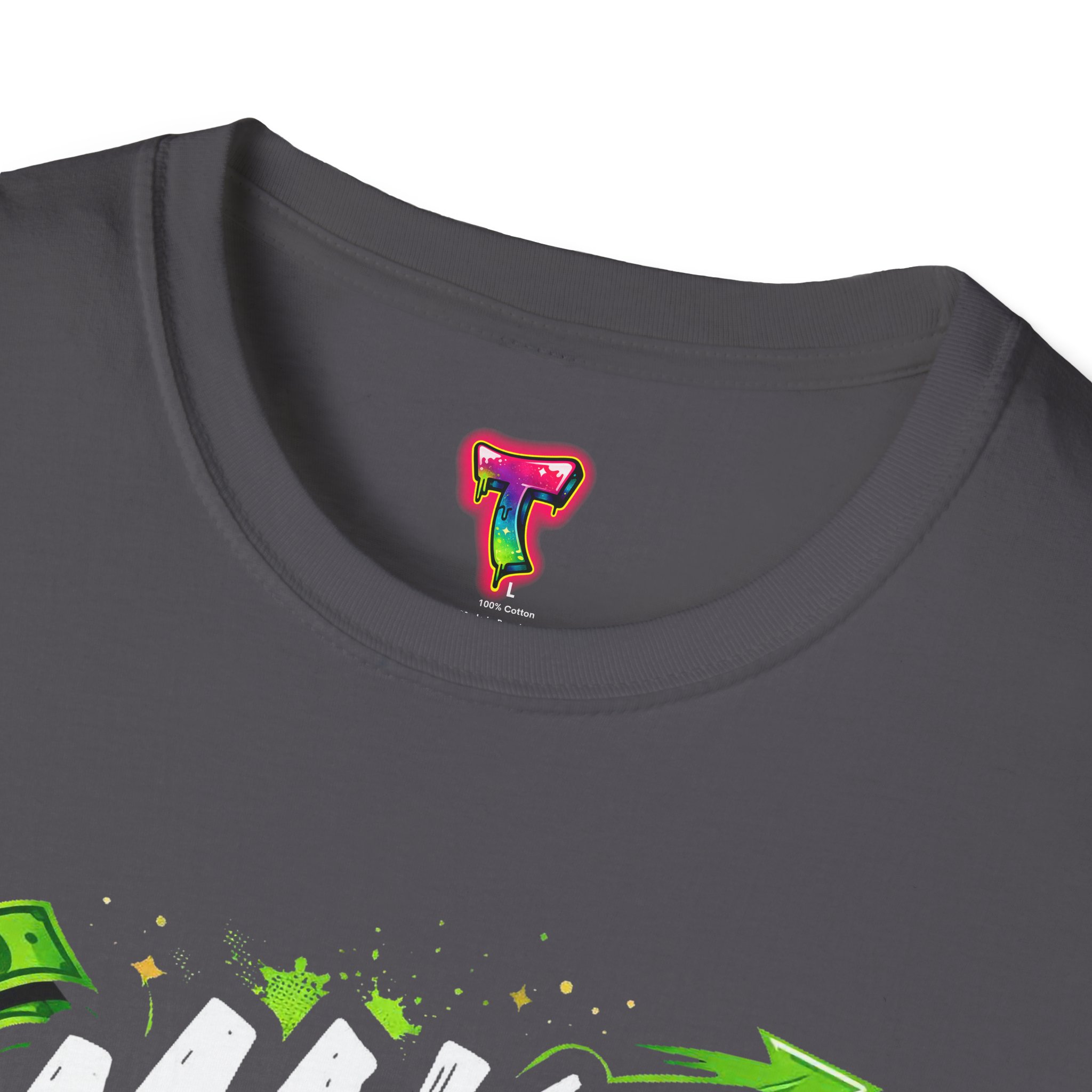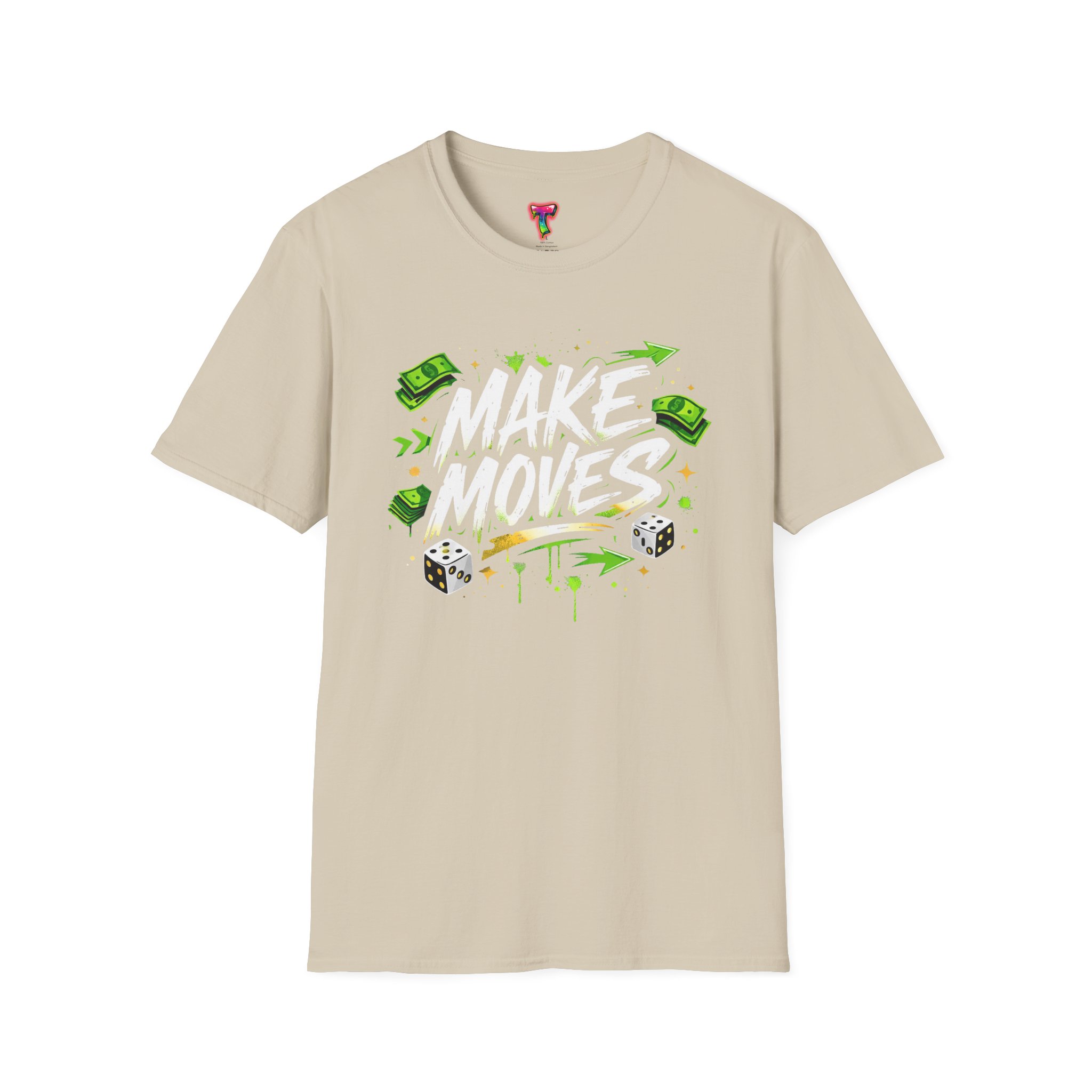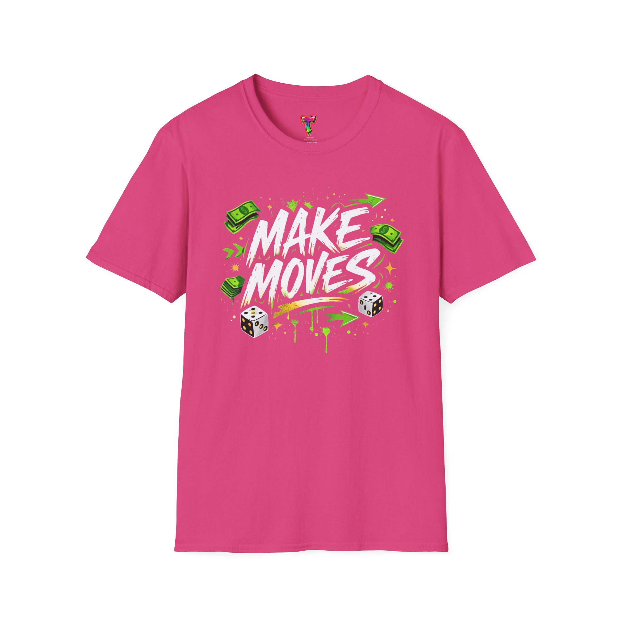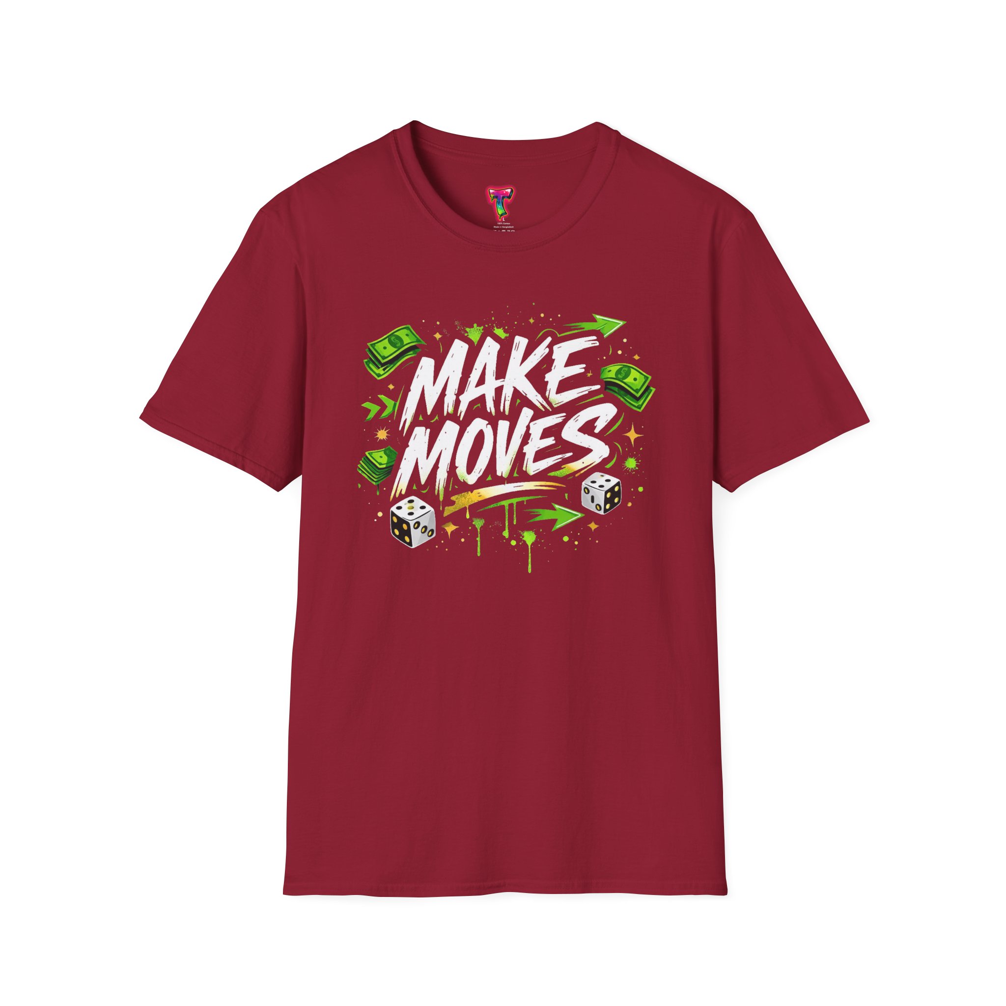 Dynamic streetwear t-shirt design featuring bold graffiti typography with the phrase Make Moves, surrounded by money icons, dice, and urban elements. Designed with hustle energy, playful attitude, and modern street style, this graphic is perfect for entrepreneurs, go-getters, gamers, and fans of bold statement fashion. Great for casual wear, gifts, and trendy urban collections.