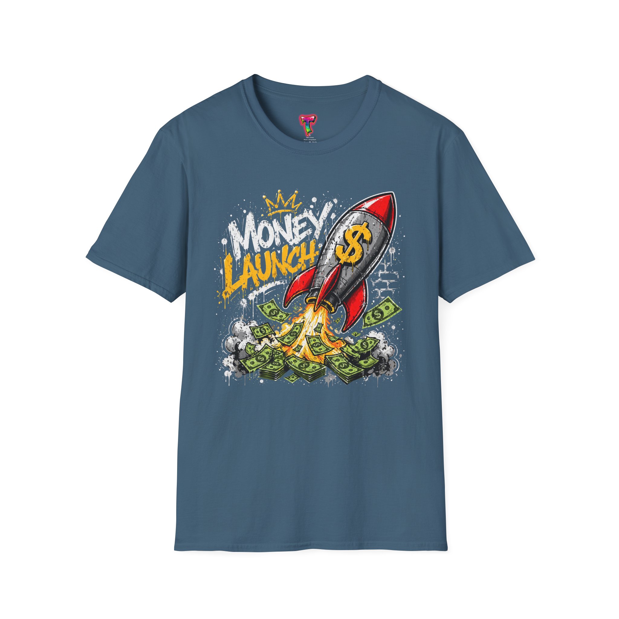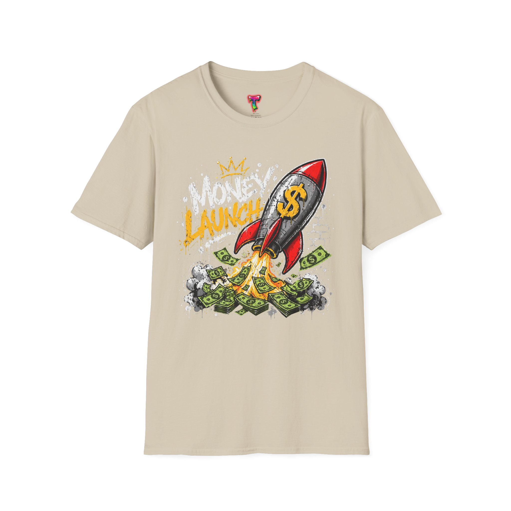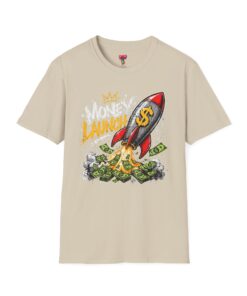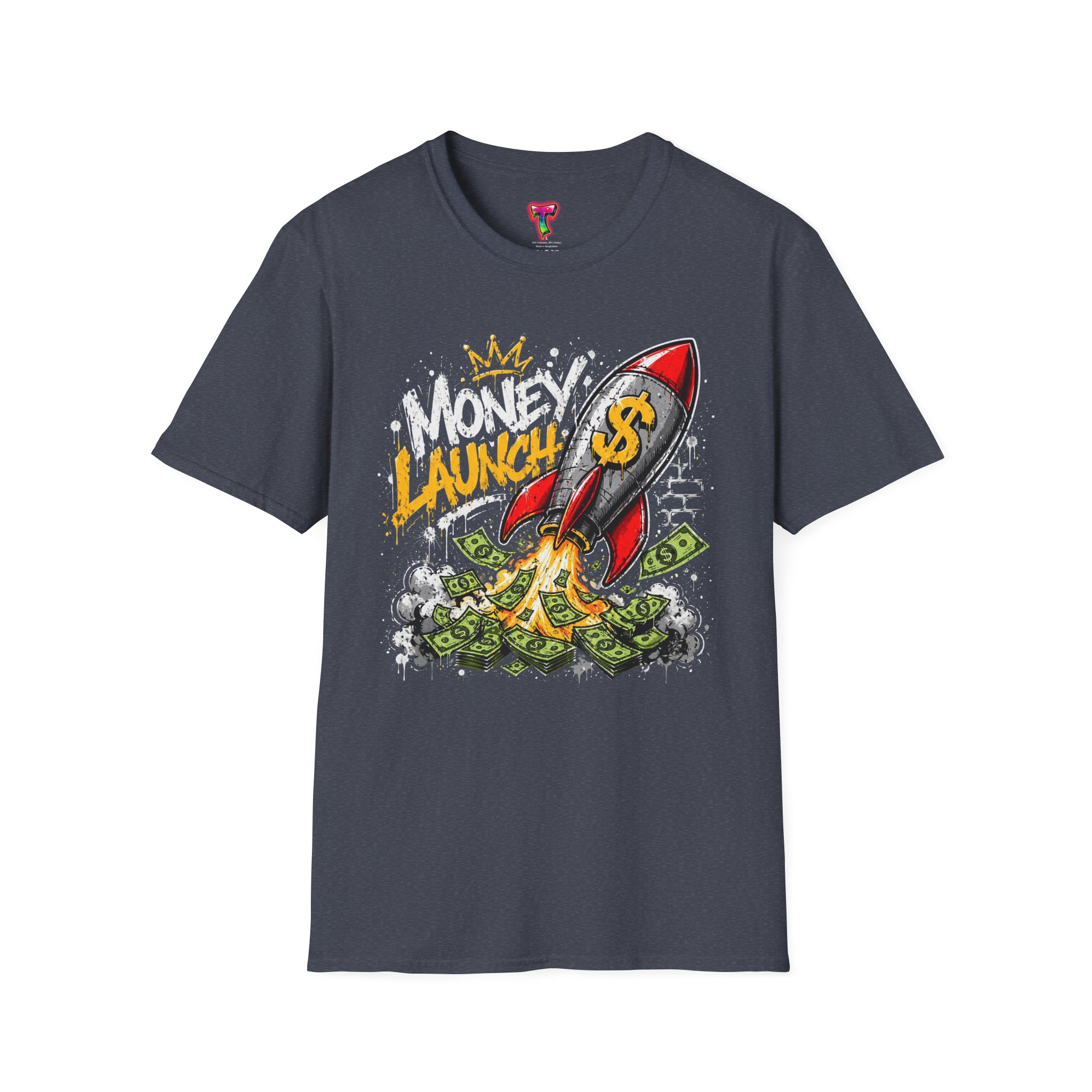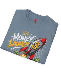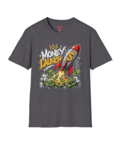 This lightweight crewneck tee carries bold street energy — a graphic rocket stamped with a dollar sign blasting off through a pile of cash. The art feels playful and defiant, like a personal anthem for anyone chasing financial goals, side hustles, or startup dreams. Wear it to show confidence without taking yourself too seriously. The smooth, soft cotton sits close to the body in a classic fit so the colorful print pops against the dark fabric. It layers easily under jackets or goes solo with jeans when you want the design to speak loudest.