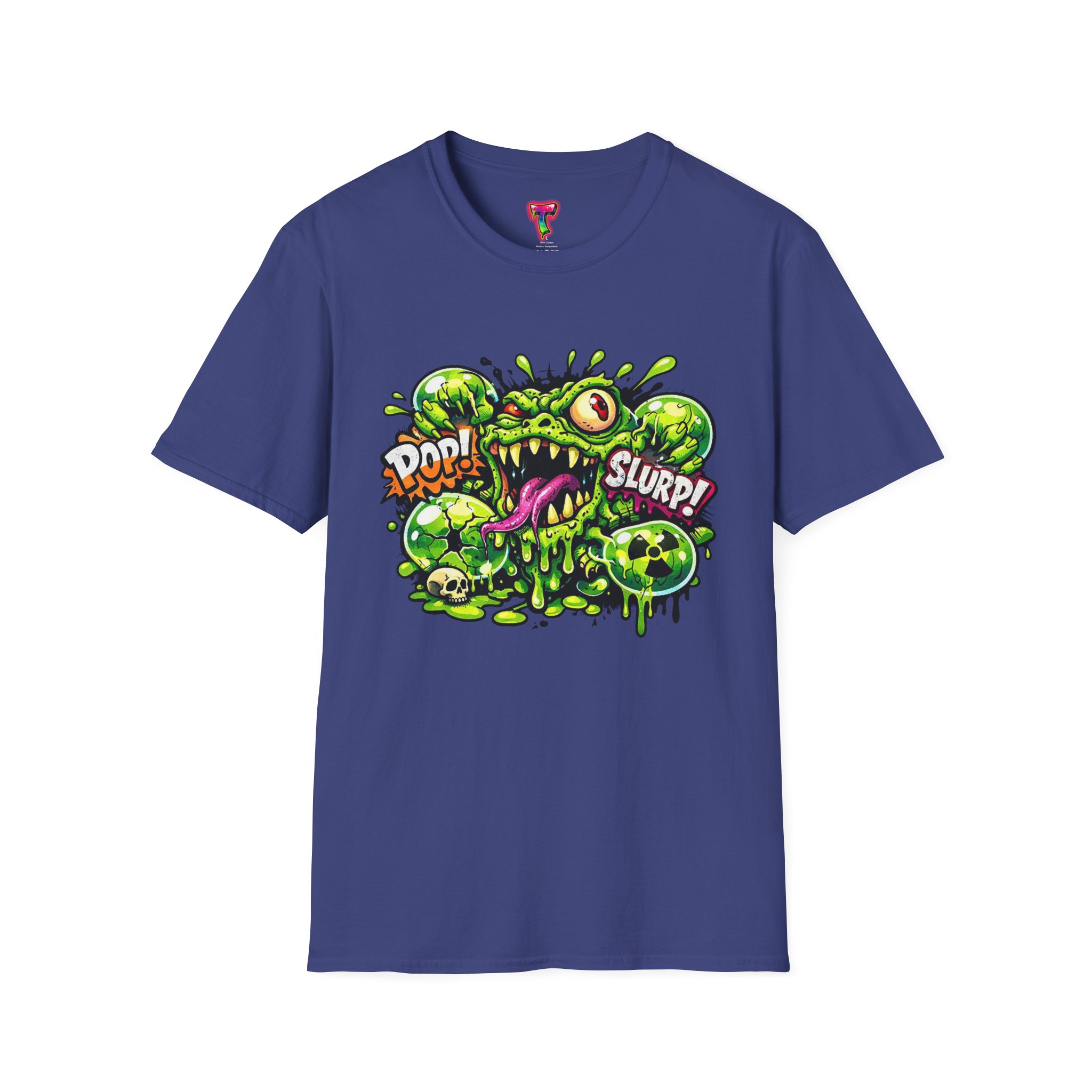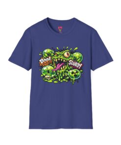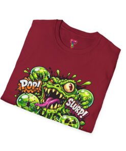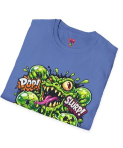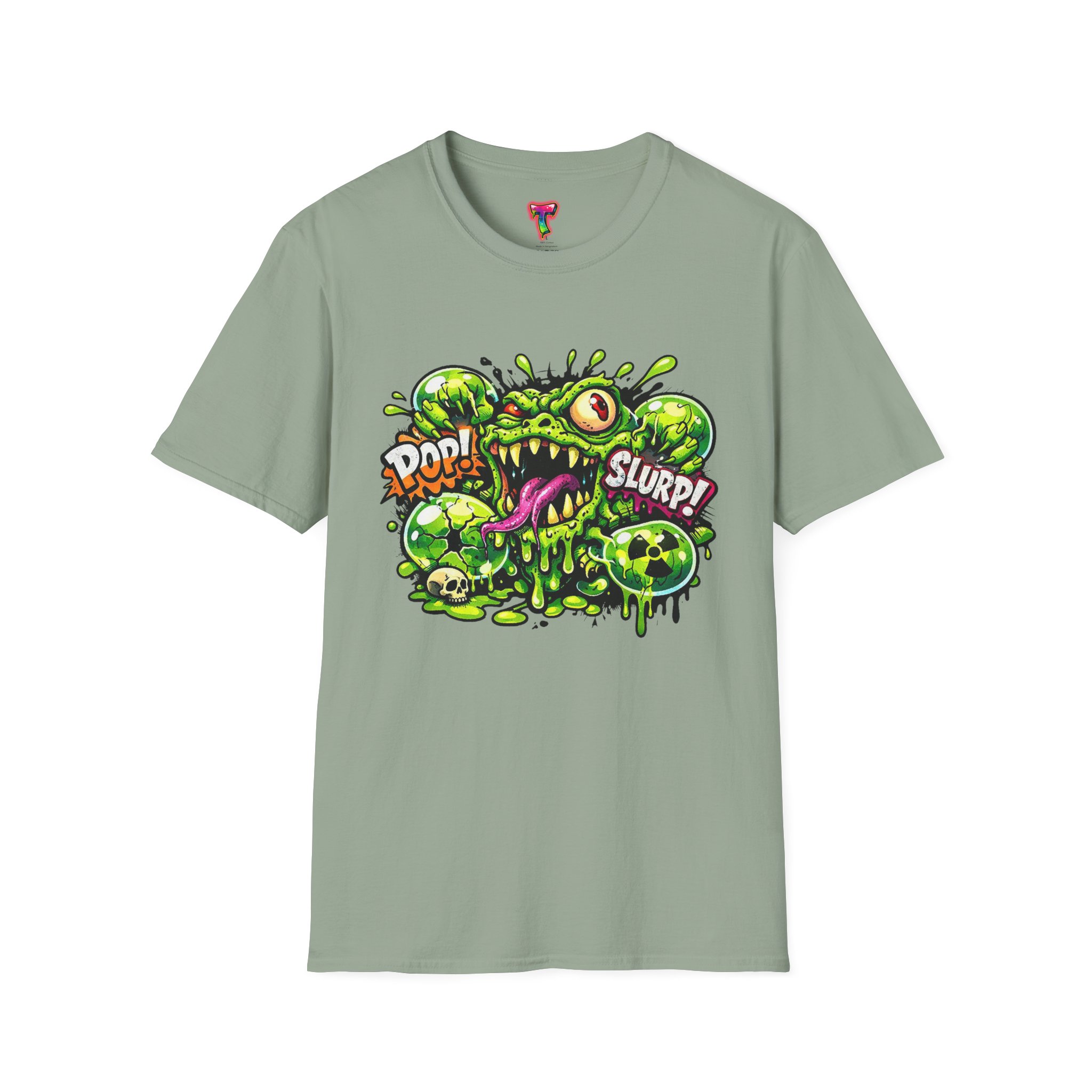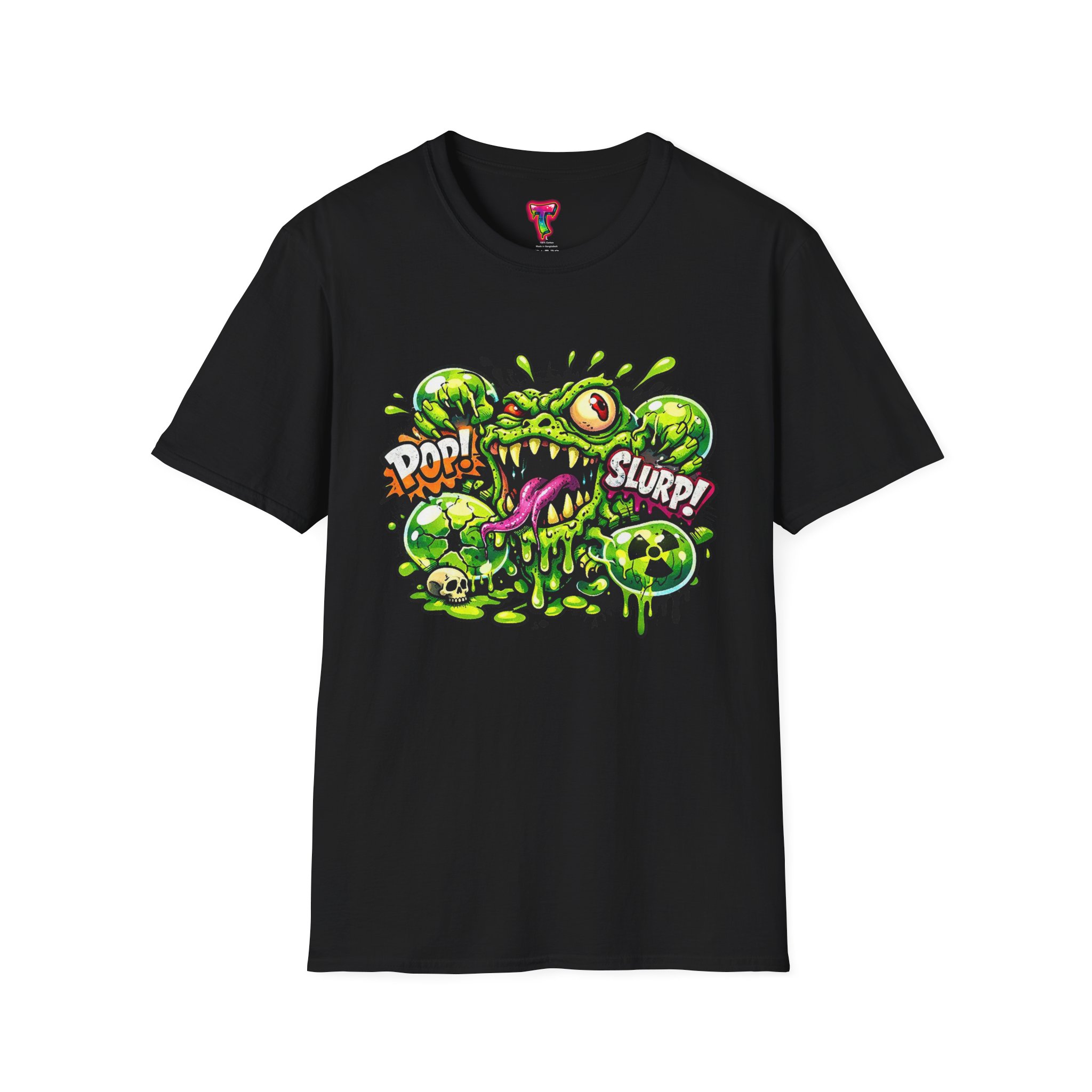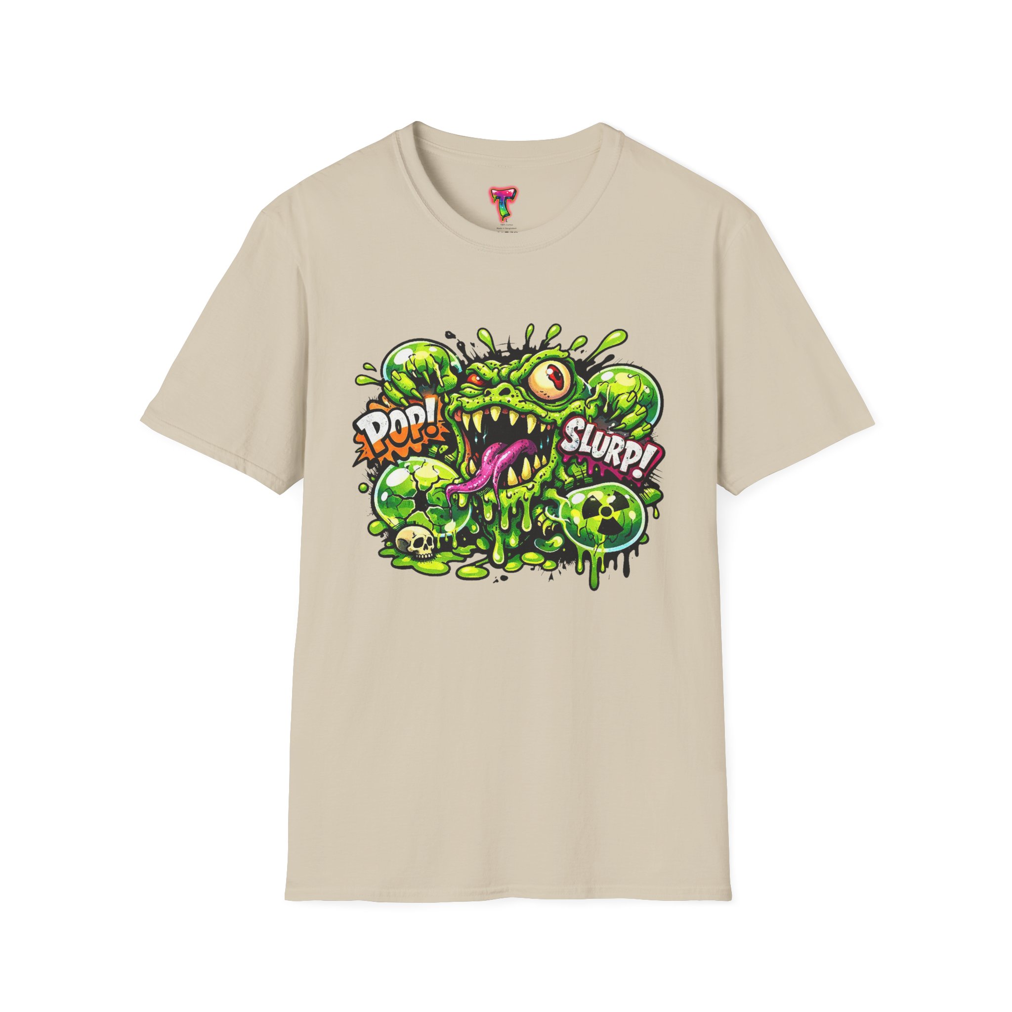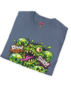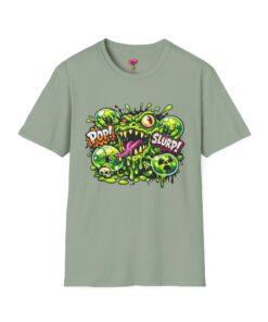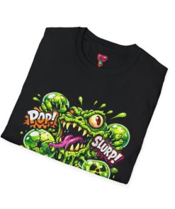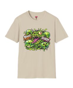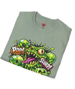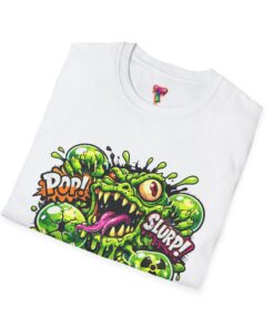 This lightweight cotton tee brings a loud, messy personality to everyday wear. A neon-green, goo-dripping creature bursts from the chest in comic-style inks — eyes bulging, tongue lolling, with playful sound effects like “POP!” and “SLURP!” surrounding it. Short sentences, bold lines, and high-contrast colors give it a skateboard-sticker energy: rowdy, irreverent, and impossible to ignore. Wear it to skateparks, late-night shows, or casual hangs when you want your shirt to do the talking. The soft ring-spun cotton feels breathable against the skin while the clean crew neckline keeps the silhouette simple so the artwork stays front and center.