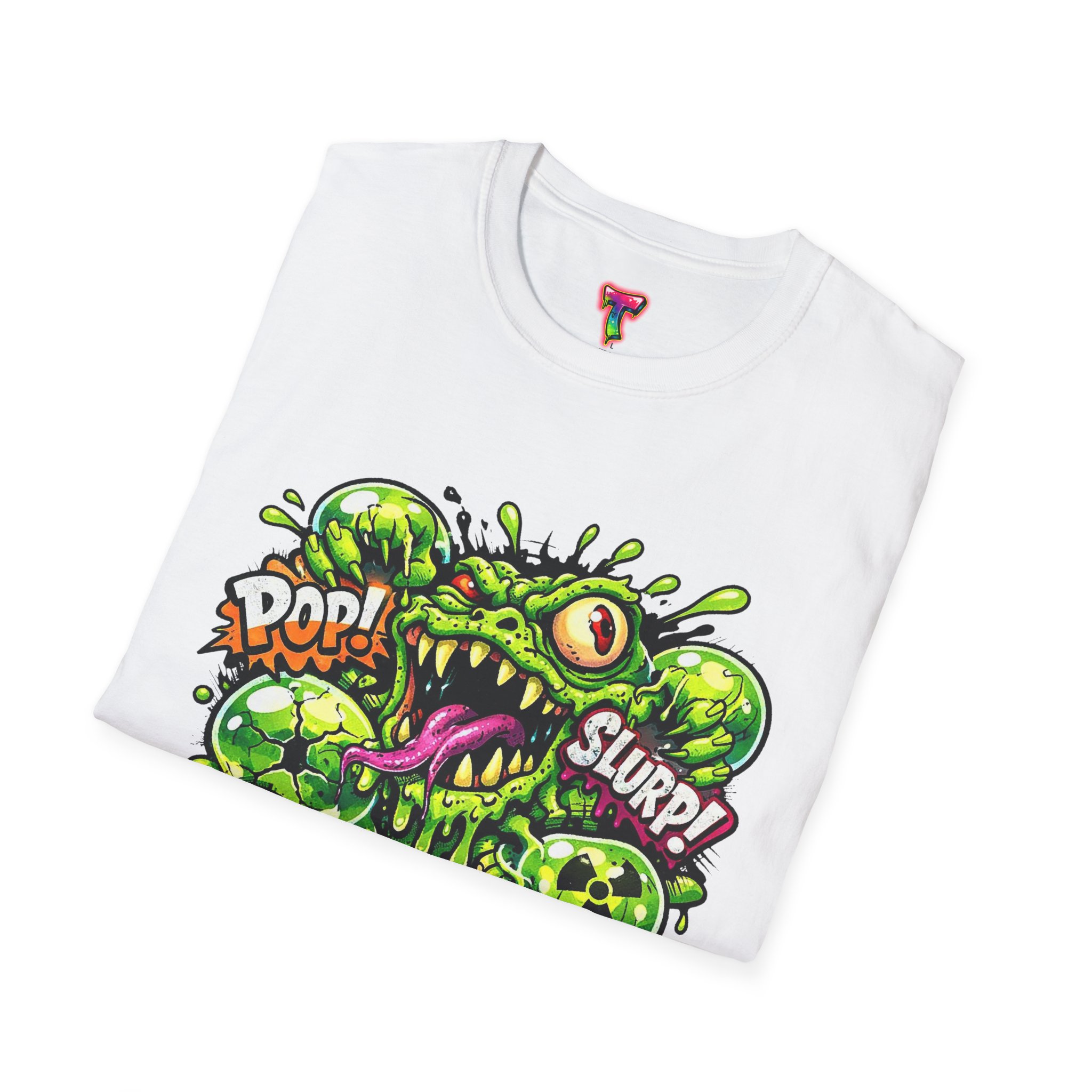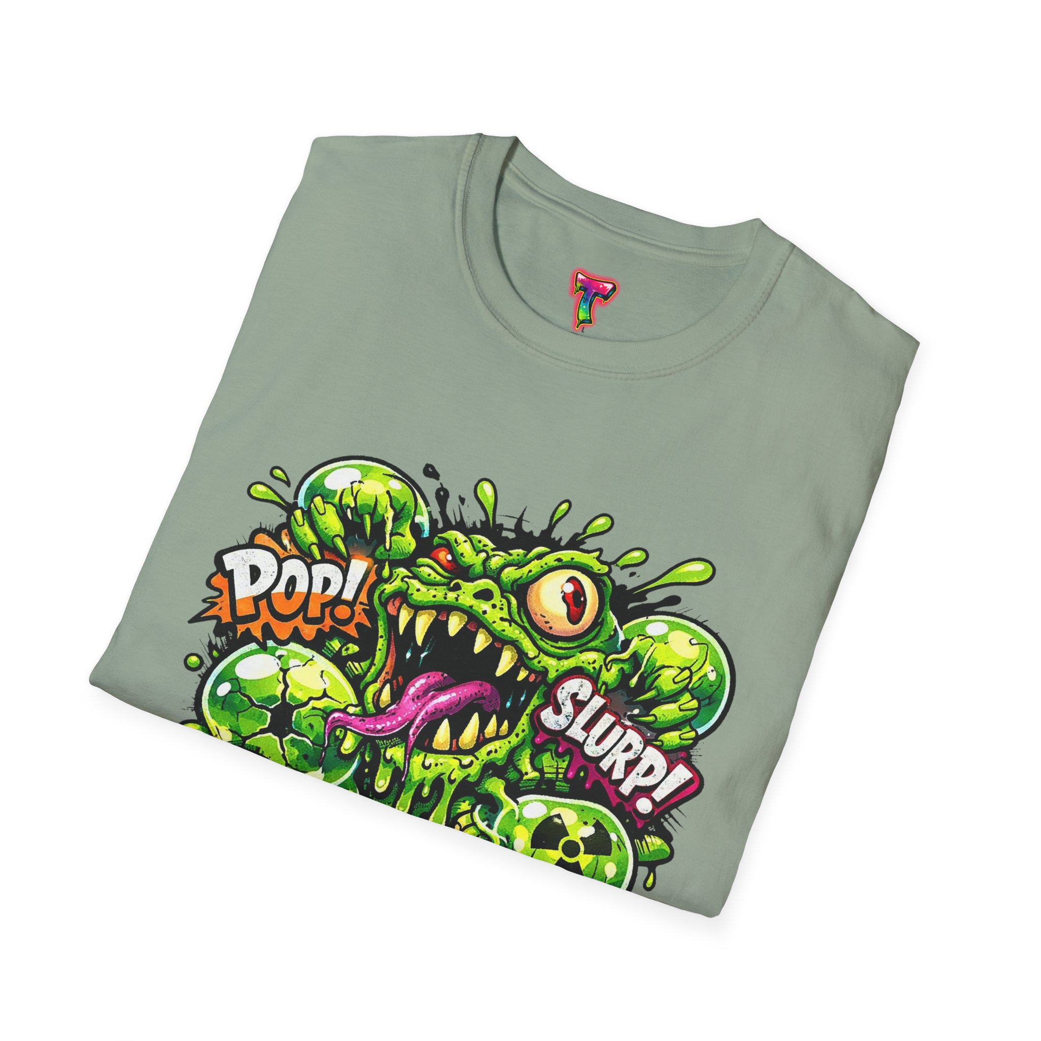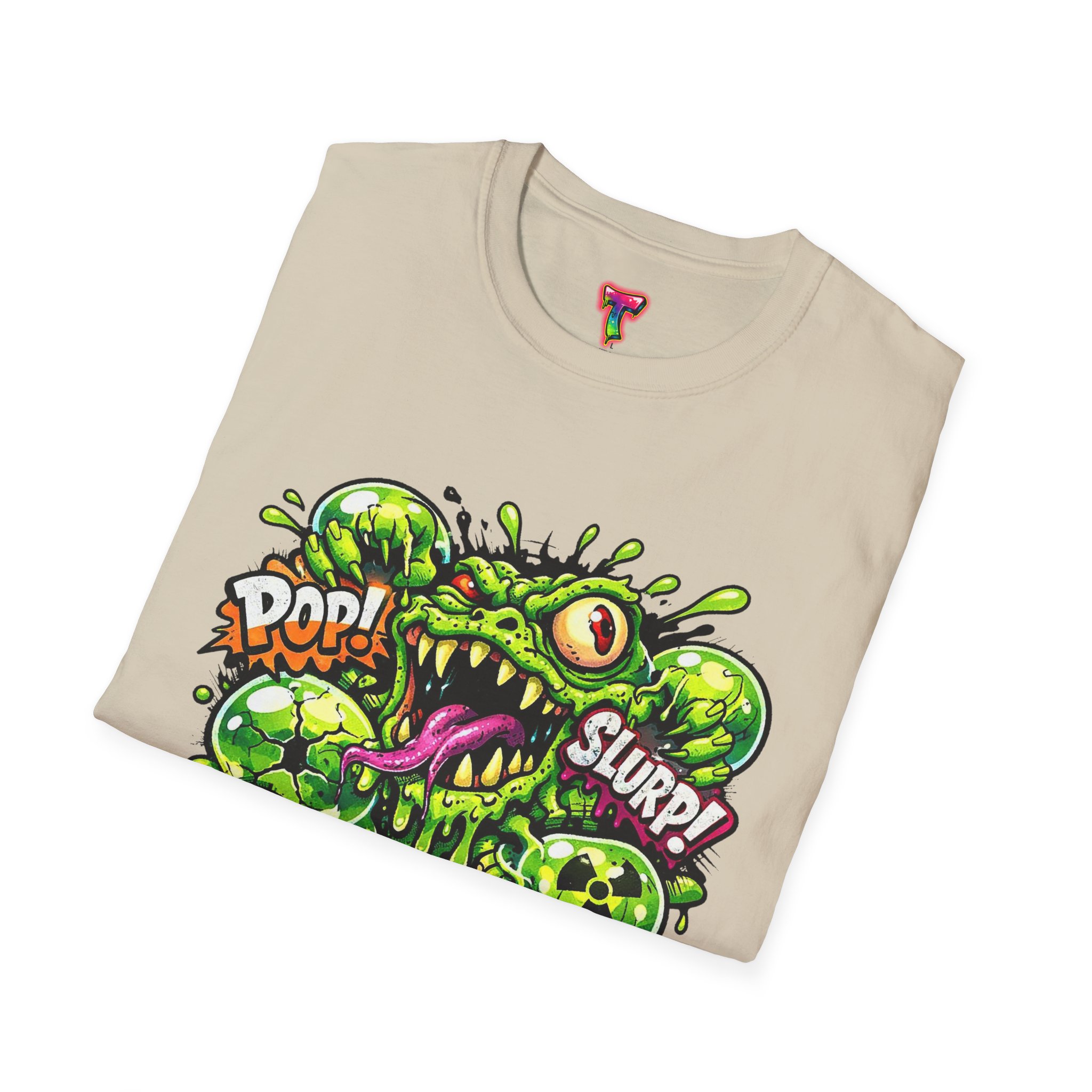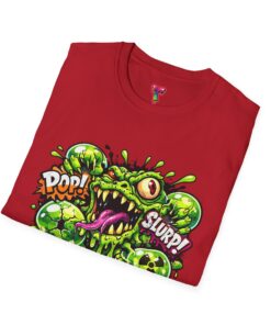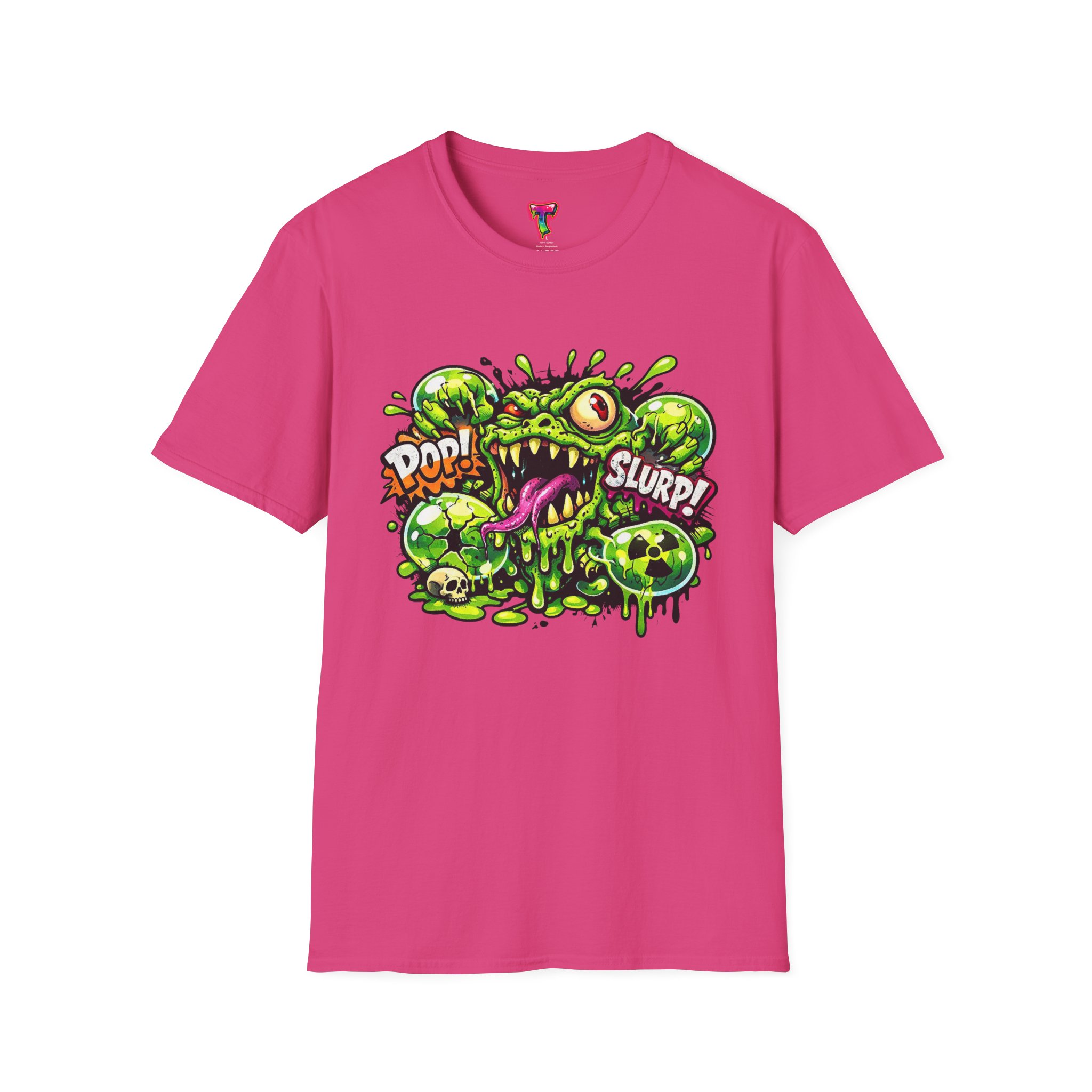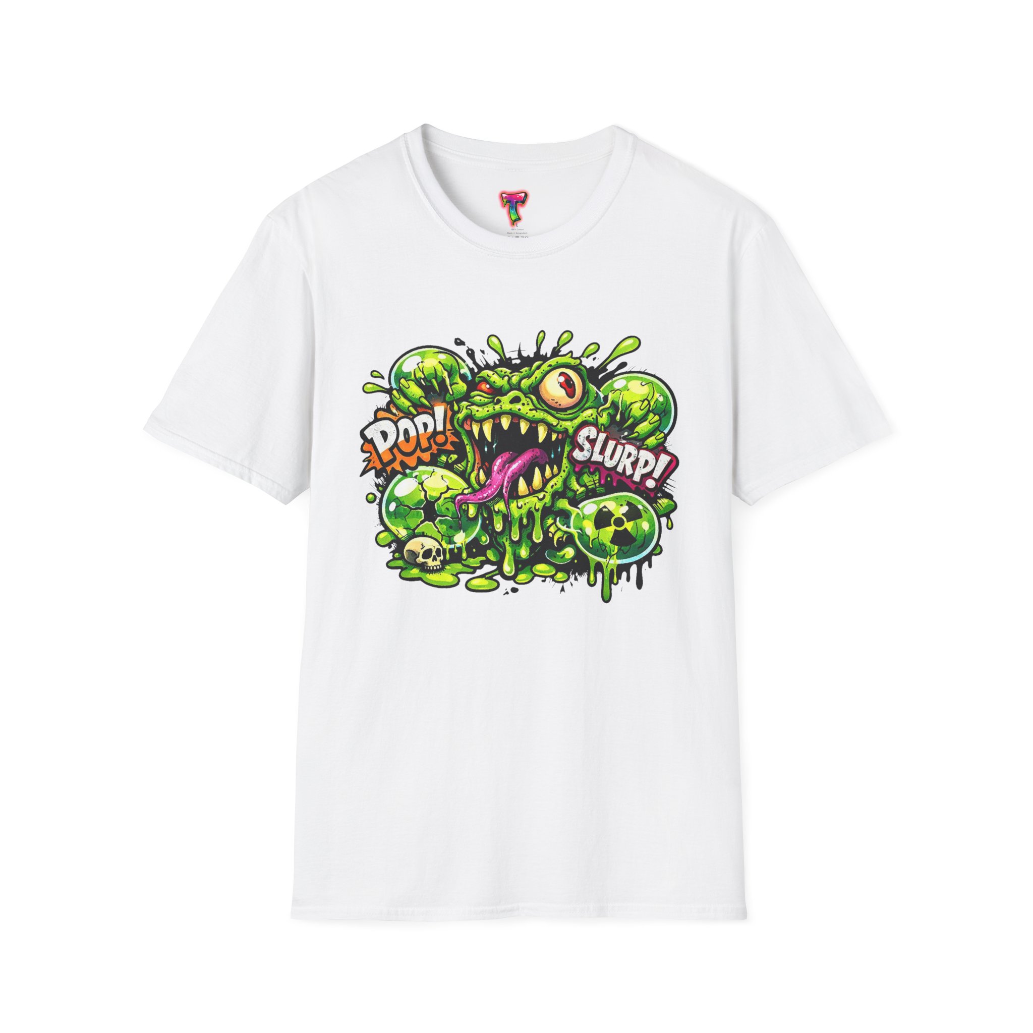 This lightweight cotton tee brings a loud, messy personality to everyday wear. A neon-green, goo-dripping creature bursts from the chest in comic-style inks — eyes bulging, tongue lolling, with playful sound effects like “POP!” and “SLURP!” surrounding it. Short sentences, bold lines, and high-contrast colors give it a skateboard-sticker energy: rowdy, irreverent, and impossible to ignore. Wear it to skateparks, late-night shows, or casual hangs when you want your shirt to do the talking. The soft ring-spun cotton feels breathable against the skin while the clean crew neckline keeps the silhouette simple so the artwork stays front and center.