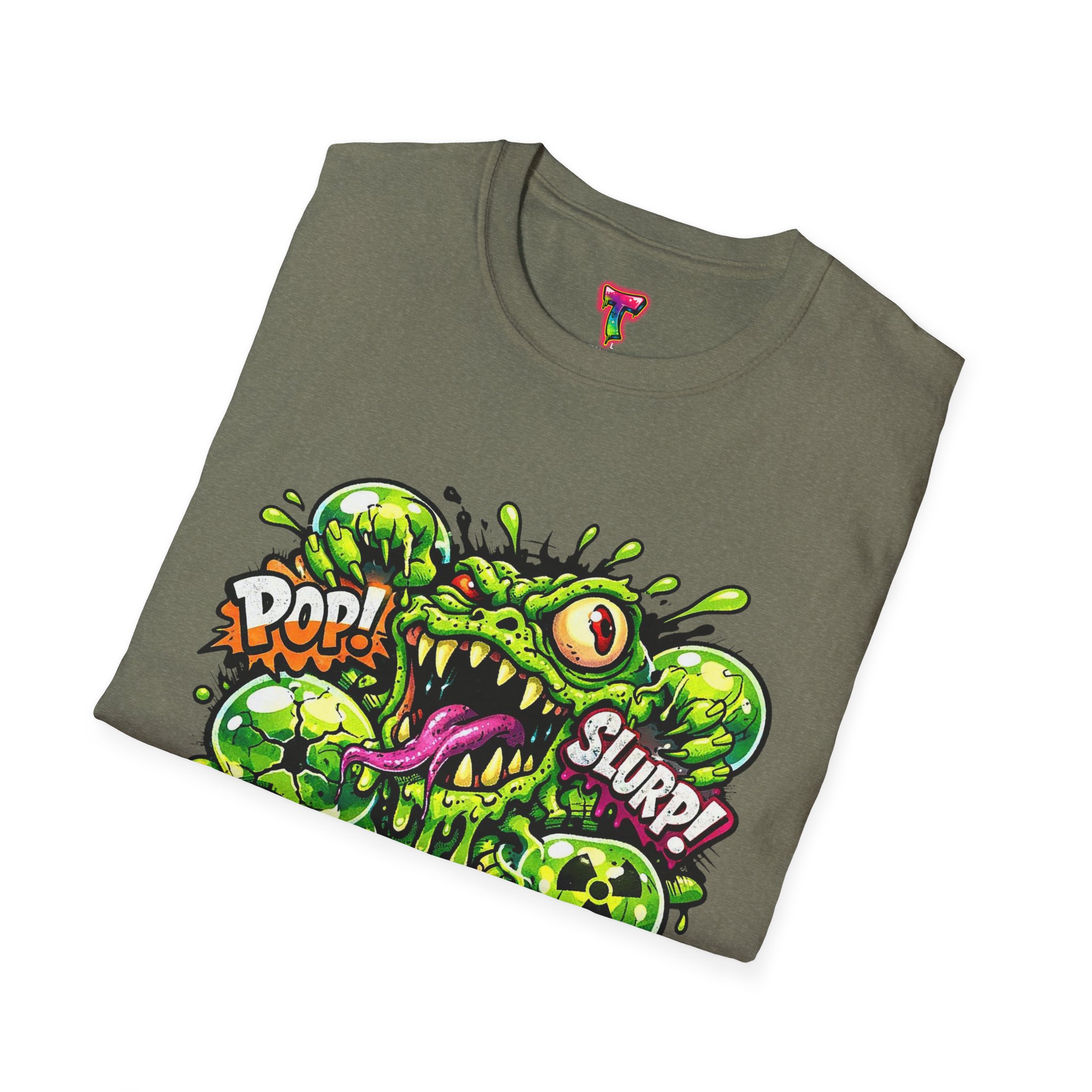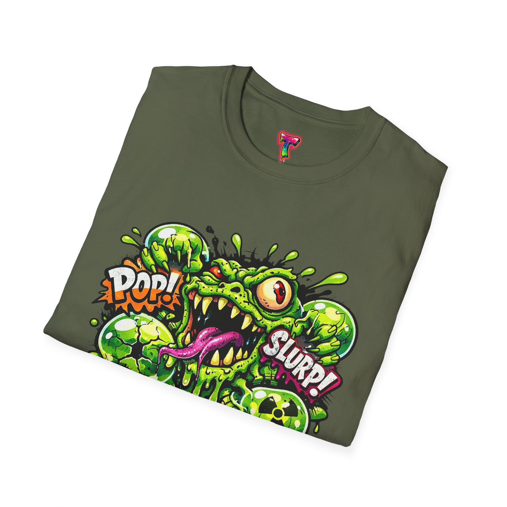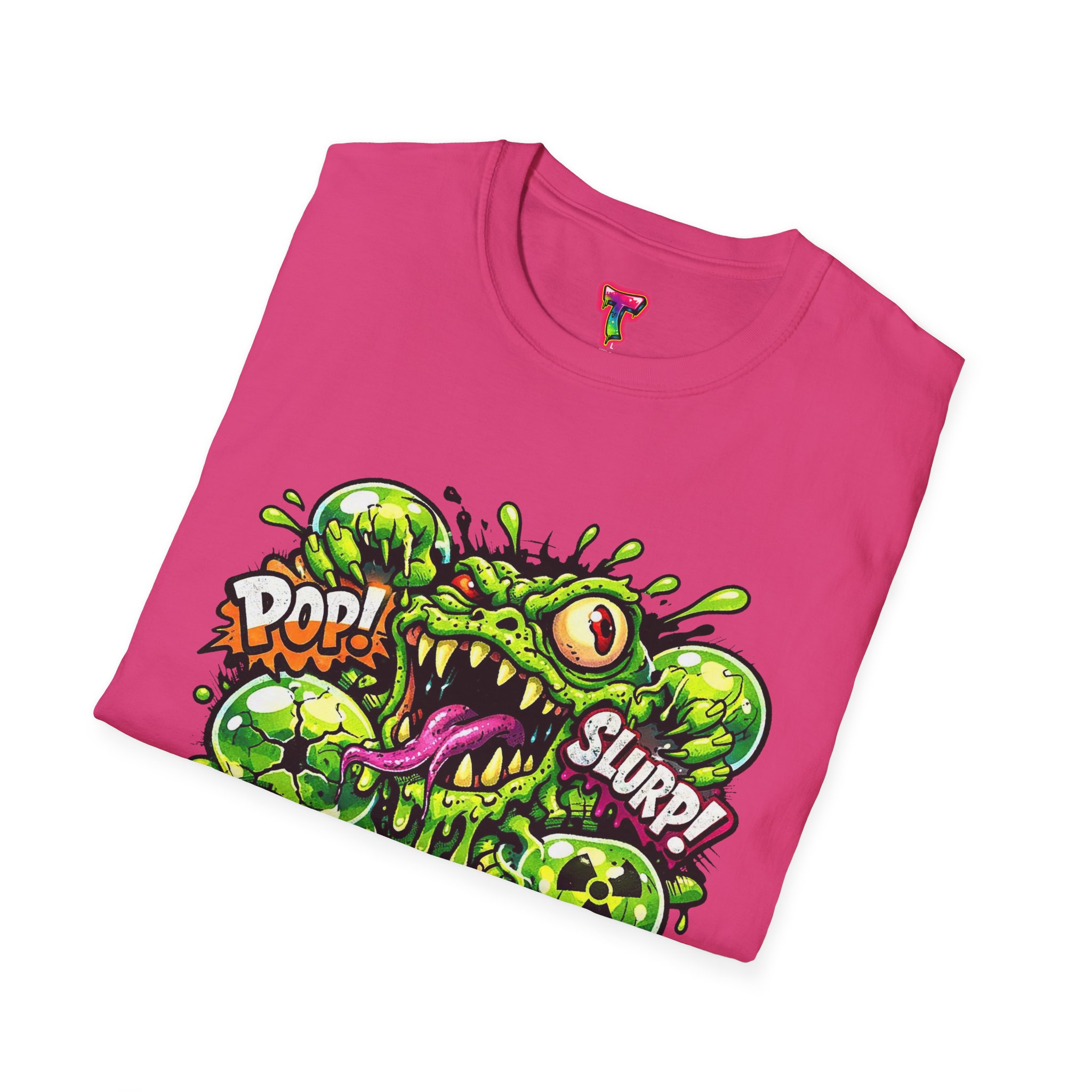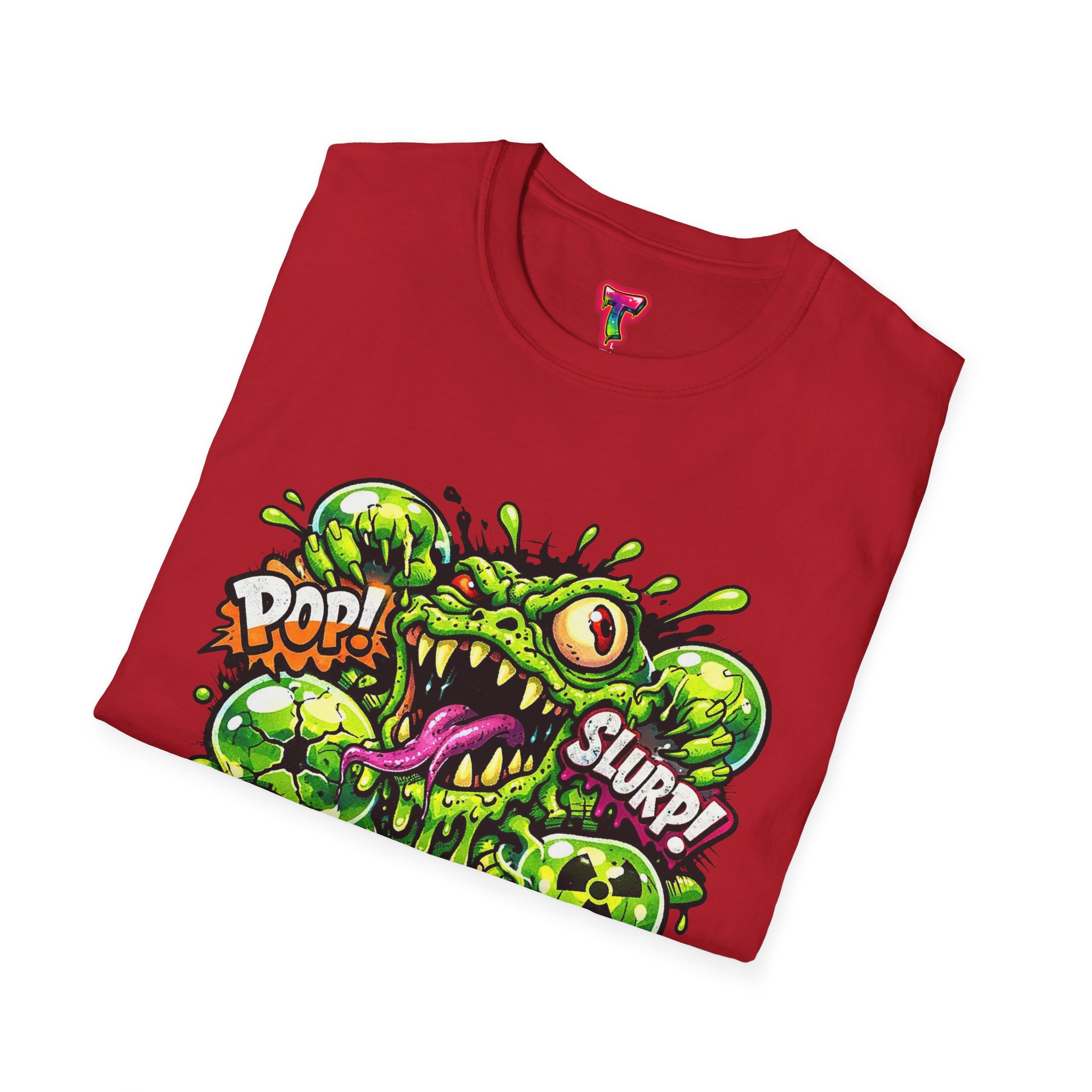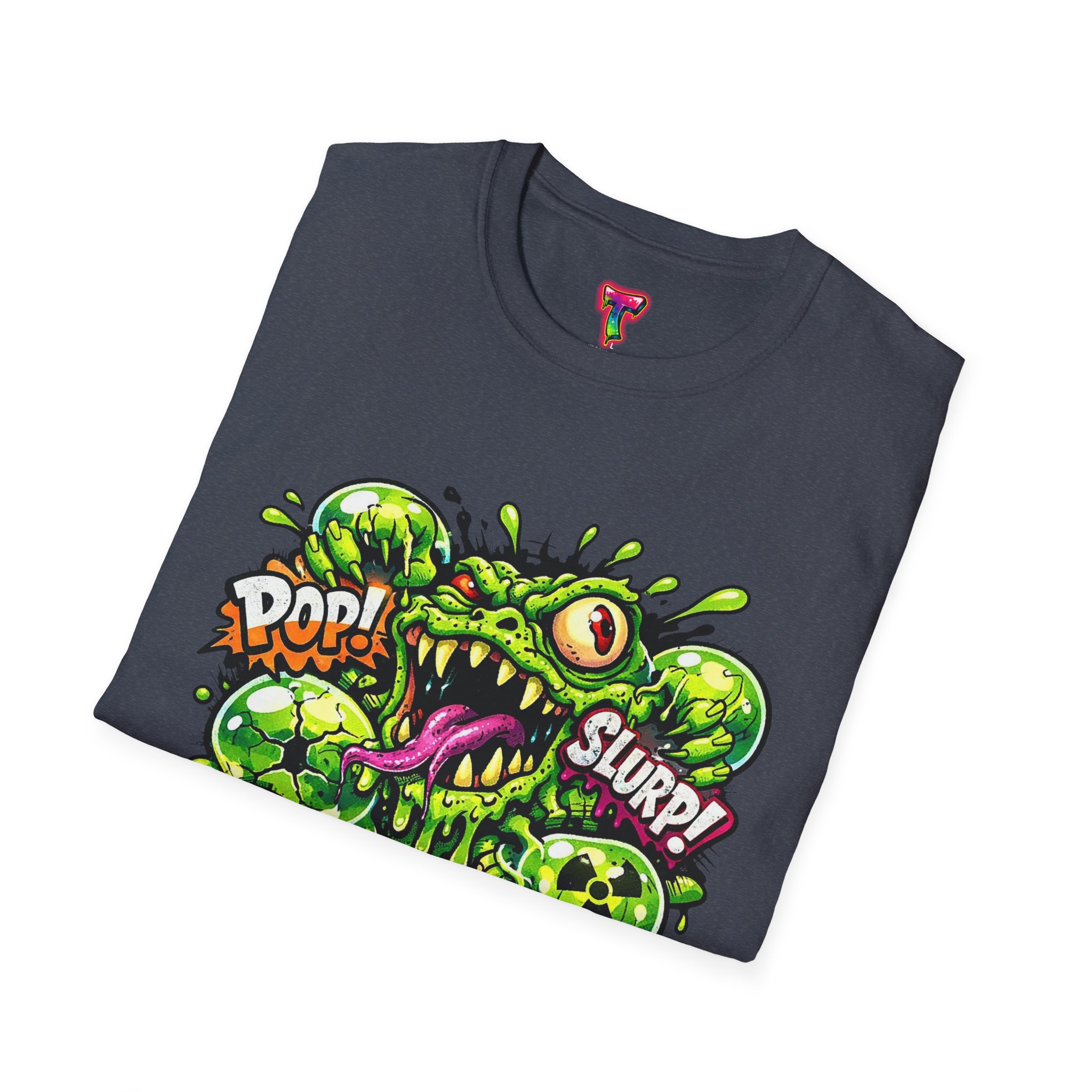 This lightweight cotton tee brings a loud, messy personality to everyday wear. A neon-green, goo-dripping creature bursts from the chest in comic-style inks — eyes bulging, tongue lolling, with playful sound effects like “POP!” and “SLURP!” surrounding it. Short sentences, bold lines, and high-contrast colors give it a skateboard-sticker energy: rowdy, irreverent, and impossible to ignore. Wear it to skateparks, late-night shows, or casual hangs when you want your shirt to do the talking. The soft ring-spun cotton feels breathable against the skin while the clean crew neckline keeps the silhouette simple so the artwork stays front and center.