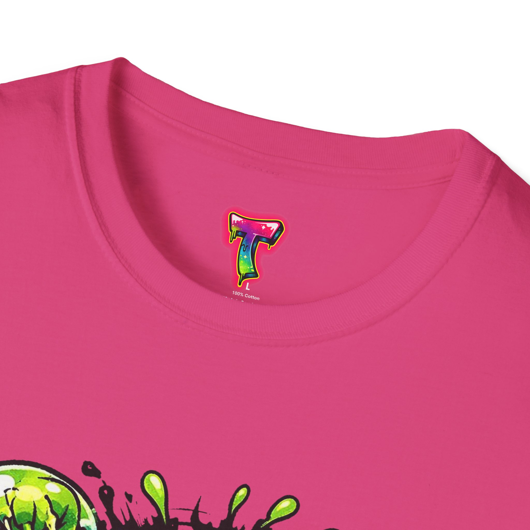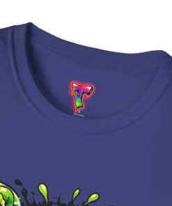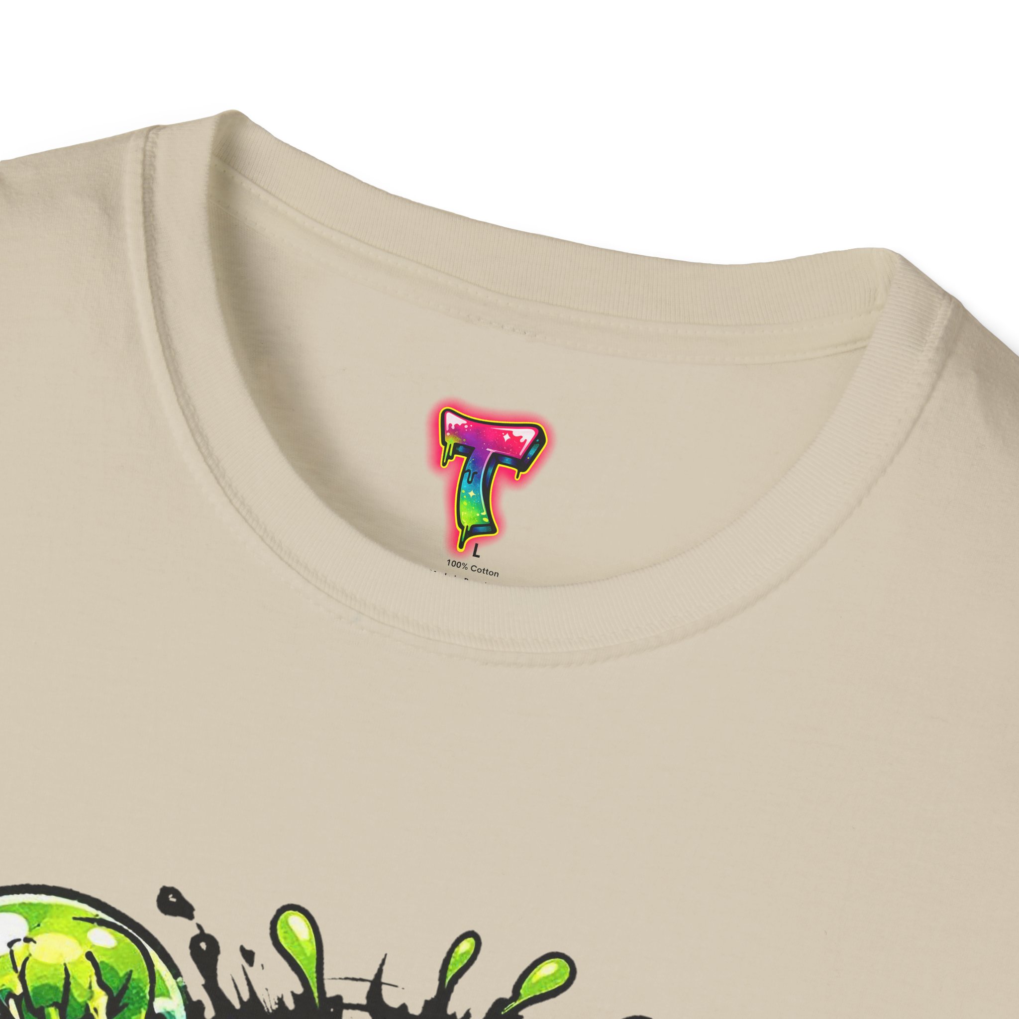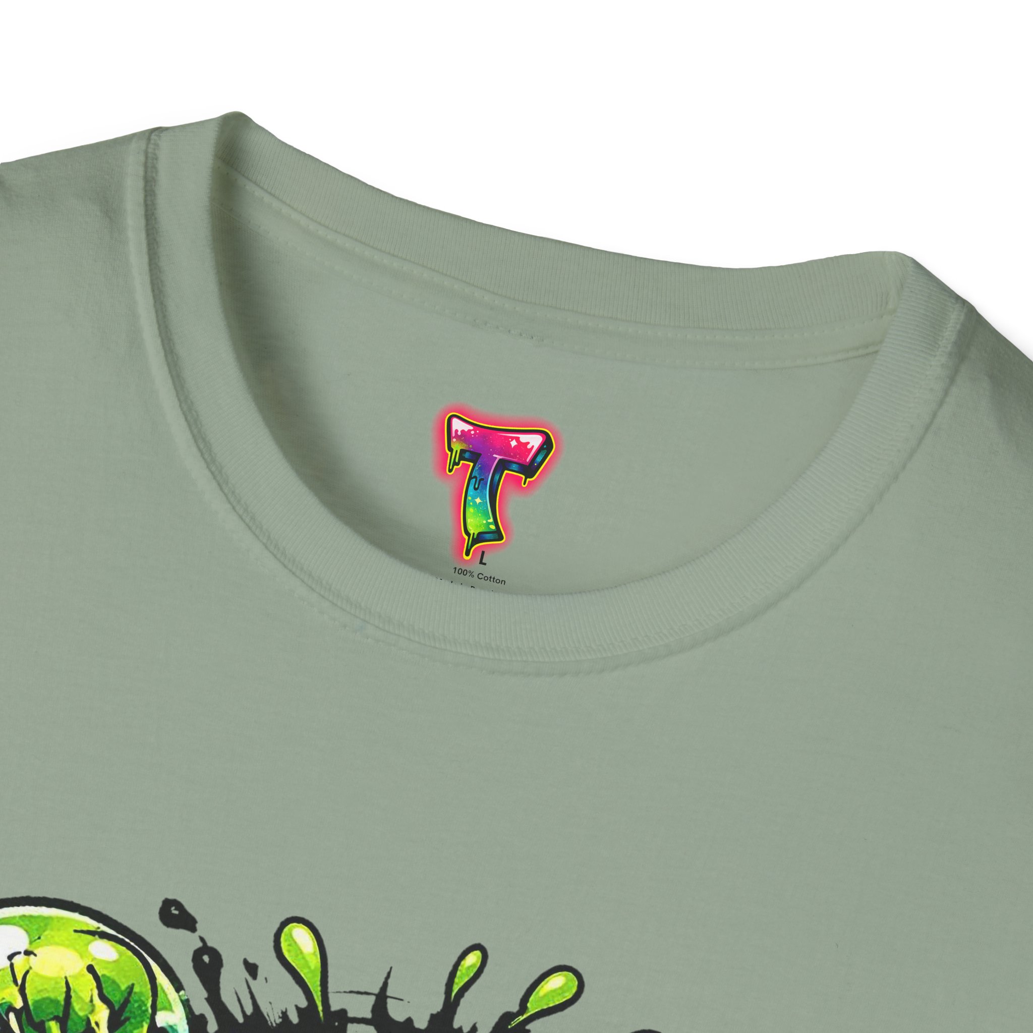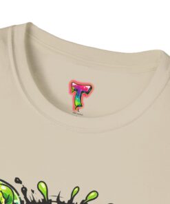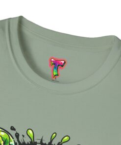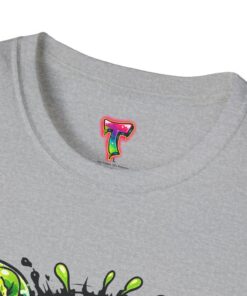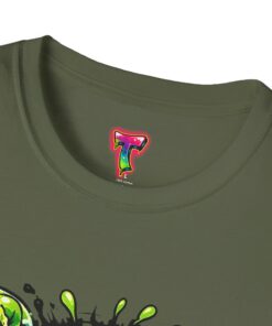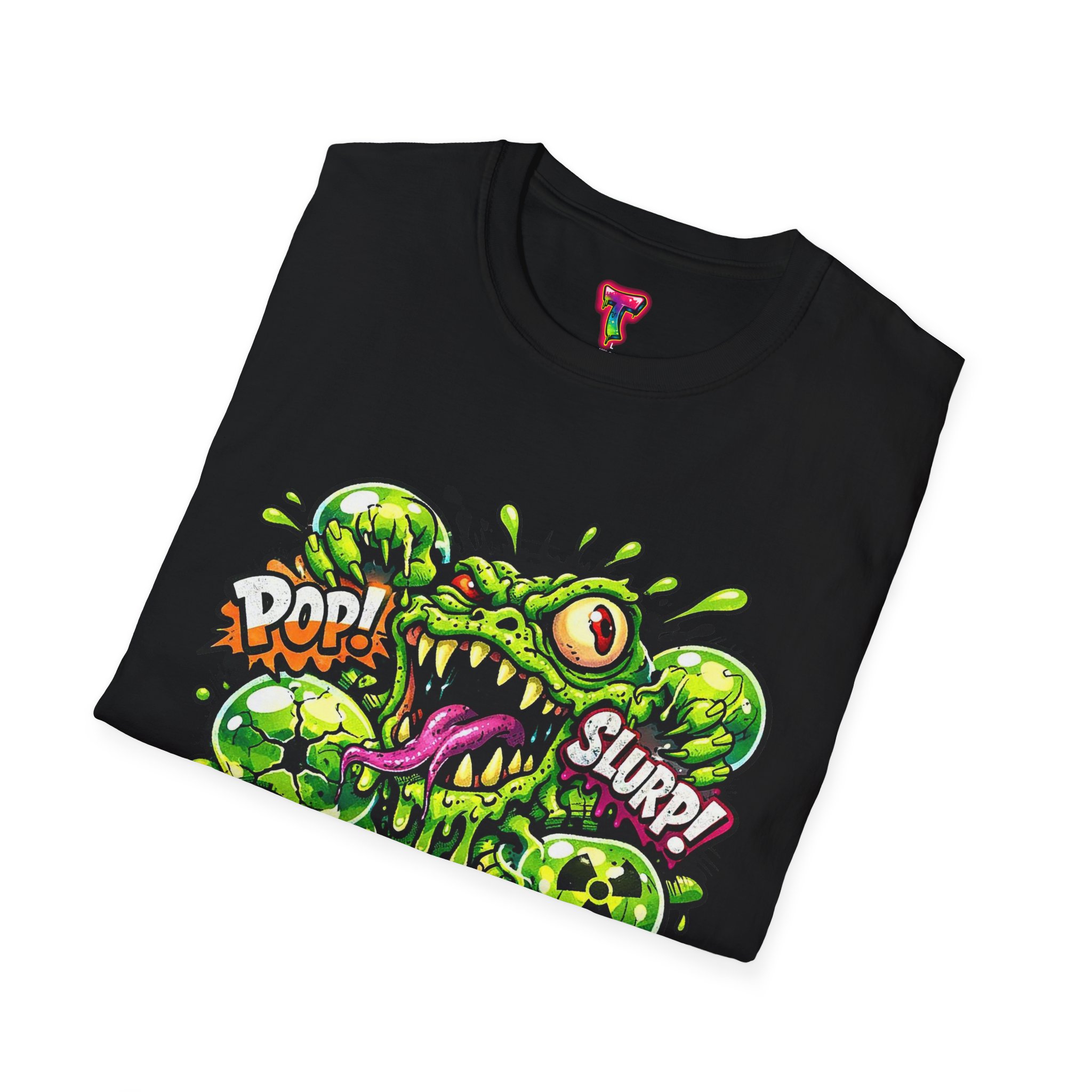 This lightweight cotton tee brings a loud, messy personality to everyday wear. A neon-green, goo-dripping creature bursts from the chest in comic-style inks — eyes bulging, tongue lolling, with playful sound effects like “POP!” and “SLURP!” surrounding it. Short sentences, bold lines, and high-contrast colors give it a skateboard-sticker energy: rowdy, irreverent, and impossible to ignore. Wear it to skateparks, late-night shows, or casual hangs when you want your shirt to do the talking. The soft ring-spun cotton feels breathable against the skin while the clean crew neckline keeps the silhouette simple so the artwork stays front and center.