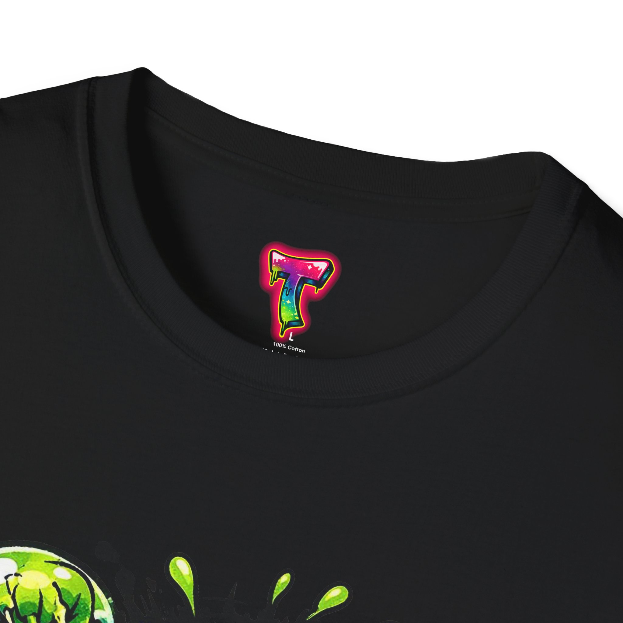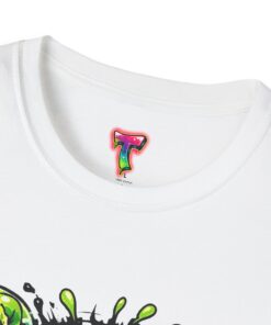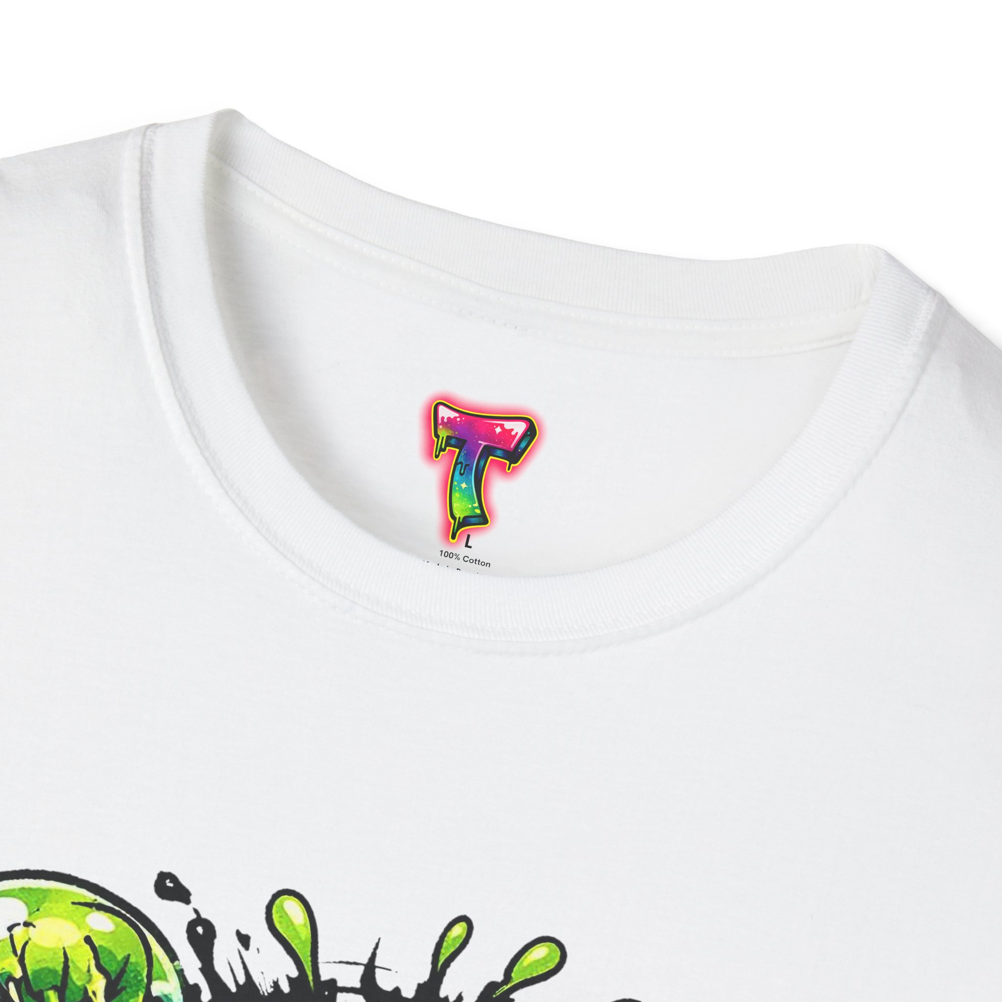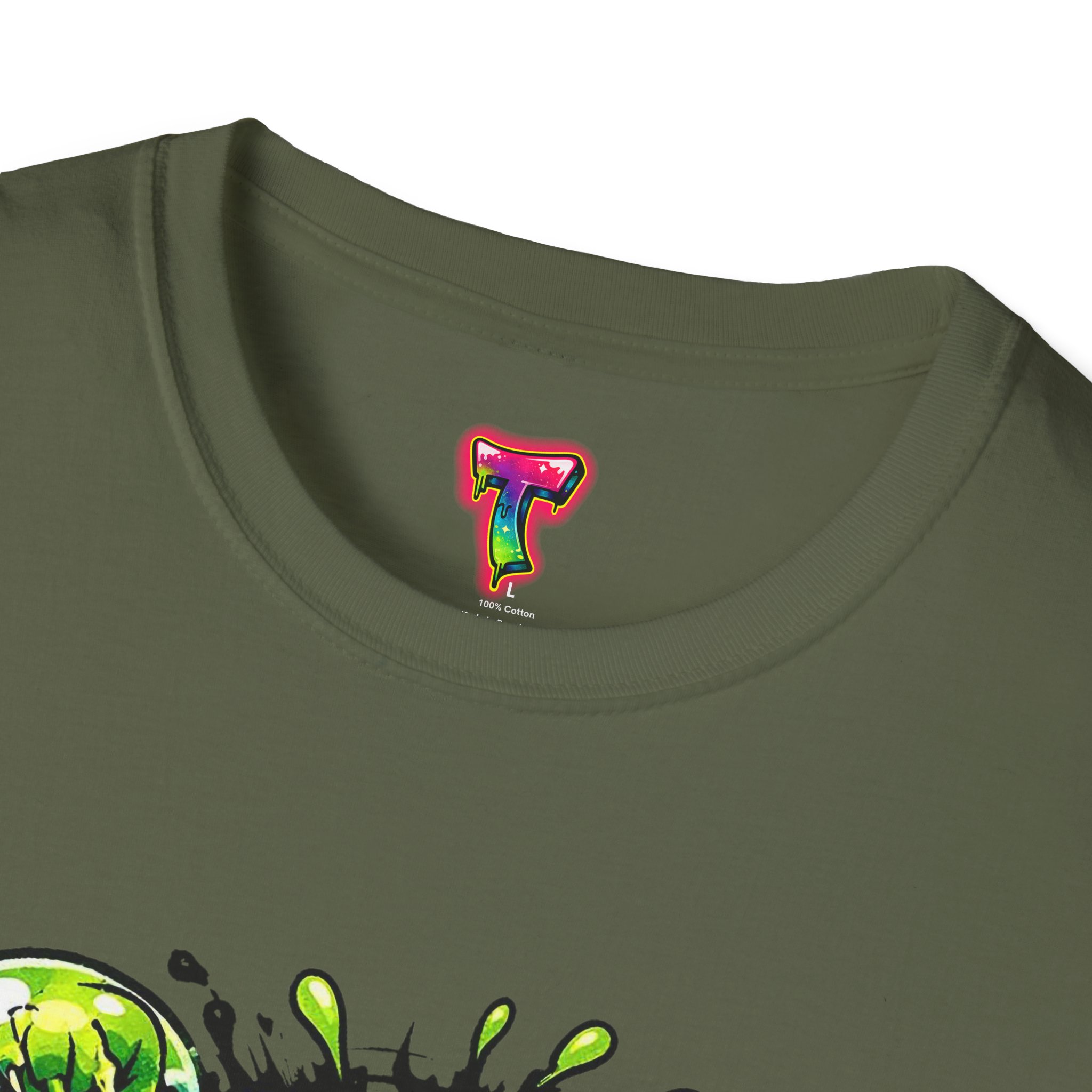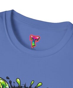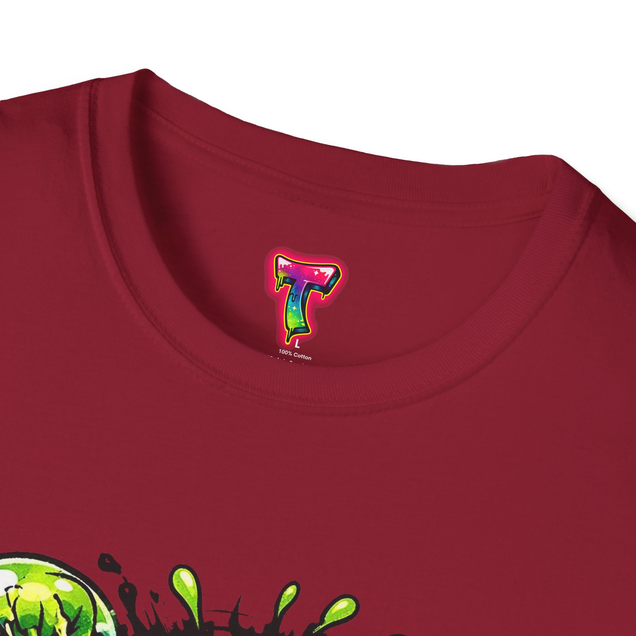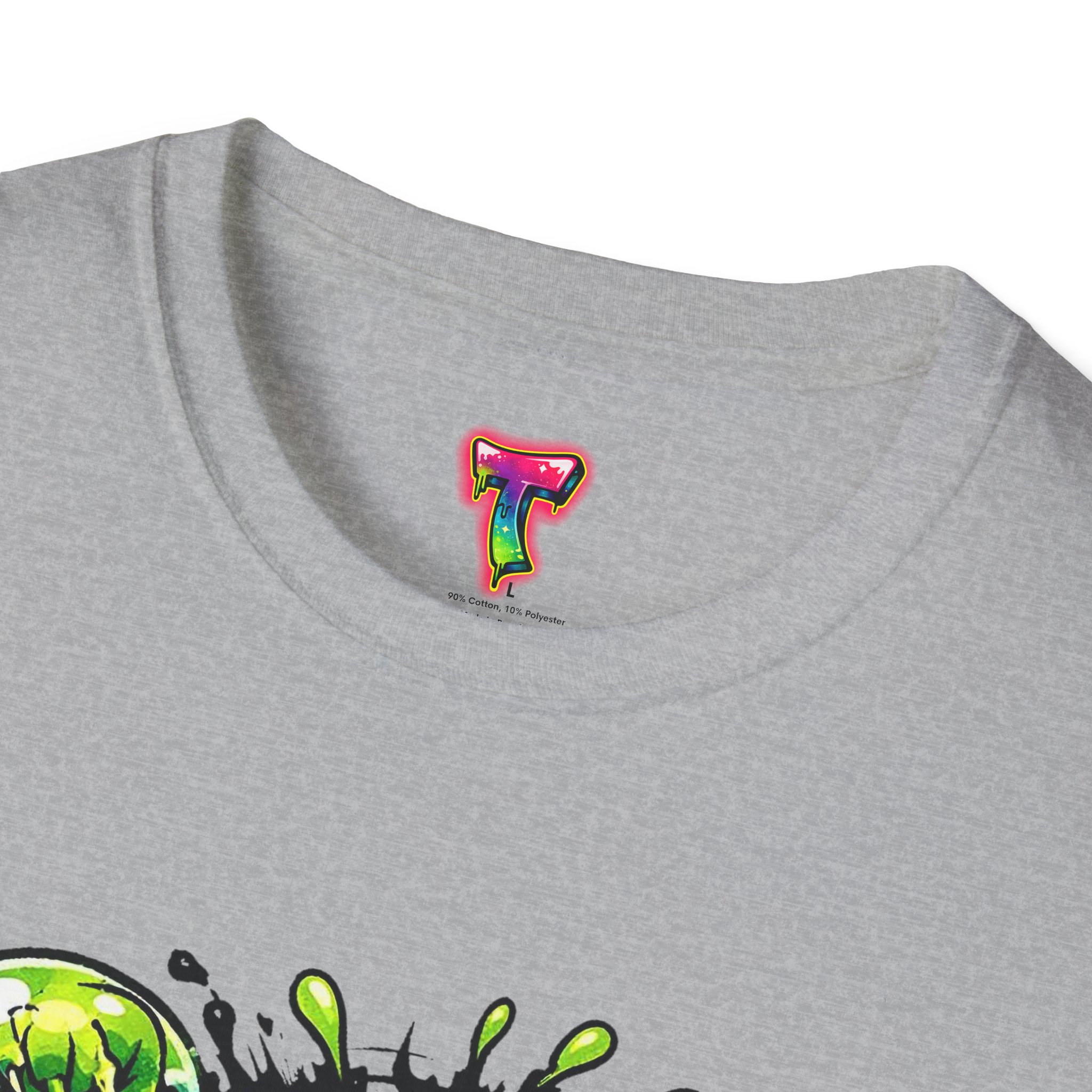 This lightweight cotton tee brings a loud, messy personality to everyday wear. A neon-green, goo-dripping creature bursts from the chest in comic-style inks — eyes bulging, tongue lolling, with playful sound effects like “POP!” and “SLURP!” surrounding it. Short sentences, bold lines, and high-contrast colors give it a skateboard-sticker energy: rowdy, irreverent, and impossible to ignore. Wear it to skateparks, late-night shows, or casual hangs when you want your shirt to do the talking. The soft ring-spun cotton feels breathable against the skin while the clean crew neckline keeps the silhouette simple so the artwork stays front and center.