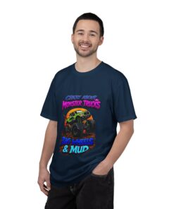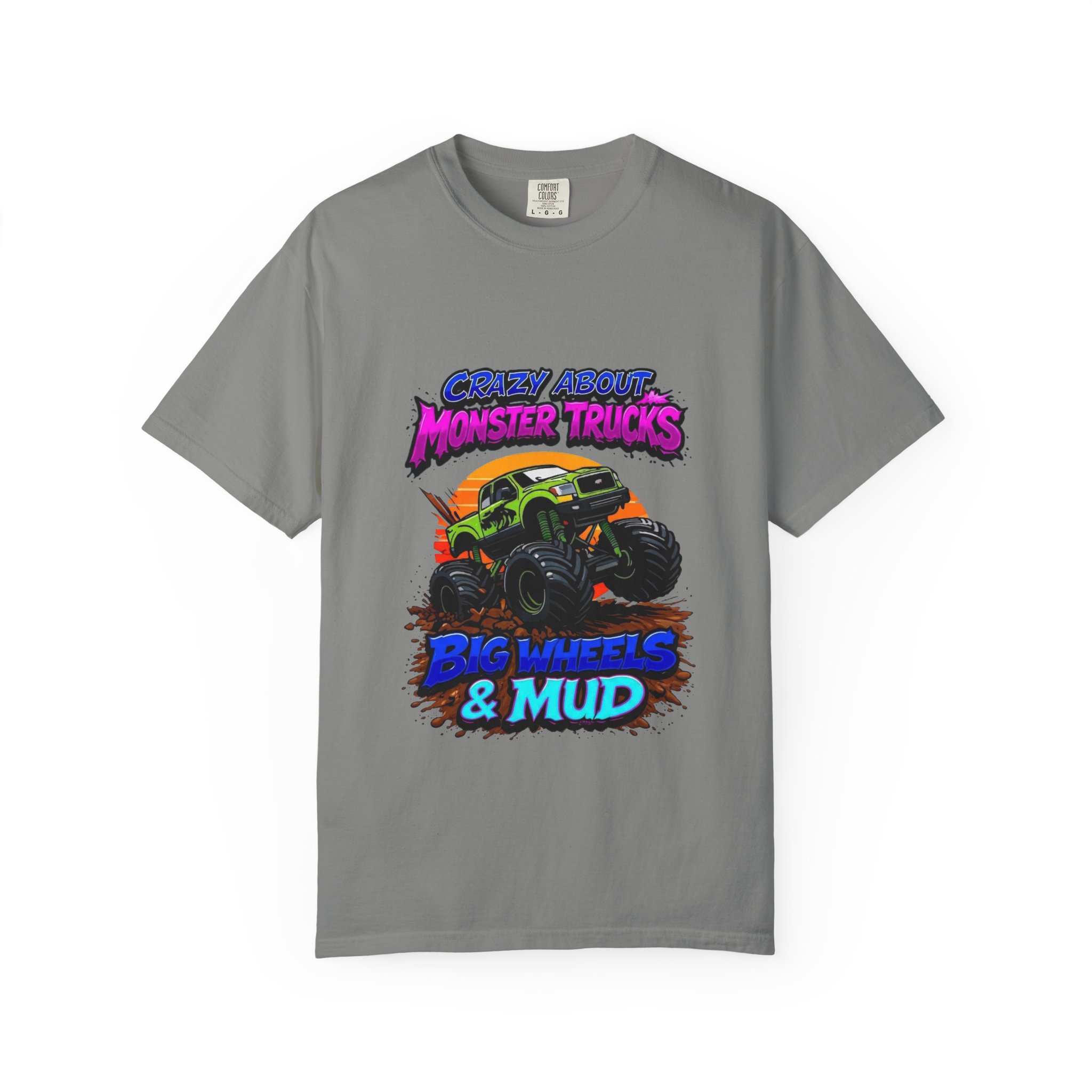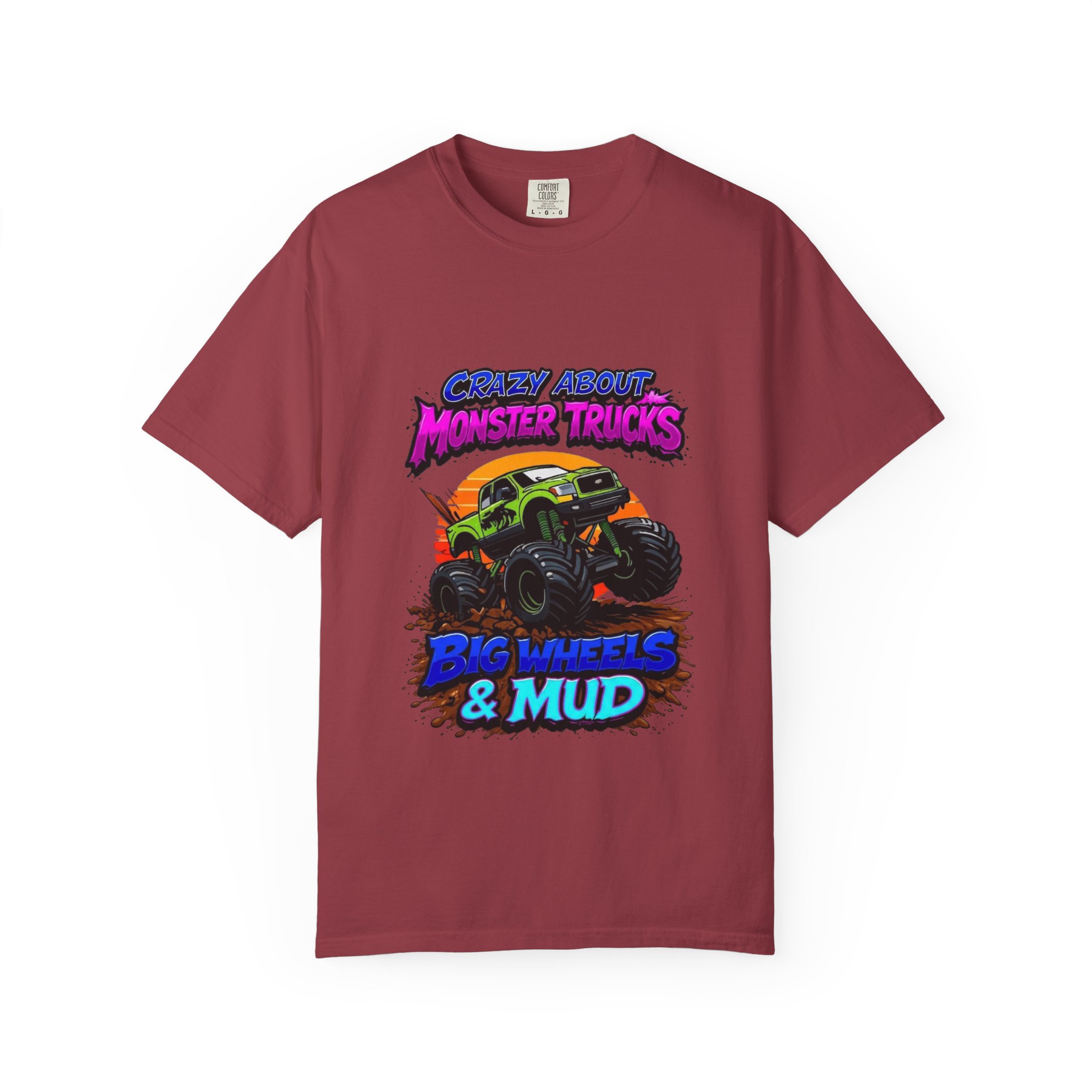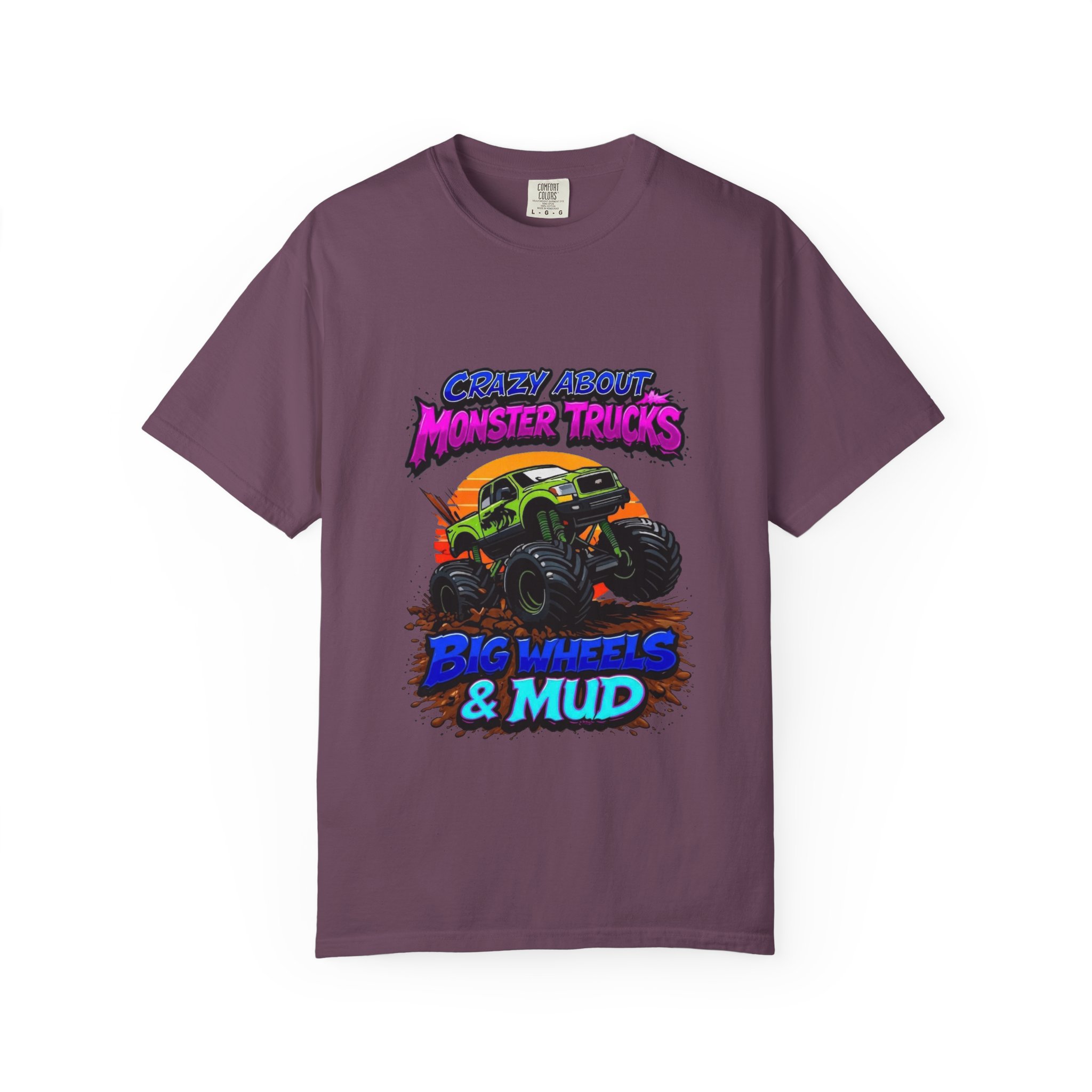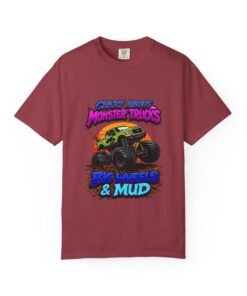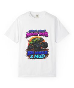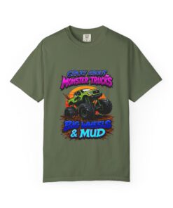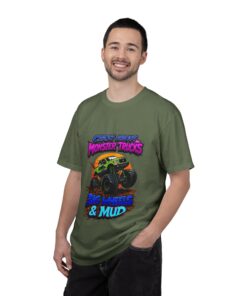 This relaxed-fit garment-dyed tee brings the roar of the track and the thrill of mud-slinging straight into everyday wear. The bold, neon-style graphic of a monster truck launching through mud reads like a snapshot from a weekend at the pits — bright colors, chunky tires, and splattered earth that still feels warm. It’s built for people who live for throttle, tailgates, and cheering at the edge of the arena: it layers easily under a flannel for early mornings, stands out at meetups, and wipes clean of road grime without losing its soft, broken-in feel. The heavyweight cotton holds the print with character, while the garment dye gives that lived-in softness and subtle, uneven color that tells a story with every wash. Wear it to a local truck show, on a muddy trail day, or when you want to bring that high-octane energy to a casual hangout.