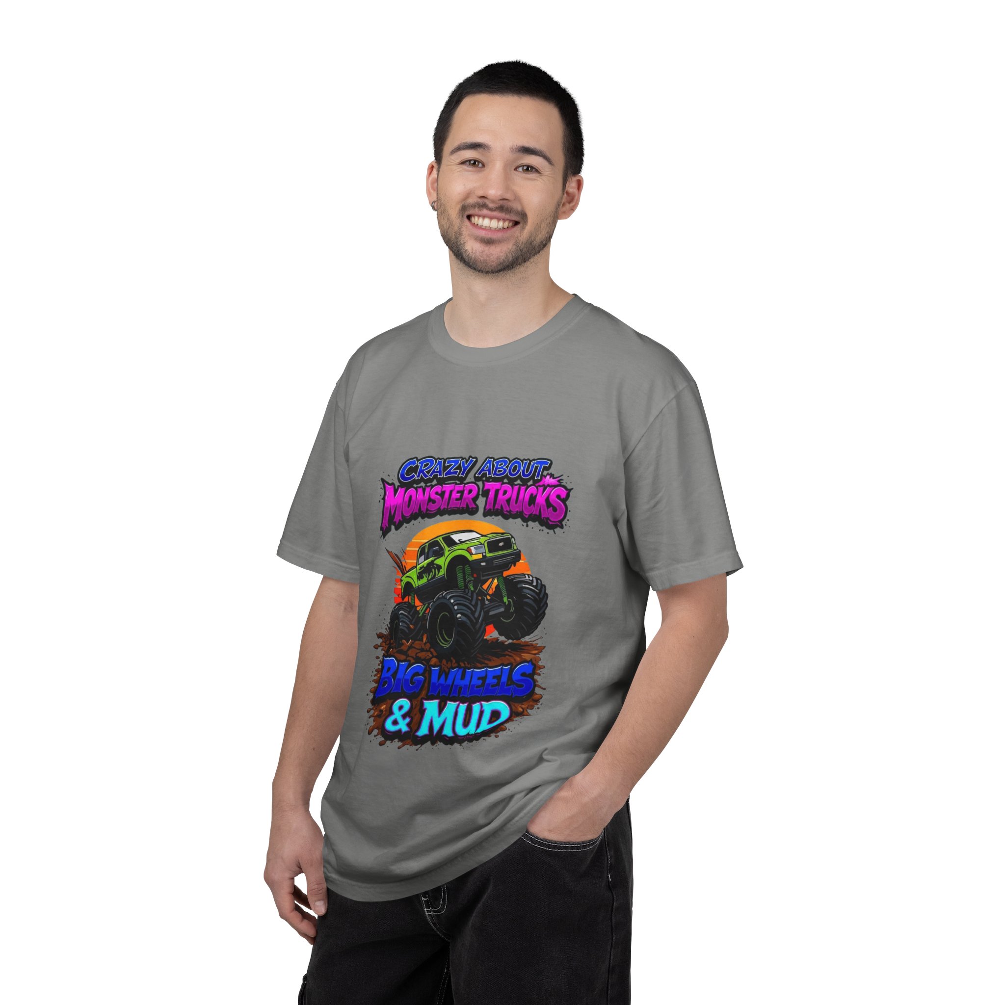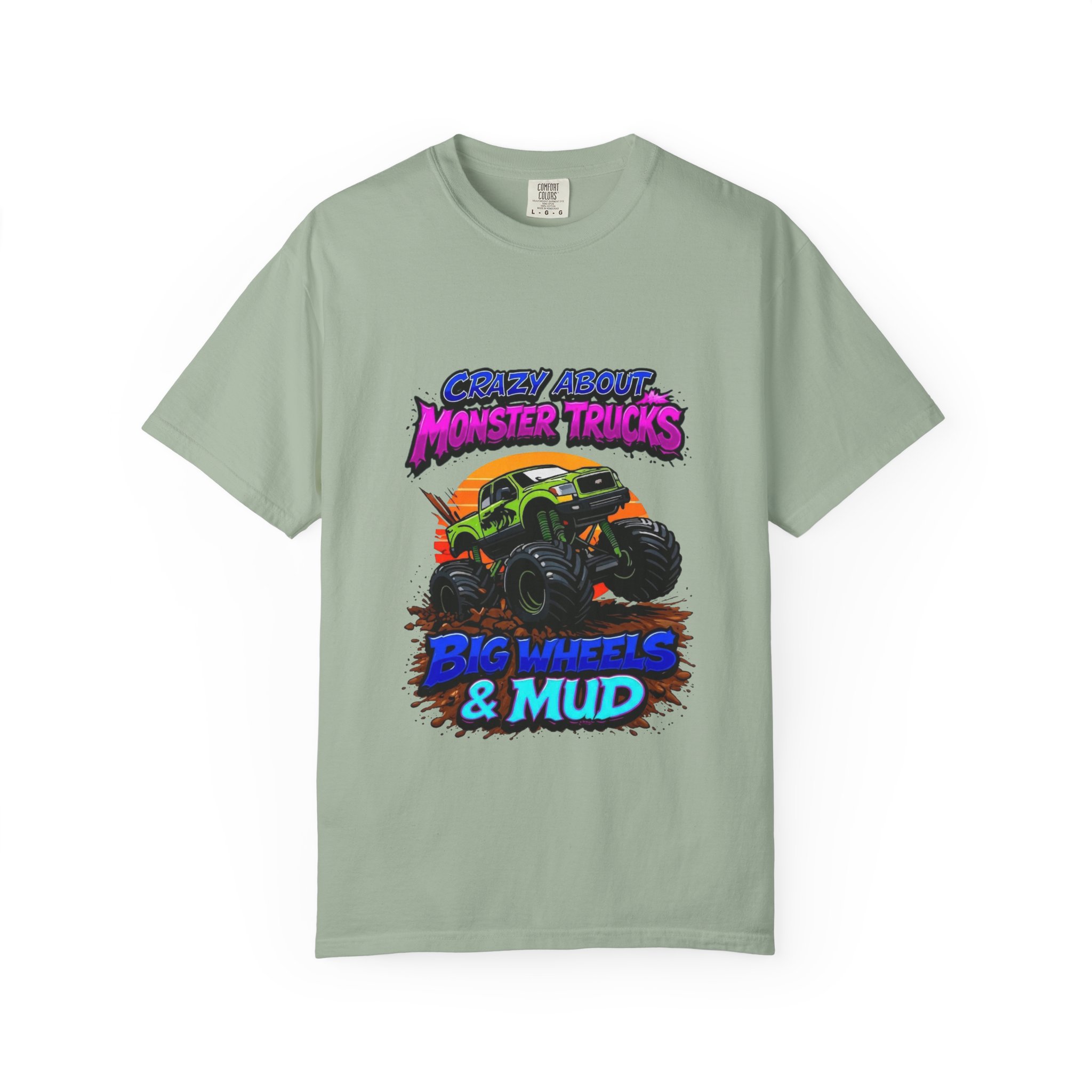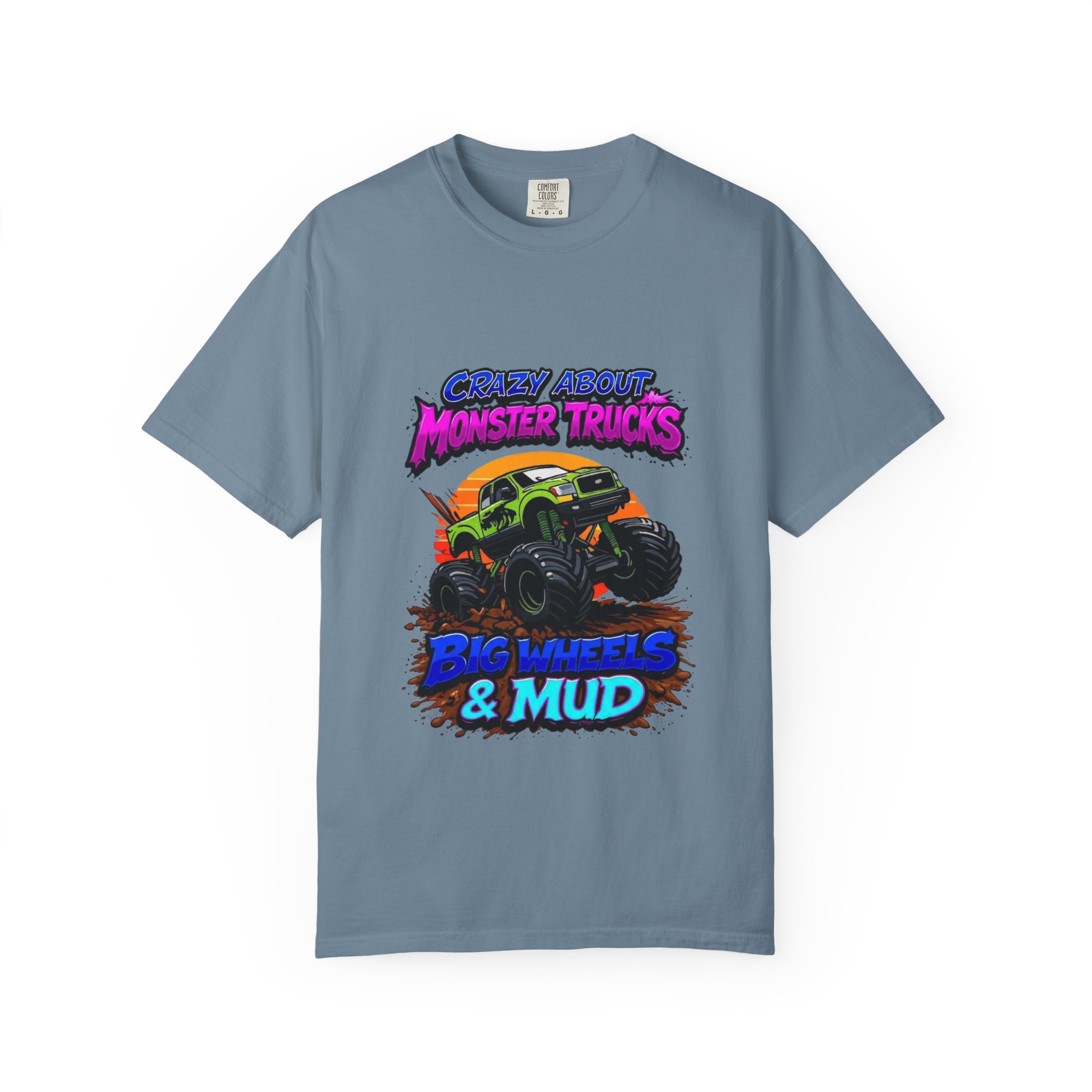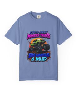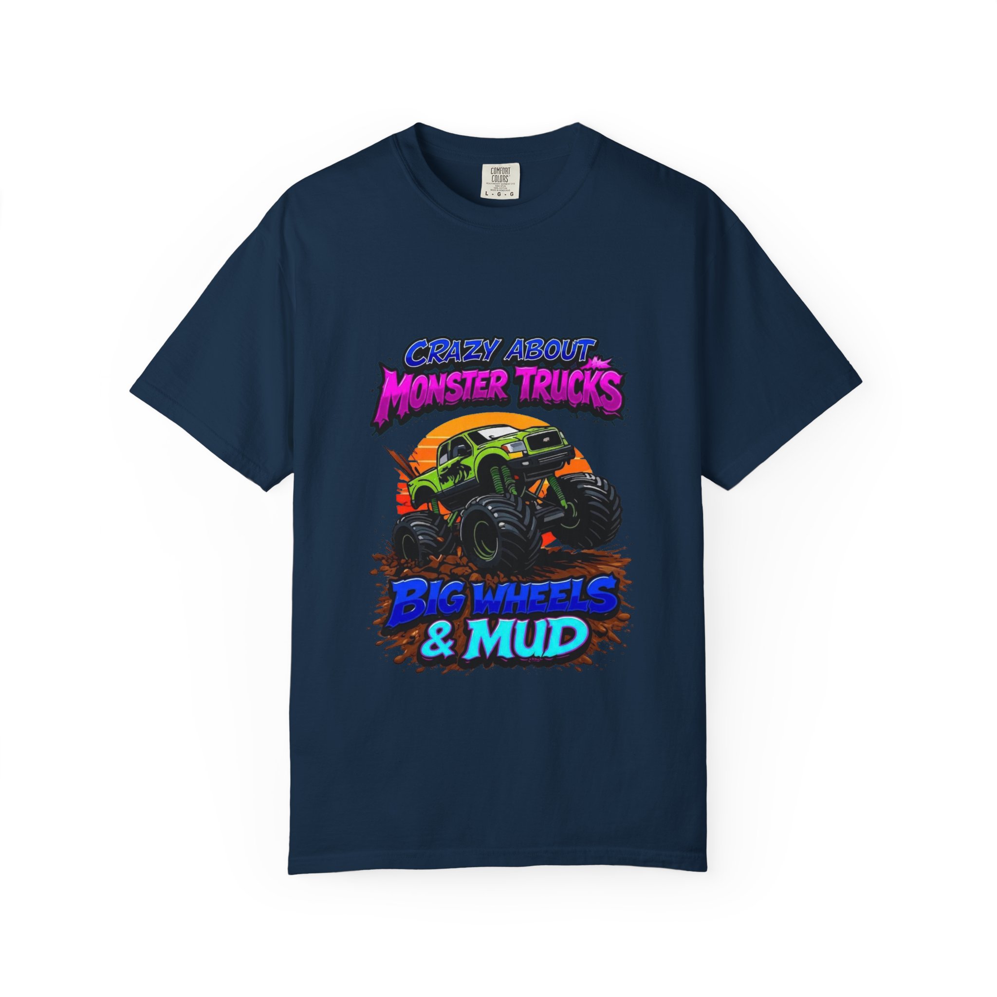 This relaxed-fit garment-dyed tee brings the roar of the track and the thrill of mud-slinging straight into everyday wear. The bold, neon-style graphic of a monster truck launching through mud reads like a snapshot from a weekend at the pits — bright colors, chunky tires, and splattered earth that still feels warm. It’s built for people who live for throttle, tailgates, and cheering at the edge of the arena: it layers easily under a flannel for early mornings, stands out at meetups, and wipes clean of road grime without losing its soft, broken-in feel. The heavyweight cotton holds the print with character, while the garment dye gives that lived-in softness and subtle, uneven color that tells a story with every wash. Wear it to a local truck show, on a muddy trail day, or when you want to bring that high-octane energy to a casual hangout.