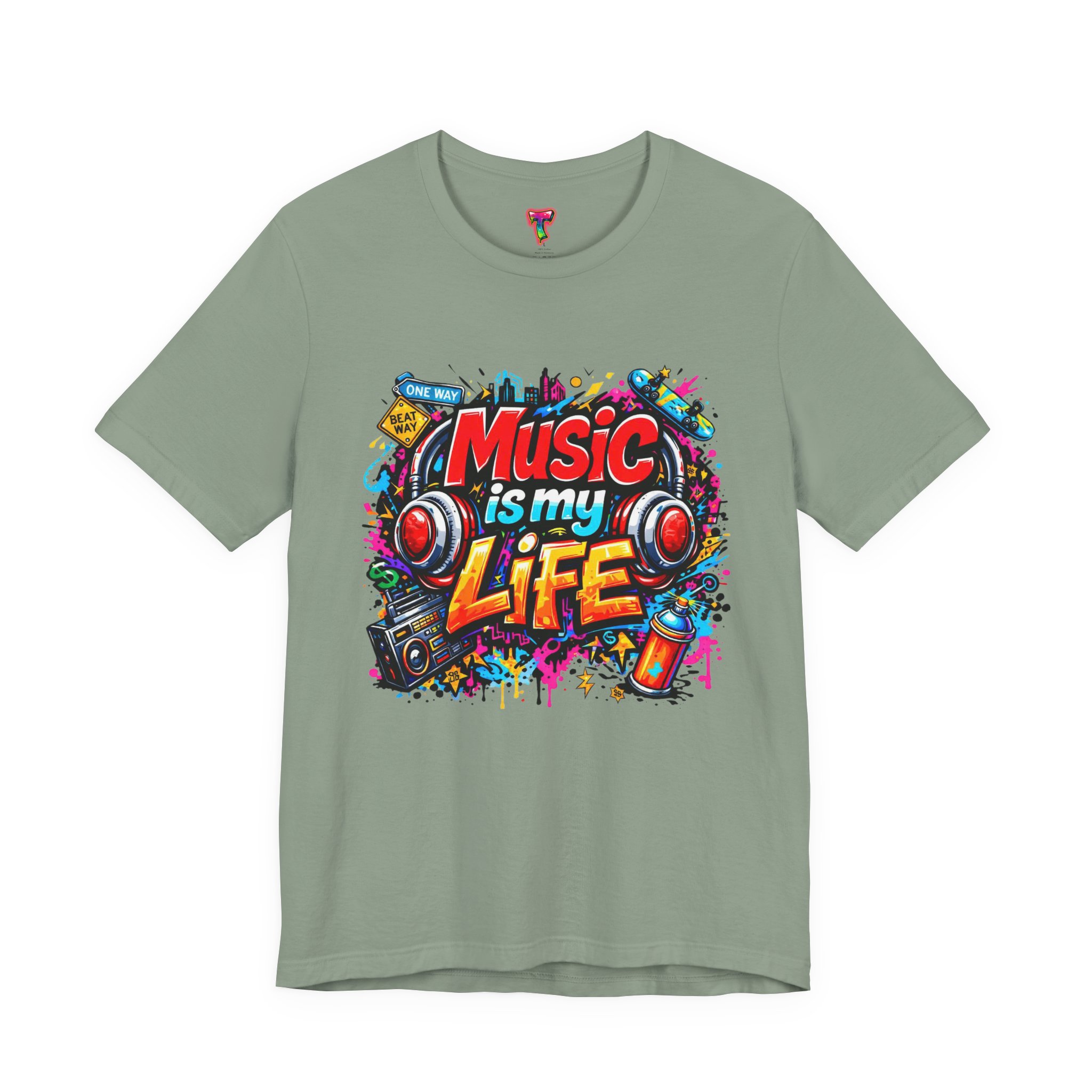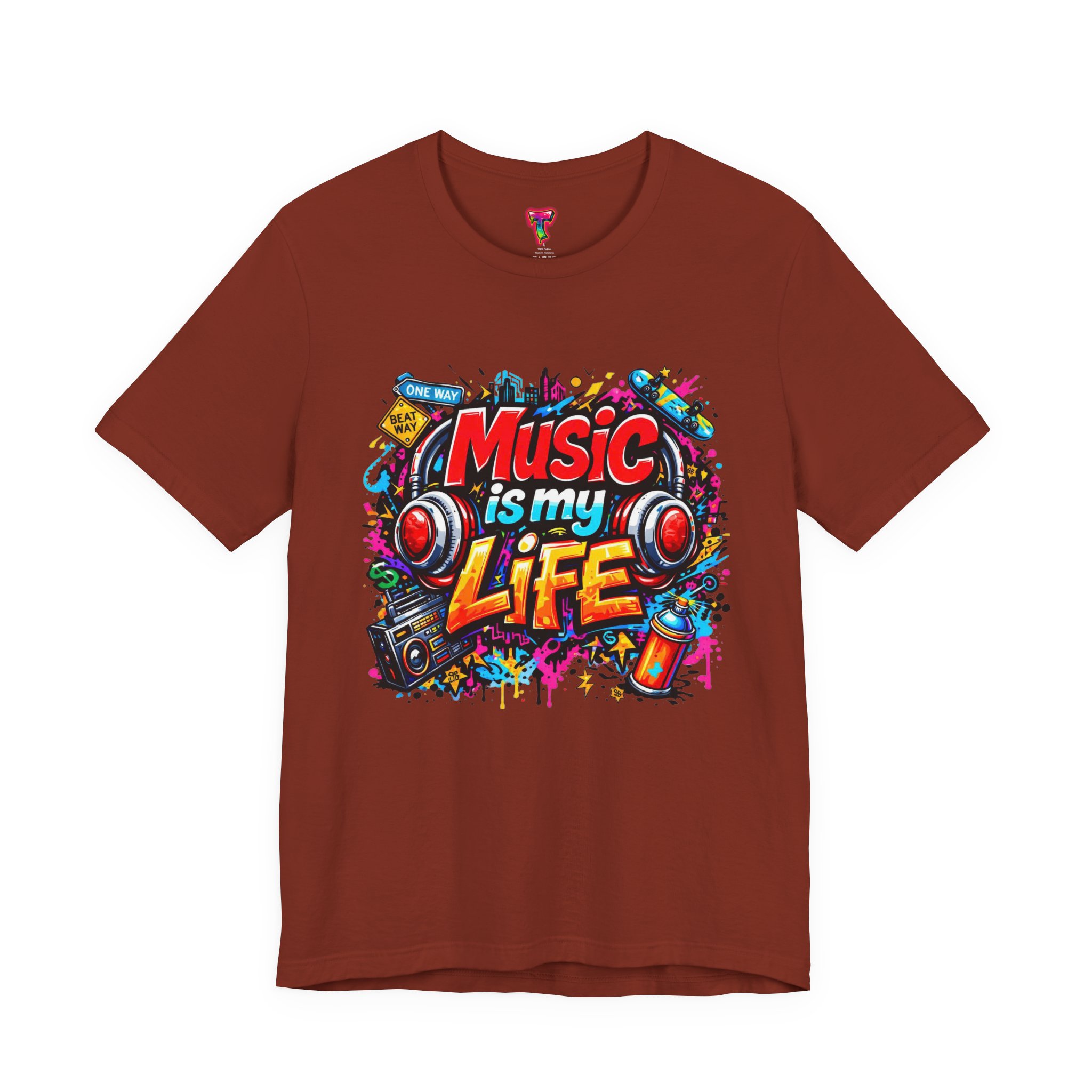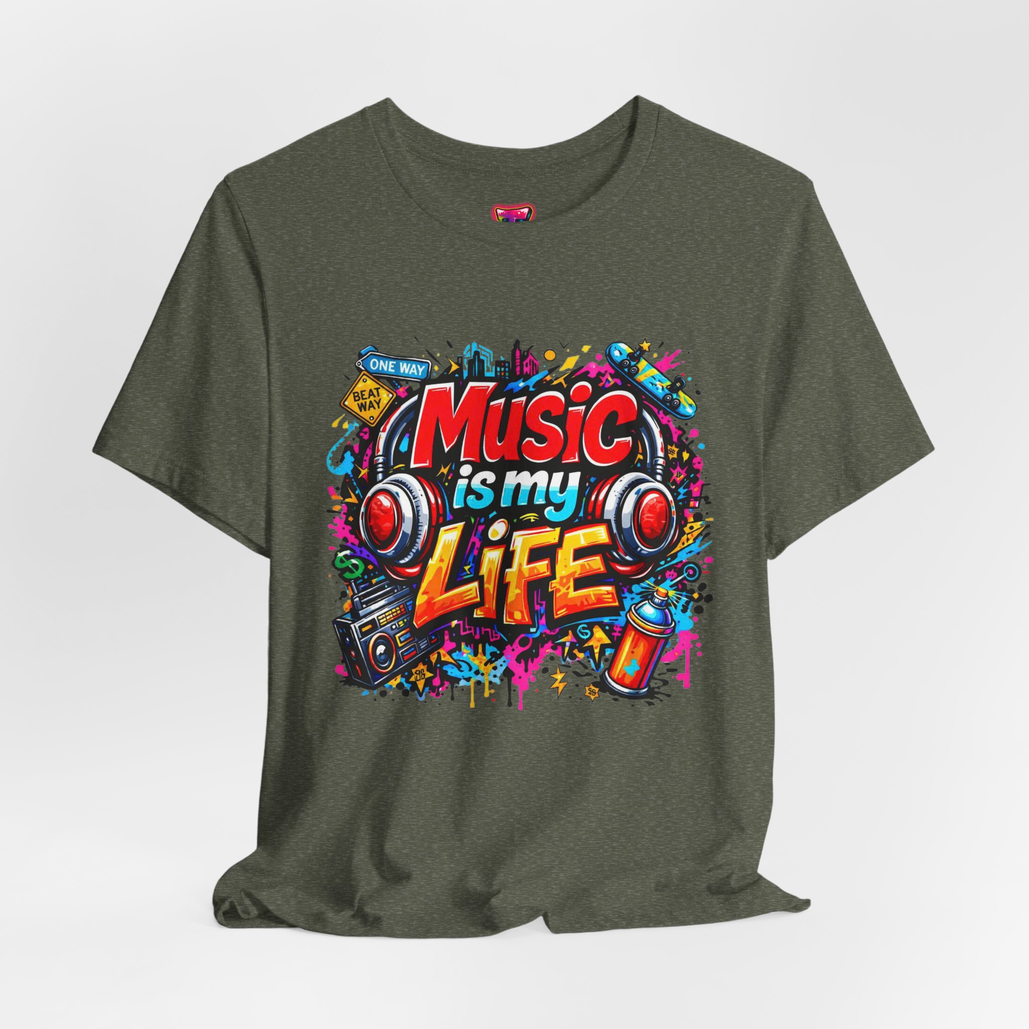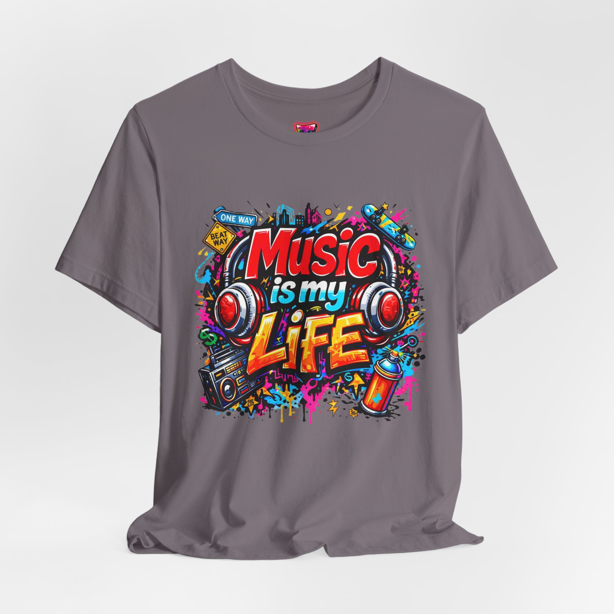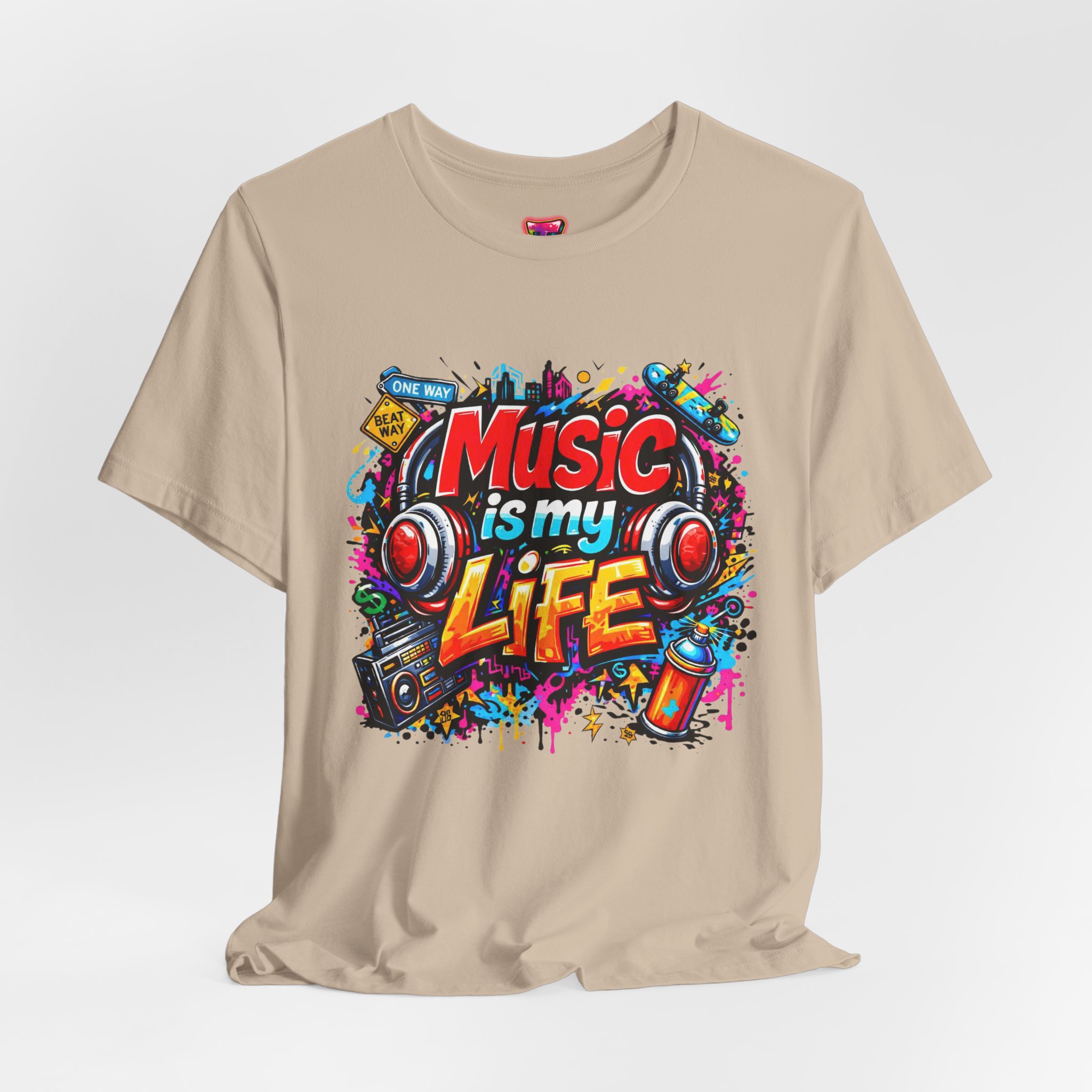 Wear the beat. This lightweight jersey tee carries a bold, graffiti-style “Music is my Life” illustration that pops with vibrant colors, headphones, speakers and spray-paint accents. It sits crisp on the chest and reads like a declaration for anyone who lives by rhythm — from late-night studio sessions to rooftop jam nights. The retail fit and crew neckline keep the look clean and easy to layer under a jacket or worn solo at a concert. Thoughtful details like side seams, ribbed collar and shoulder tape give structure so the tee holds its shape through repeats and washes. Built from soft Airlume combed and ring-spun cotton with a tear-away label, it’s comfortable against the skin while meeting REACH standards and ethical manufacturing practices.