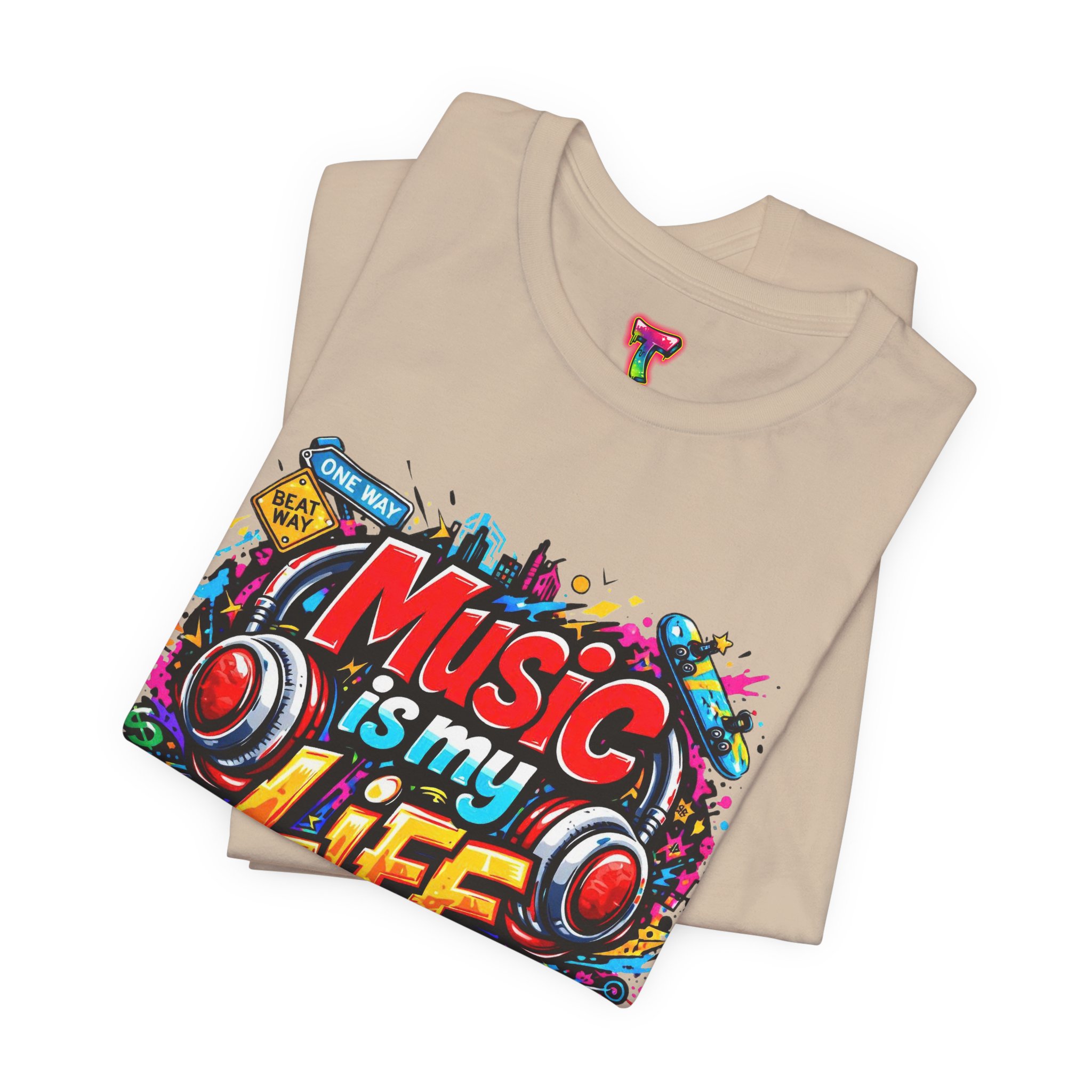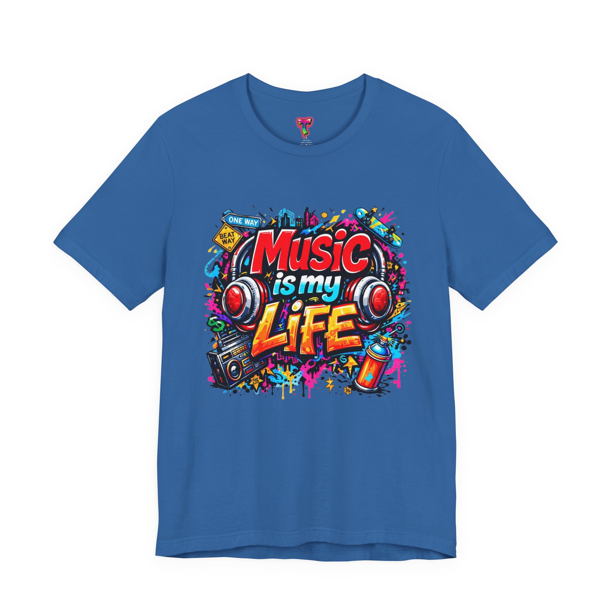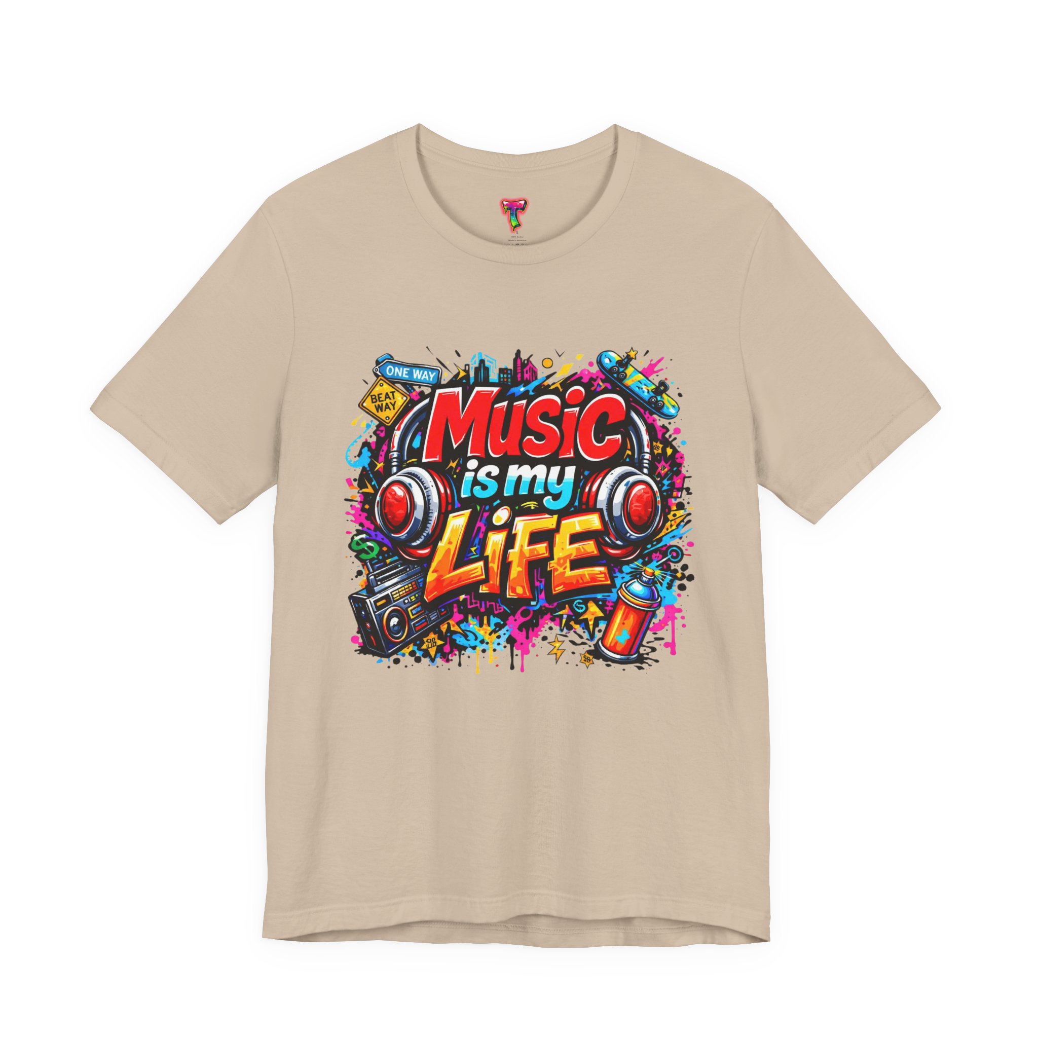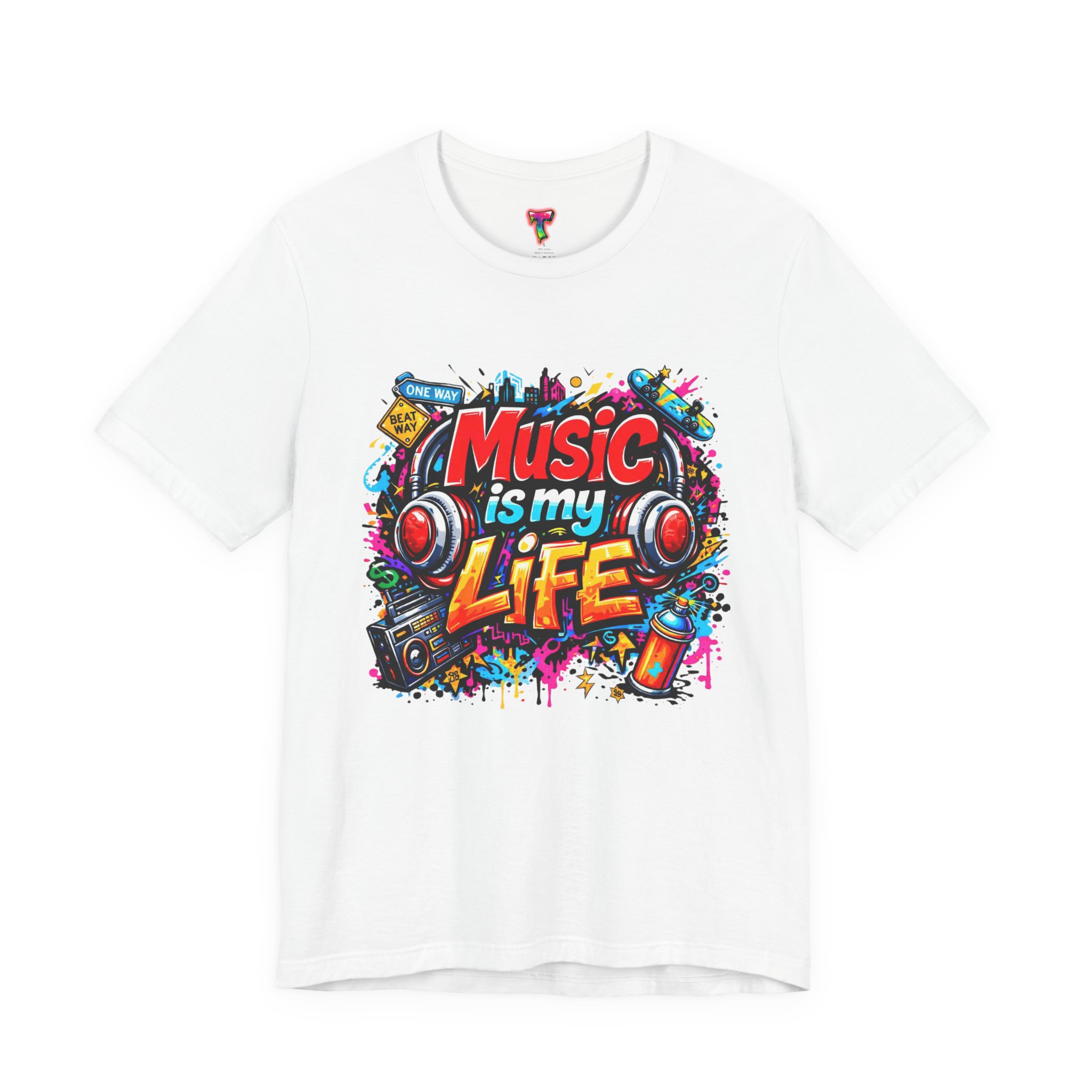 Wear the beat. This lightweight jersey tee carries a bold, graffiti-style “Music is my Life” illustration that pops with vibrant colors, headphones, speakers and spray-paint accents. It sits crisp on the chest and reads like a declaration for anyone who lives by rhythm — from late-night studio sessions to rooftop jam nights. The retail fit and crew neckline keep the look clean and easy to layer under a jacket or worn solo at a concert. Thoughtful details like side seams, ribbed collar and shoulder tape give structure so the tee holds its shape through repeats and washes. Built from soft Airlume combed and ring-spun cotton with a tear-away label, it’s comfortable against the skin while meeting REACH standards and ethical manufacturing practices.