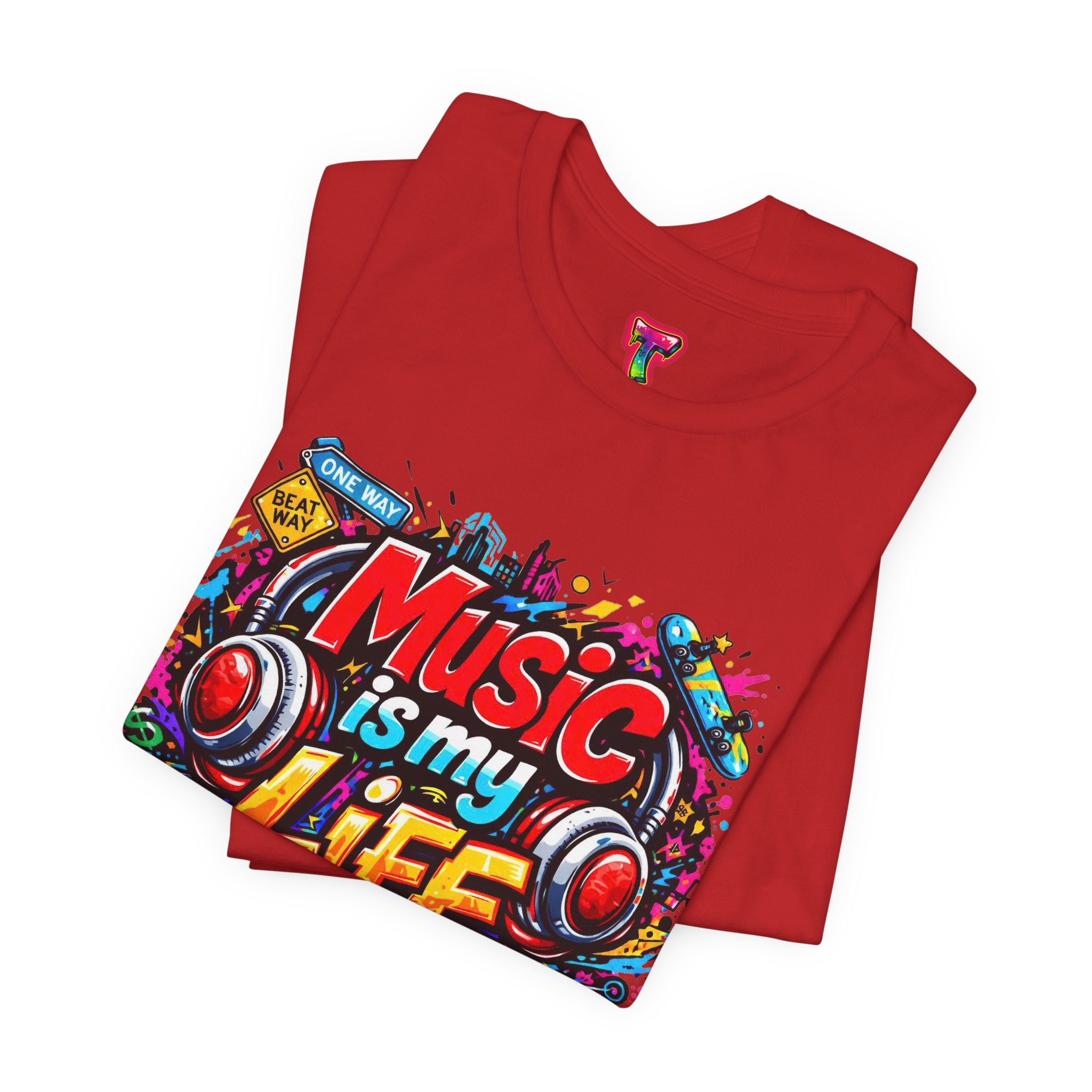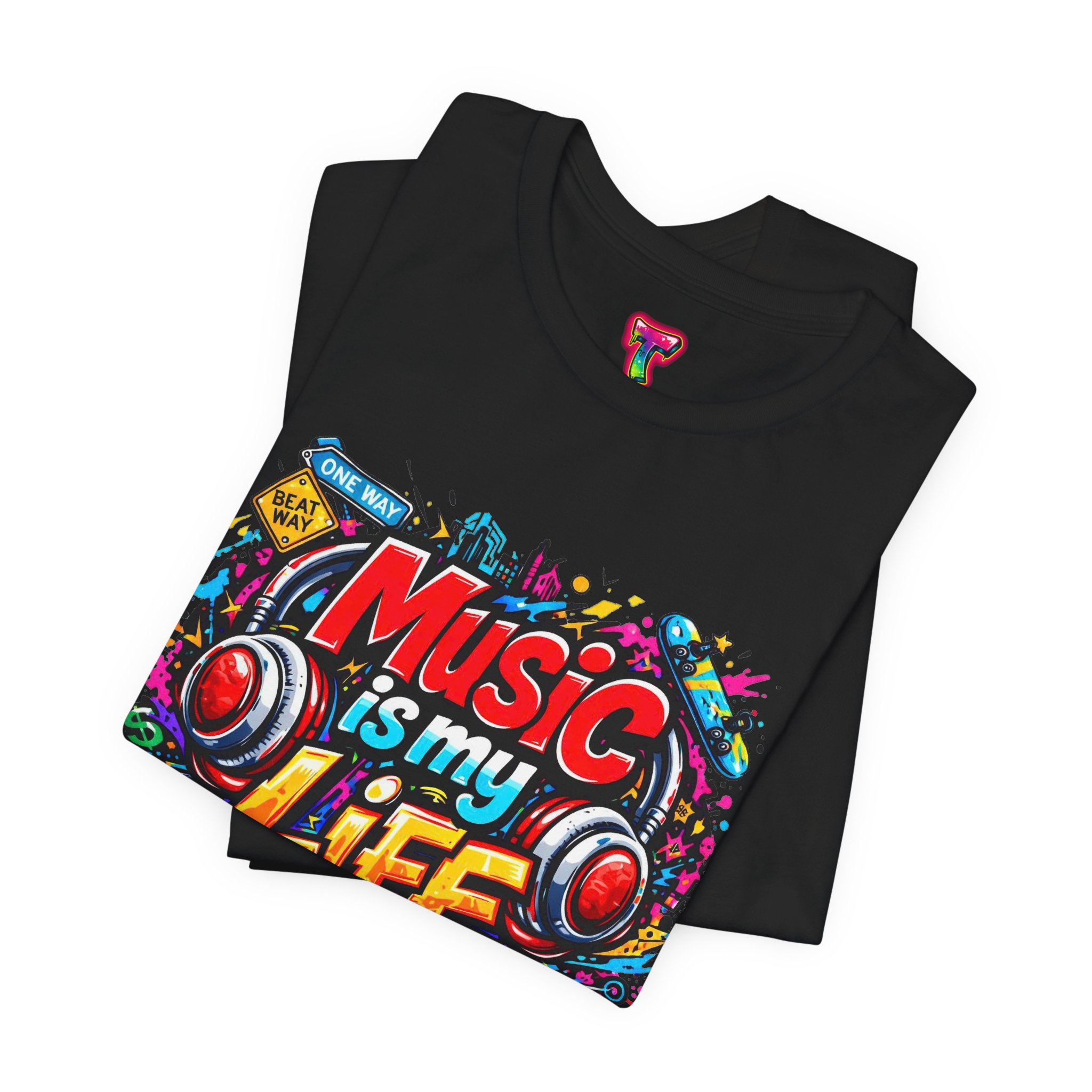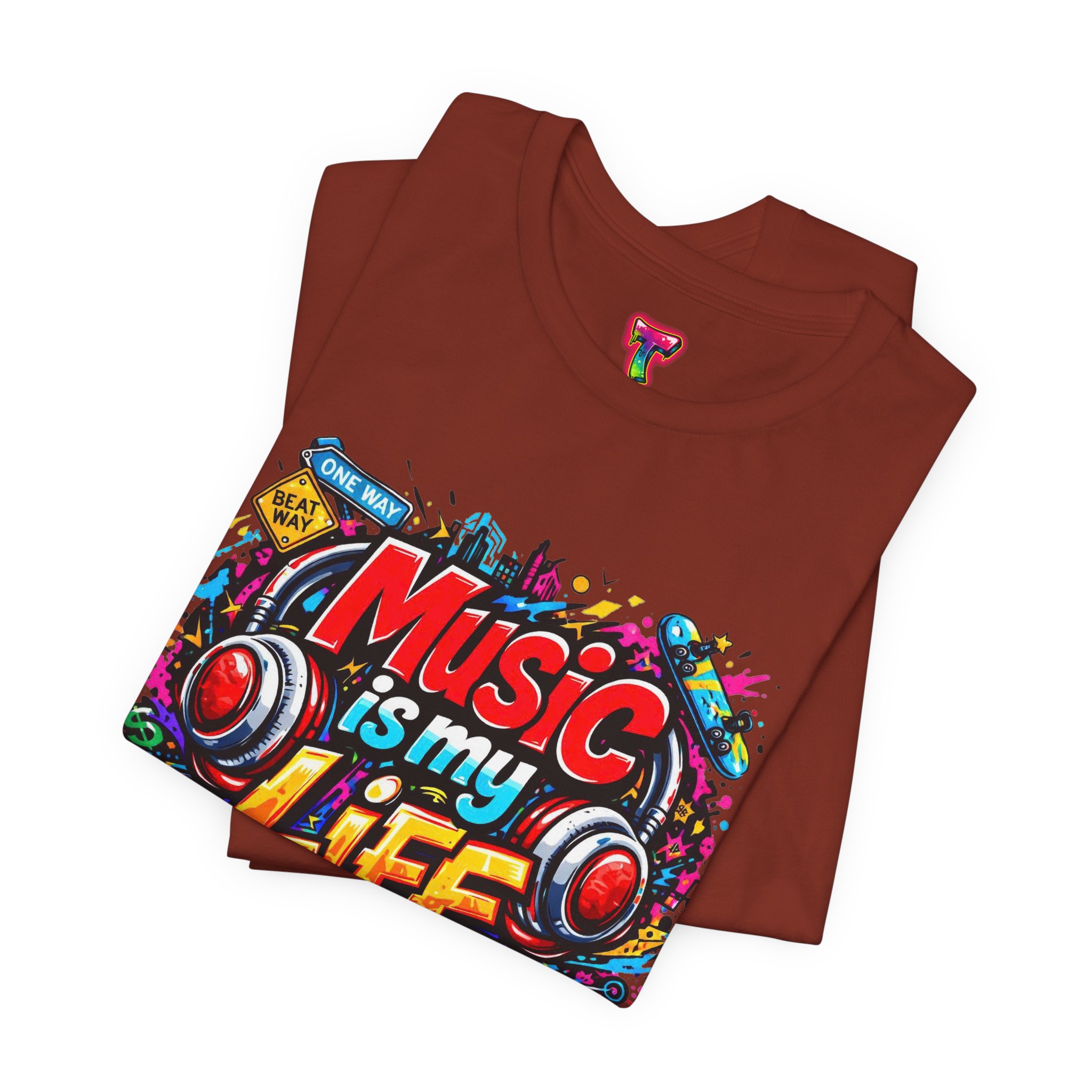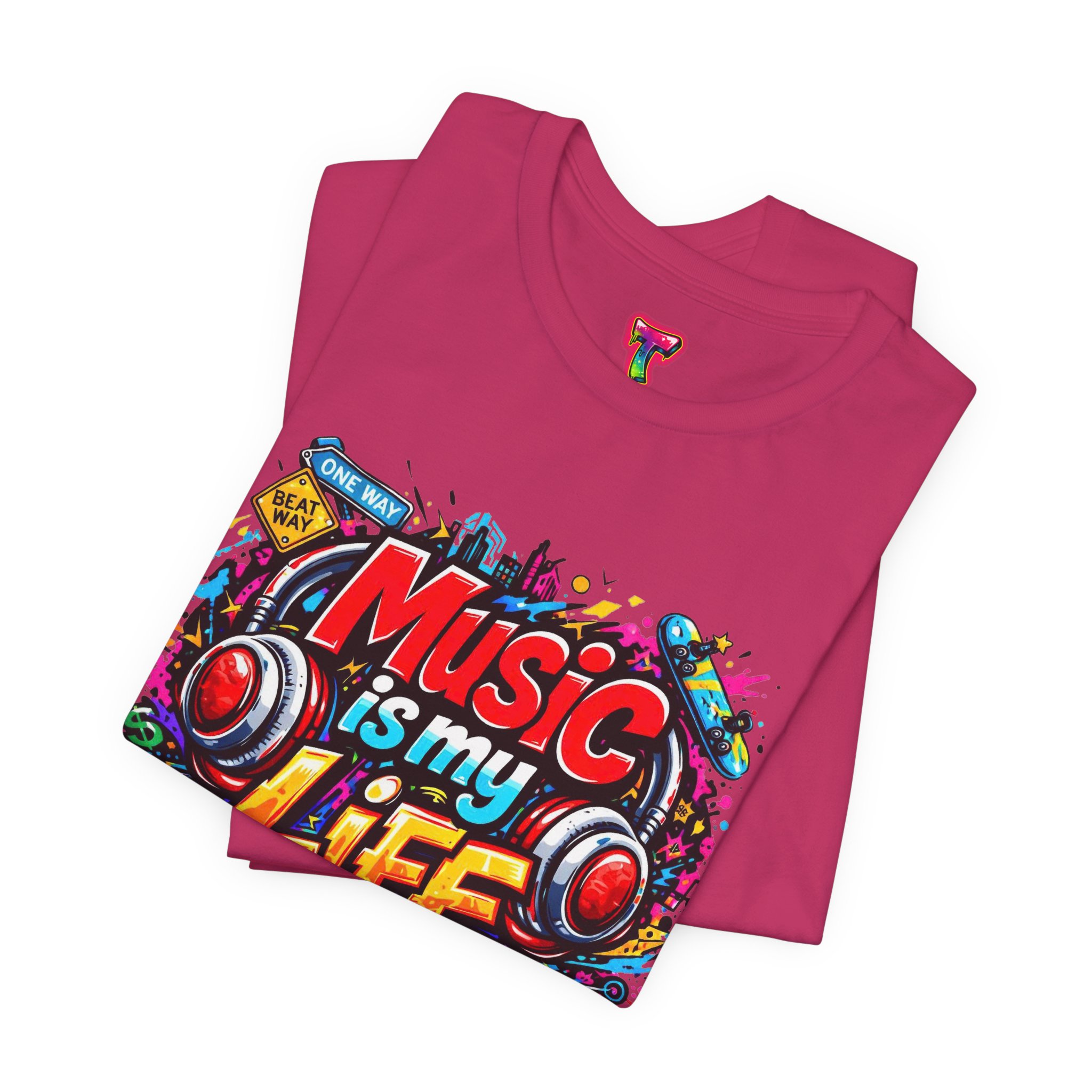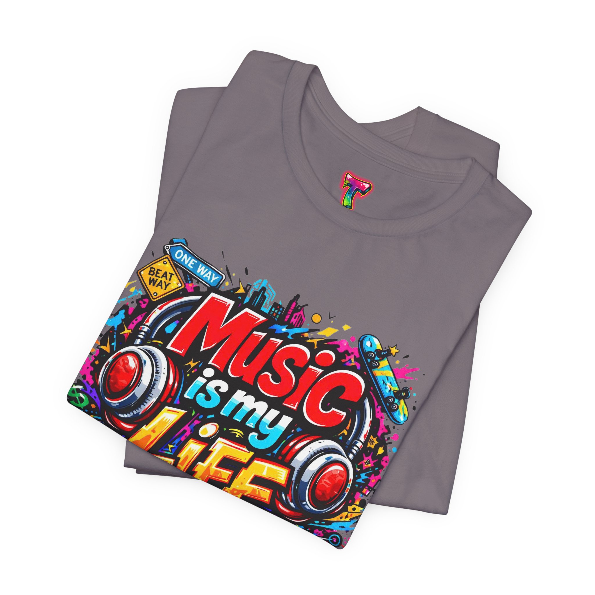 Wear the beat. This lightweight jersey tee carries a bold, graffiti-style “Music is my Life” illustration that pops with vibrant colors, headphones, speakers and spray-paint accents. It sits crisp on the chest and reads like a declaration for anyone who lives by rhythm — from late-night studio sessions to rooftop jam nights. The retail fit and crew neckline keep the look clean and easy to layer under a jacket or worn solo at a concert. Thoughtful details like side seams, ribbed collar and shoulder tape give structure so the tee holds its shape through repeats and washes. Built from soft Airlume combed and ring-spun cotton with a tear-away label, it’s comfortable against the skin while meeting REACH standards and ethical manufacturing practices.