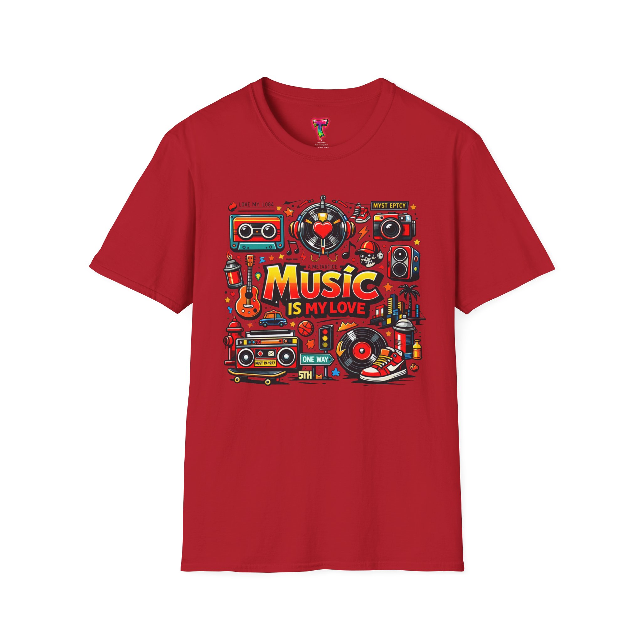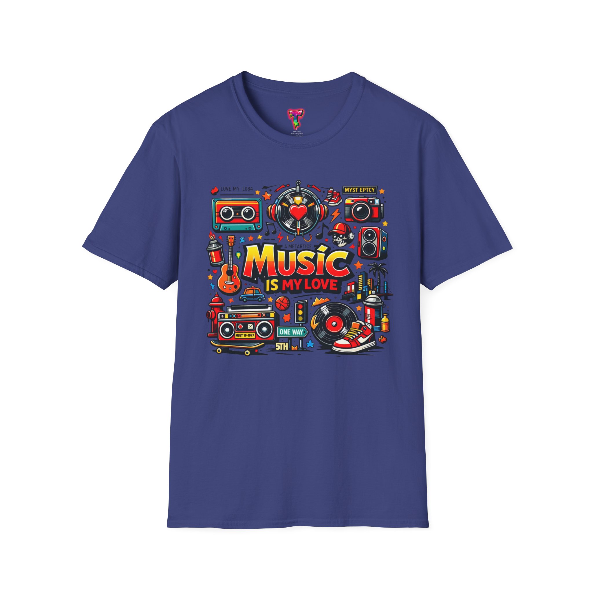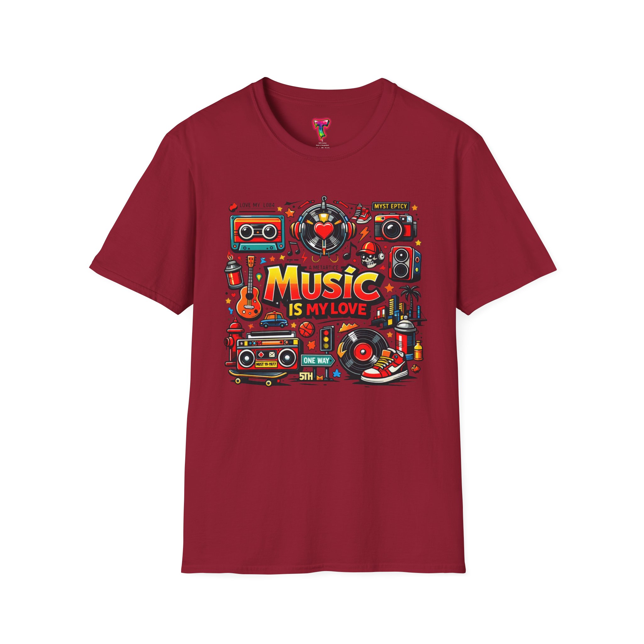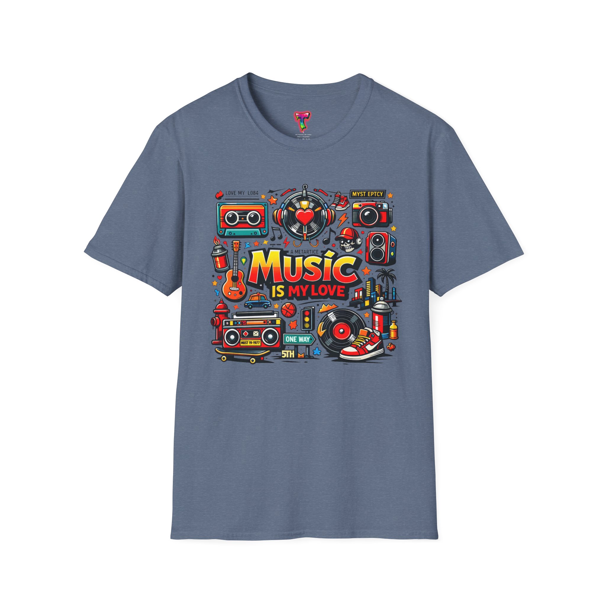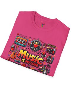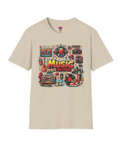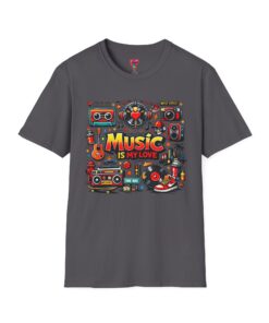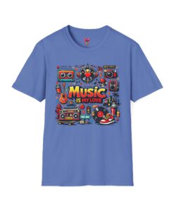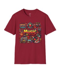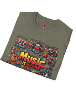 This lightweight cotton tee carries a vibrant celebration of sound — a colorful collage of retro speakers, vinyl, guitars and cassette art framing the bold statement: “Music is my love.” It lands with a nostalgic, joyful energy that slips easily into everyday life: rehearsals, record-store dives, late-night jam sessions, or city streets where playlists become personal soundtracks. The clean crew neck and classic fit keep the design front-and-center while the soft ring-spun fabric drapes comfortably for all-day wear. It’s for people who wear their playlist on their chest and want a shirt that feels lived-in from the first put-on. The printed inner label and durable print methods mean the graphic keeps its pop through repeat spins and washes.