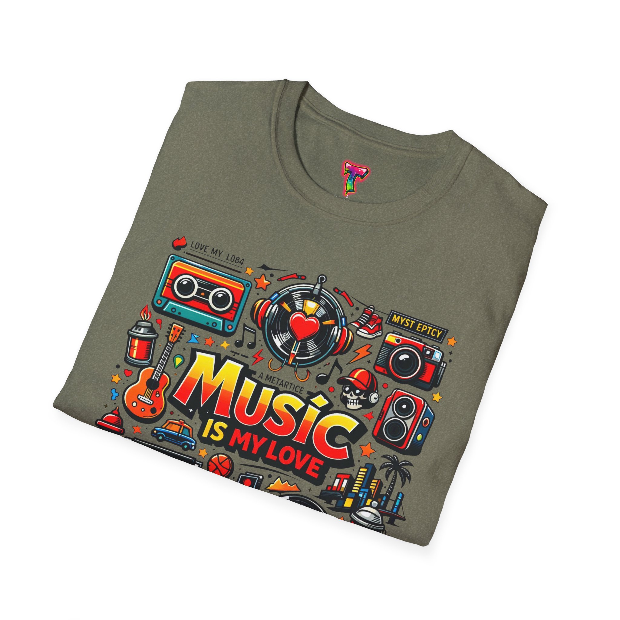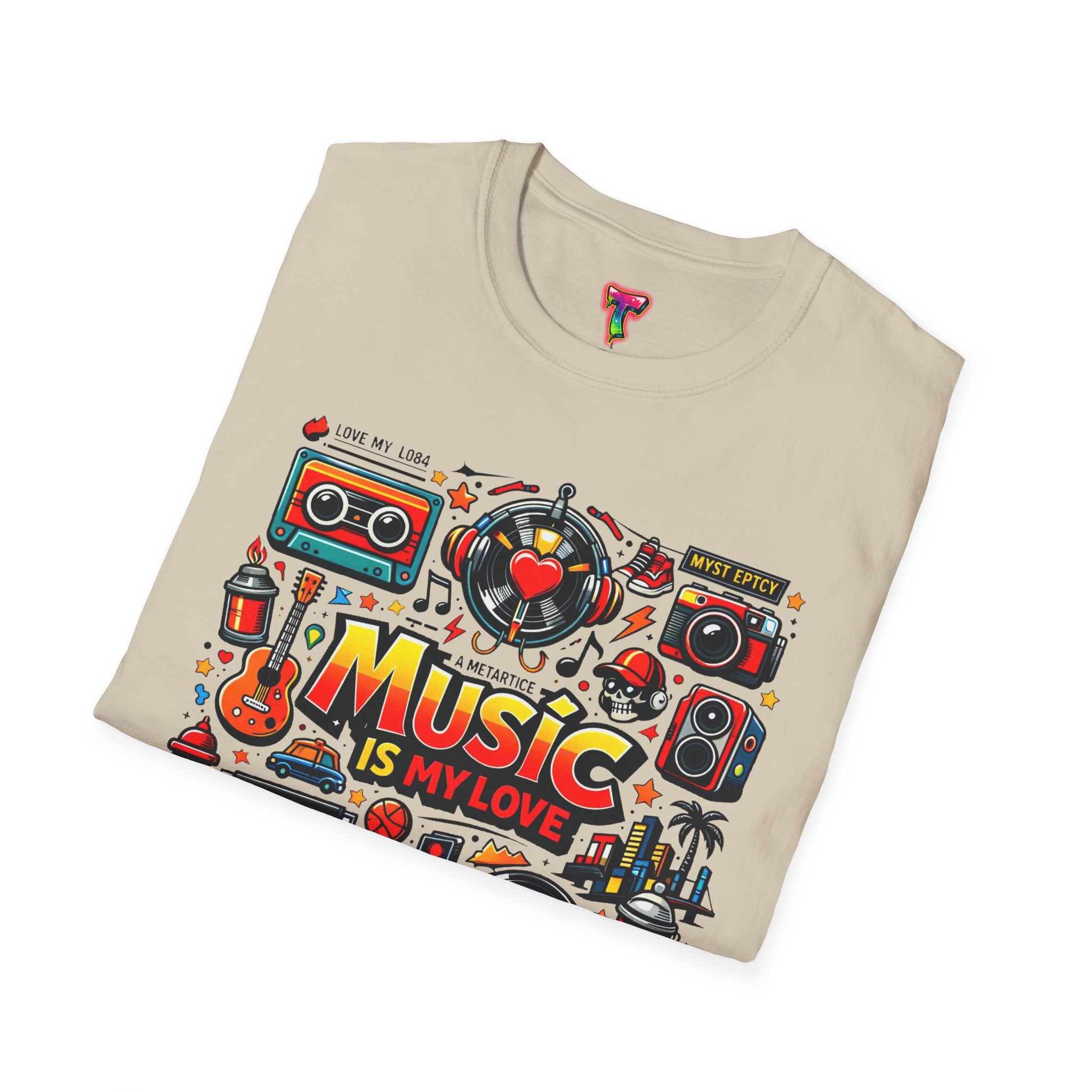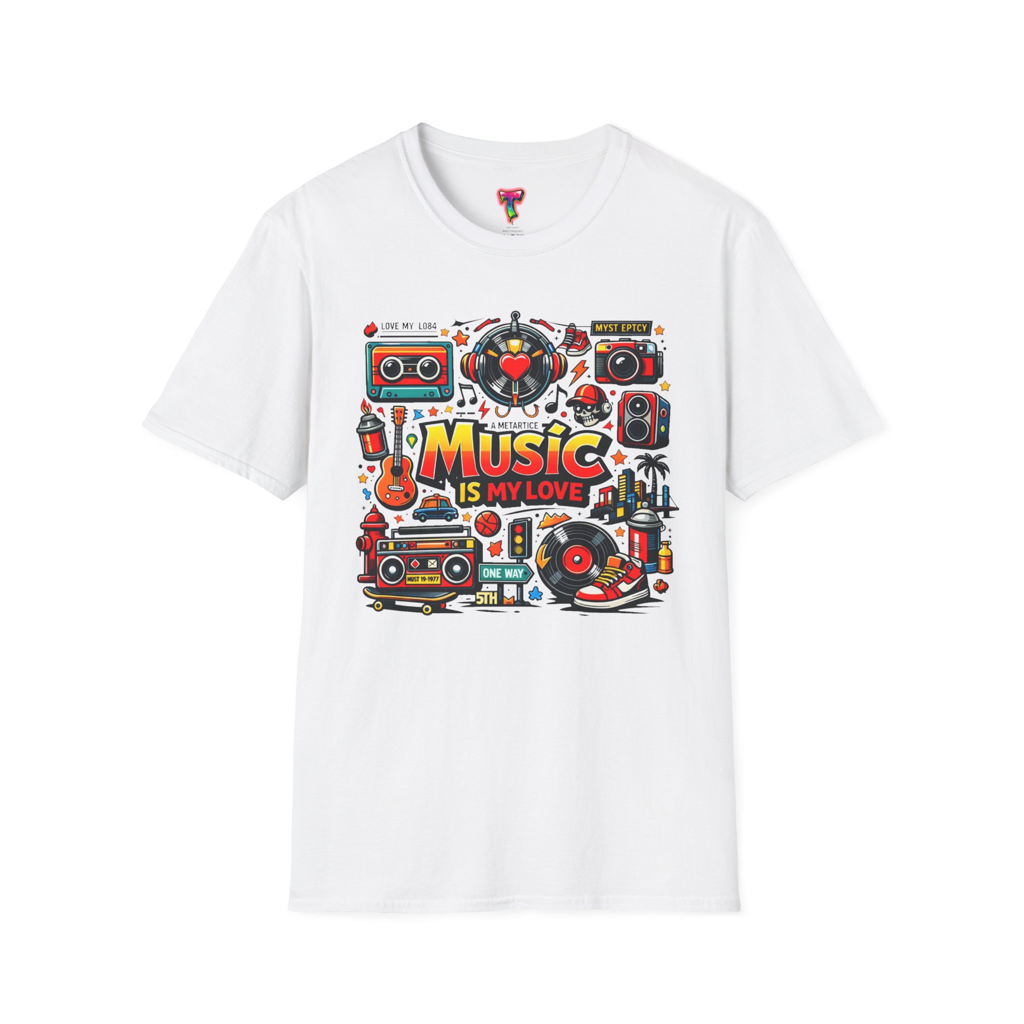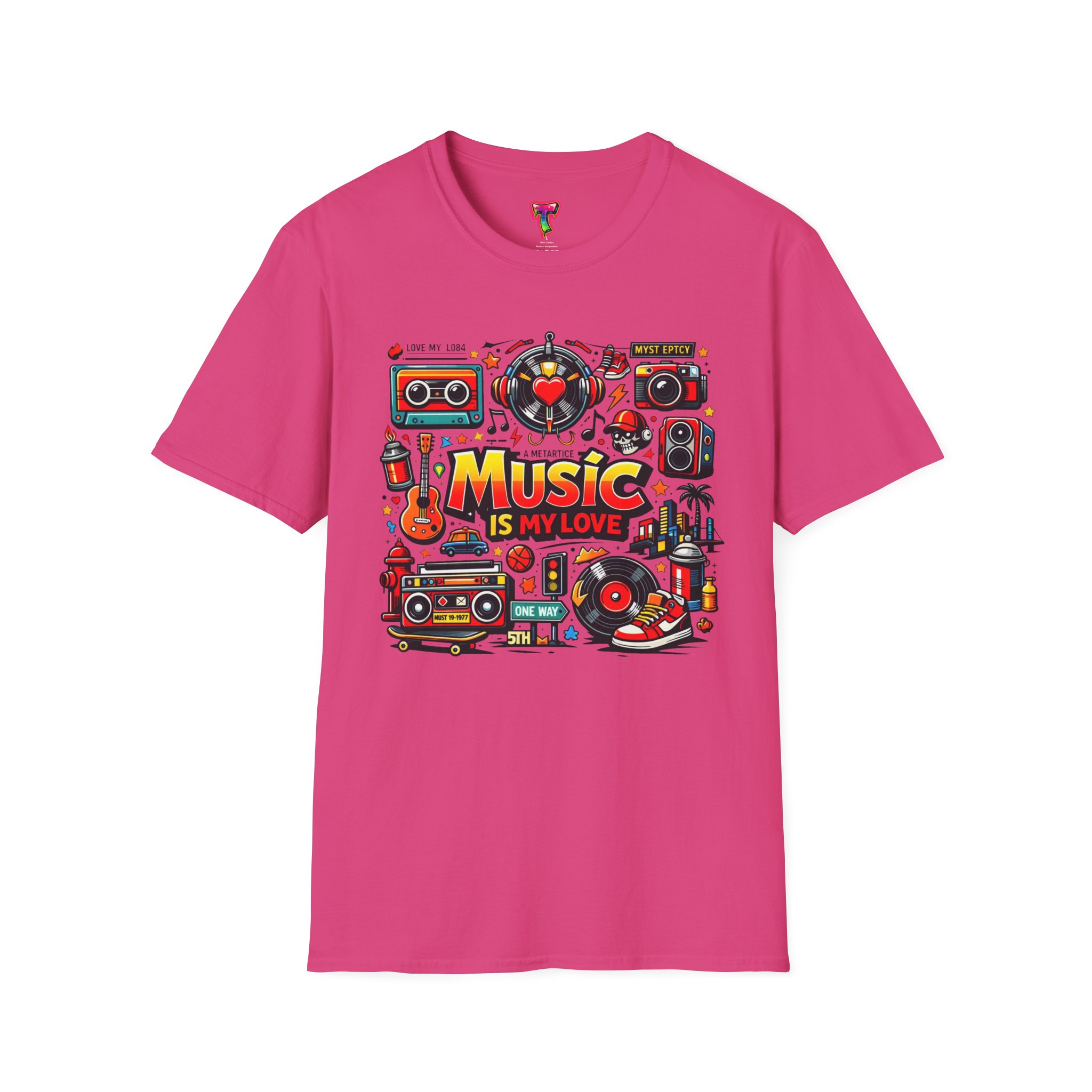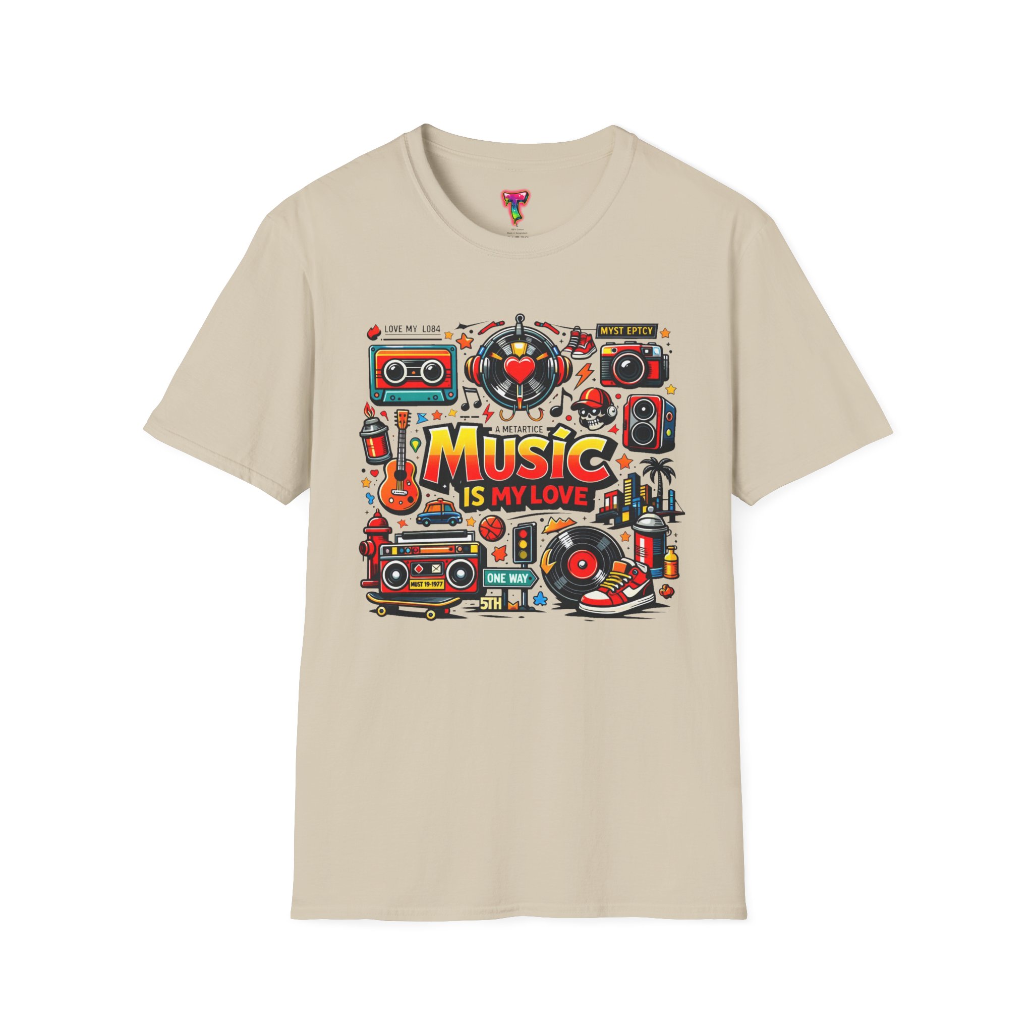 This lightweight cotton tee carries a vibrant celebration of sound — a colorful collage of retro speakers, vinyl, guitars and cassette art framing the bold statement: “Music is my love.” It lands with a nostalgic, joyful energy that slips easily into everyday life: rehearsals, record-store dives, late-night jam sessions, or city streets where playlists become personal soundtracks. The clean crew neck and classic fit keep the design front-and-center while the soft ring-spun fabric drapes comfortably for all-day wear. It’s for people who wear their playlist on their chest and want a shirt that feels lived-in from the first put-on. The printed inner label and durable print methods mean the graphic keeps its pop through repeat spins and washes.