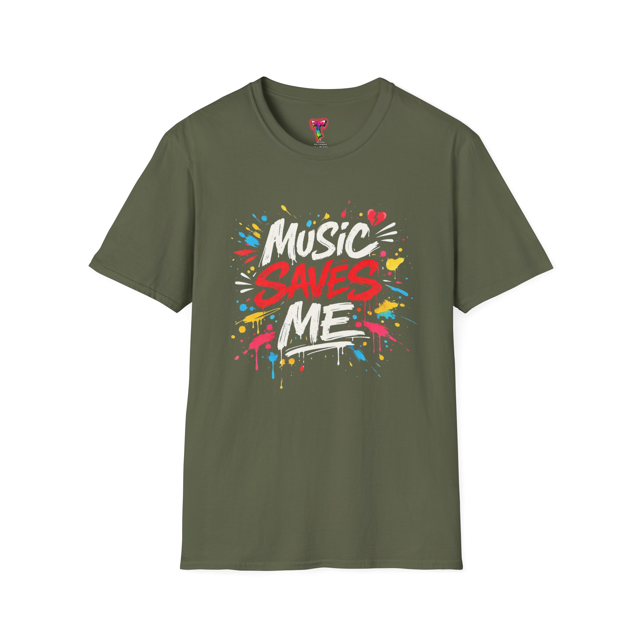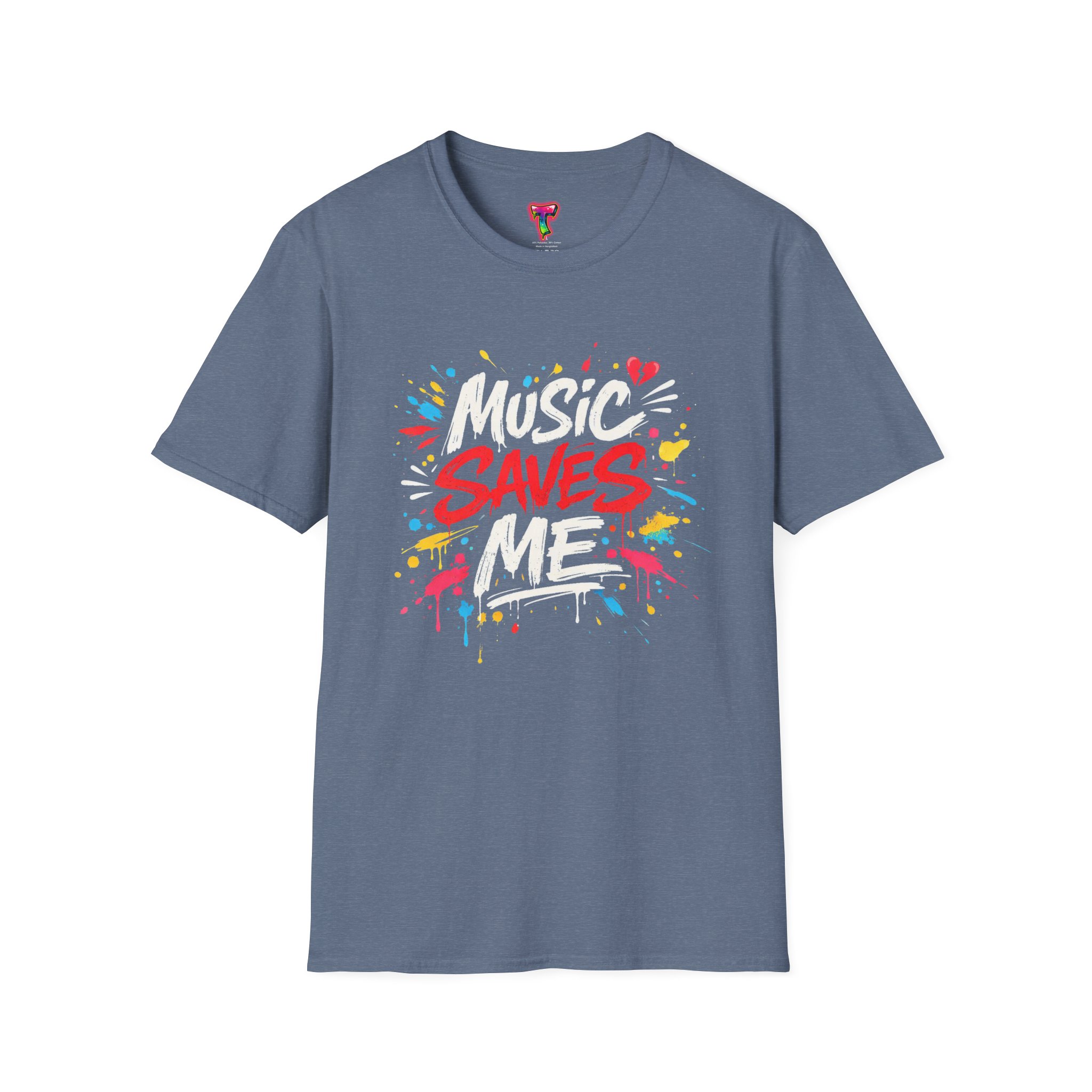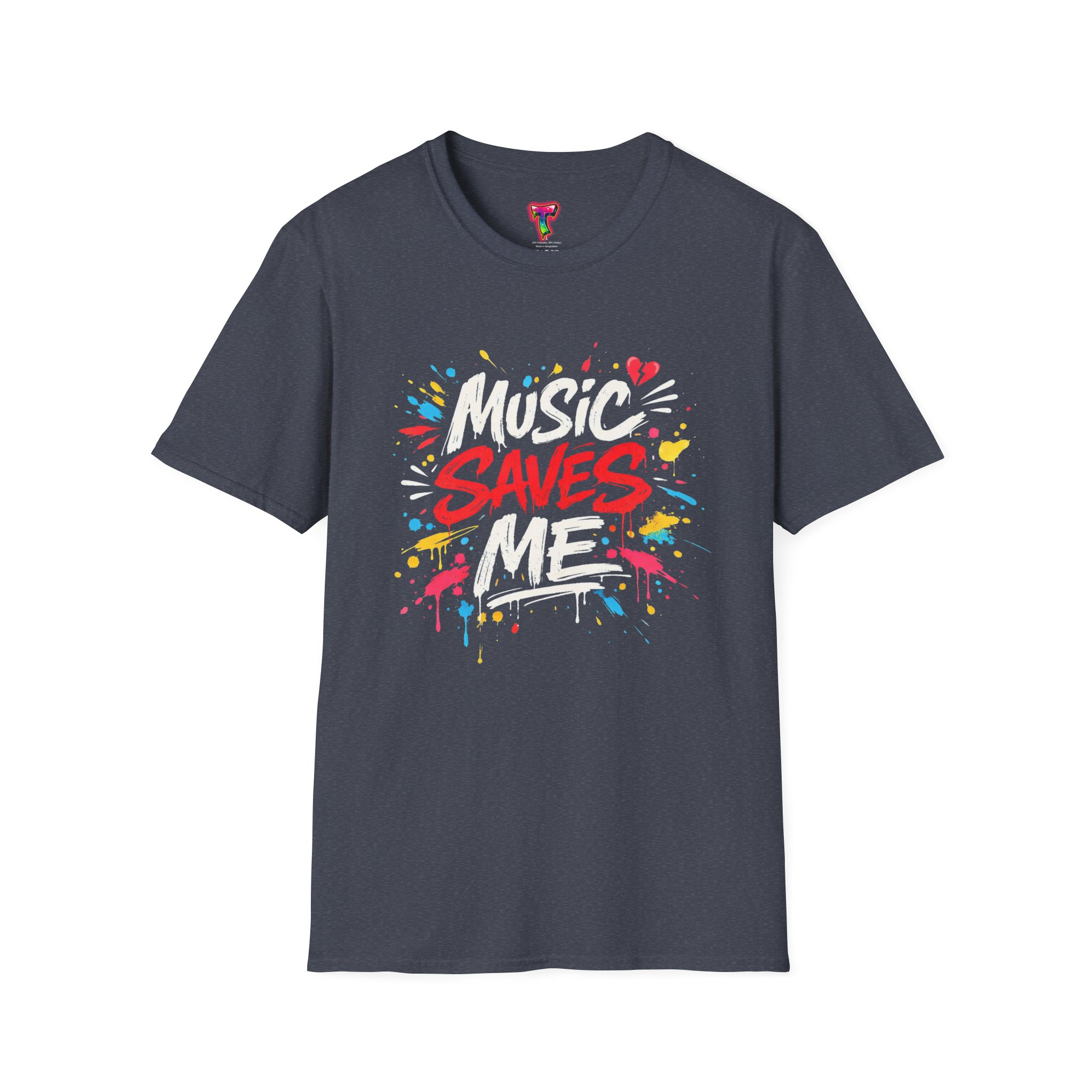 This lightweight cotton tee wears like an old favorite and carries a bold, street-art heart. Bright, graffiti-style lettering explodes across the chest with the message “Music Saves Me,” surrounded by paint splashes and little hearts that give it energy and warmth. It sits comfortably at the shoulders and falls in a classic crew-neck silhouette—easy to layer under a jacket or to wear solo while you’re lost in a playlist or heading to a late-night open mic. The fabric’s soft hand and tear-away label keep you focused on the music, not the shirt. A subtle, crafted look for people who live by rhythm and color.