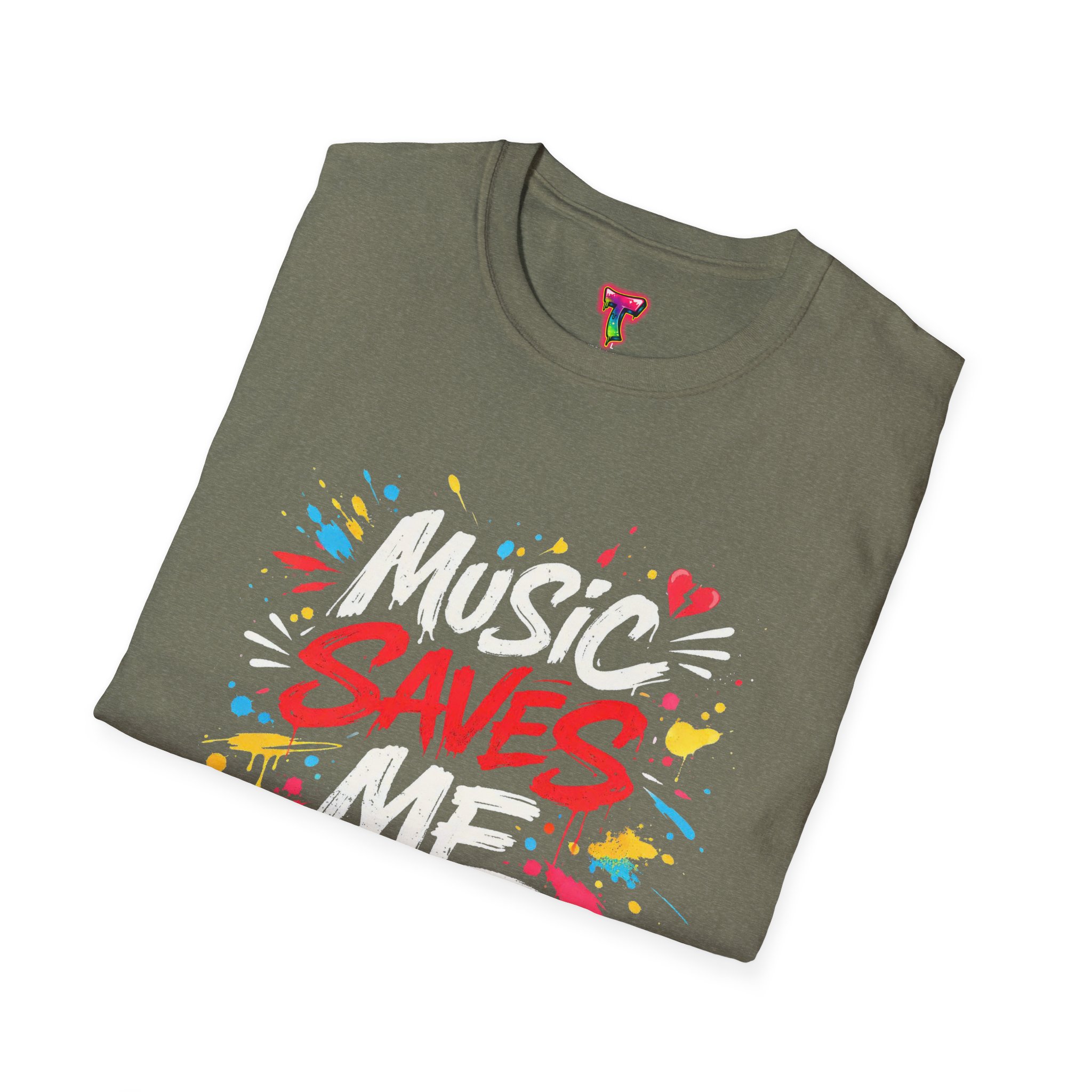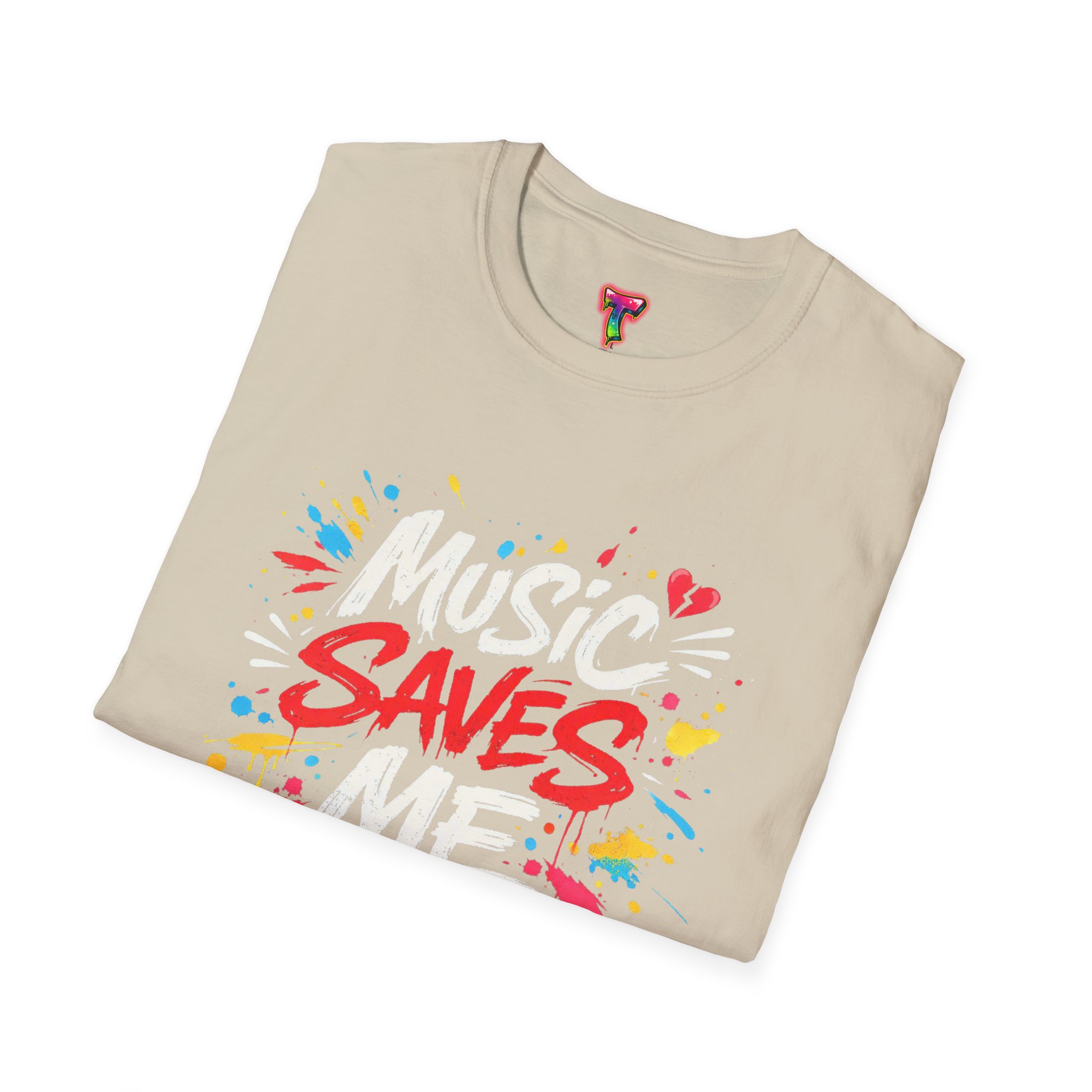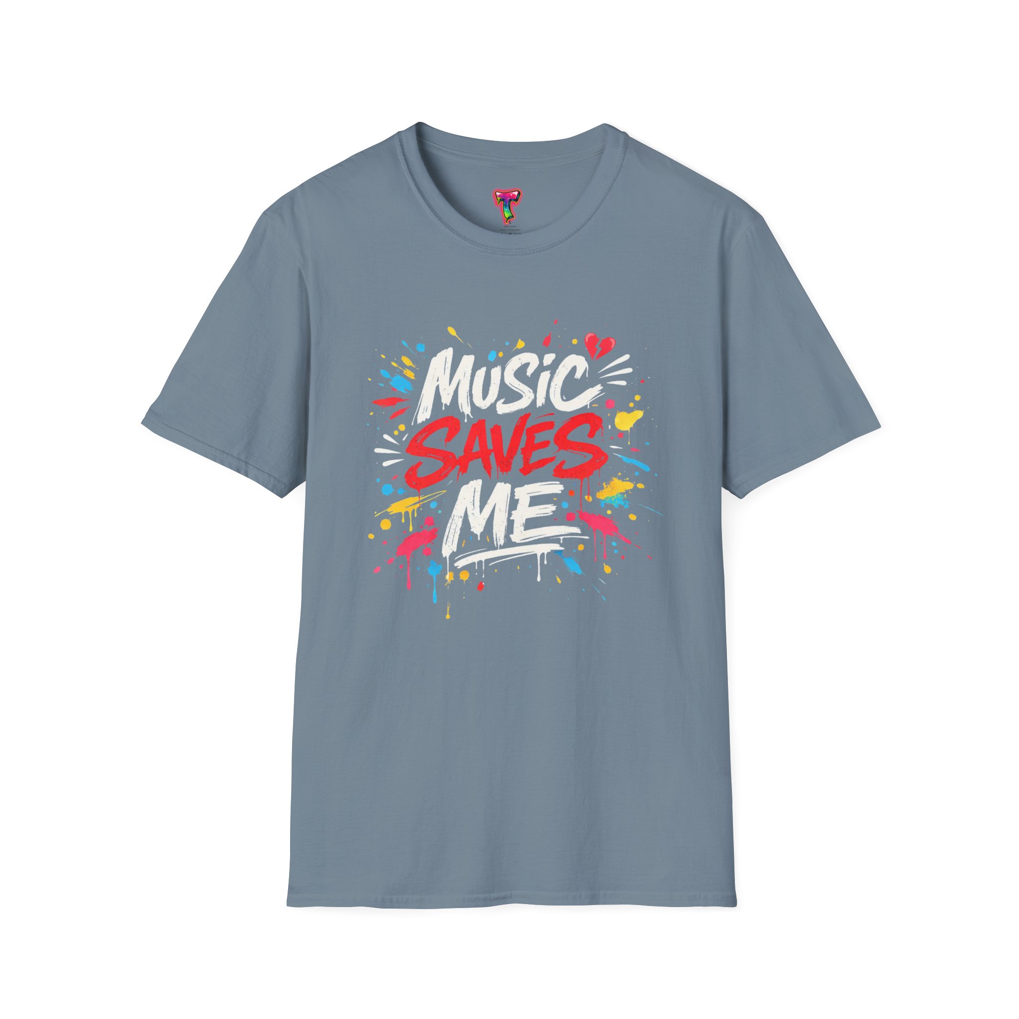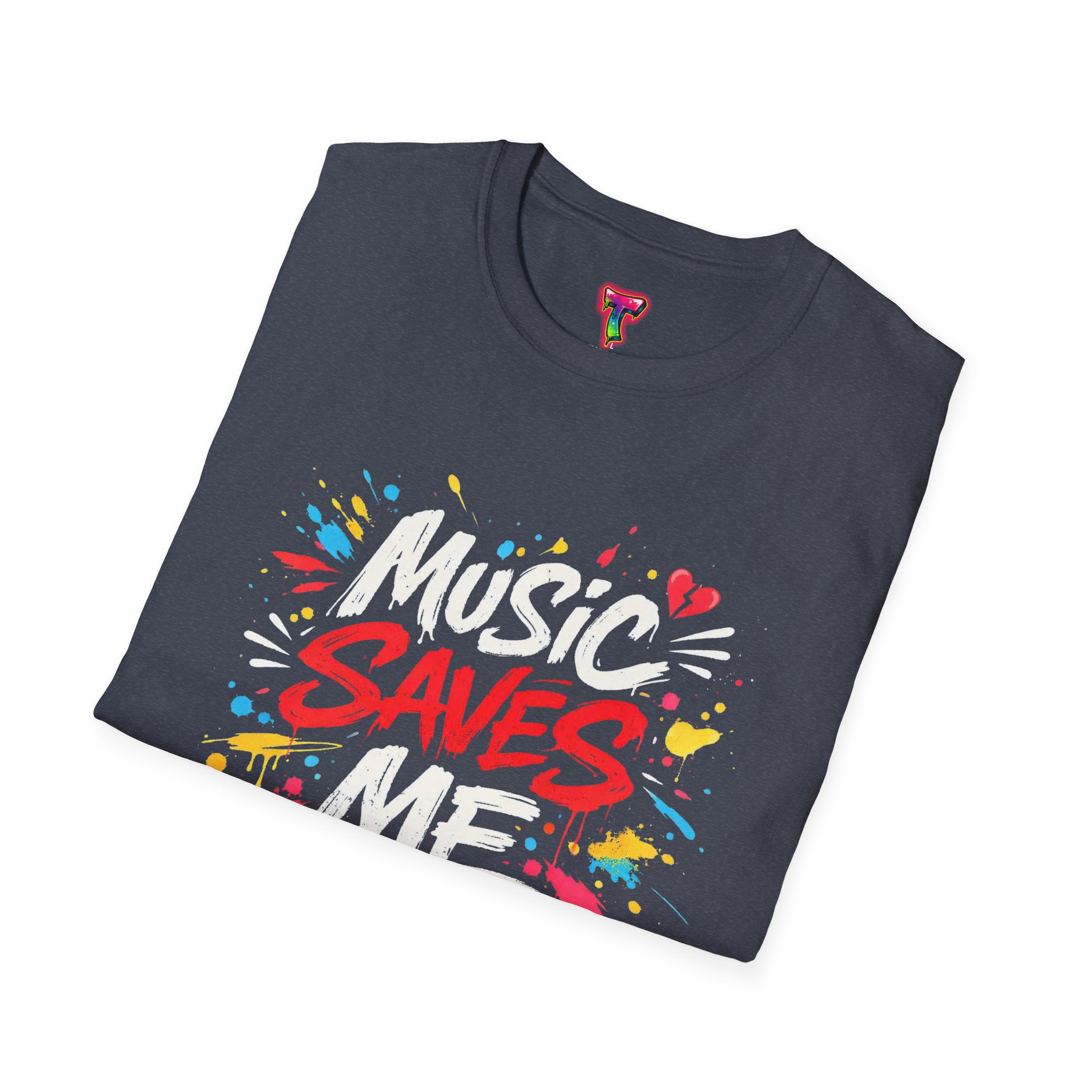 This lightweight cotton tee wears like an old favorite and carries a bold, street-art heart. Bright, graffiti-style lettering explodes across the chest with the message “Music Saves Me,” surrounded by paint splashes and little hearts that give it energy and warmth. It sits comfortably at the shoulders and falls in a classic crew-neck silhouette—easy to layer under a jacket or to wear solo while you’re lost in a playlist or heading to a late-night open mic. The fabric’s soft hand and tear-away label keep you focused on the music, not the shirt. A subtle, crafted look for people who live by rhythm and color.
