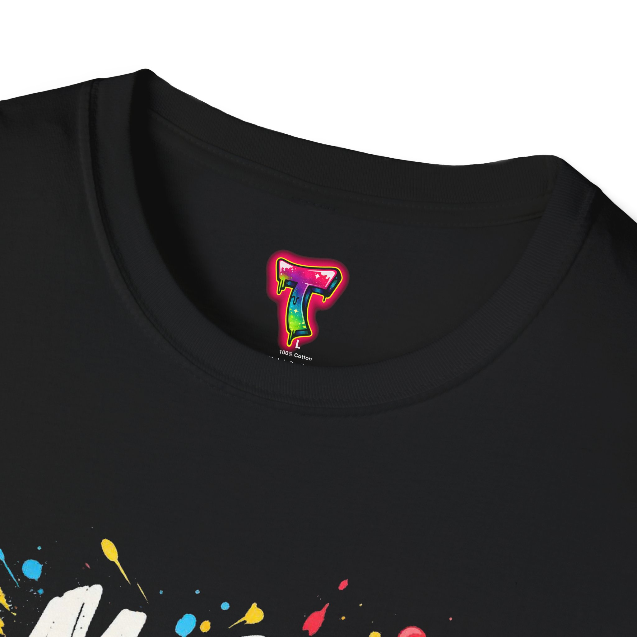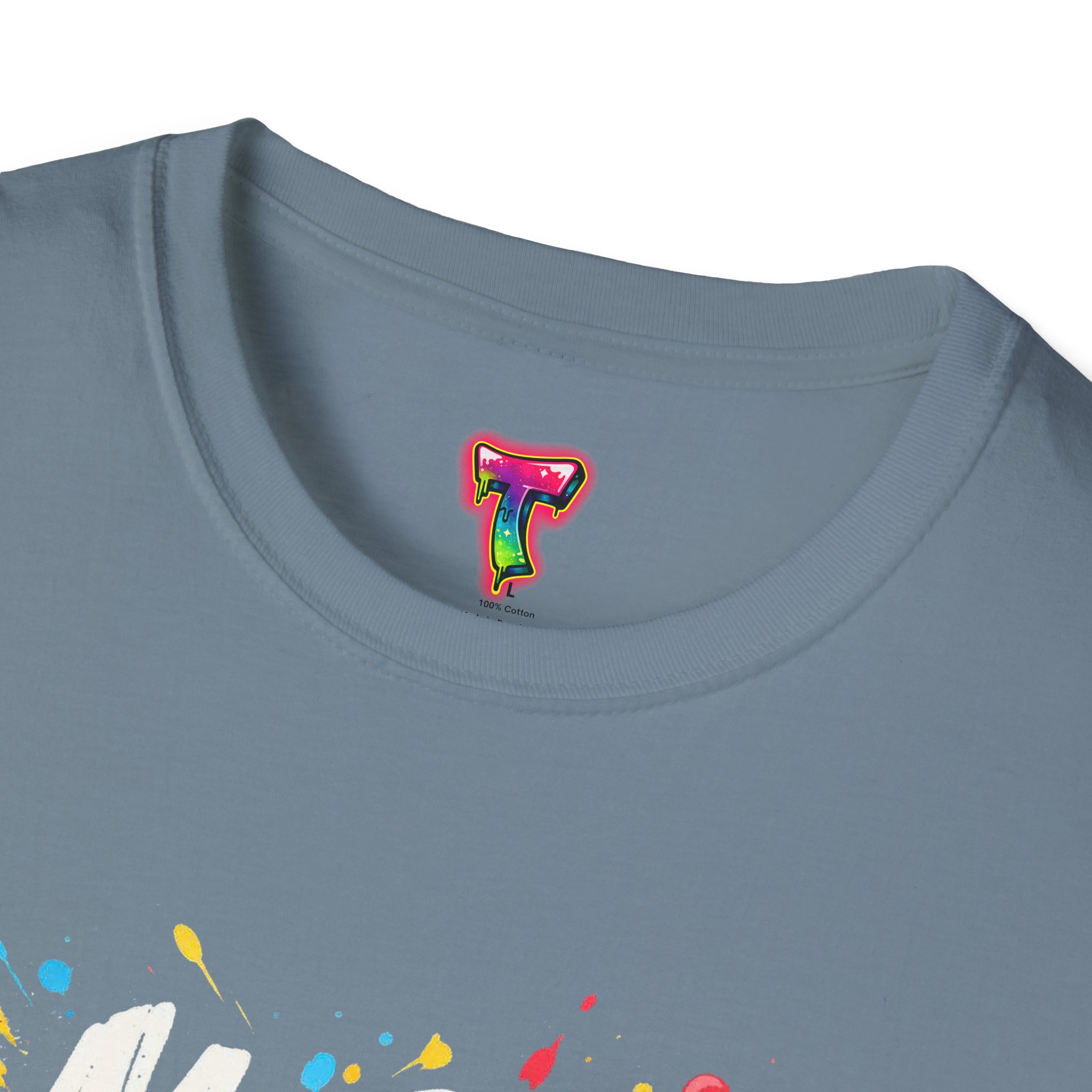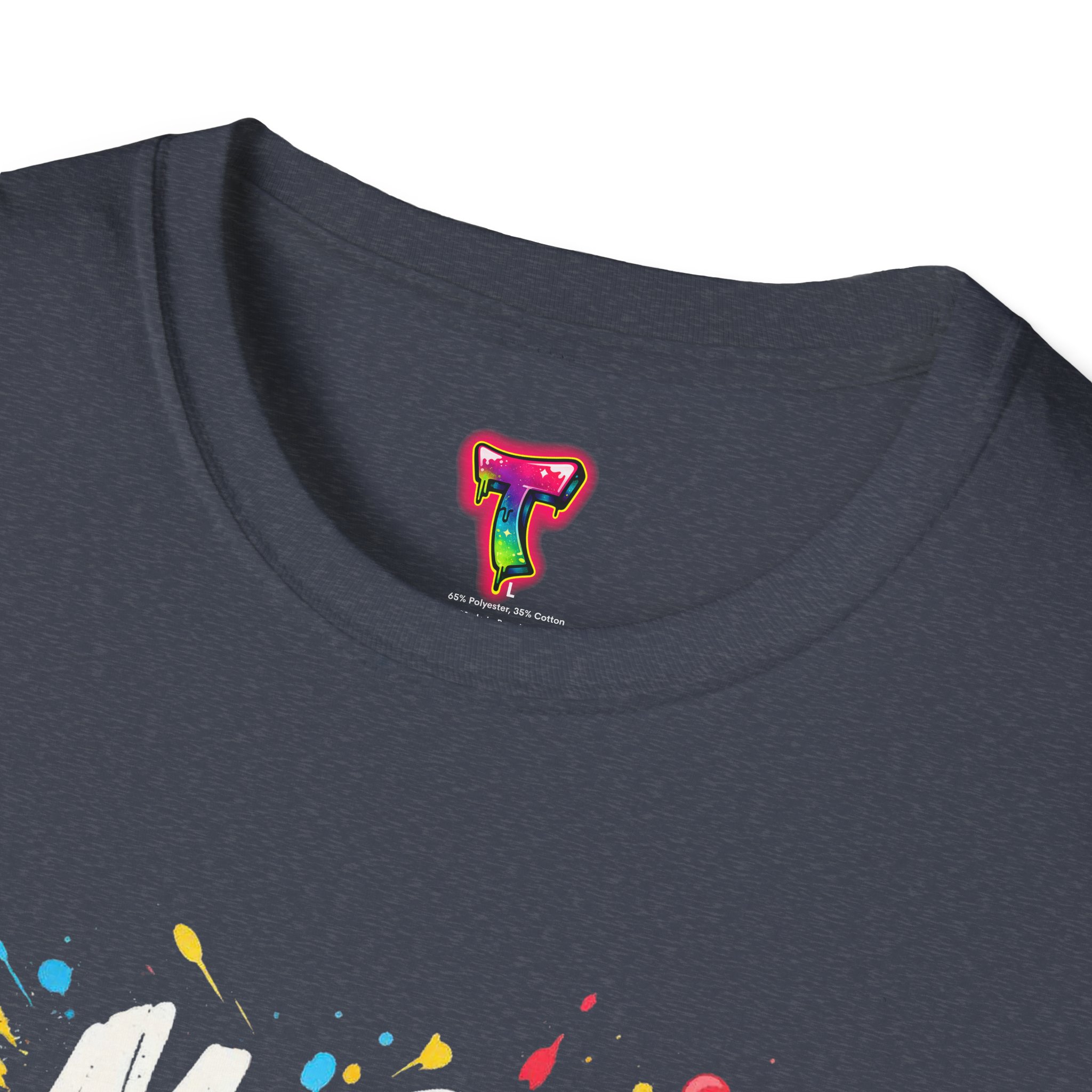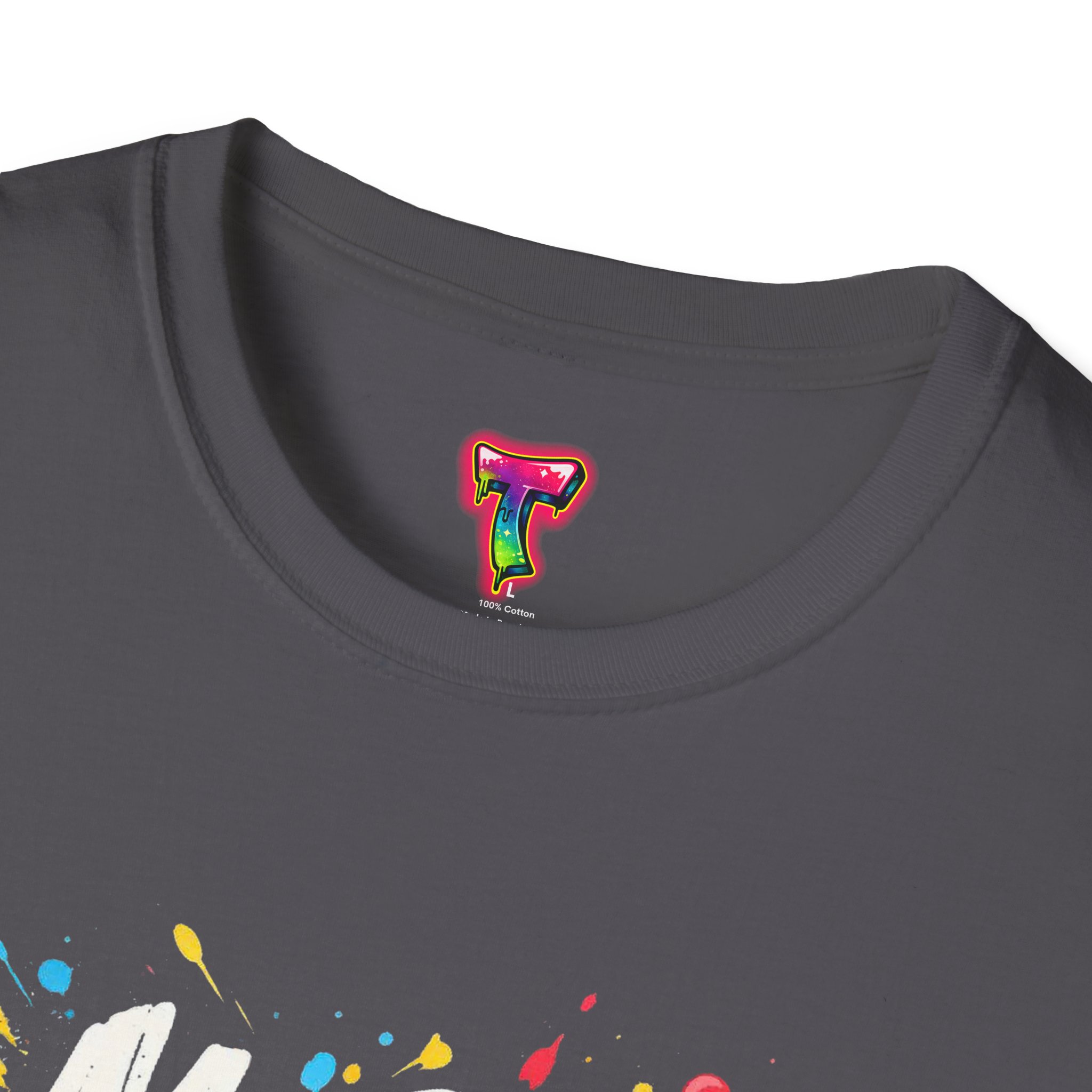 – DTG front print with vibrant, multi-color graffiti design; DTF used for sleeve/neck labels where applicable