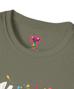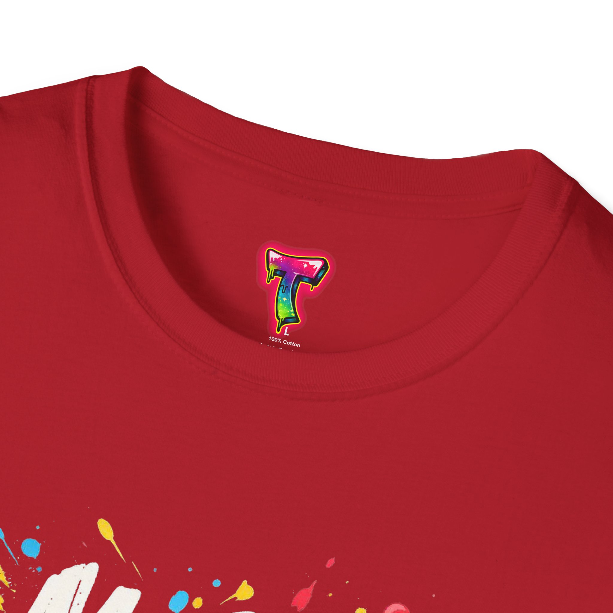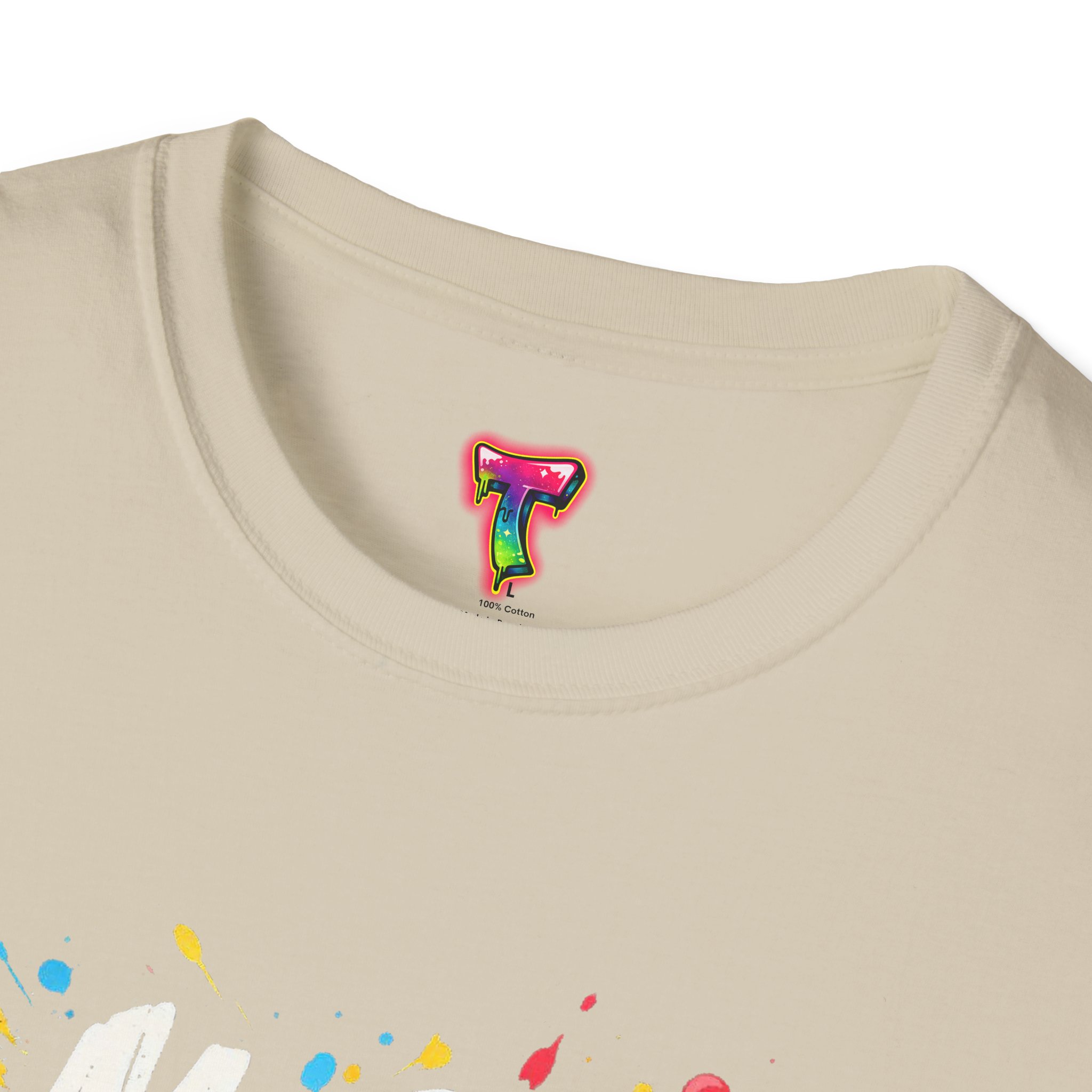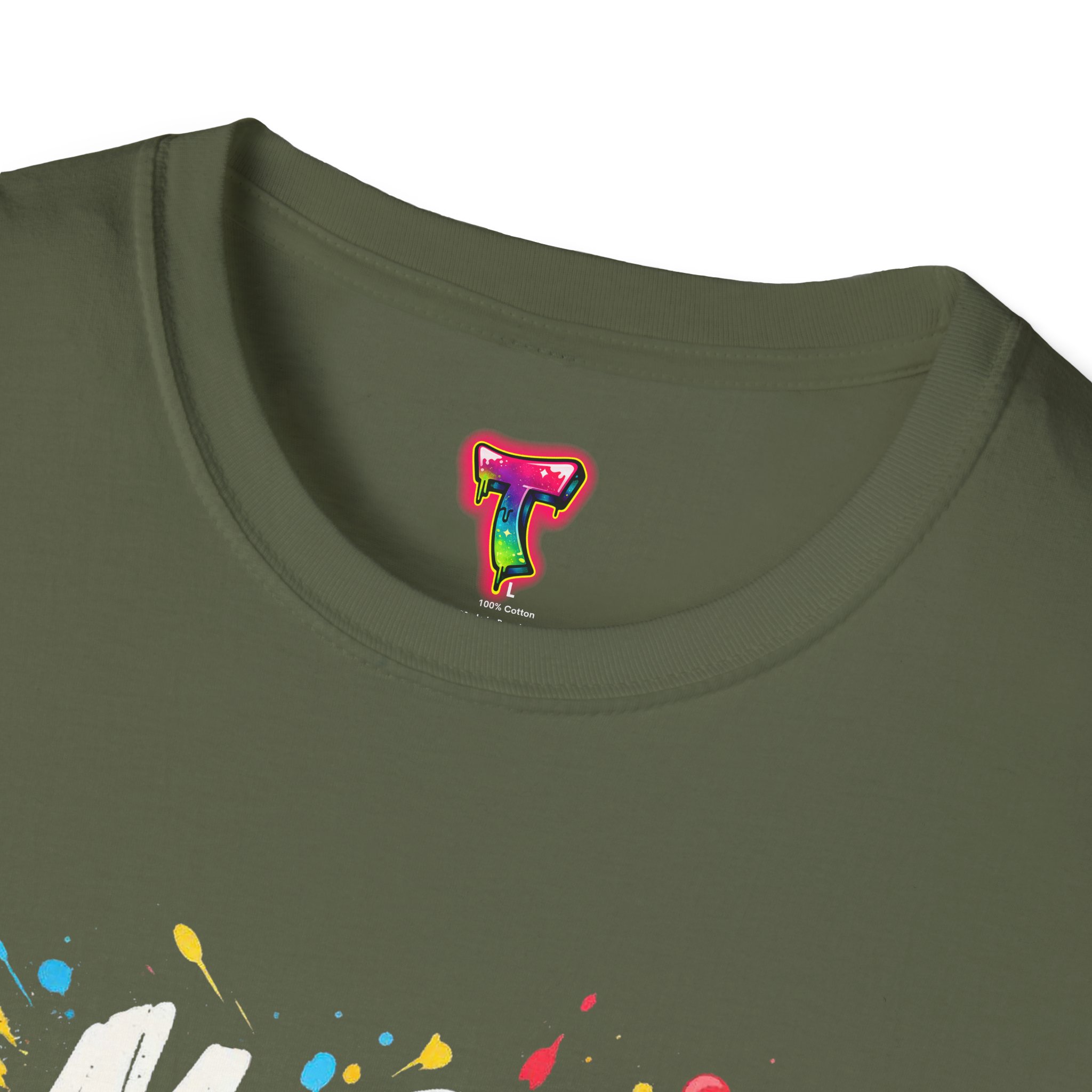 – DTG front print with vibrant, multi-color graffiti design; DTF used for sleeve/neck labels where applicable