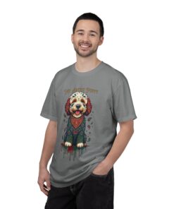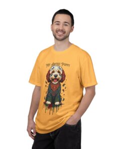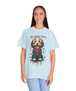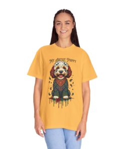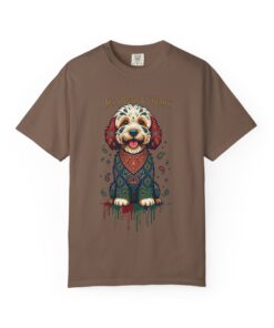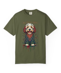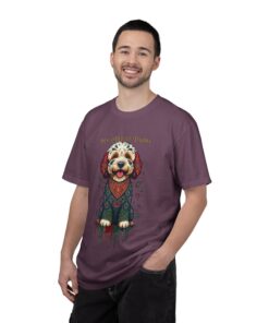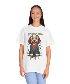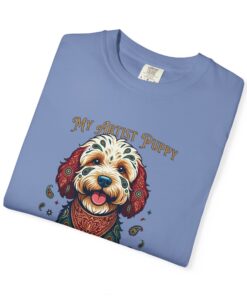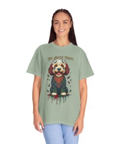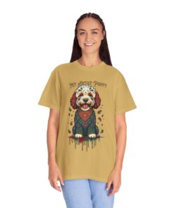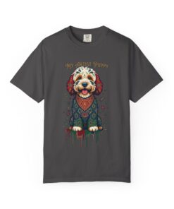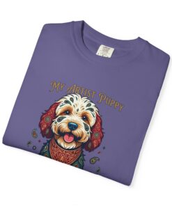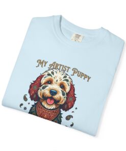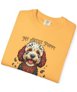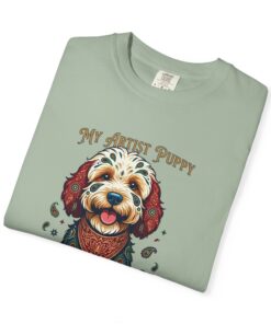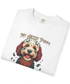 This garment-dyed tee brings cozy, lived-in softness to a playful, artful design. The heavyweight cotton feels substantial yet broken-in, and the printed “My Artist Puppy” illustration adds a warm, whimsical touch — paint-splatter accents and a patterned sweater suggest a pup who’s equal parts creative companion and cozy couchmate. Wear it on slow mornings with coffee, at sketch sessions, or when you want to share a quiet laugh with fellow dog lovers. The relaxed cut and soft dyeing give a casual, vintage vibe that sits naturally in an artist’s everyday rotation.