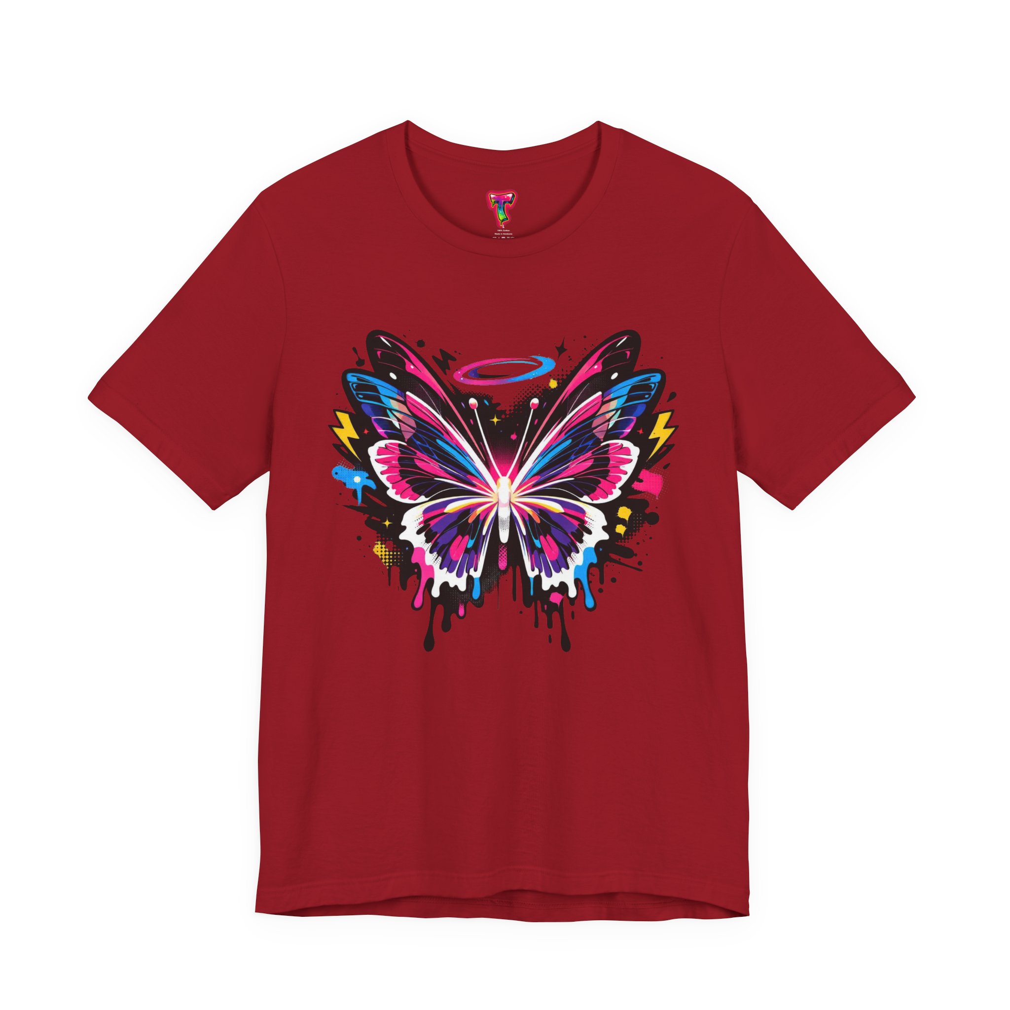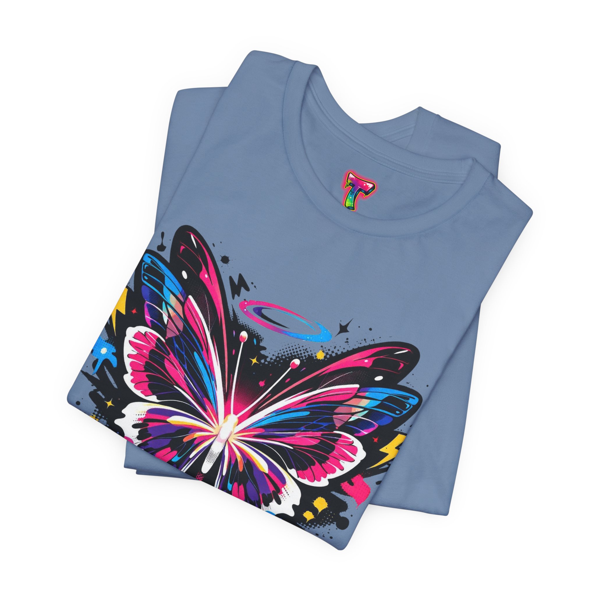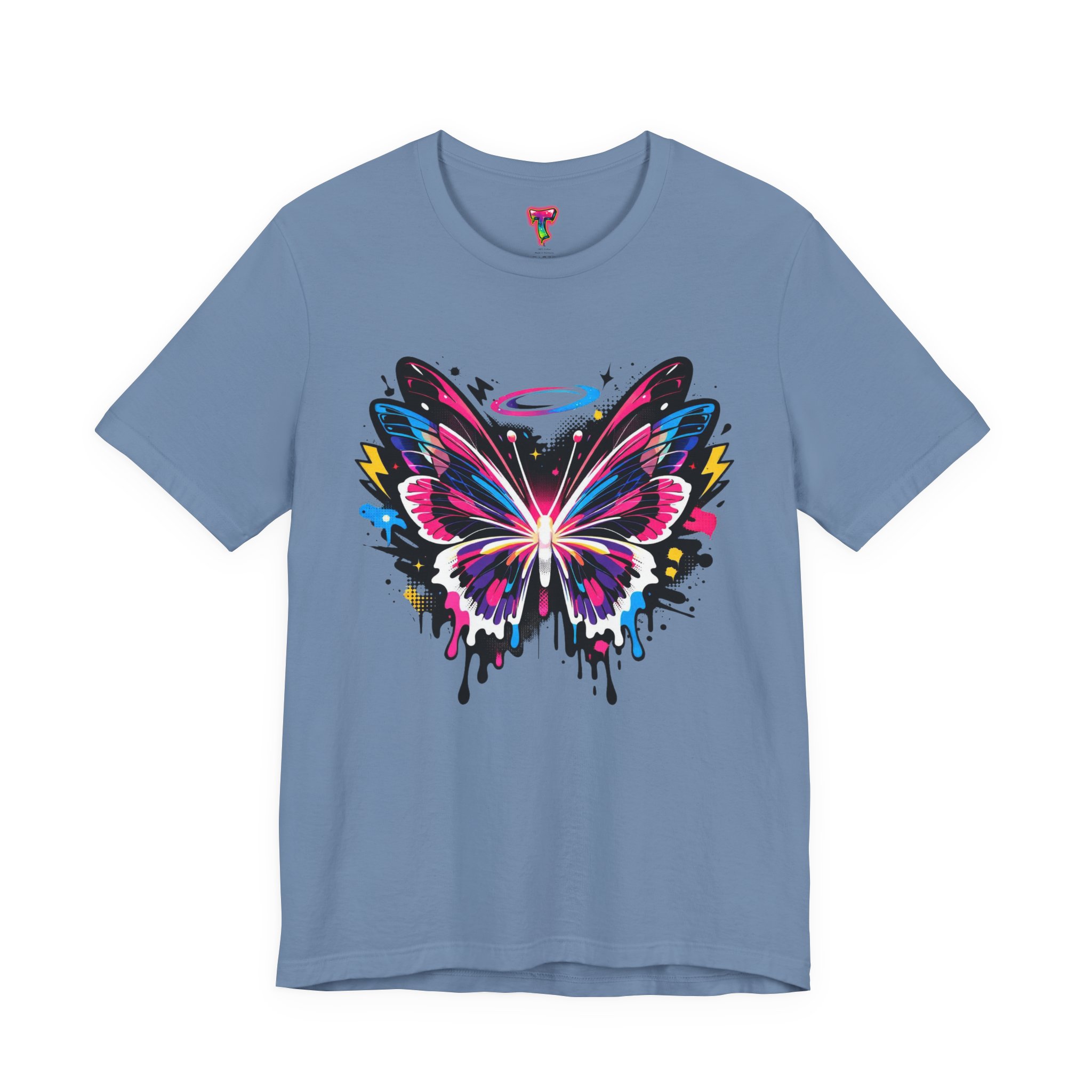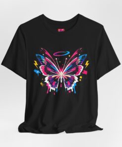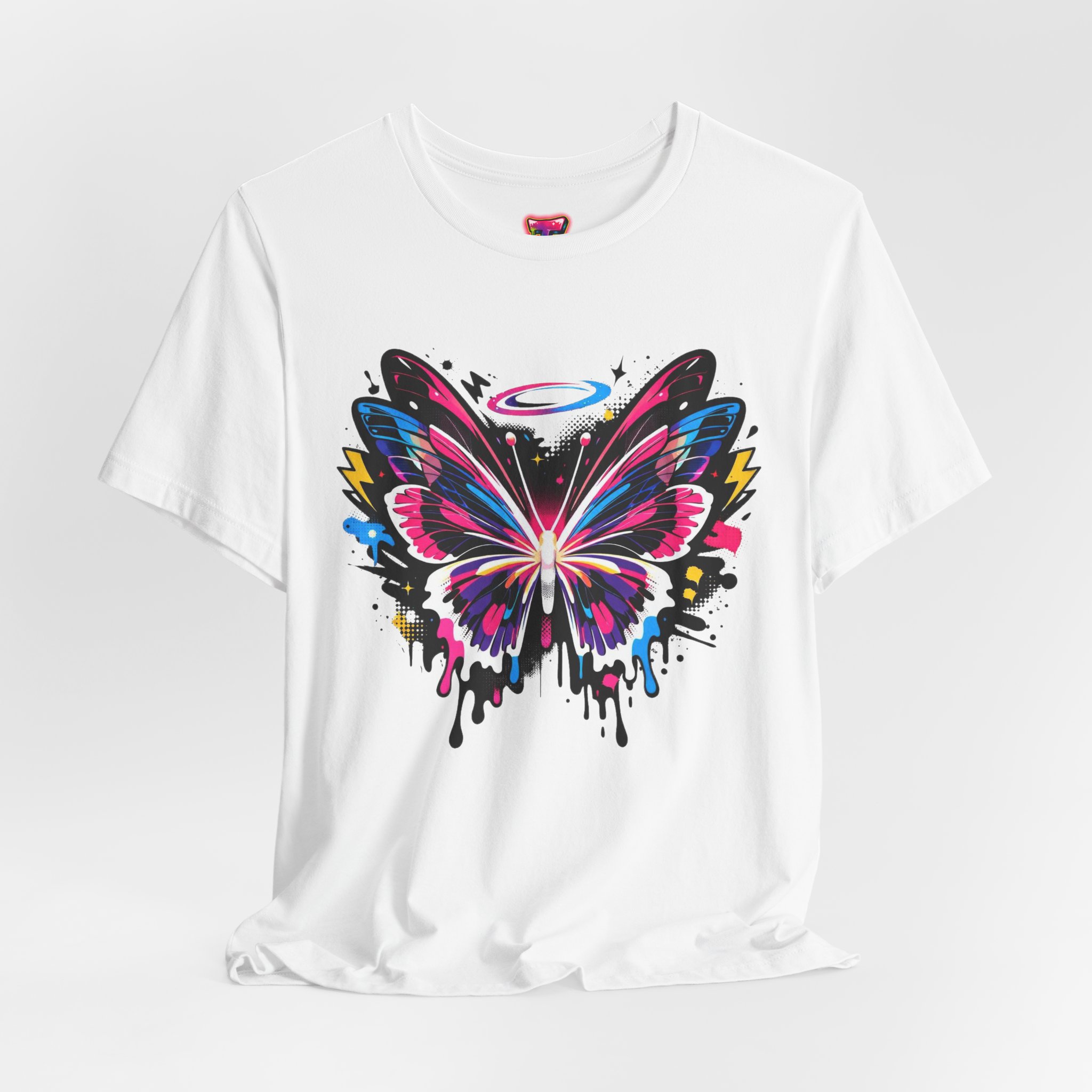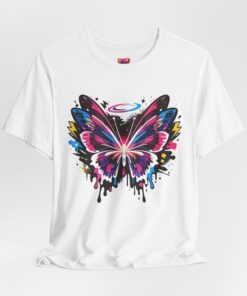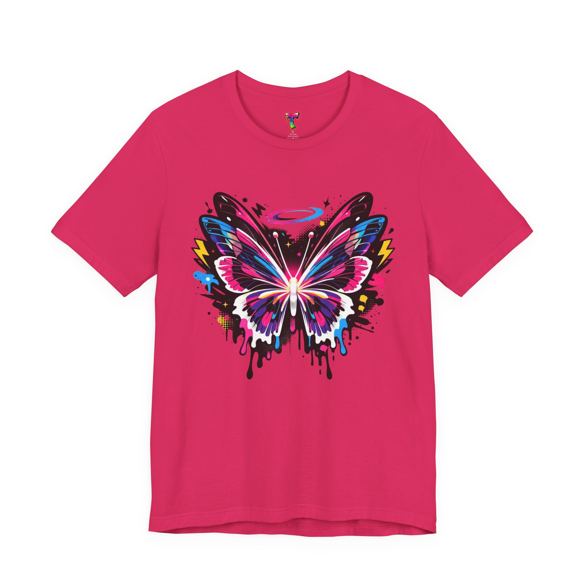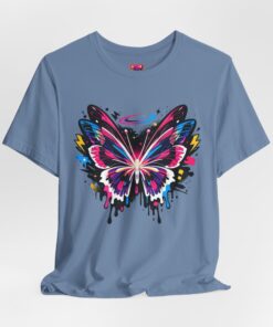 This lightweight jersey tee carries a bold, hand-illustrated butterfly that feels like an electric burst of color. Bright magenta and cyan blend with inky black drips and tiny star accents, giving the design an urban-street-art edge while keeping the silhouette clean and wearable. It settles comfortably at the shoulders and chest, then relaxes into a retail fit that layers easily under jackets or wears alone for a statement moment. The soft Airlume combed and ring-spun cotton feels smooth against skin, while the ribbed collar and side seams keep the shape crisp through repeated wear. Ethically produced and REACH certified, the shirt pairs expressive graphics with responsible manufacturing.