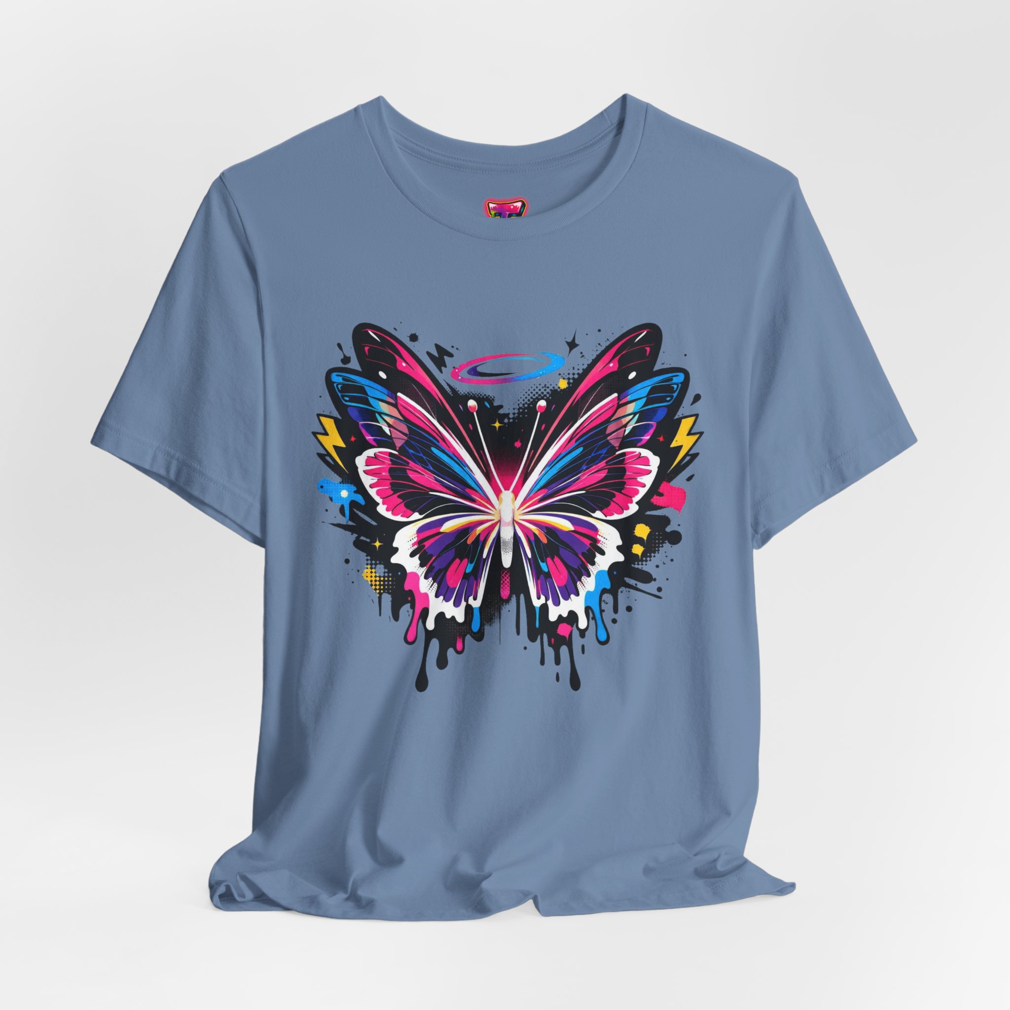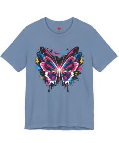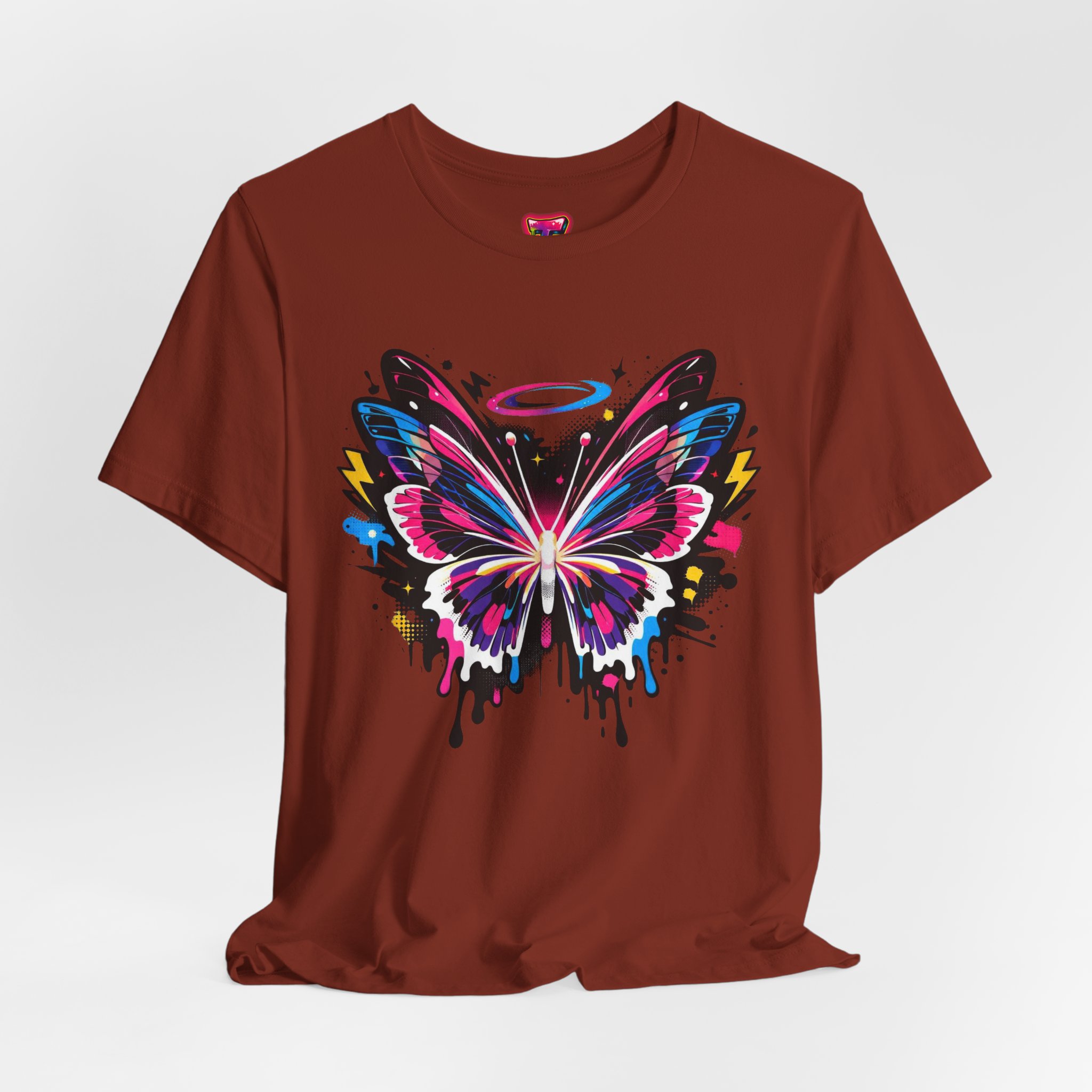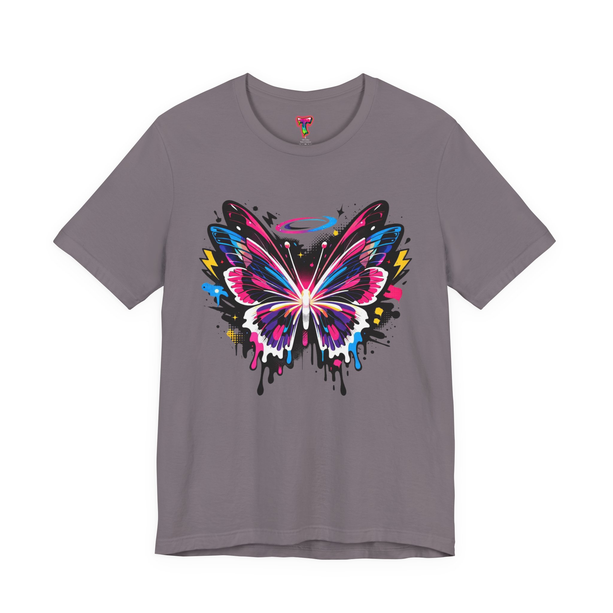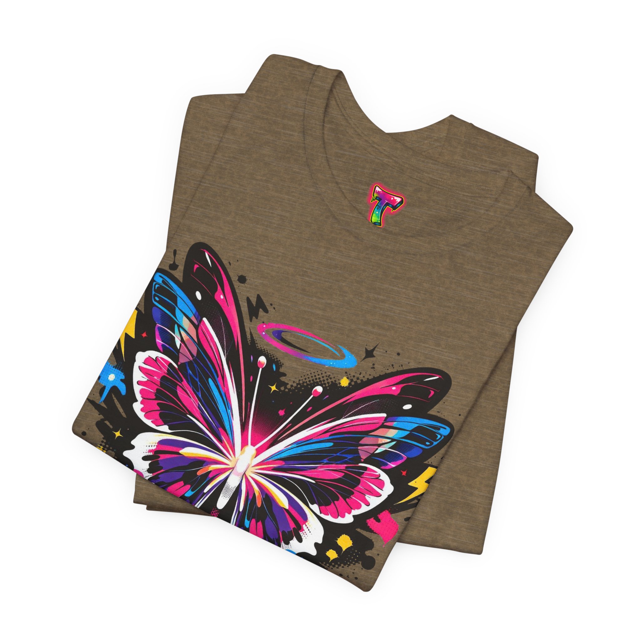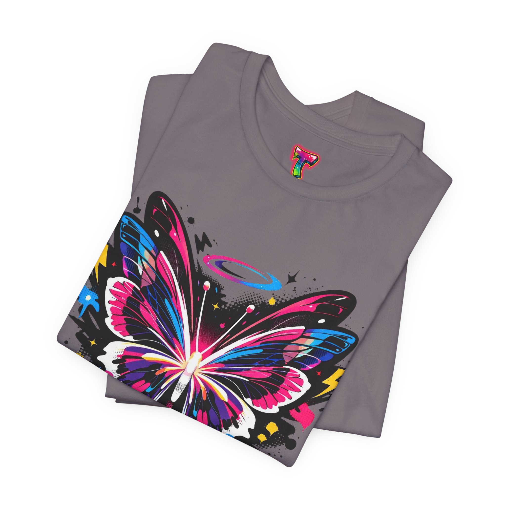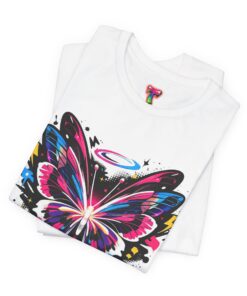 This lightweight jersey tee carries a bold, hand-illustrated butterfly that feels like an electric burst of color. Bright magenta and cyan blend with inky black drips and tiny star accents, giving the design an urban-street-art edge while keeping the silhouette clean and wearable. It settles comfortably at the shoulders and chest, then relaxes into a retail fit that layers easily under jackets or wears alone for a statement moment. The soft Airlume combed and ring-spun cotton feels smooth against skin, while the ribbed collar and side seams keep the shape crisp through repeated wear. Ethically produced and REACH certified, the shirt pairs expressive graphics with responsible manufacturing.